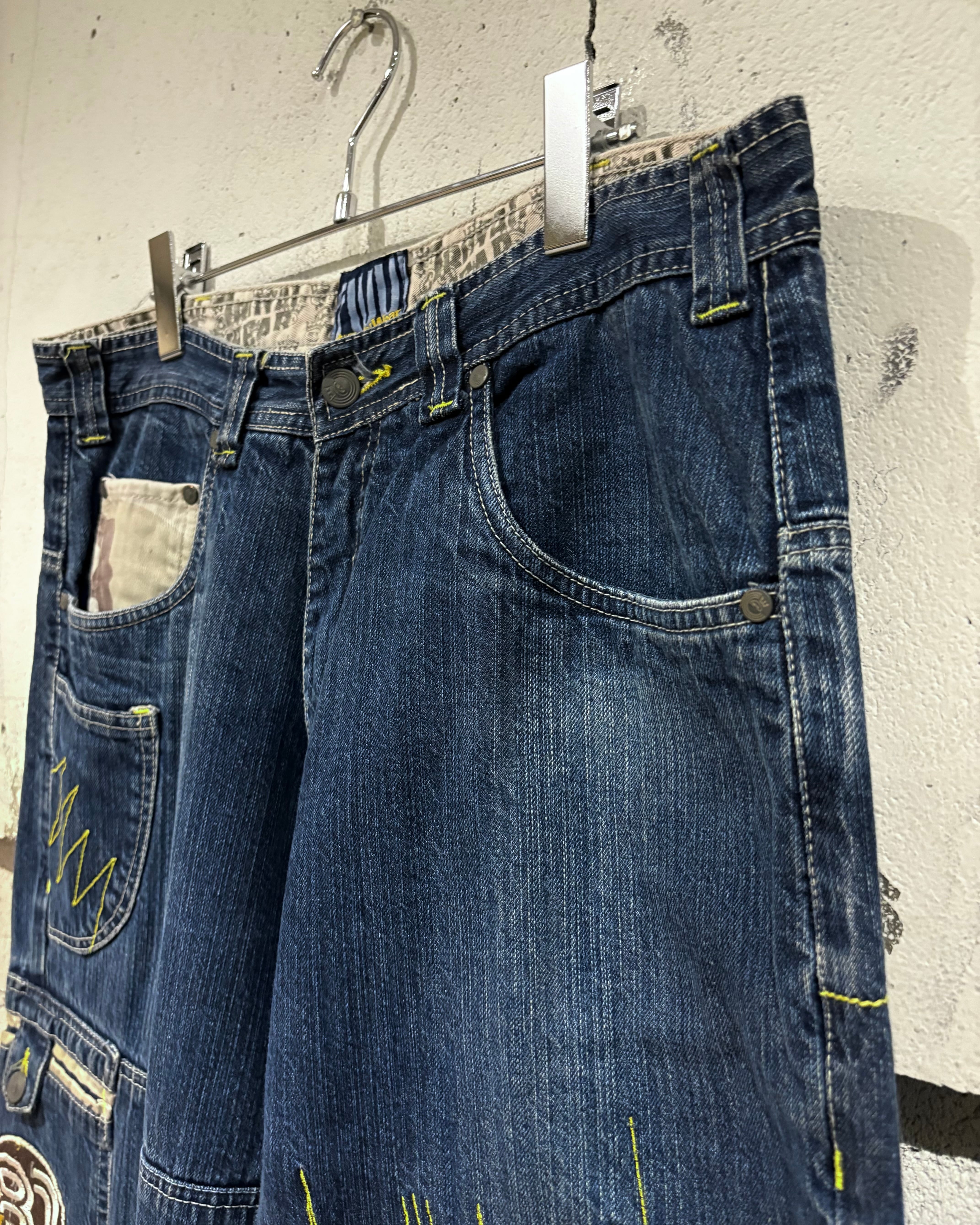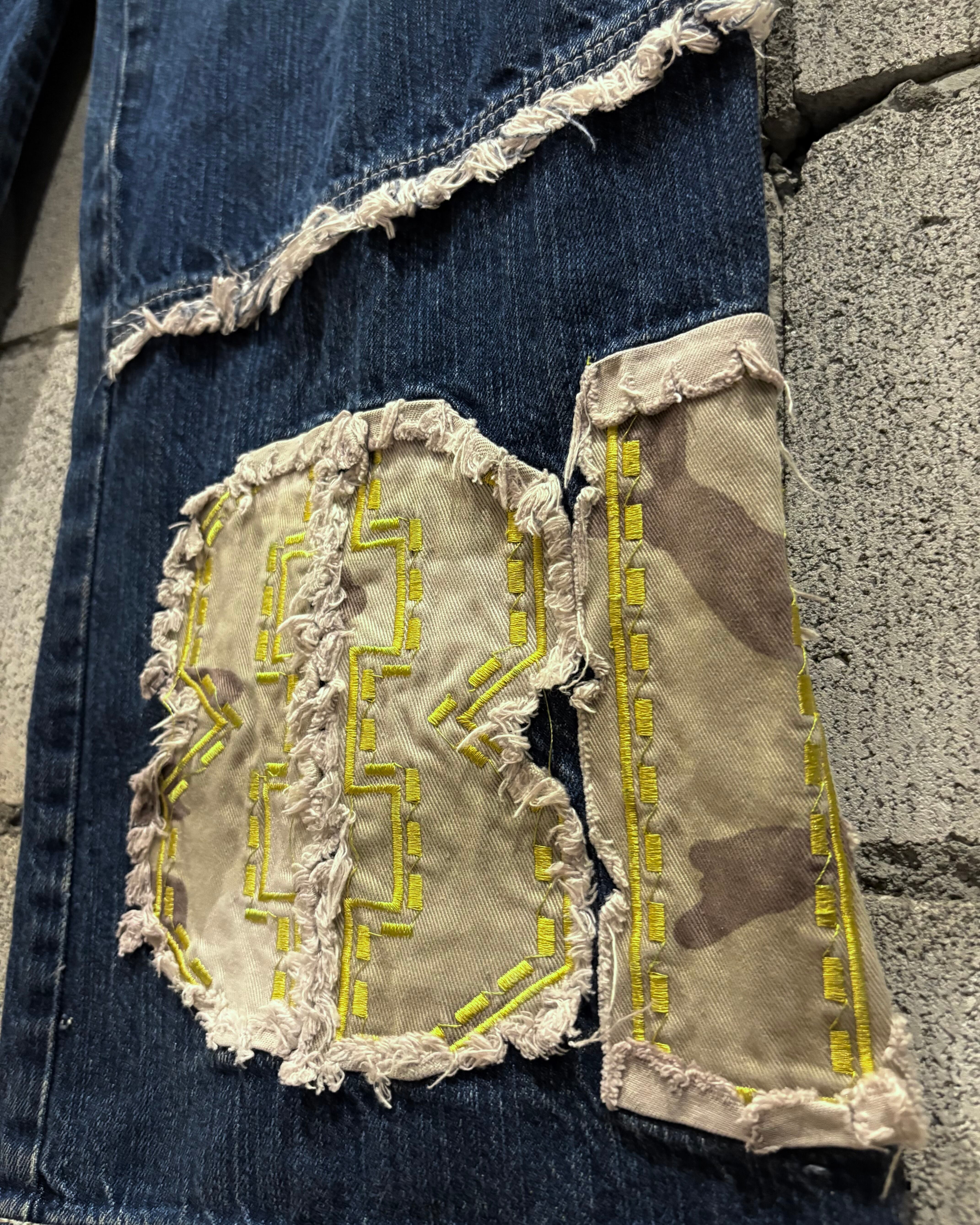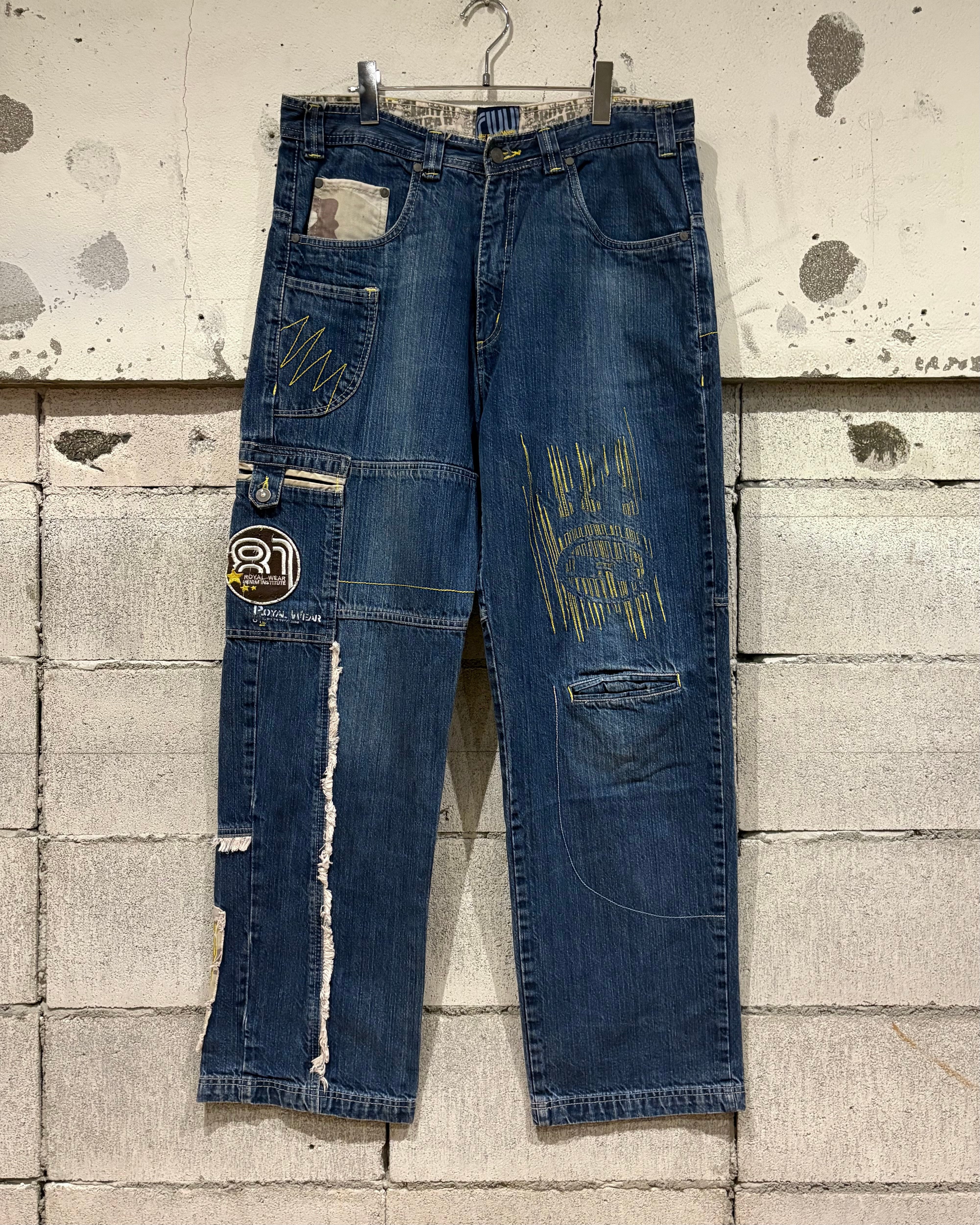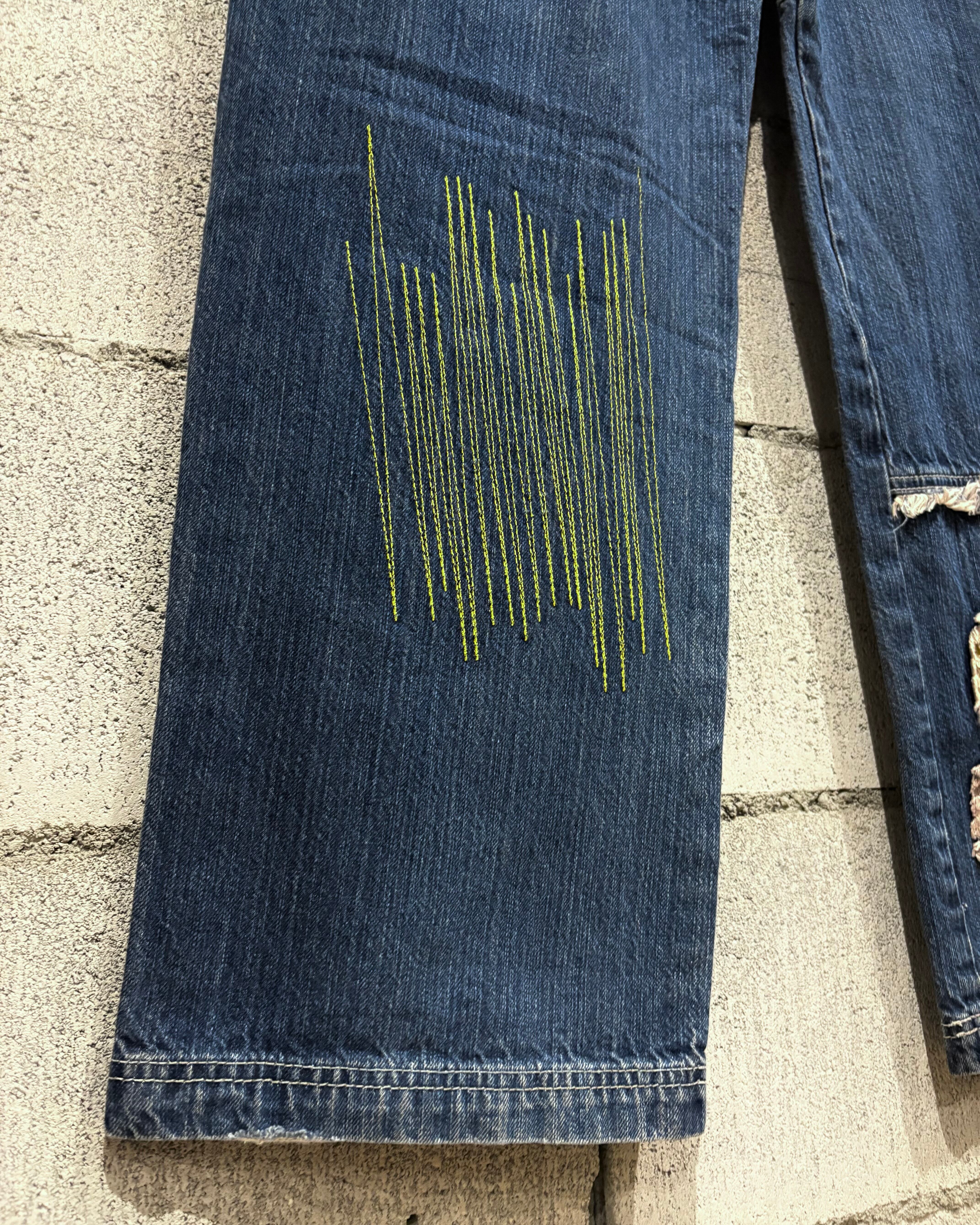 ブルーのデニムをベースに、ボディの随所にステッチでジグザグを、ポケットや背面には刺繍やワッペン、パッチでロゴ、ナンバリングを表現したハイなデザインが光るデニムパンツ。