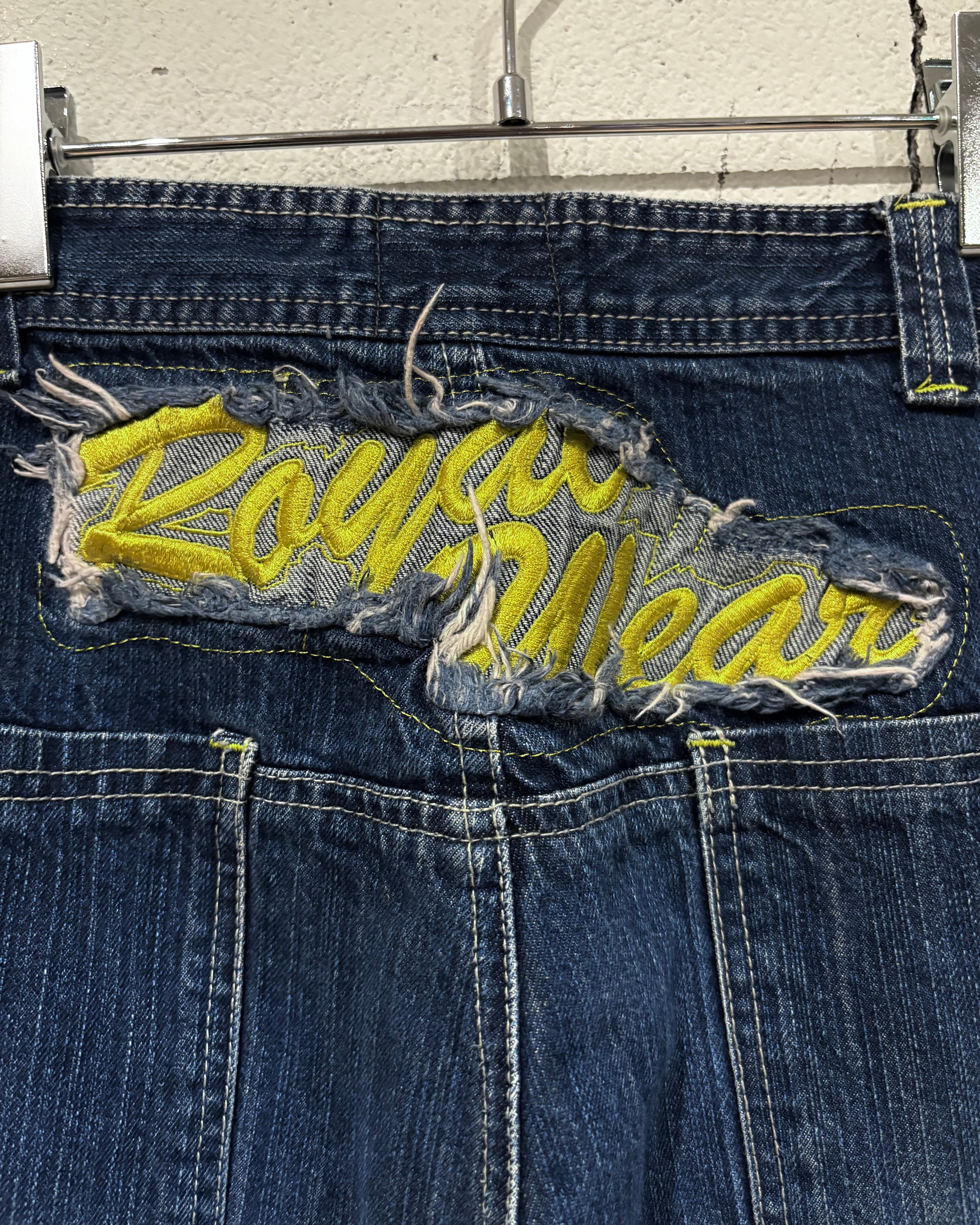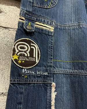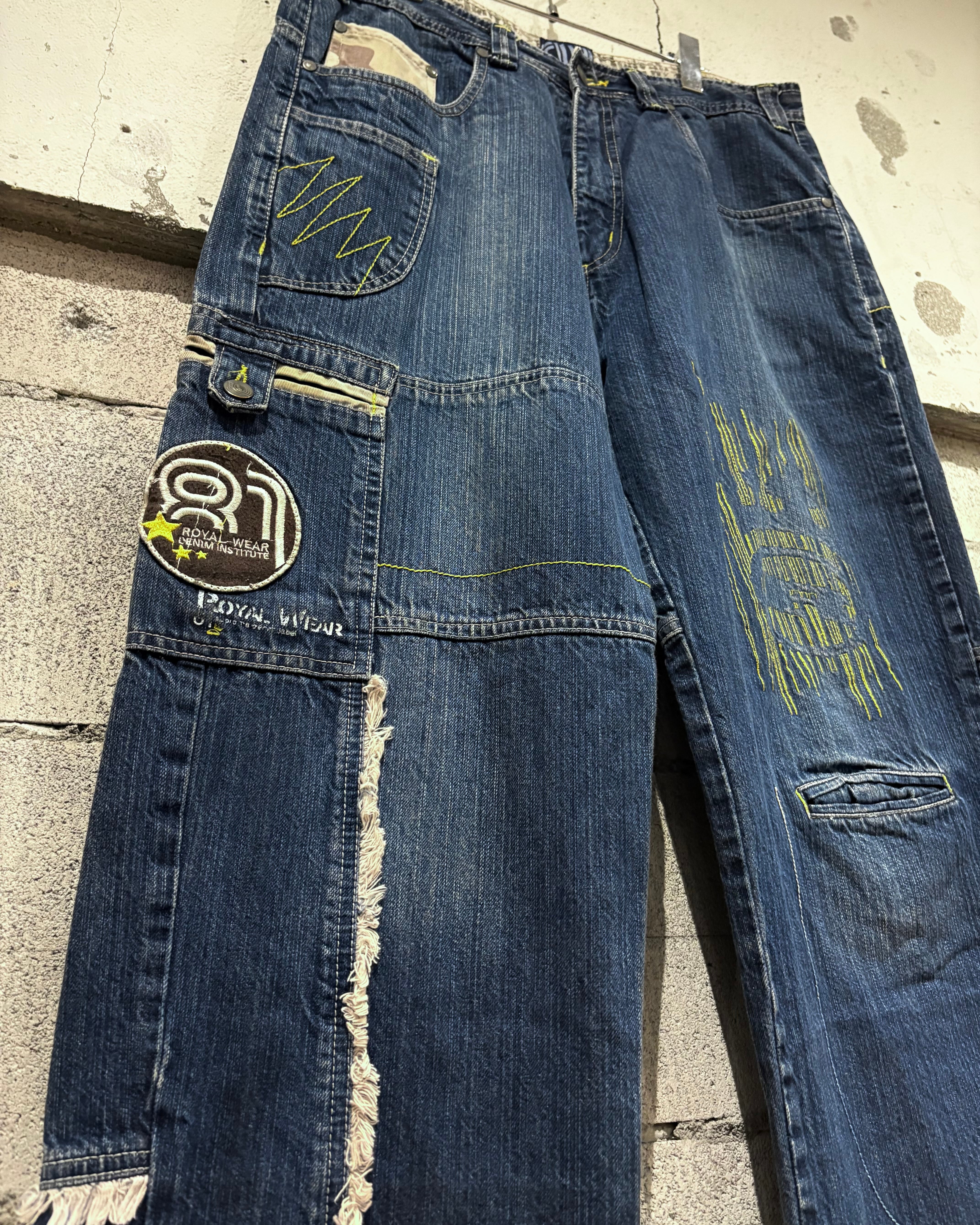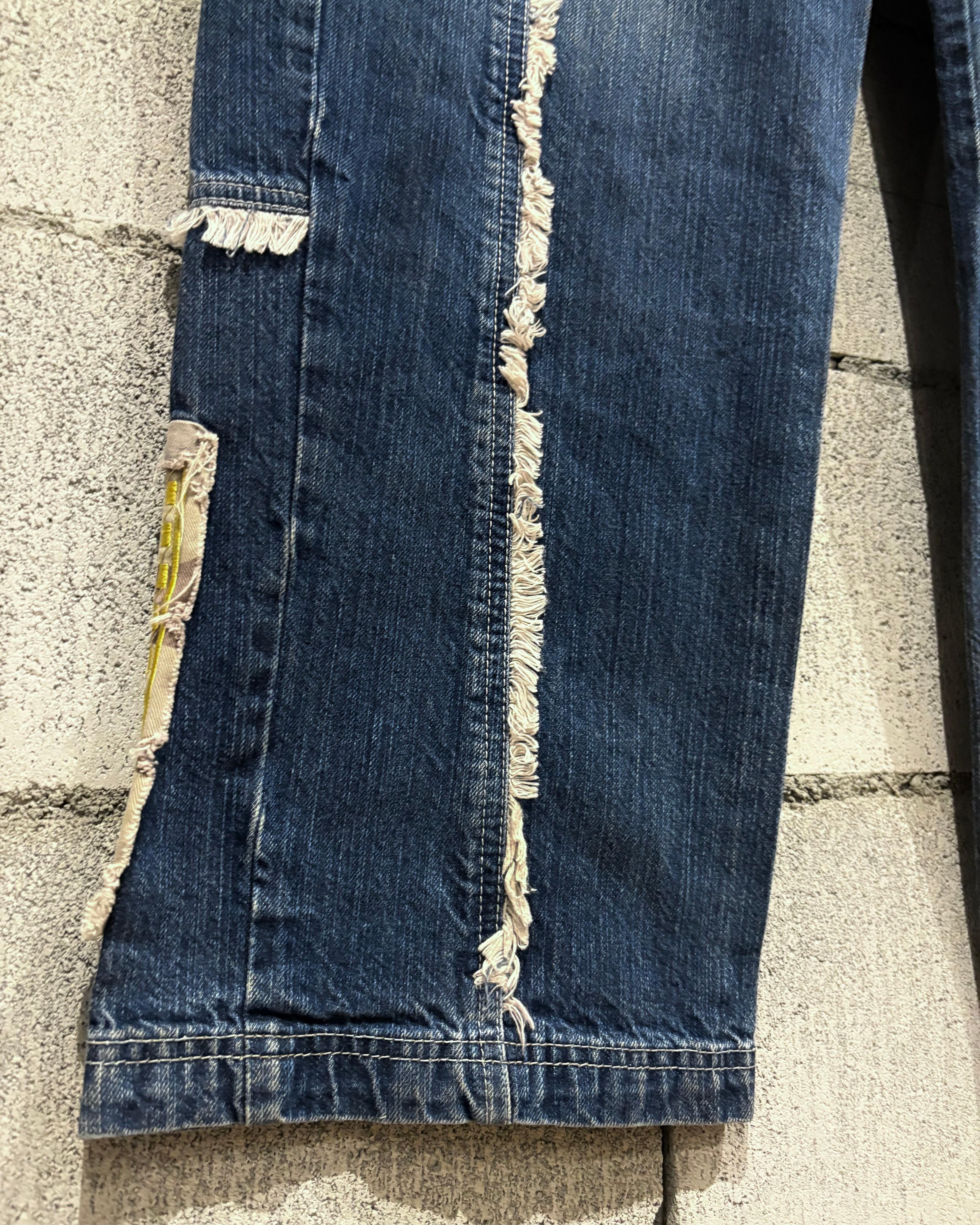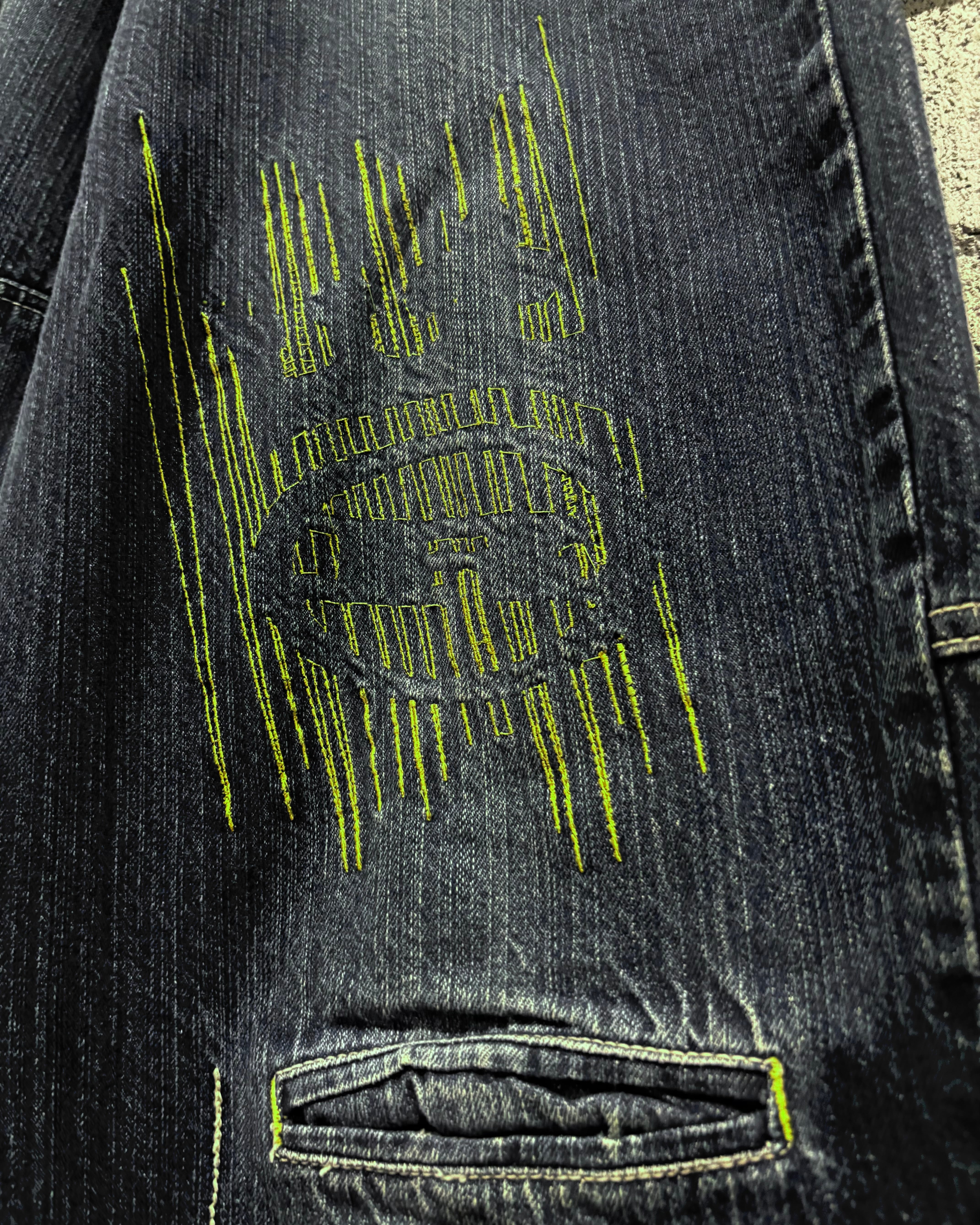 ブルーのデニムをベースに、ボディの随所にステッチでジグザグを、ポケットや背面には刺繍やワッペン、パッチでロゴ、ナンバリングを表現したハイなデザインが光るデニムパンツ。