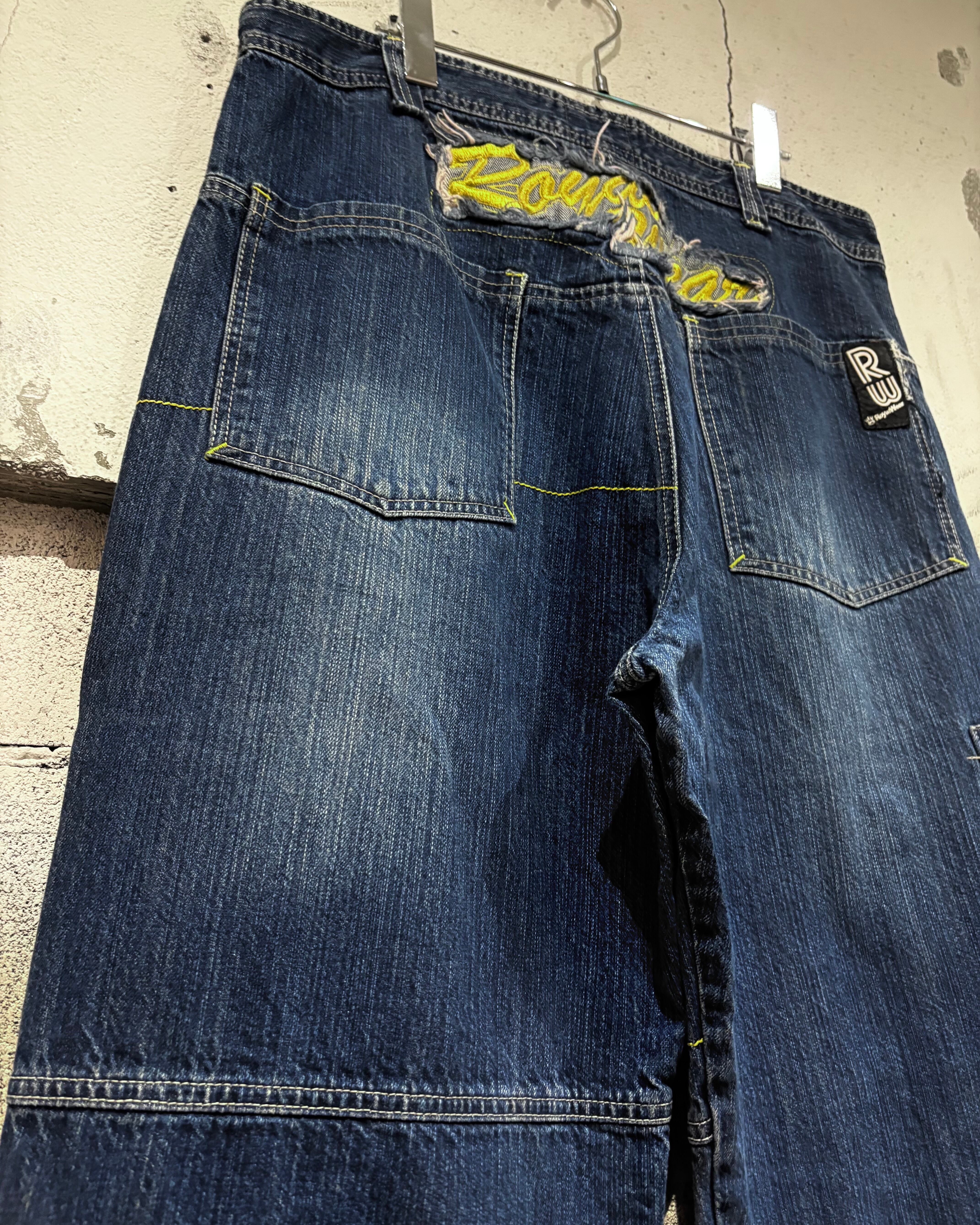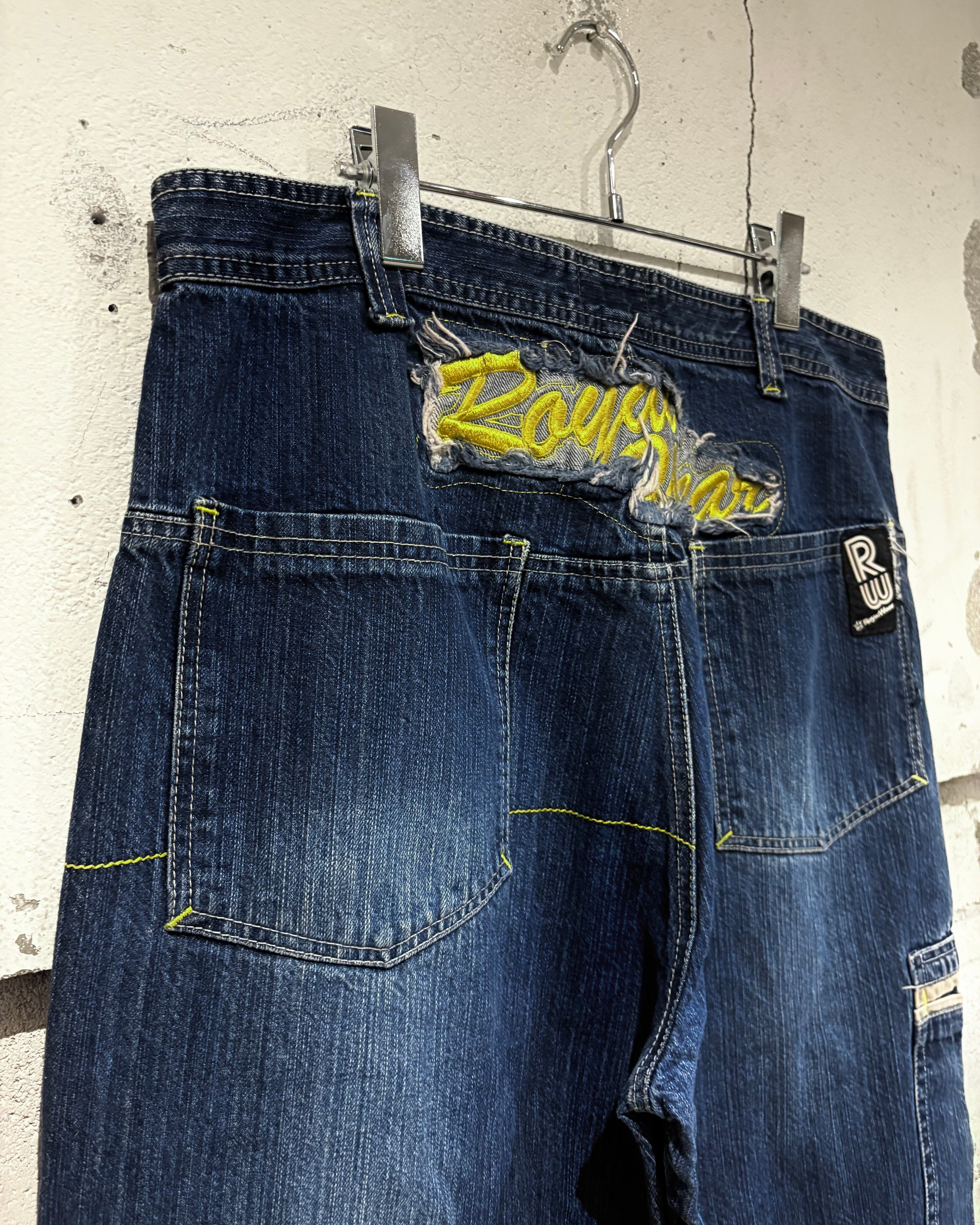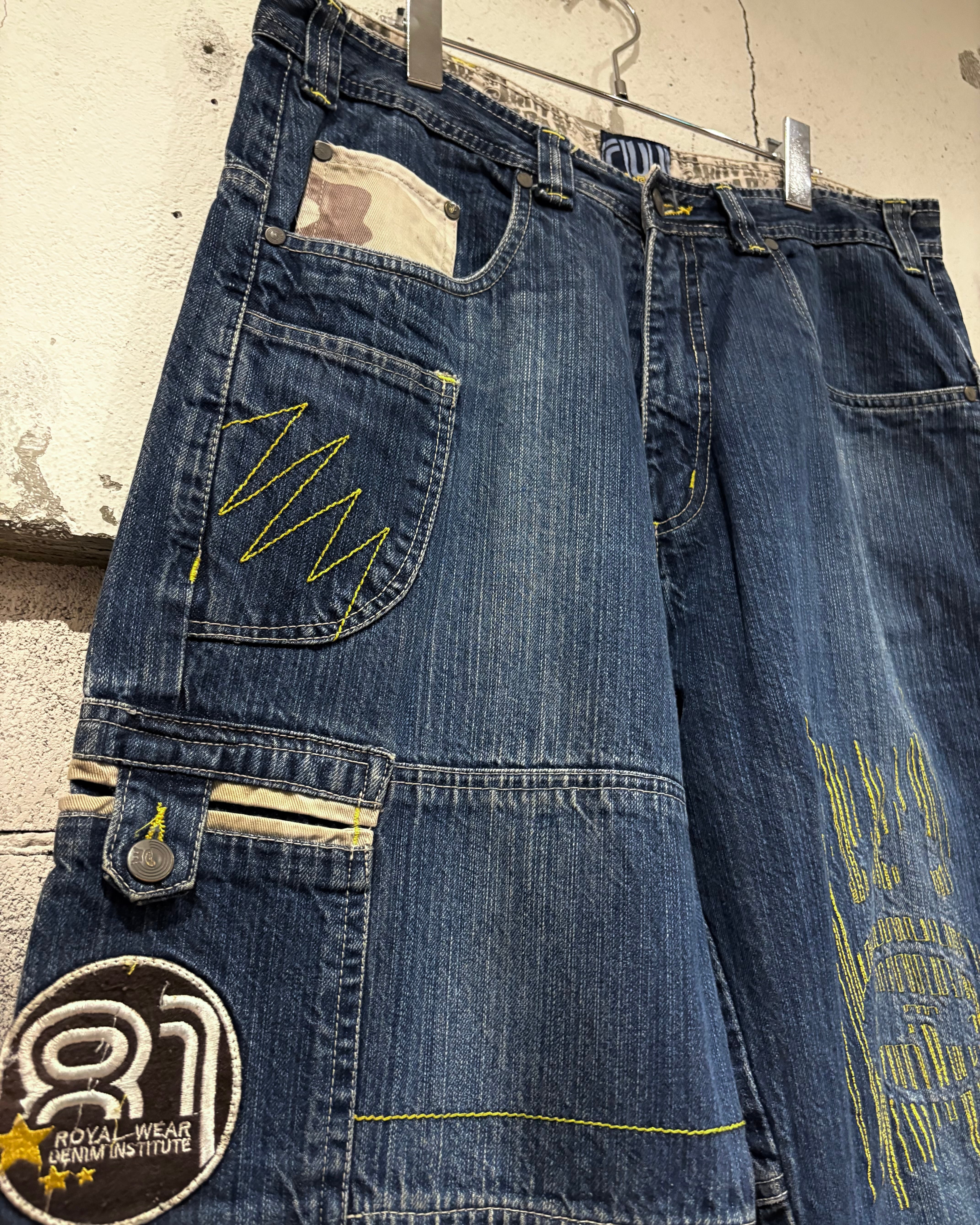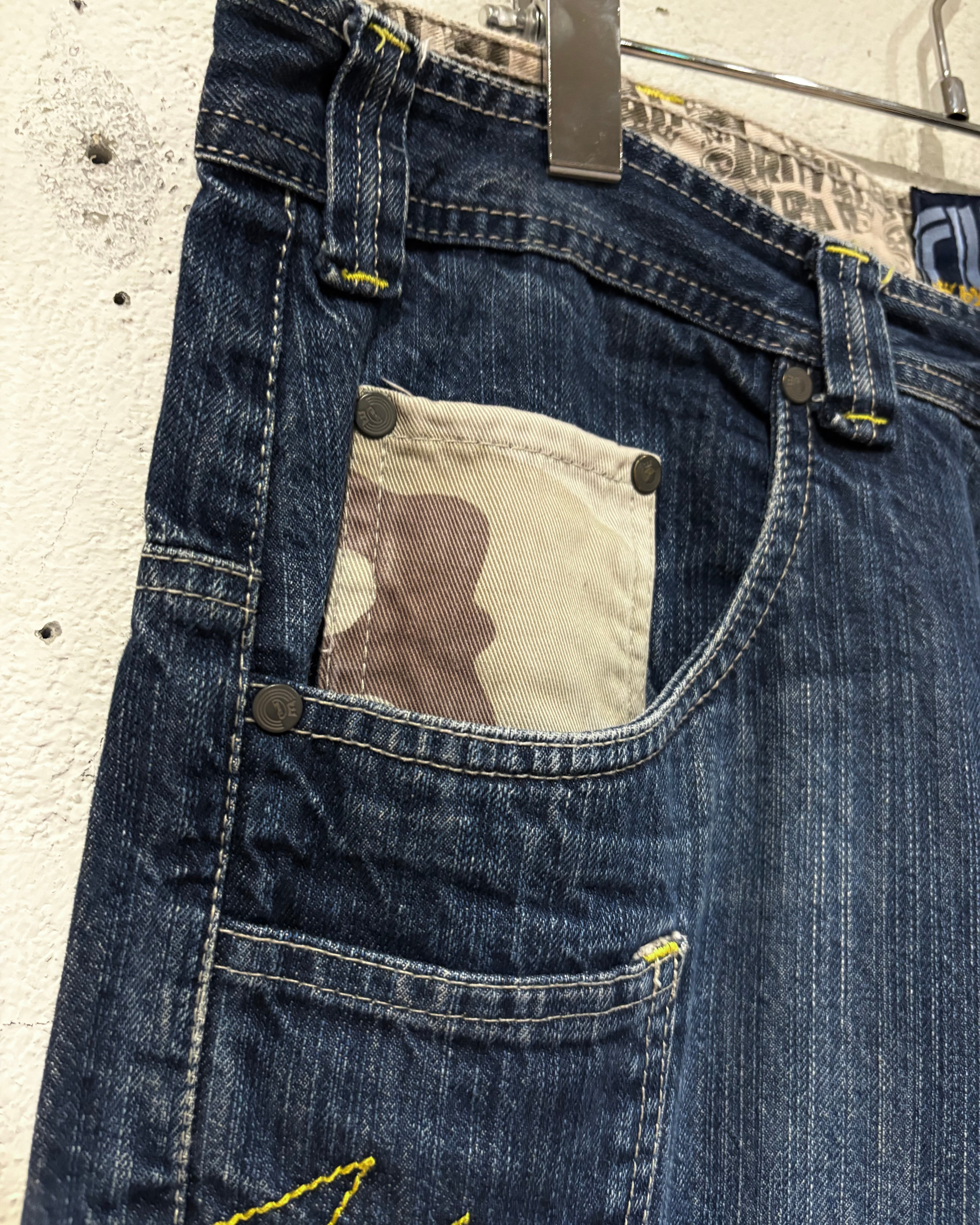 ブルーのデニムをベースに、ボディの随所にステッチでジグザグを、ポケットや背面には刺繍やワッペン、パッチでロゴ、ナンバリングを表現したハイなデザインが光るデニムパンツ。