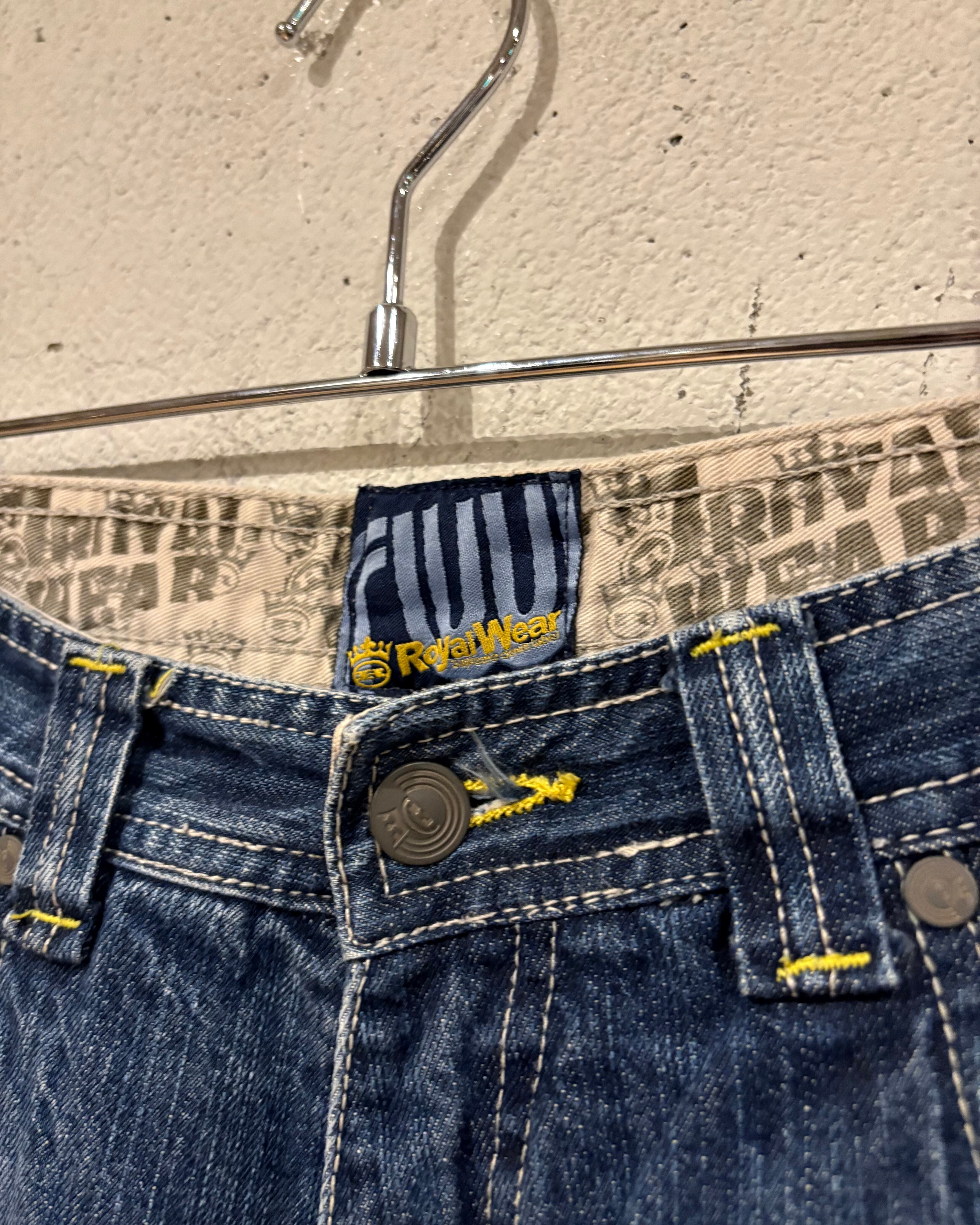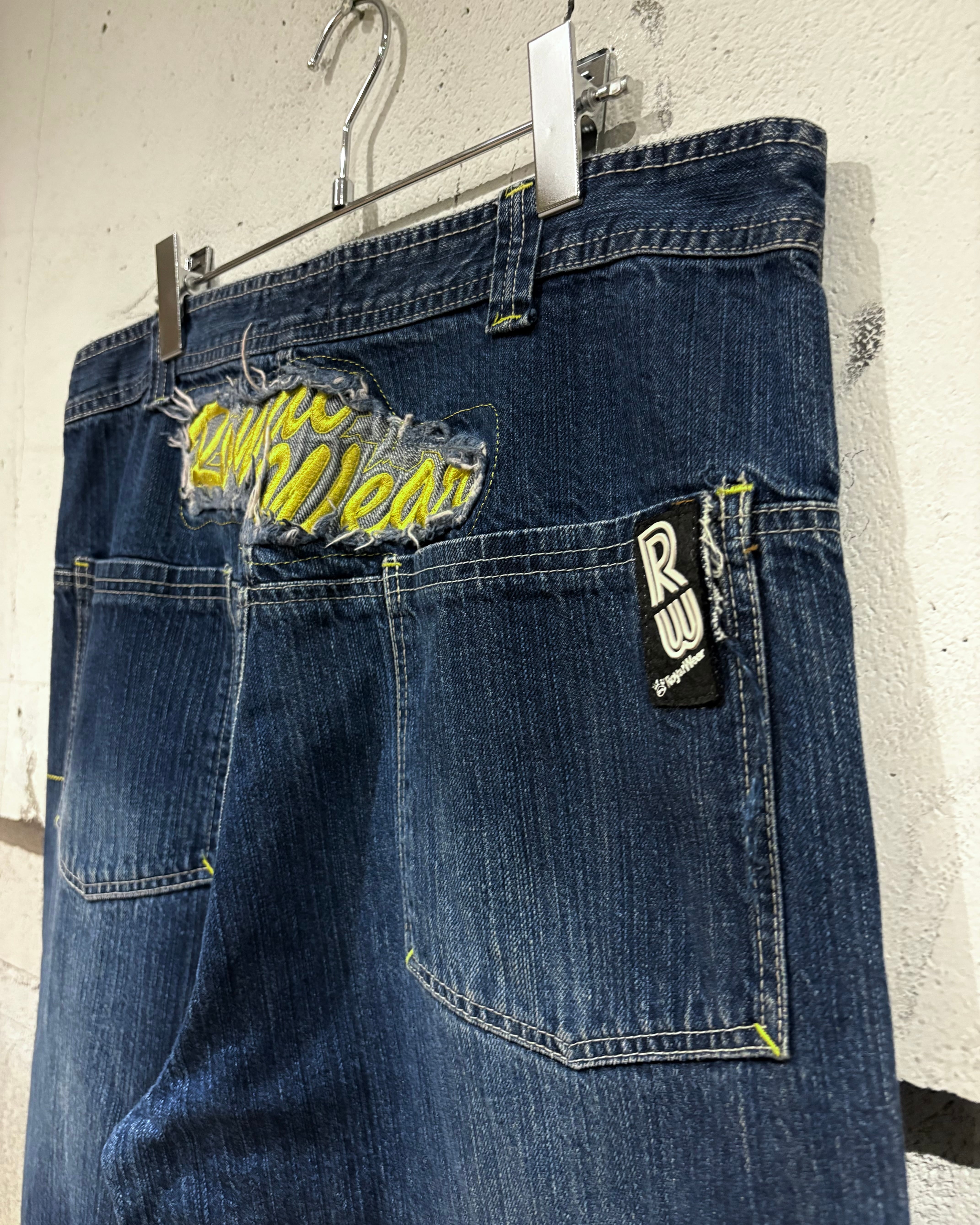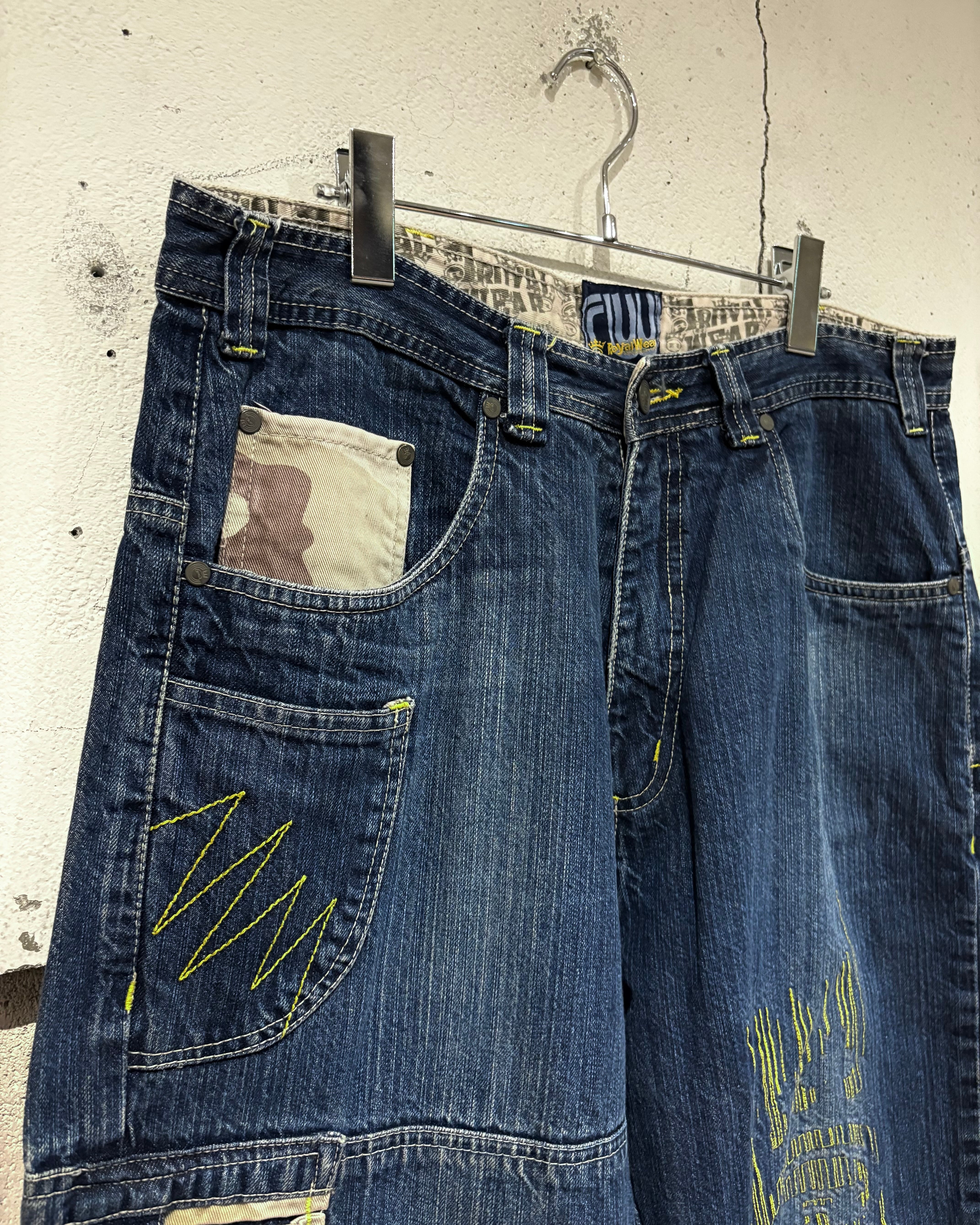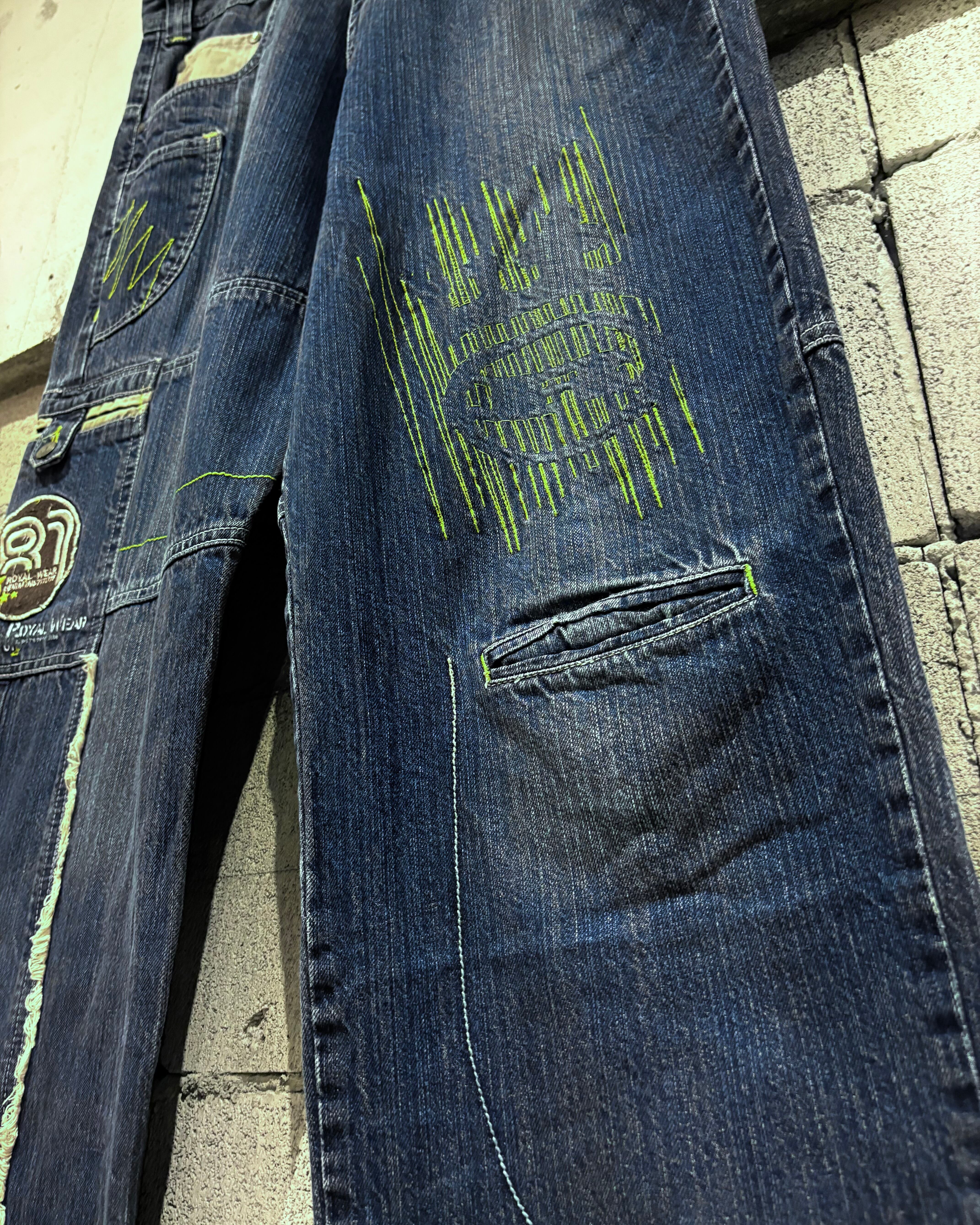ブルーのデニムをベースに、ボディの随所にステッチでジグザグを、ポケットや背面には刺繍やワッペン、パッチでロゴ、ナンバリングを表現したハイなデザインが光るデニムパンツ。