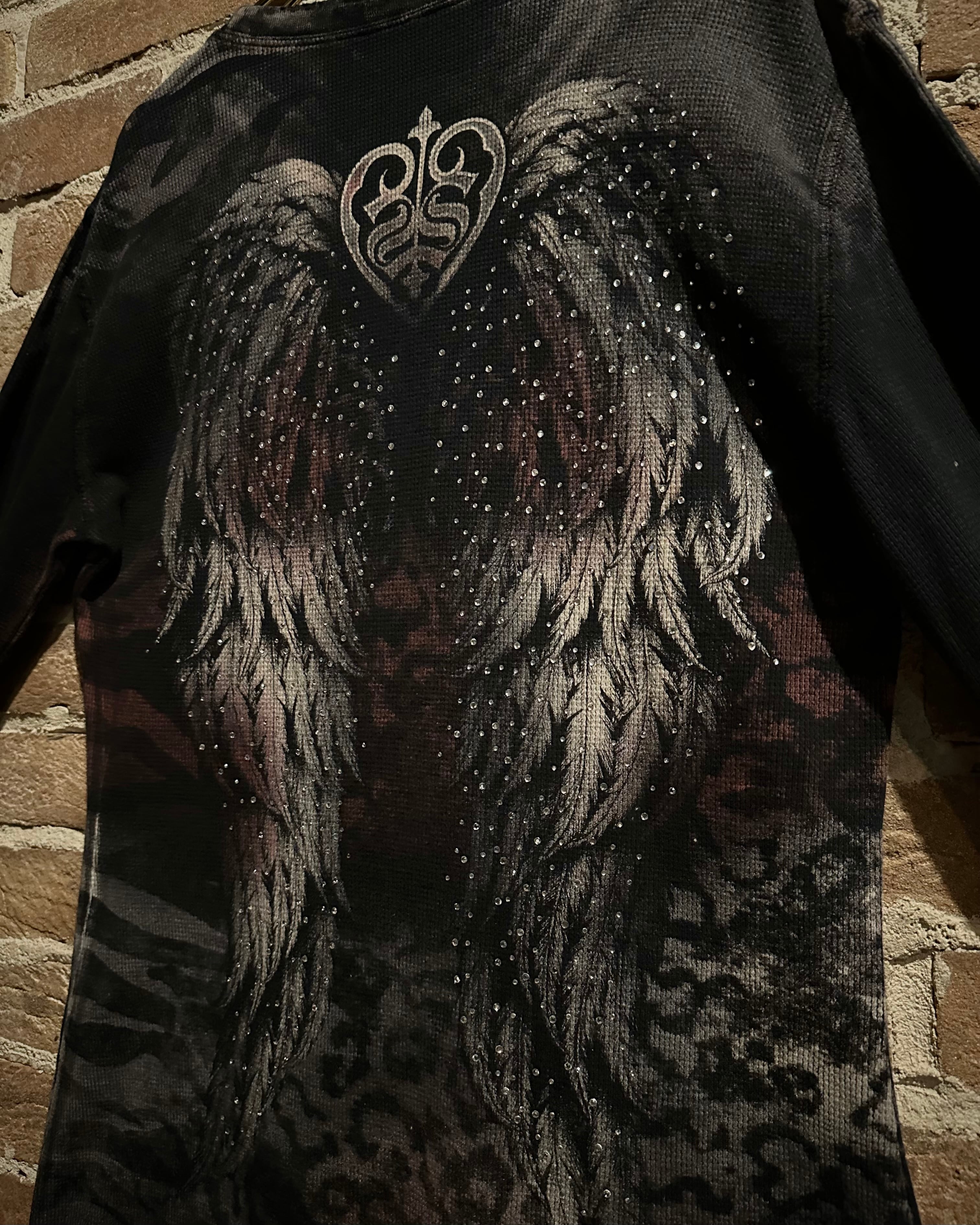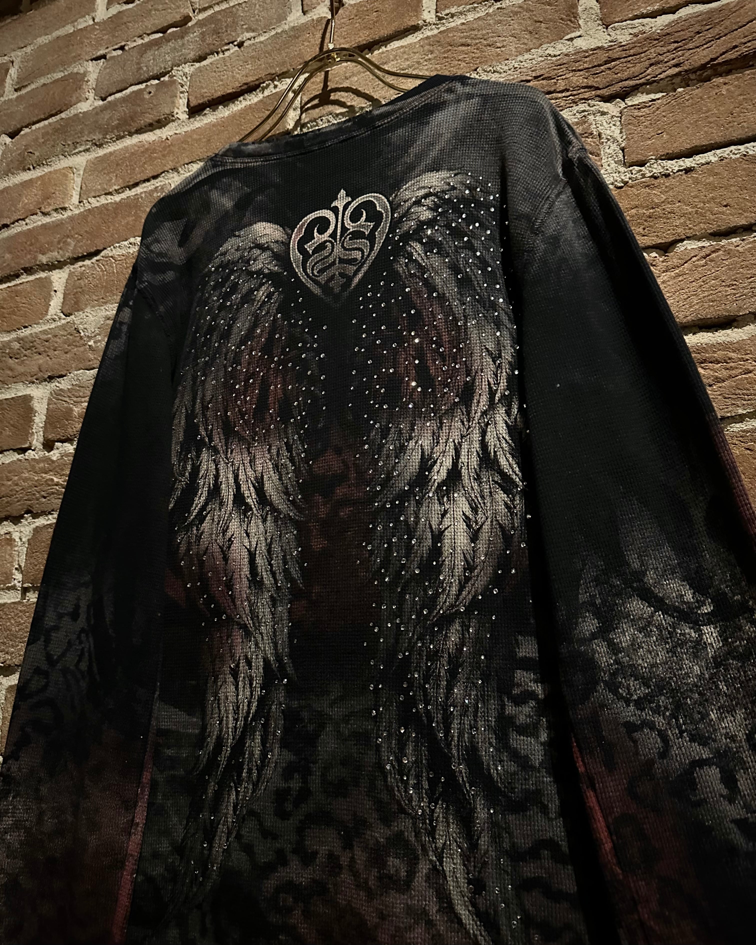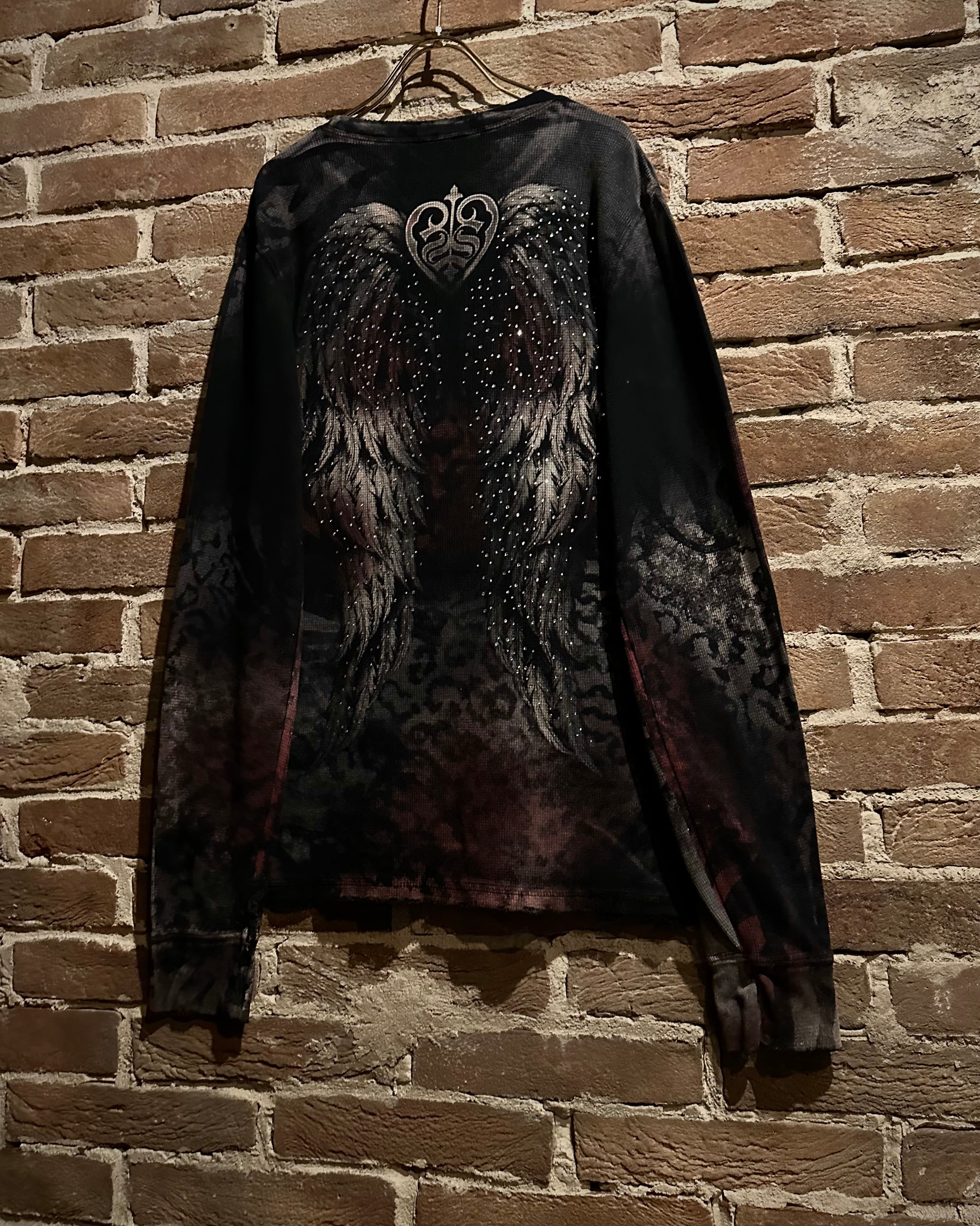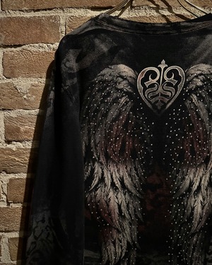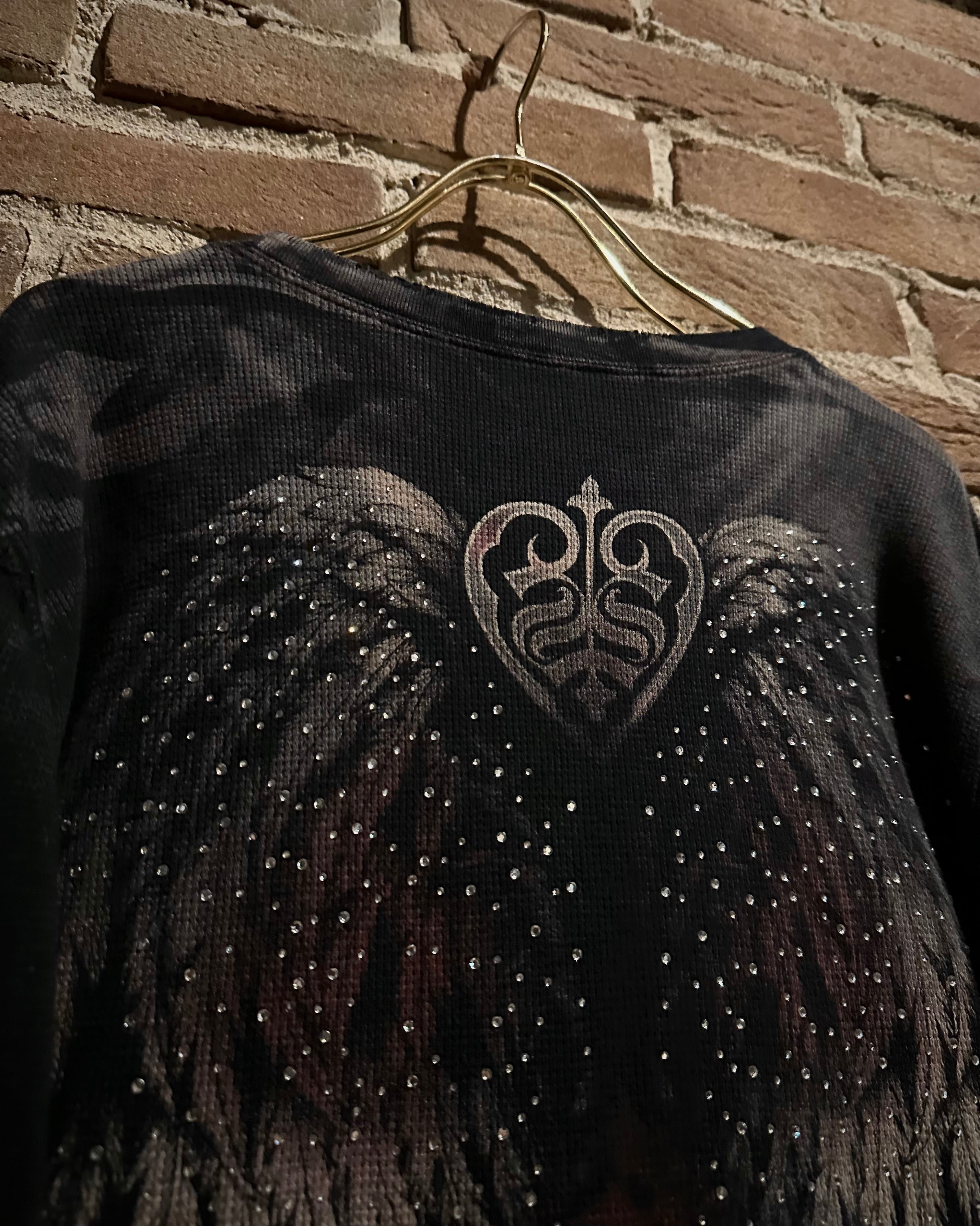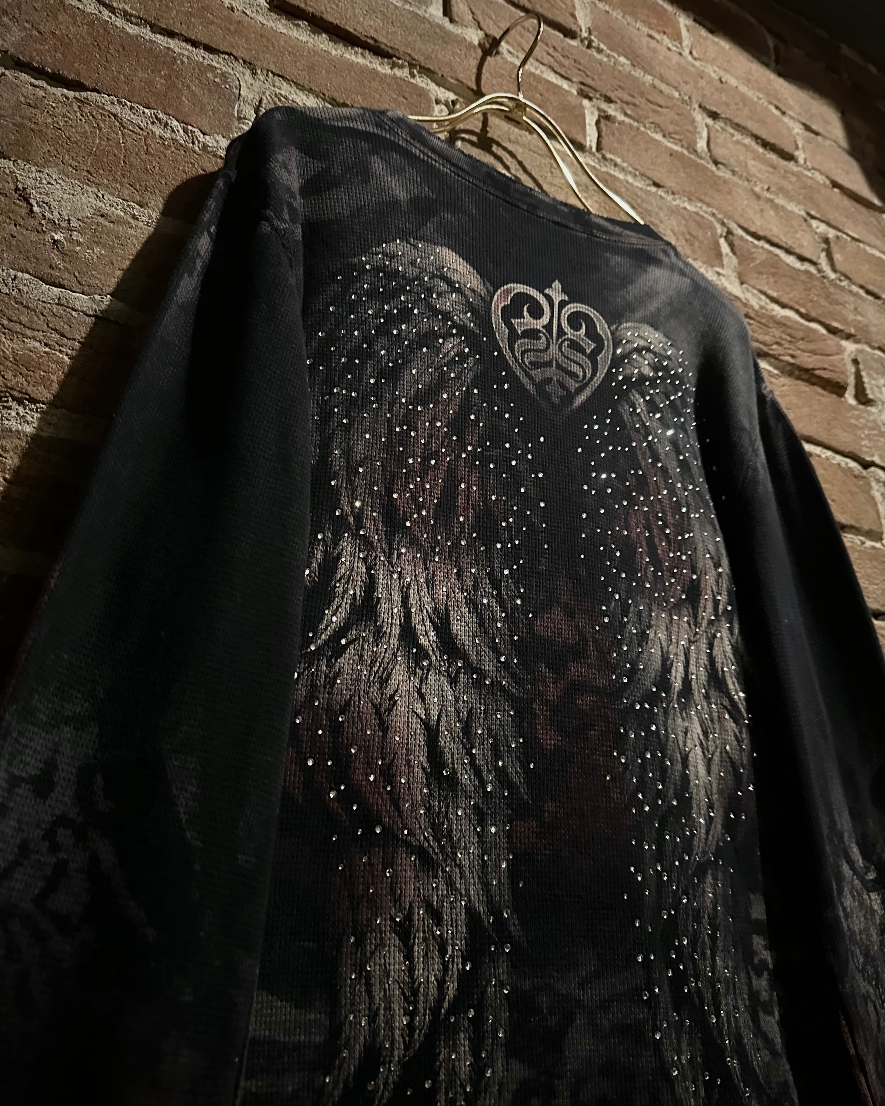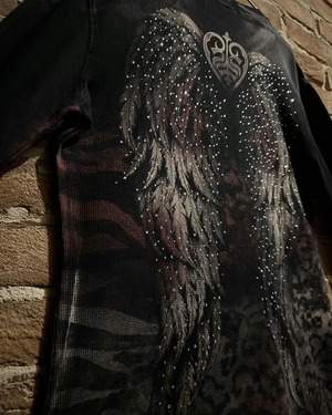 フロントにはブランドネーム、背面には美しい羽がプリントされ、さらにその上からラインストーンの装飾。