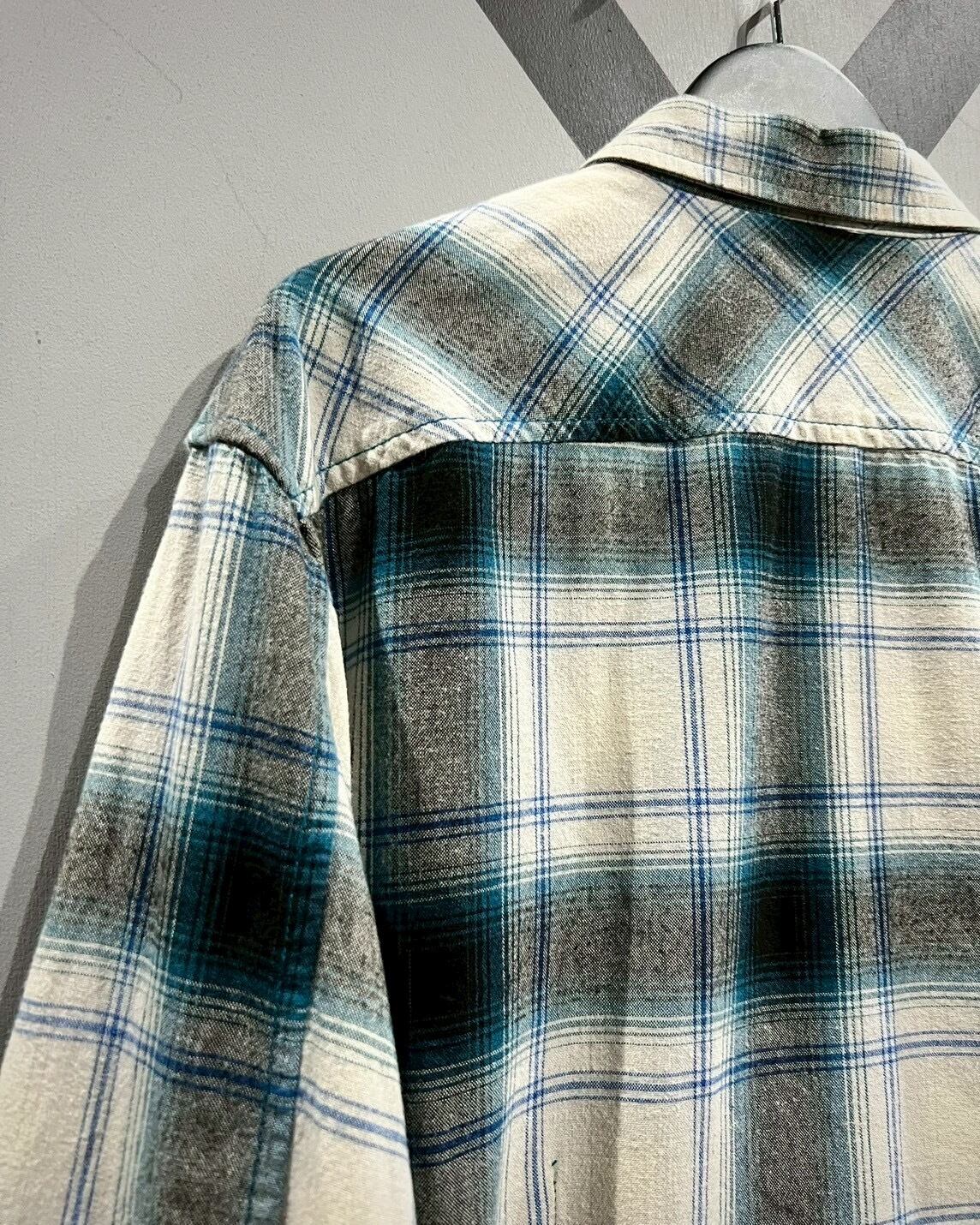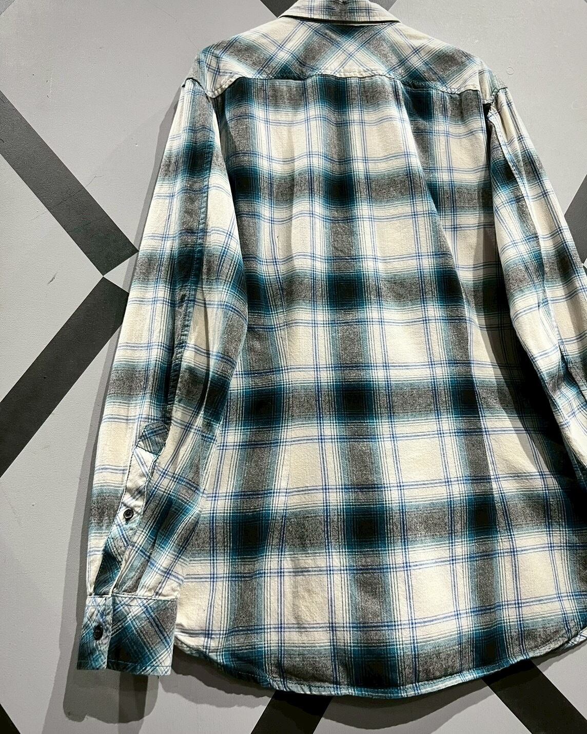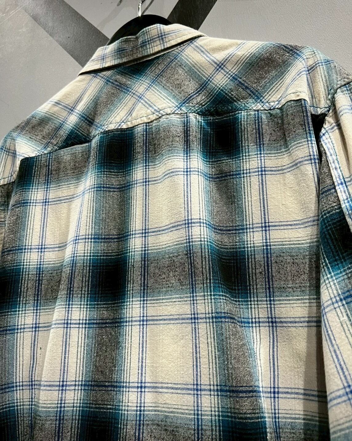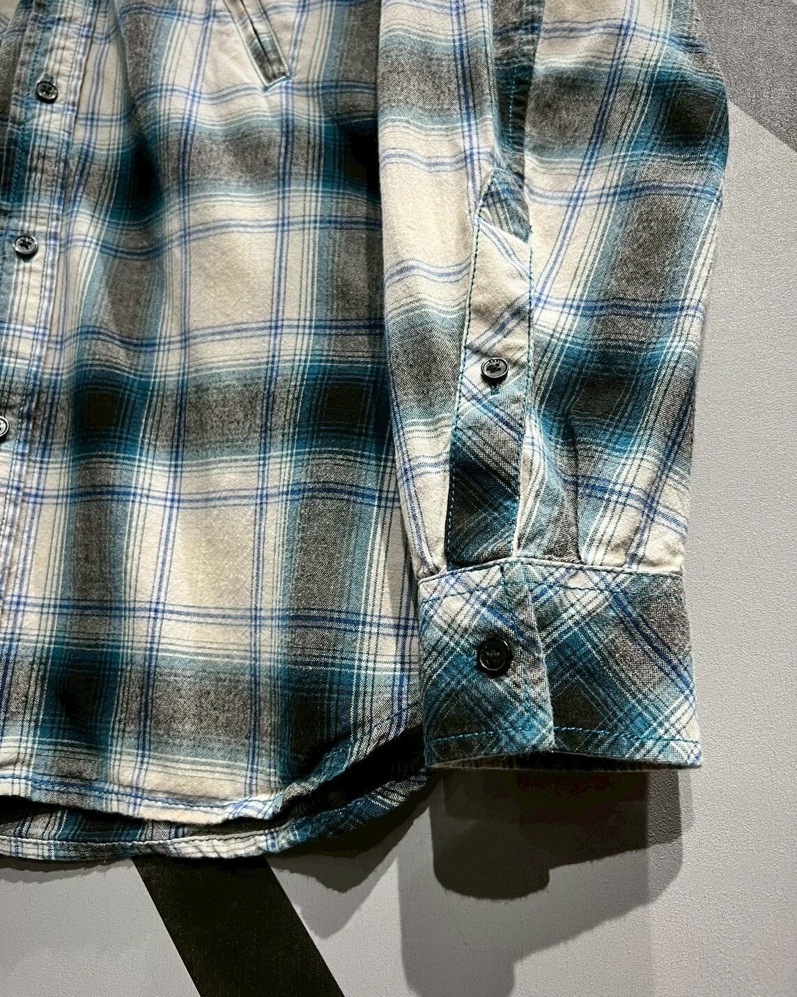 白のボディに、青、グレーでオンブレチェックを載せた長袖シャツ。
