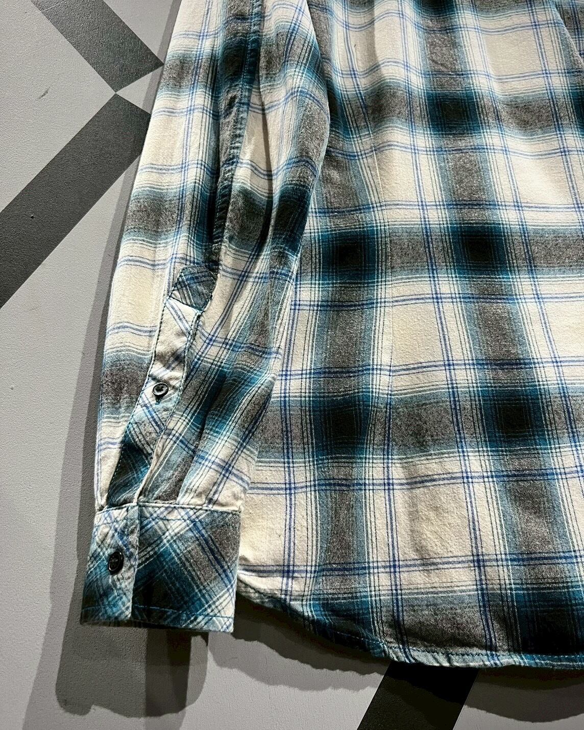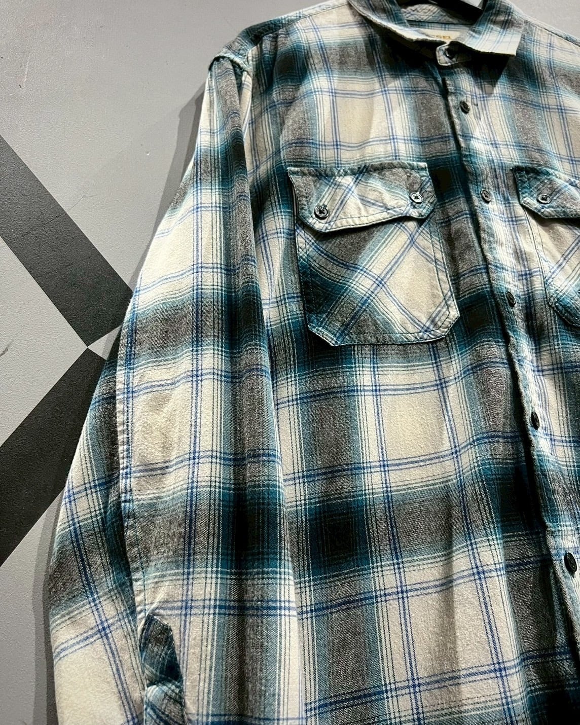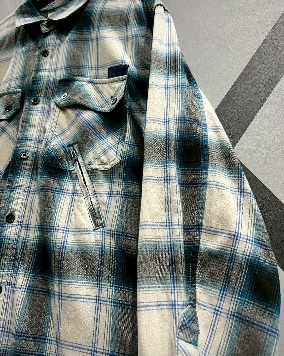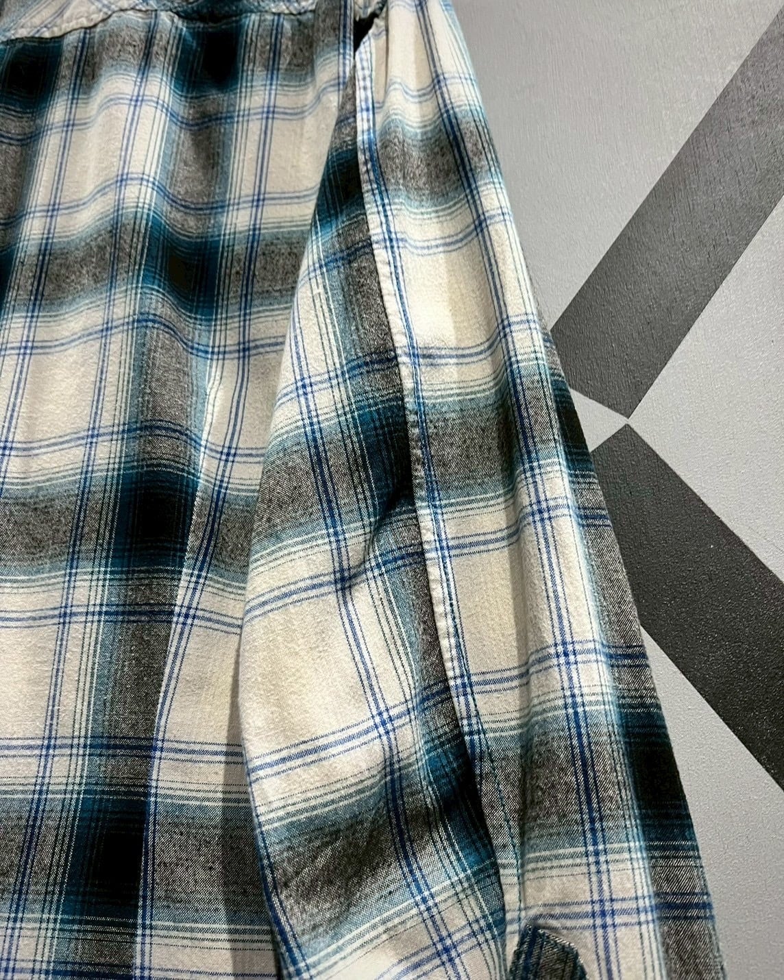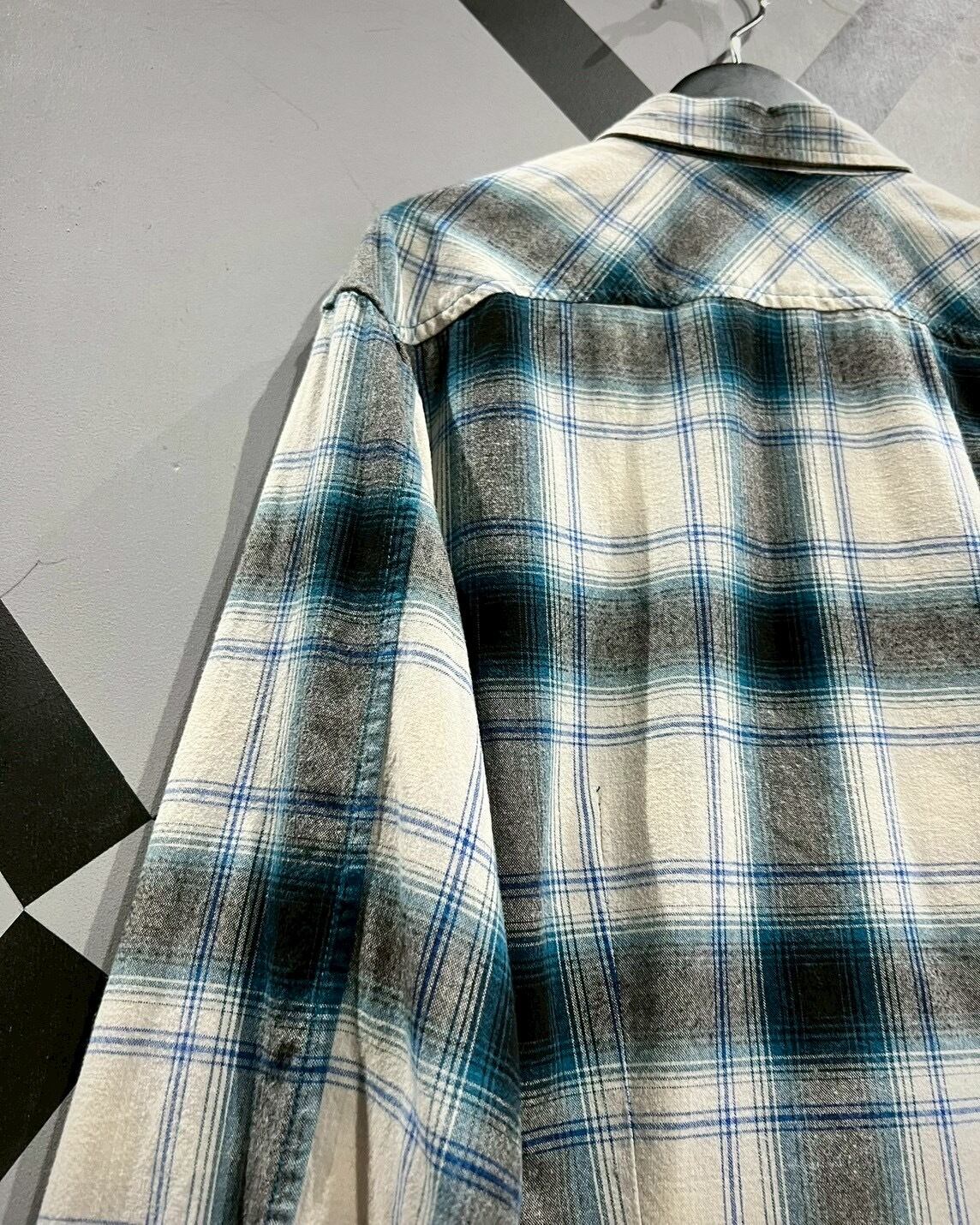 白のボディに、青、グレーでオンブレチェックを載せた長袖シャツ。