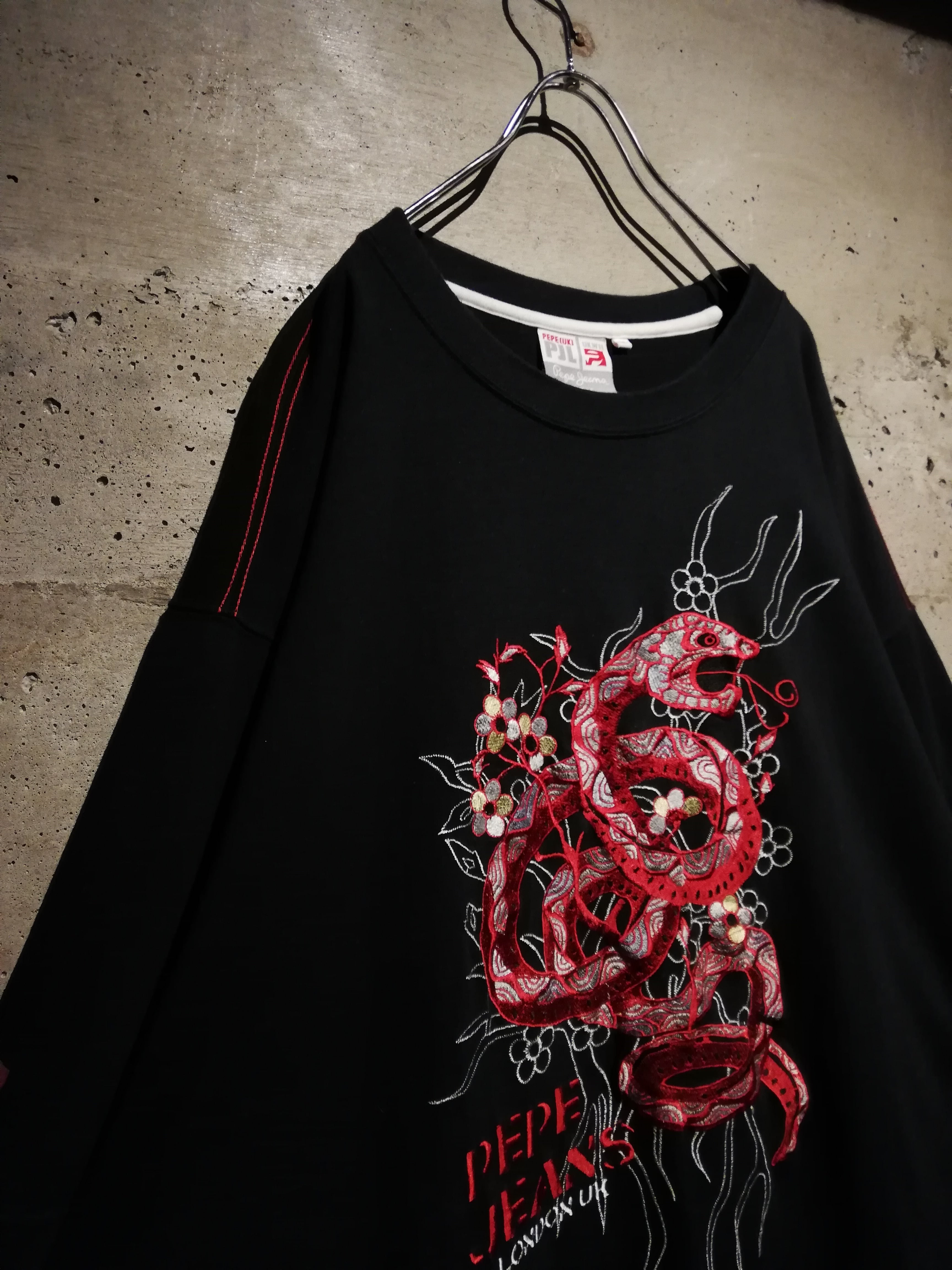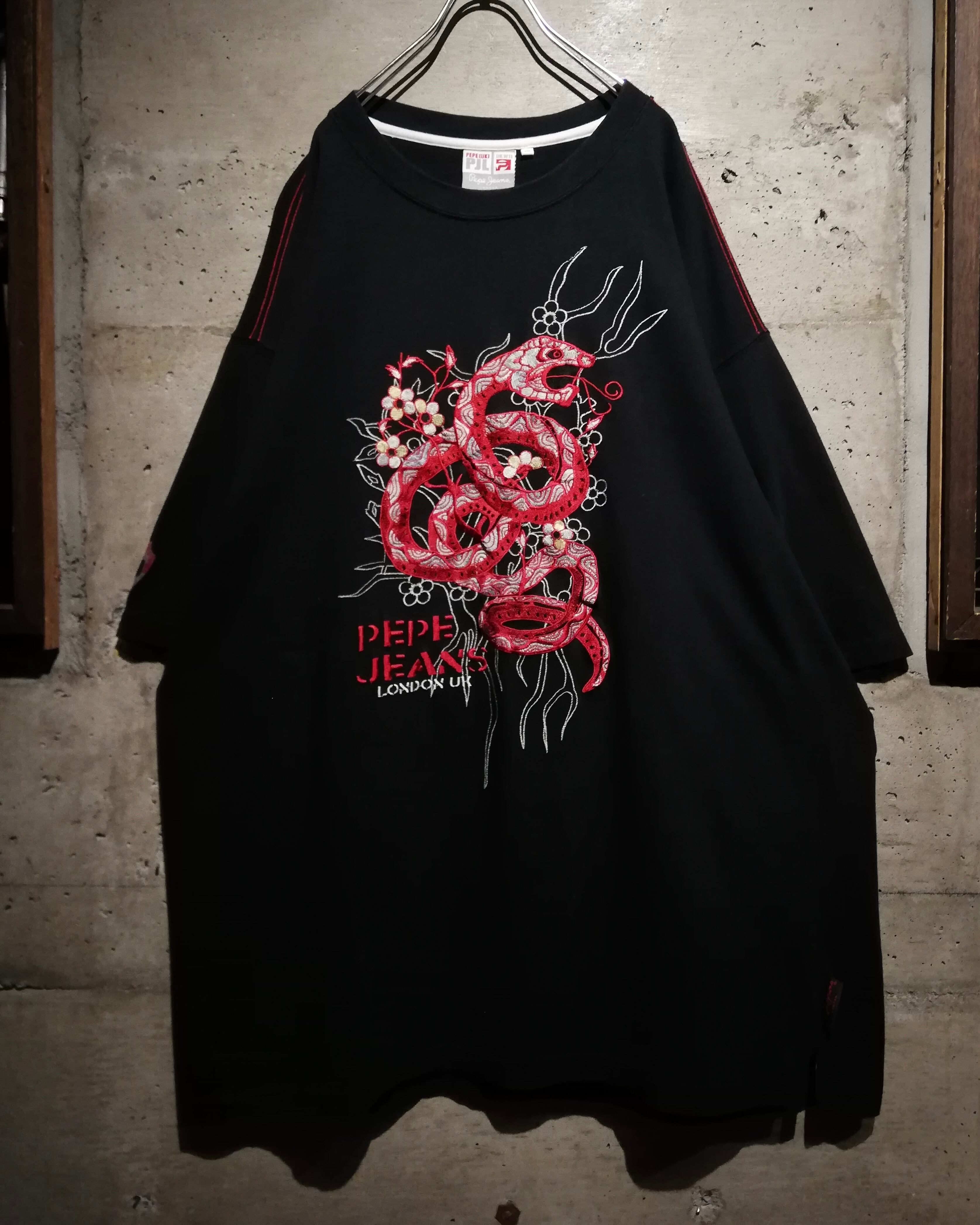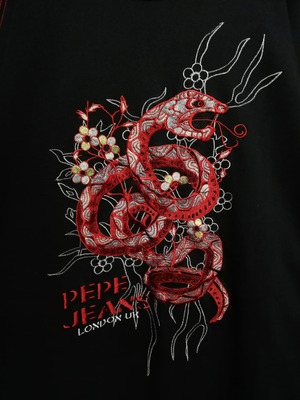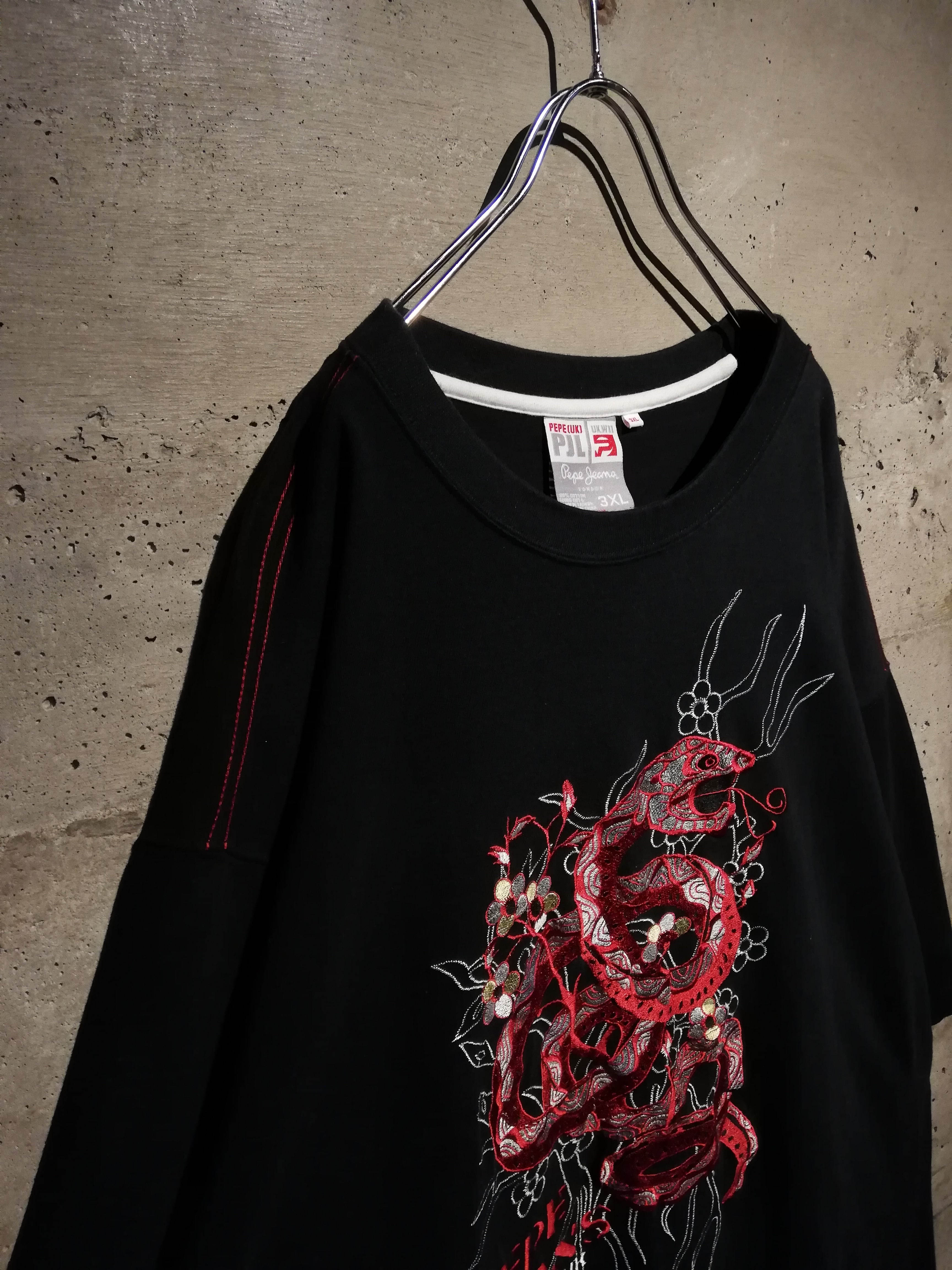 黒のボディをベースに、フロントに花や蛇を刺繍で表現した1着。