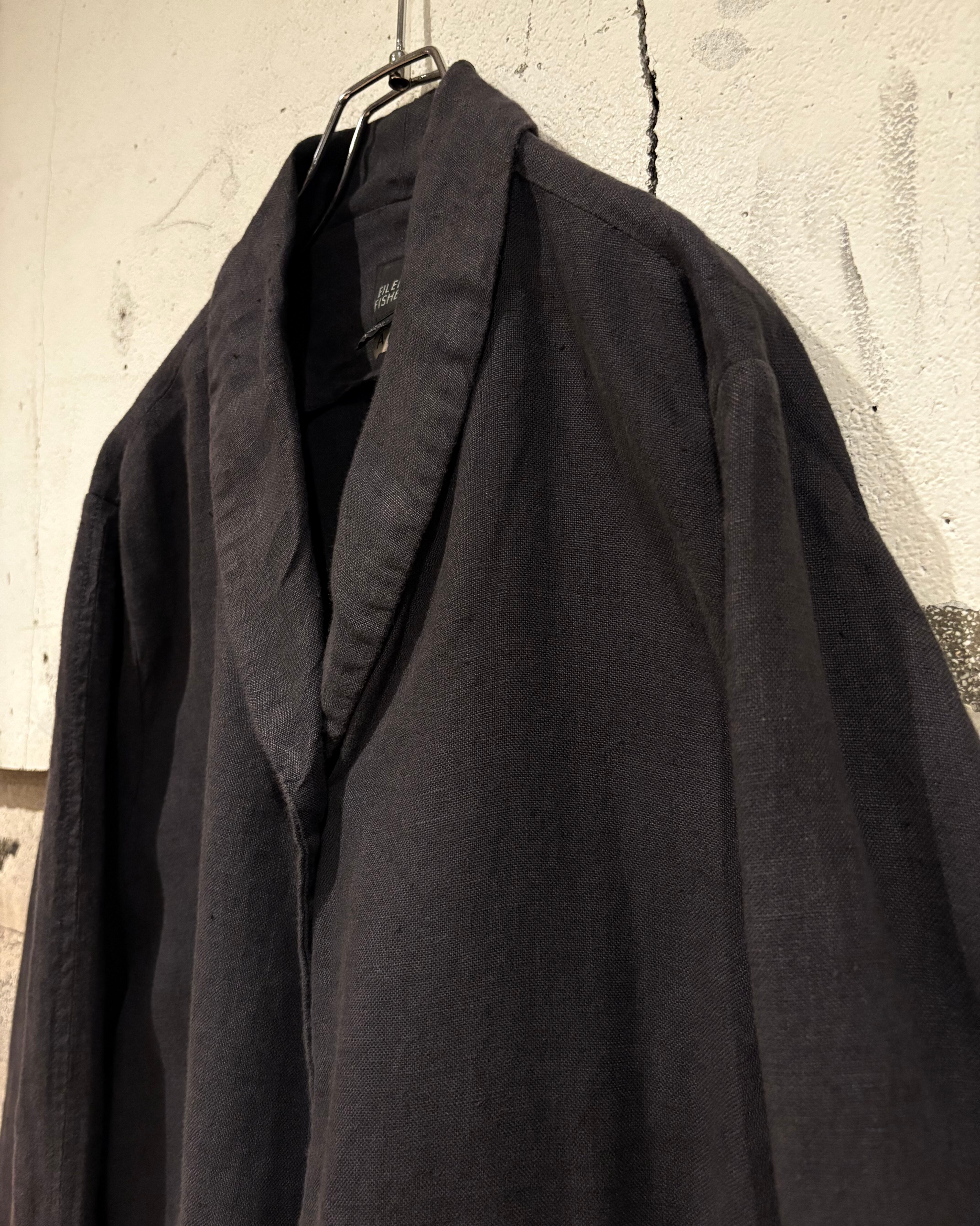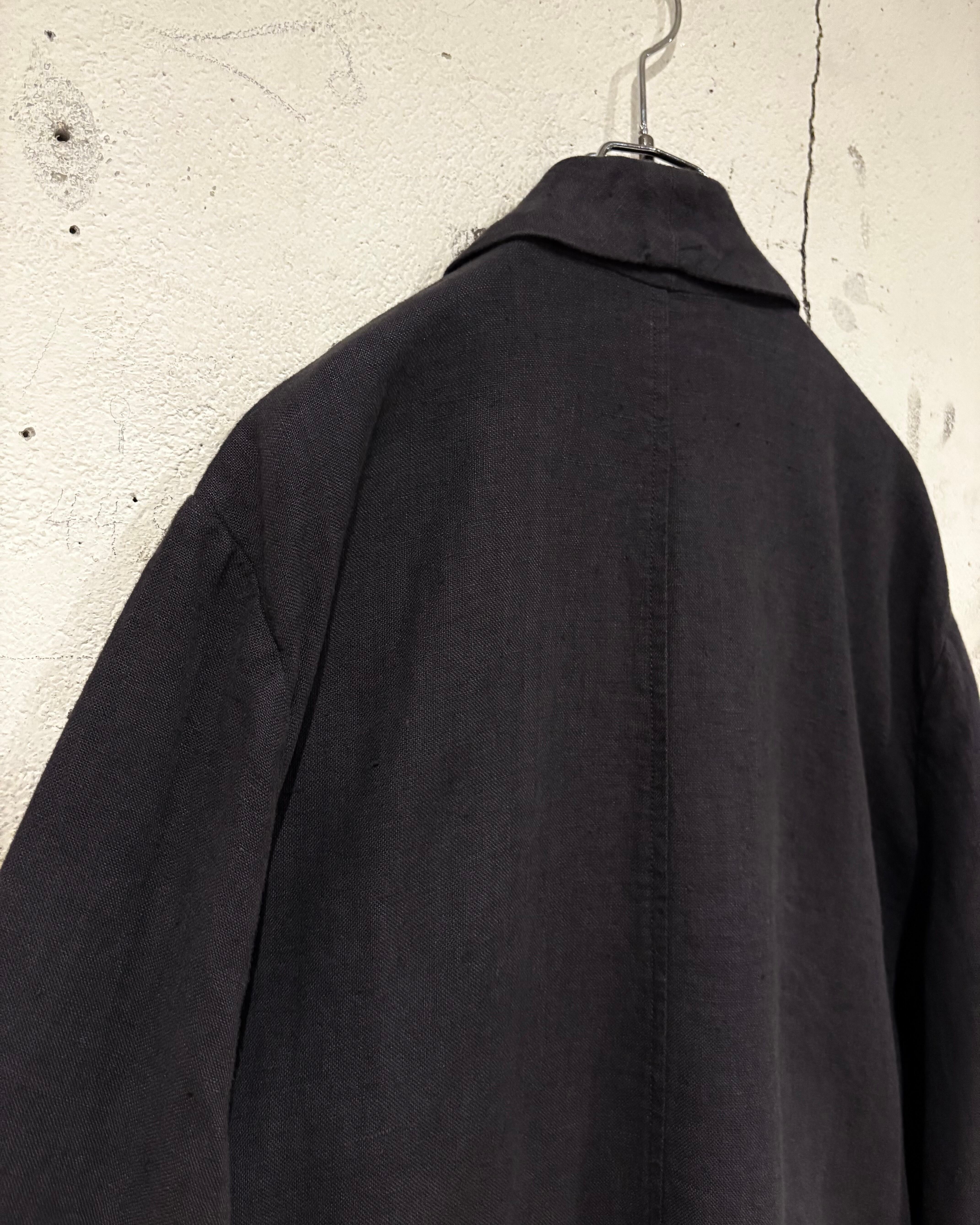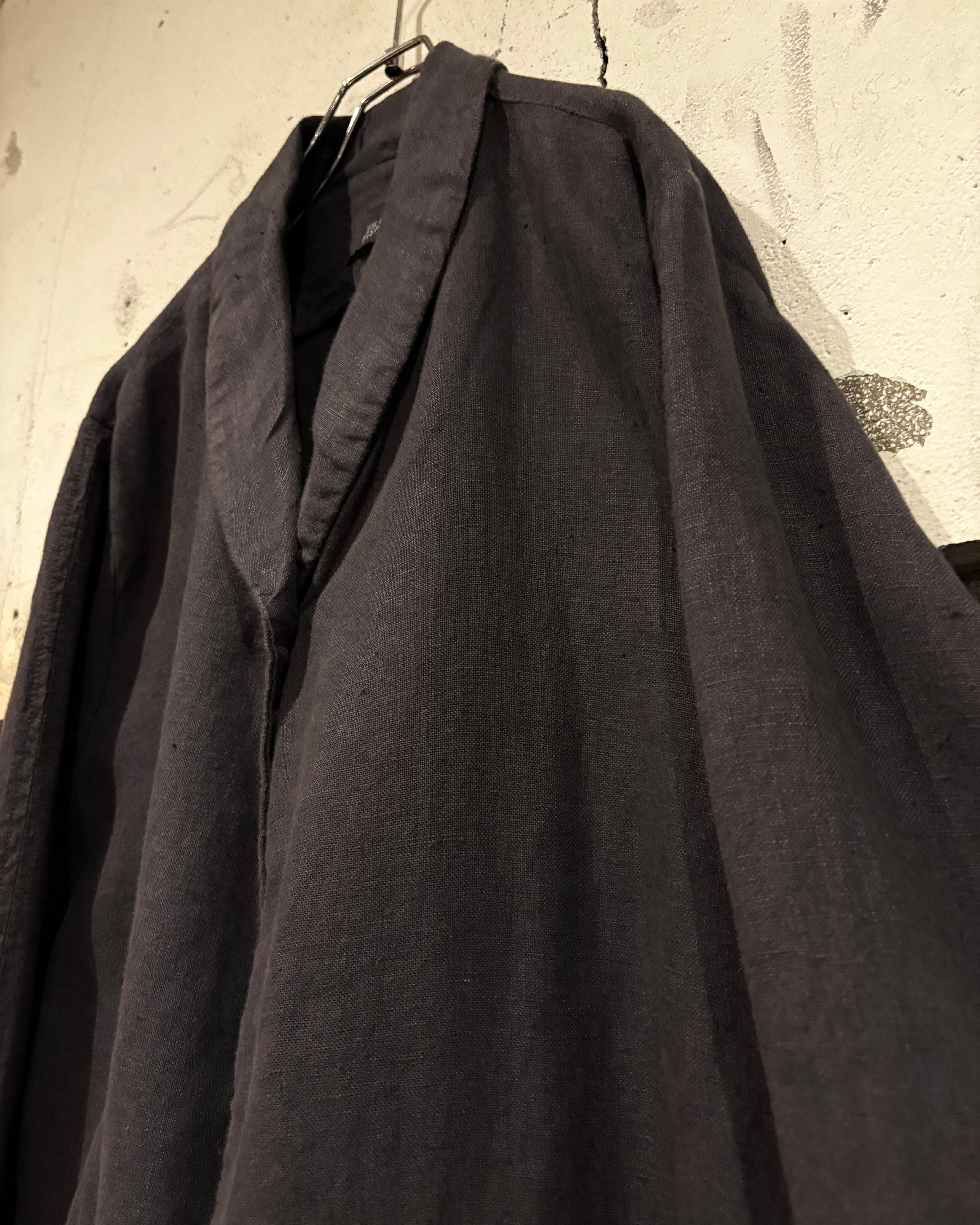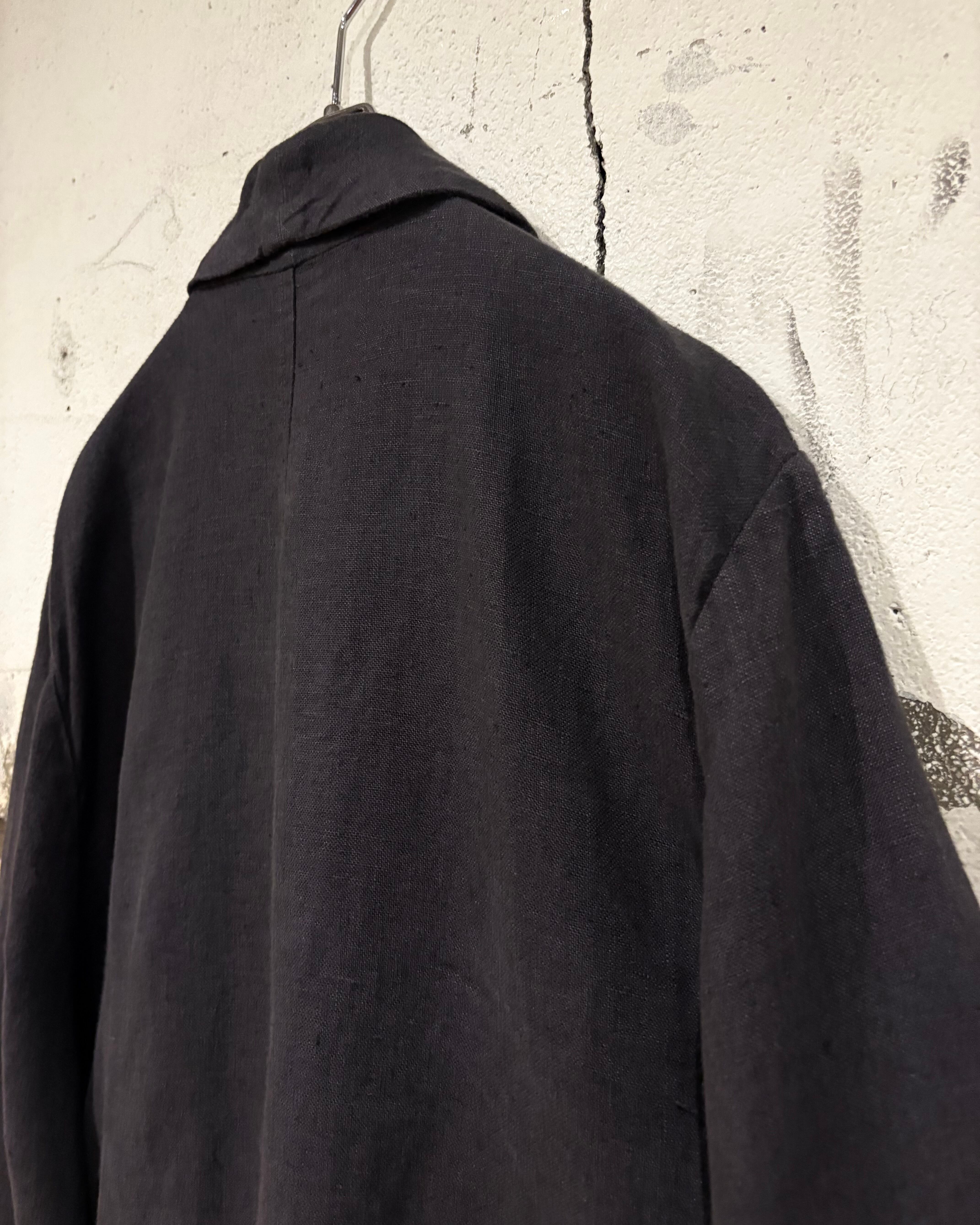 襟はショールカラー、トップボタンはくるみボタン、フロントはアイテムの雰囲気を引き立てる比翼仕立てでミニマルなデザイン。シンプルが故に素材の雰囲気が最大限に引き出されています。