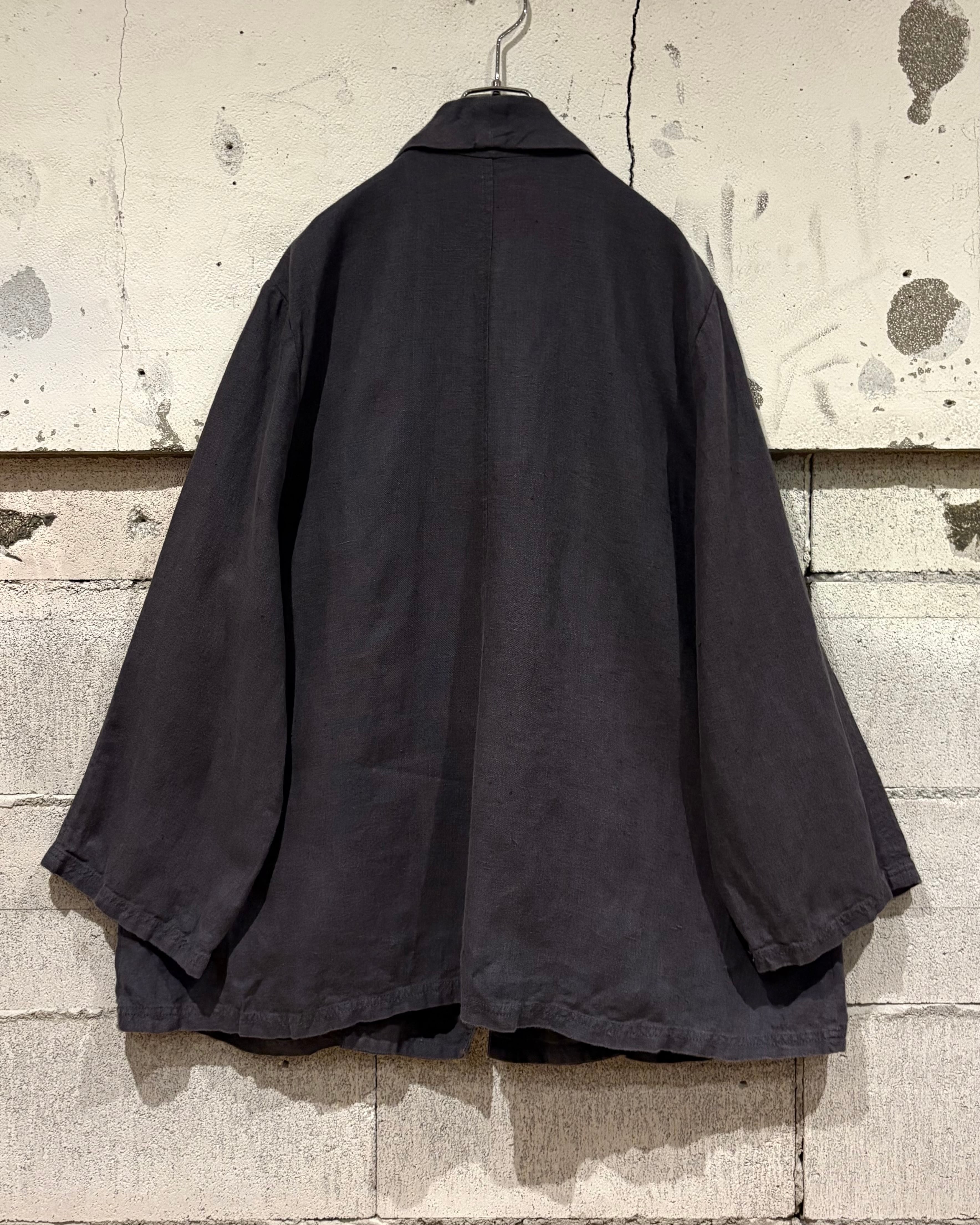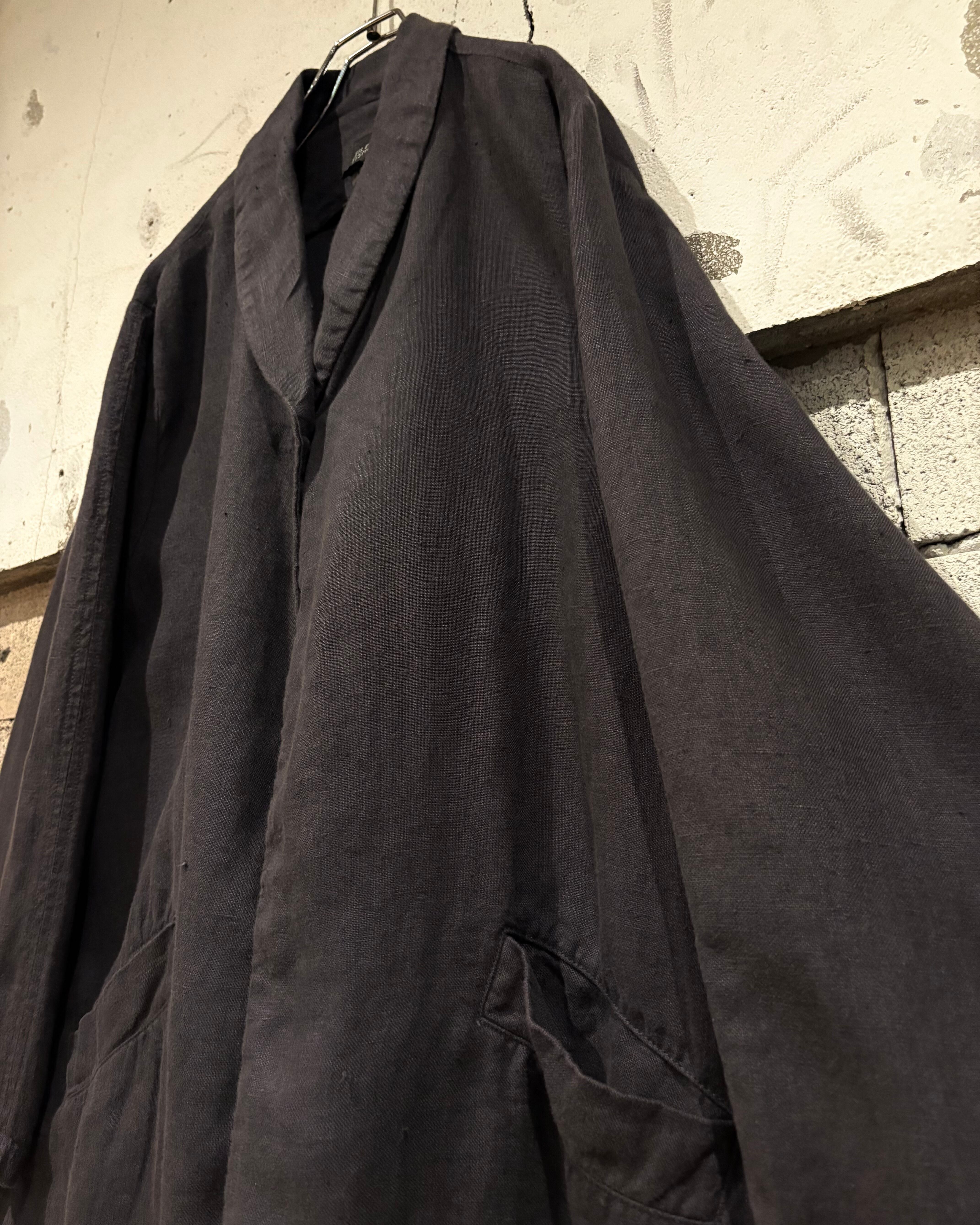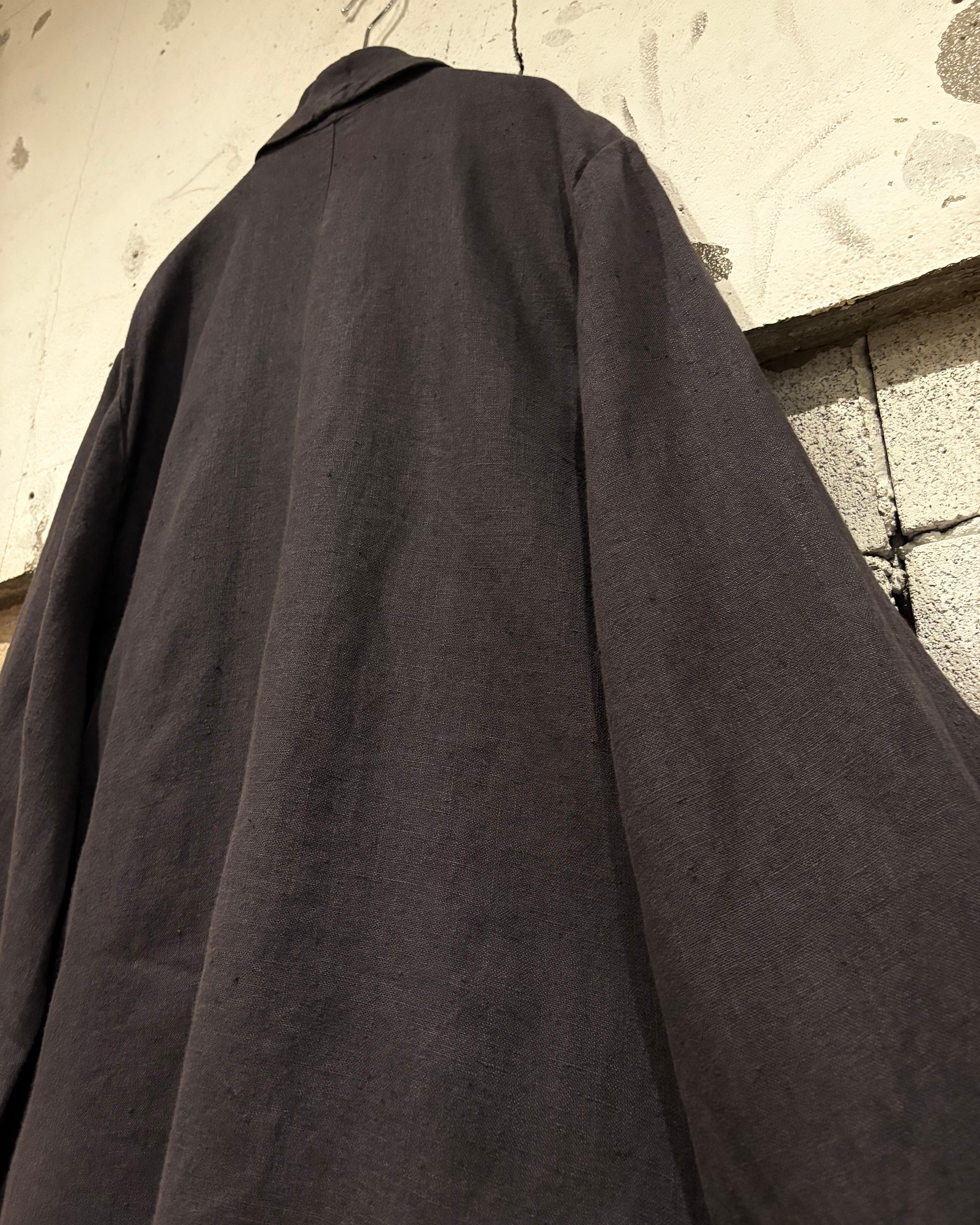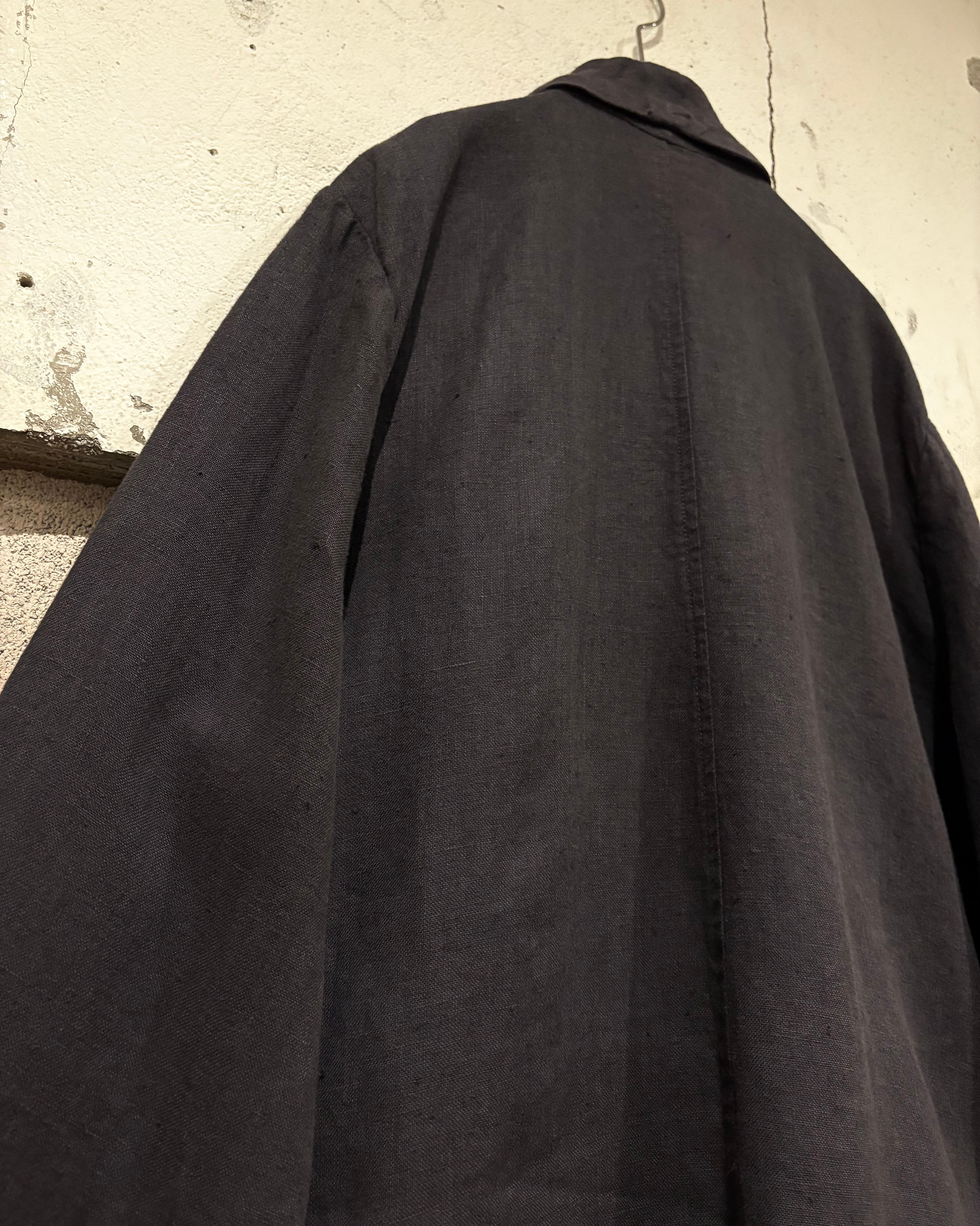 襟はショールカラー、トップボタンはくるみボタン、フロントはアイテムの雰囲気を引き立てる比翼仕立てでミニマルなデザイン。シンプルが故に素材の雰囲気が最大限に引き出されています。