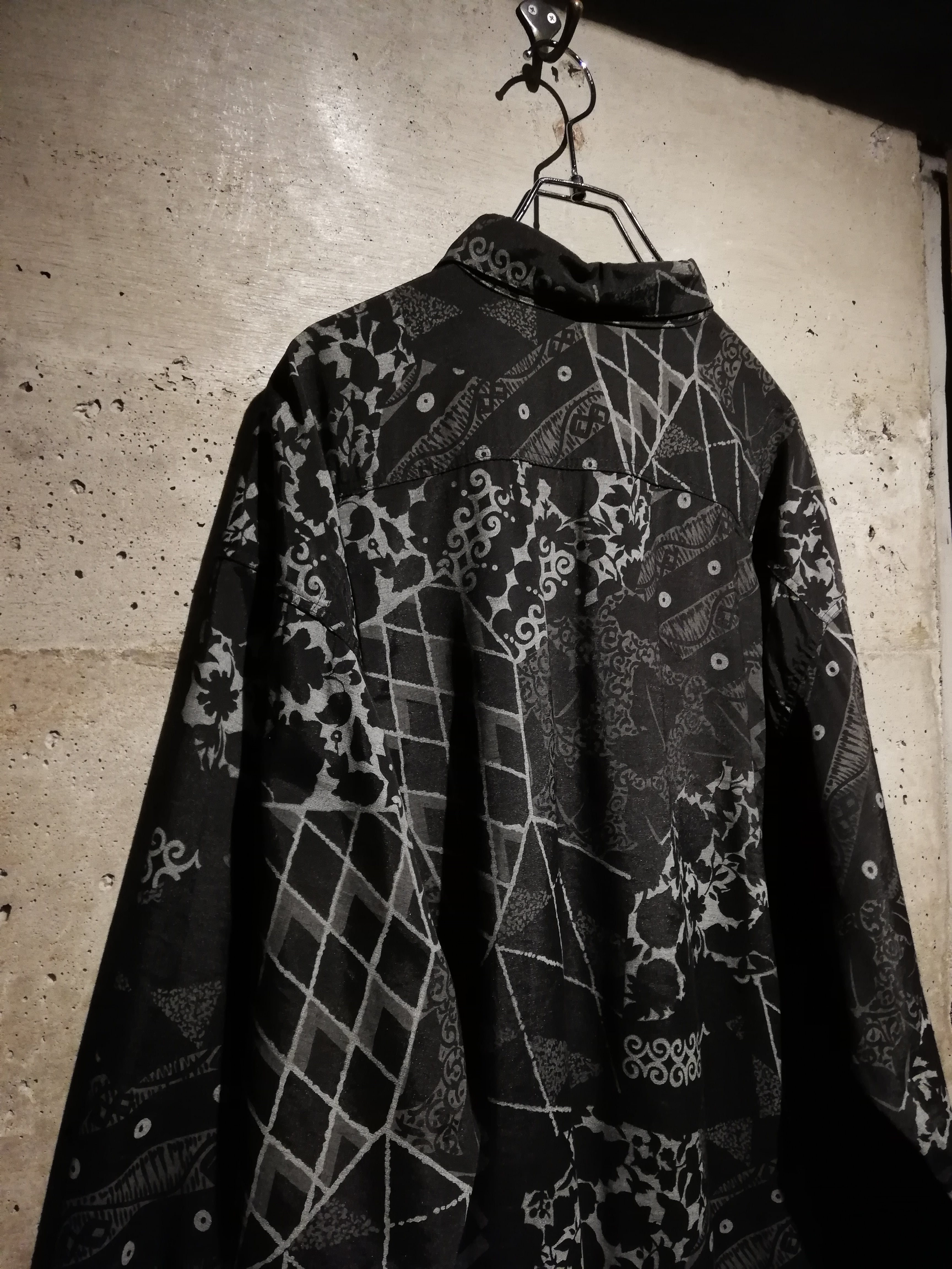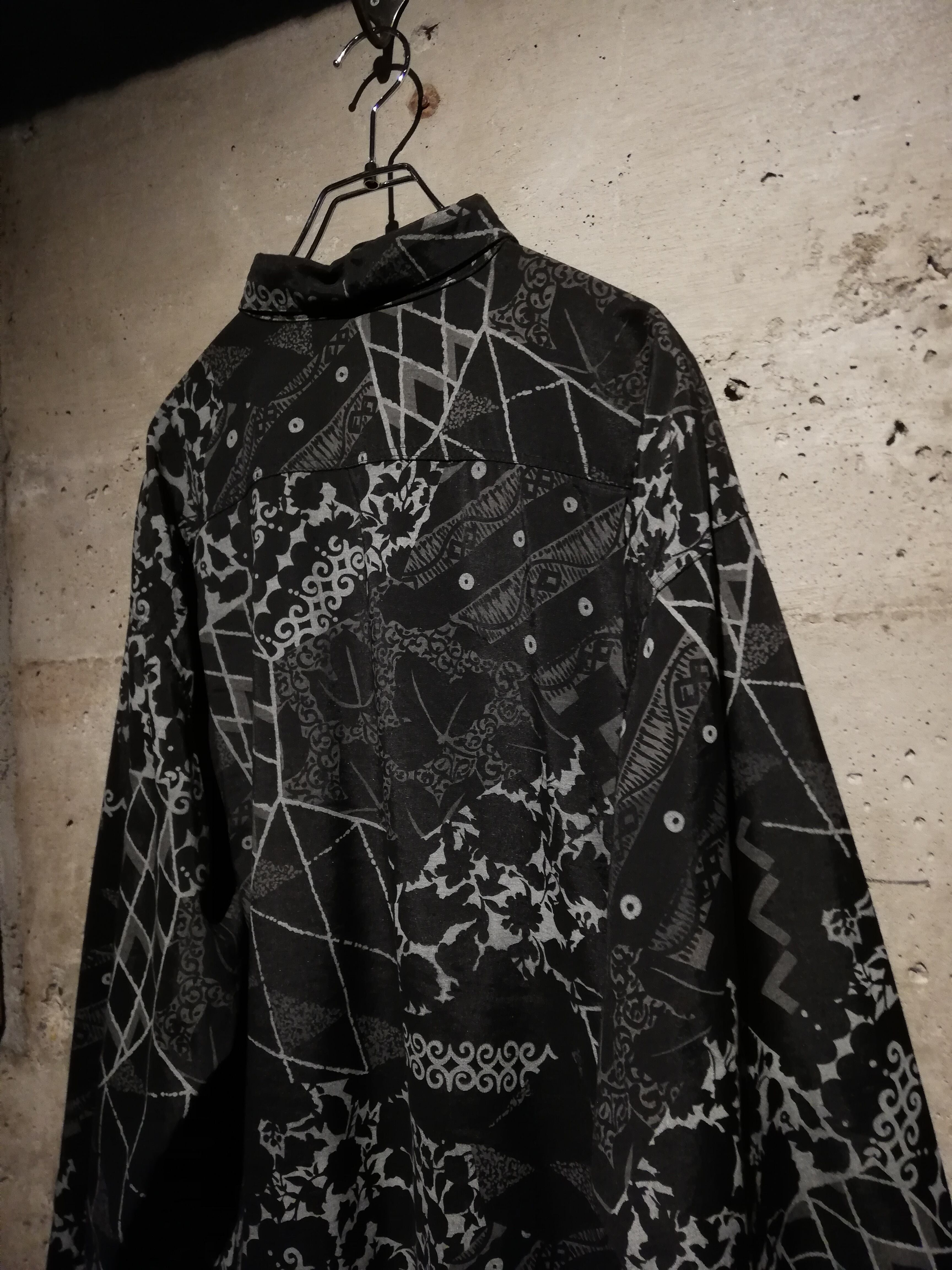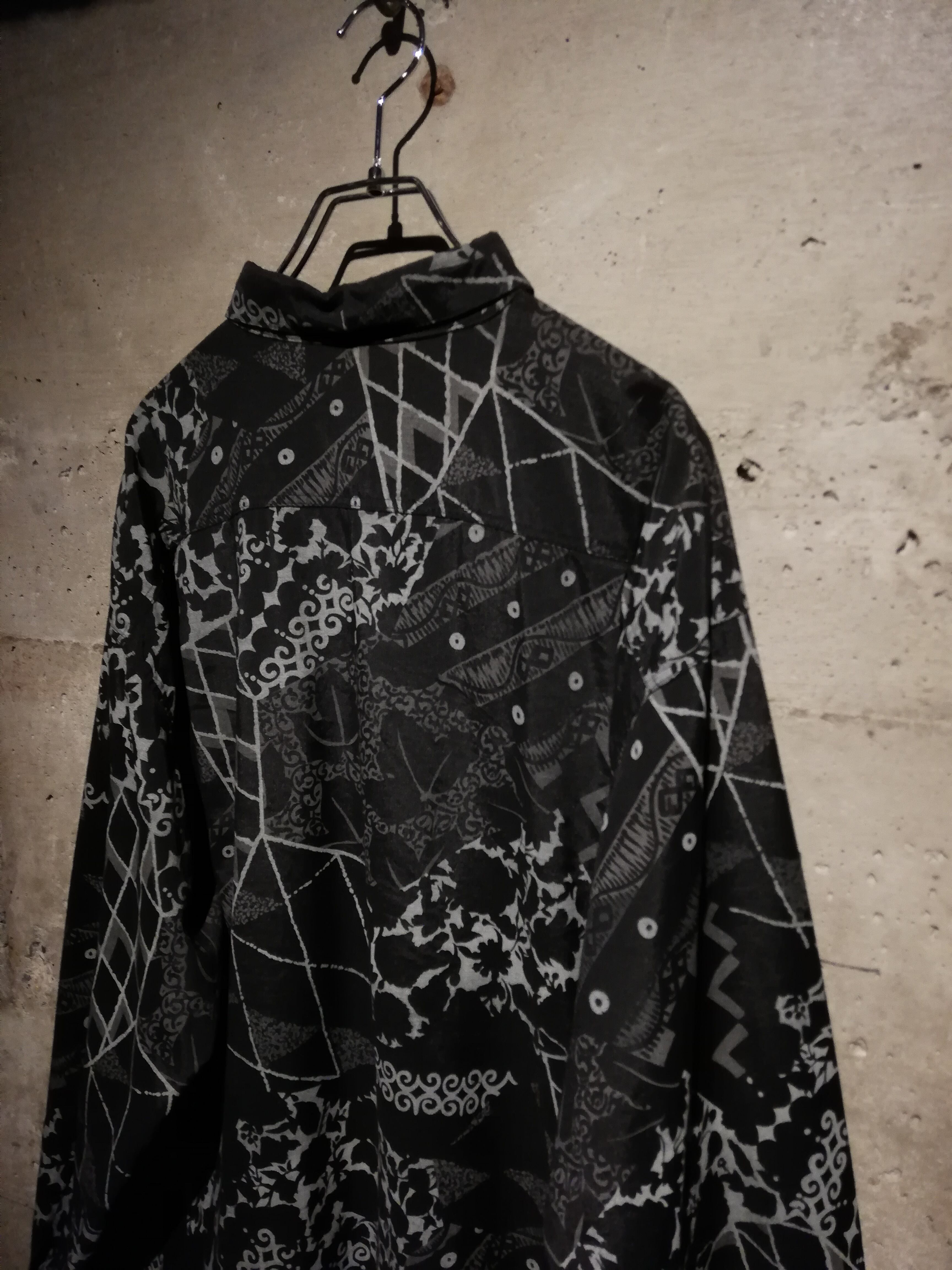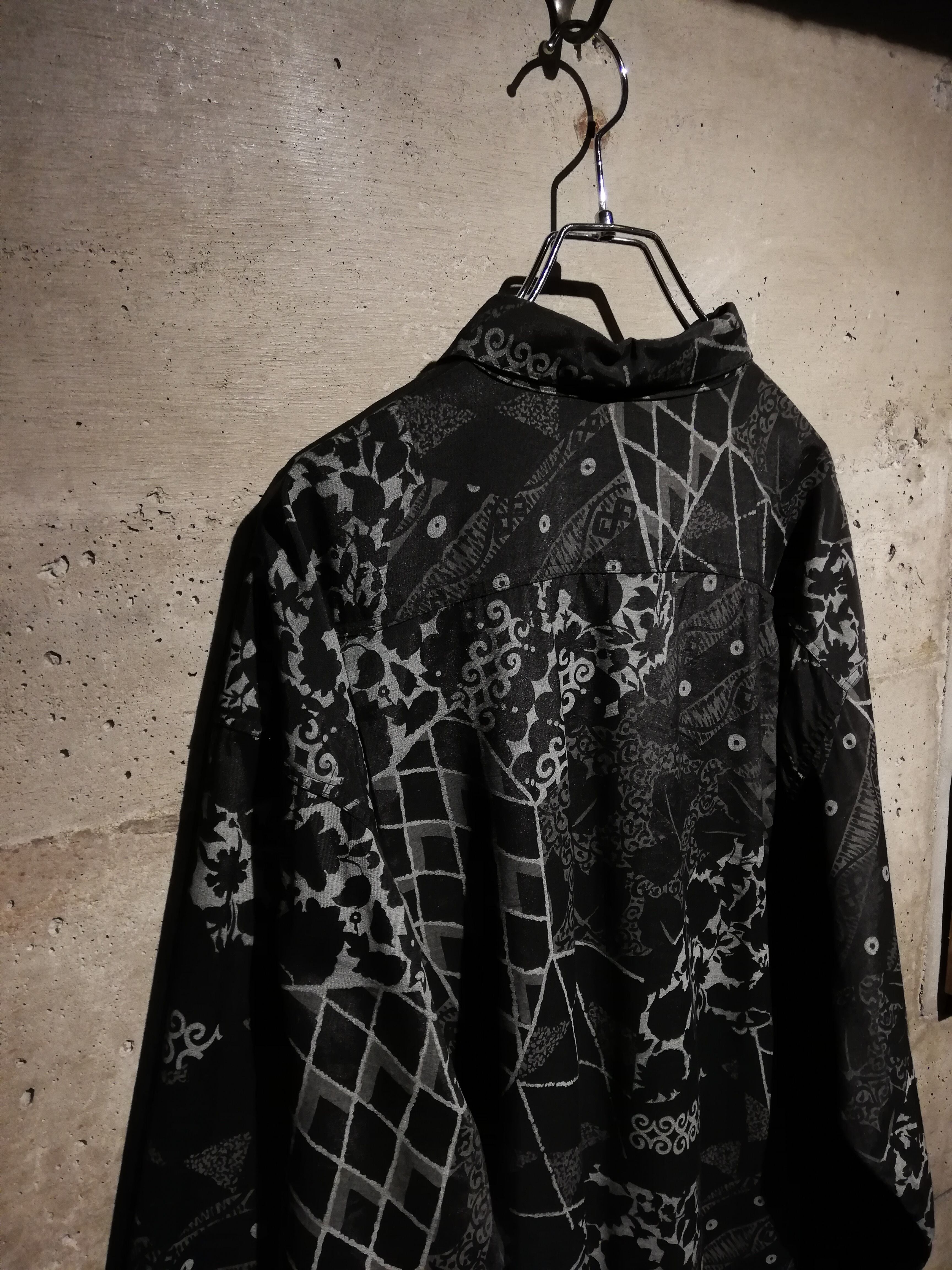 黒×グレーの配色でマルチな柄をランダムに落とし込んだ長袖シャツ。