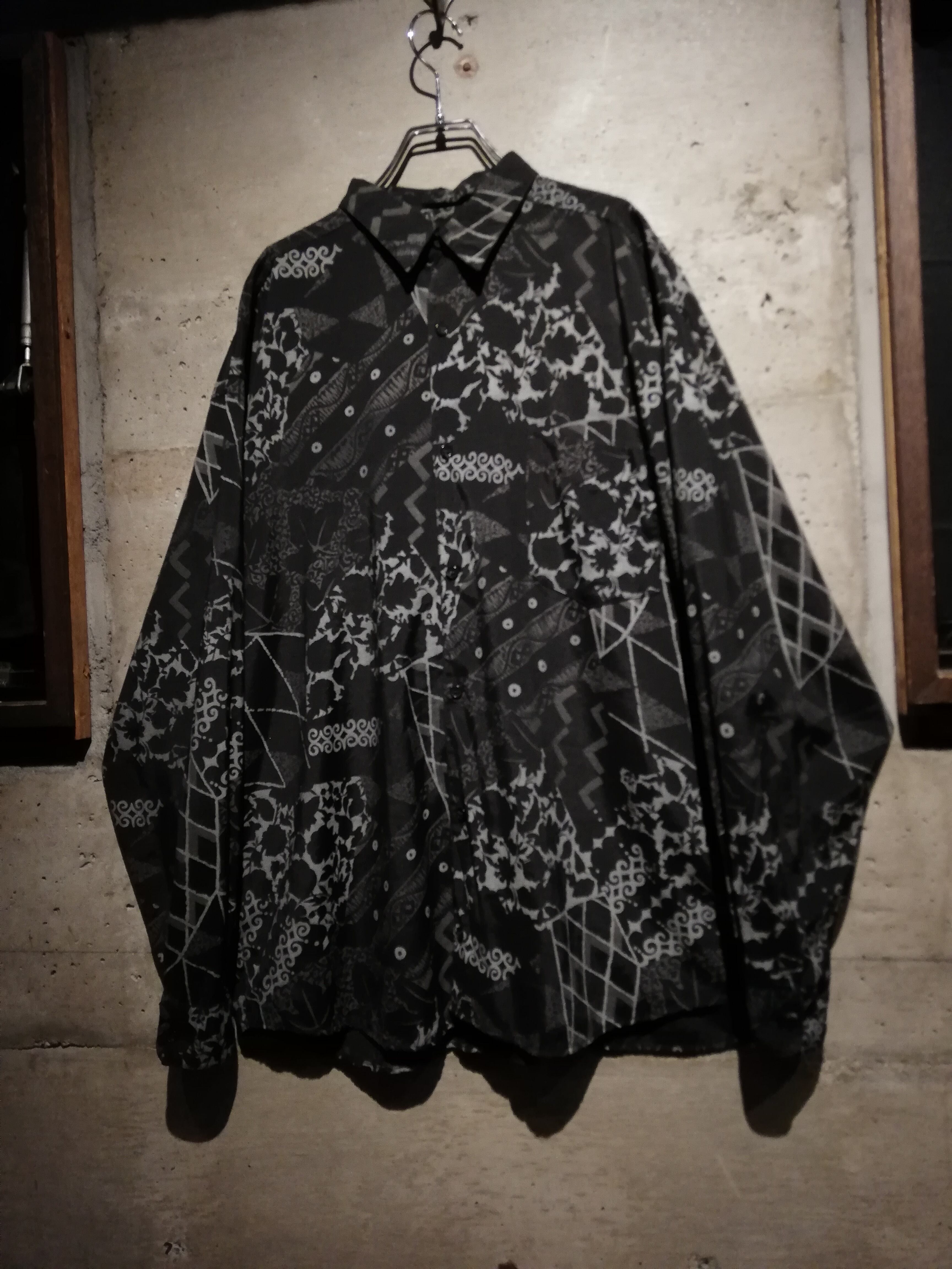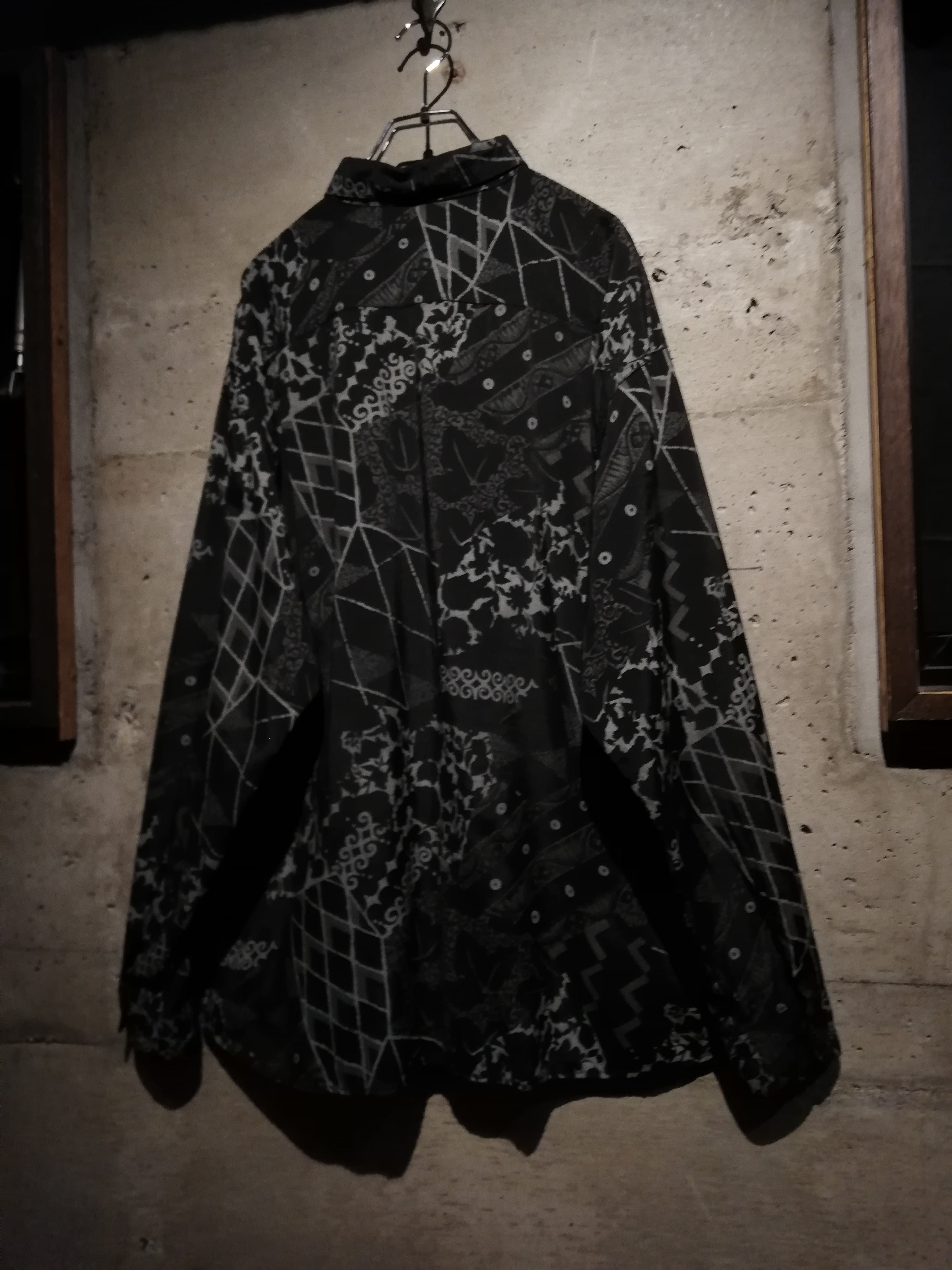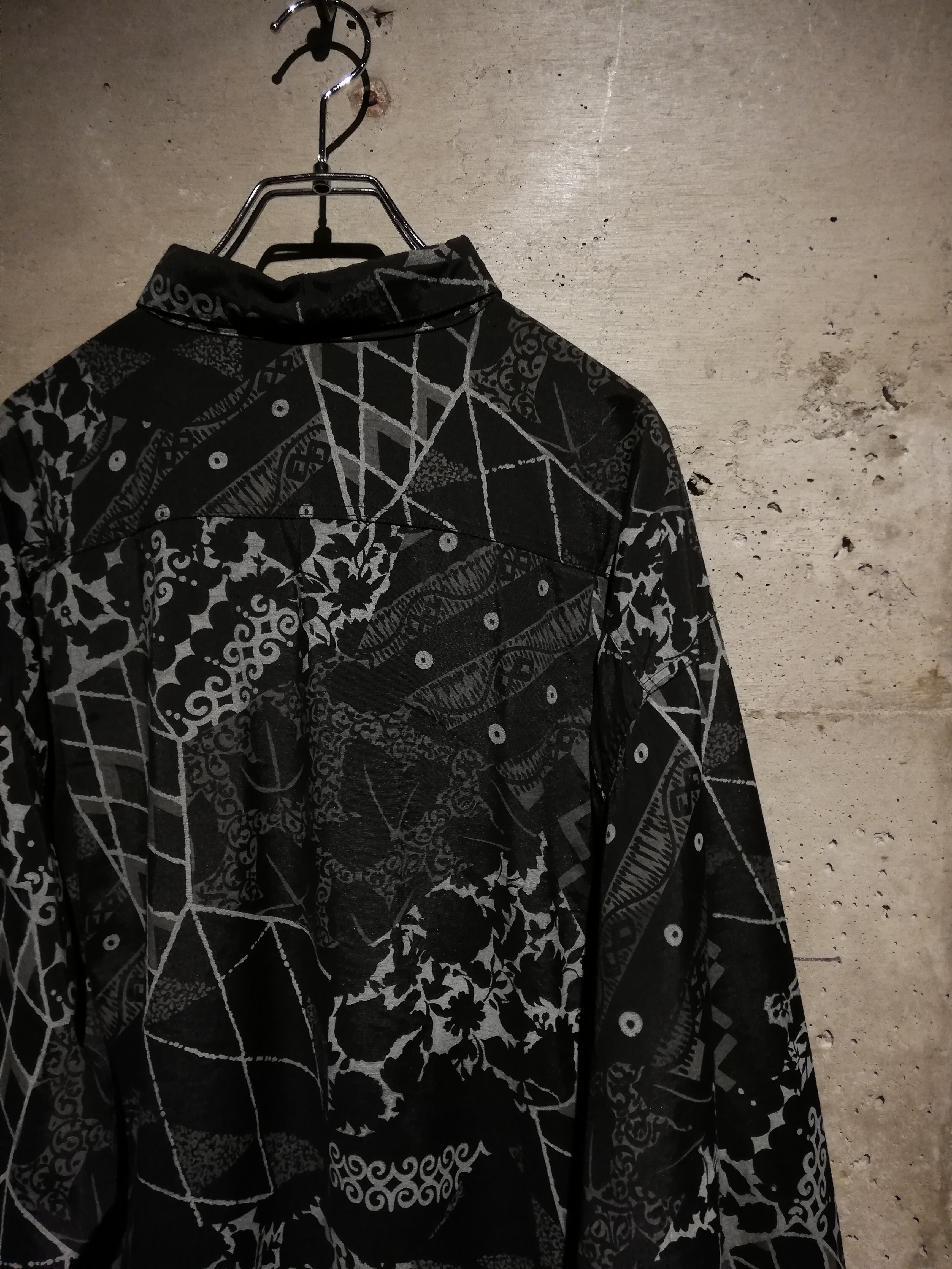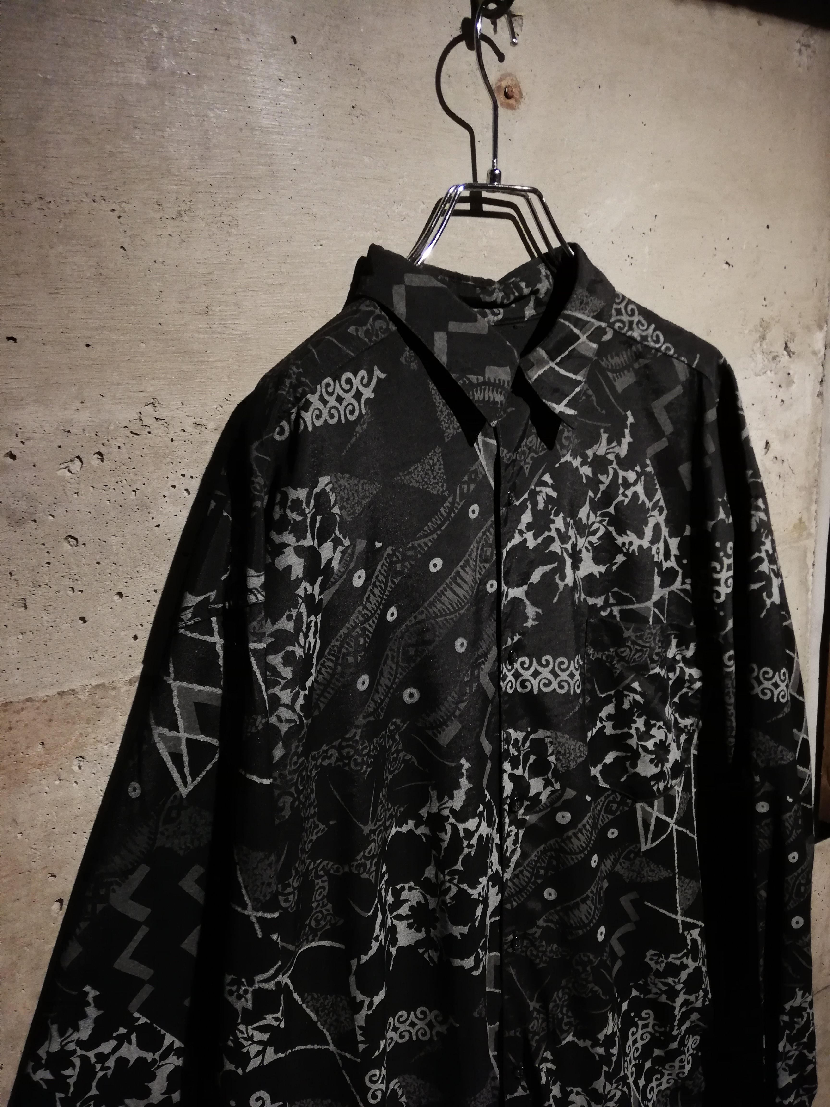 黒×グレーの配色でマルチな柄をランダムに落とし込んだ長袖シャツ。