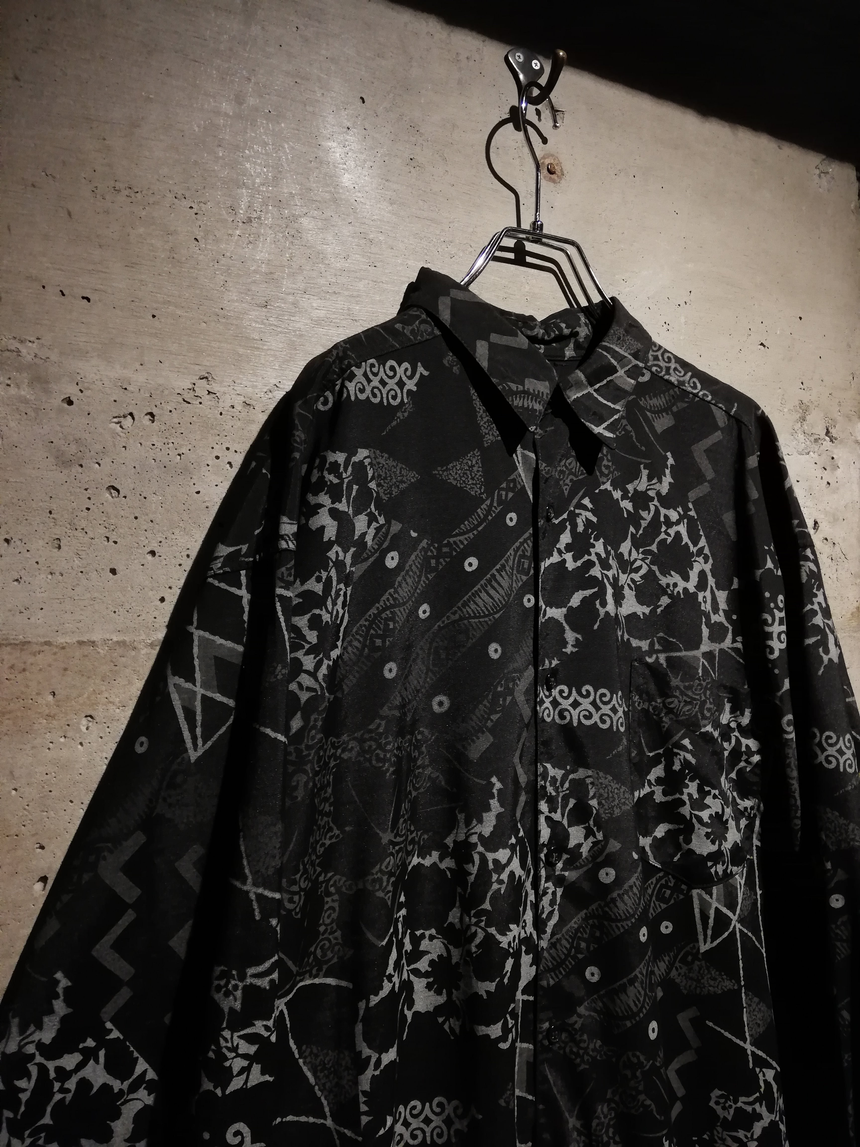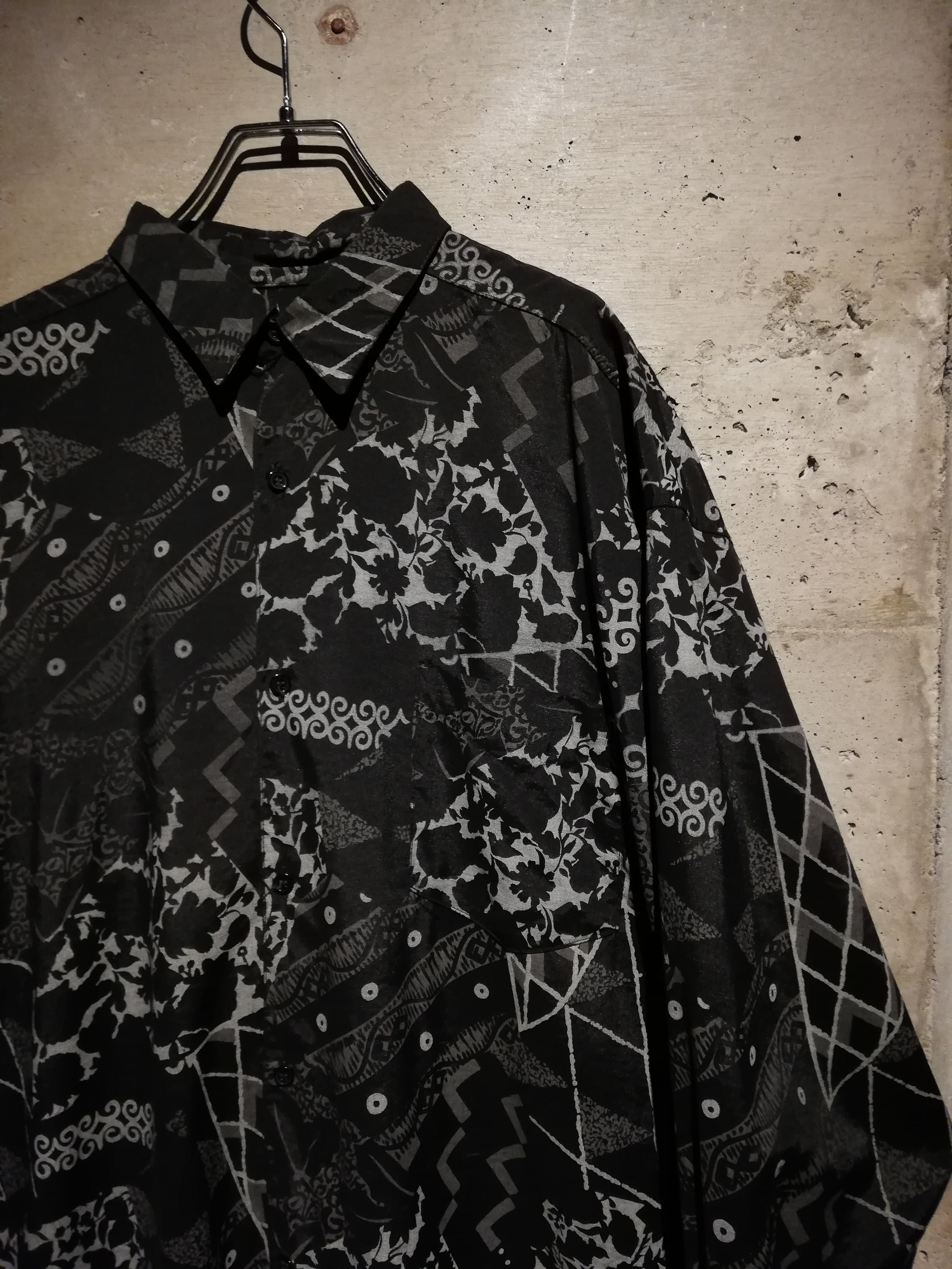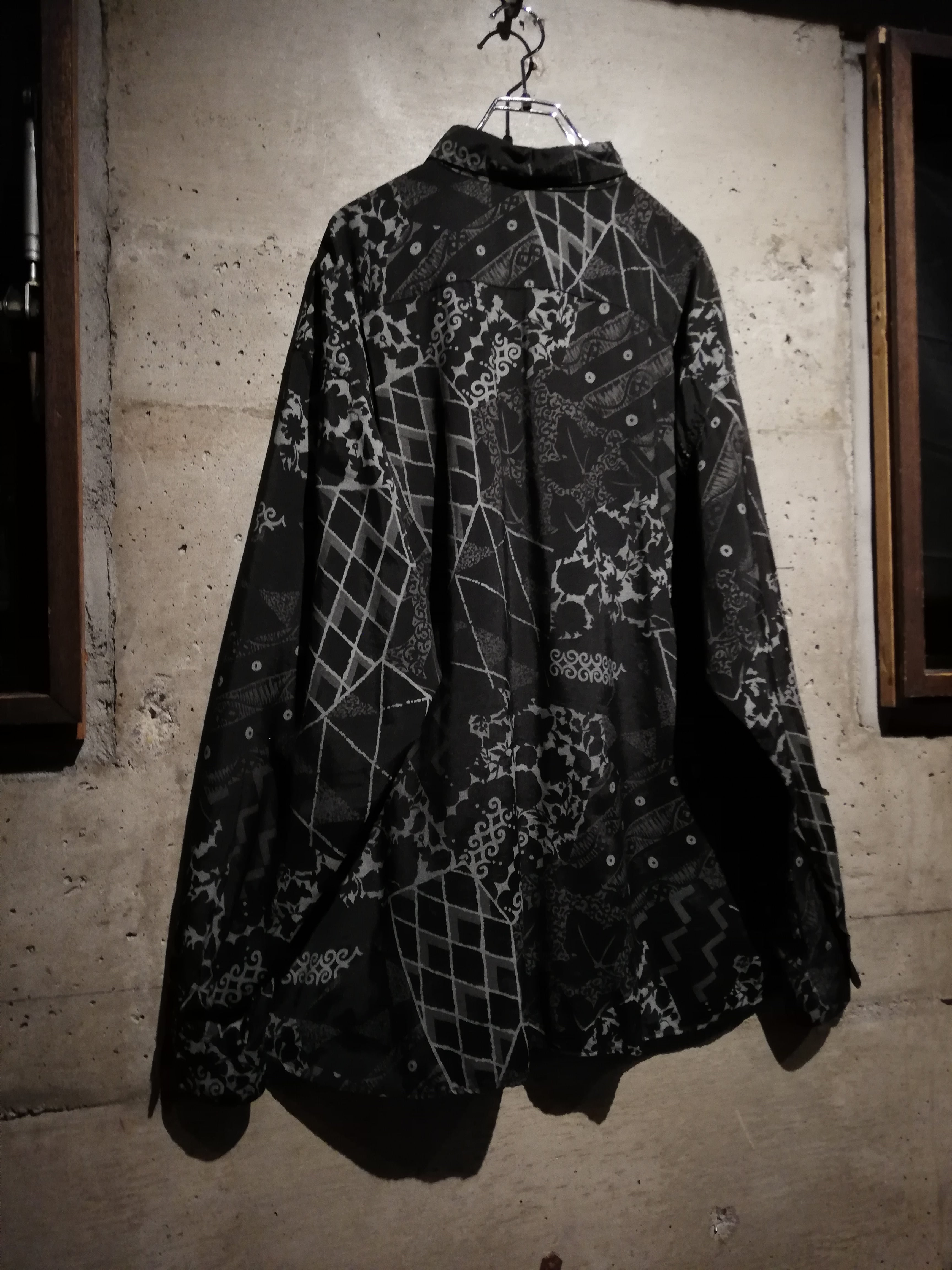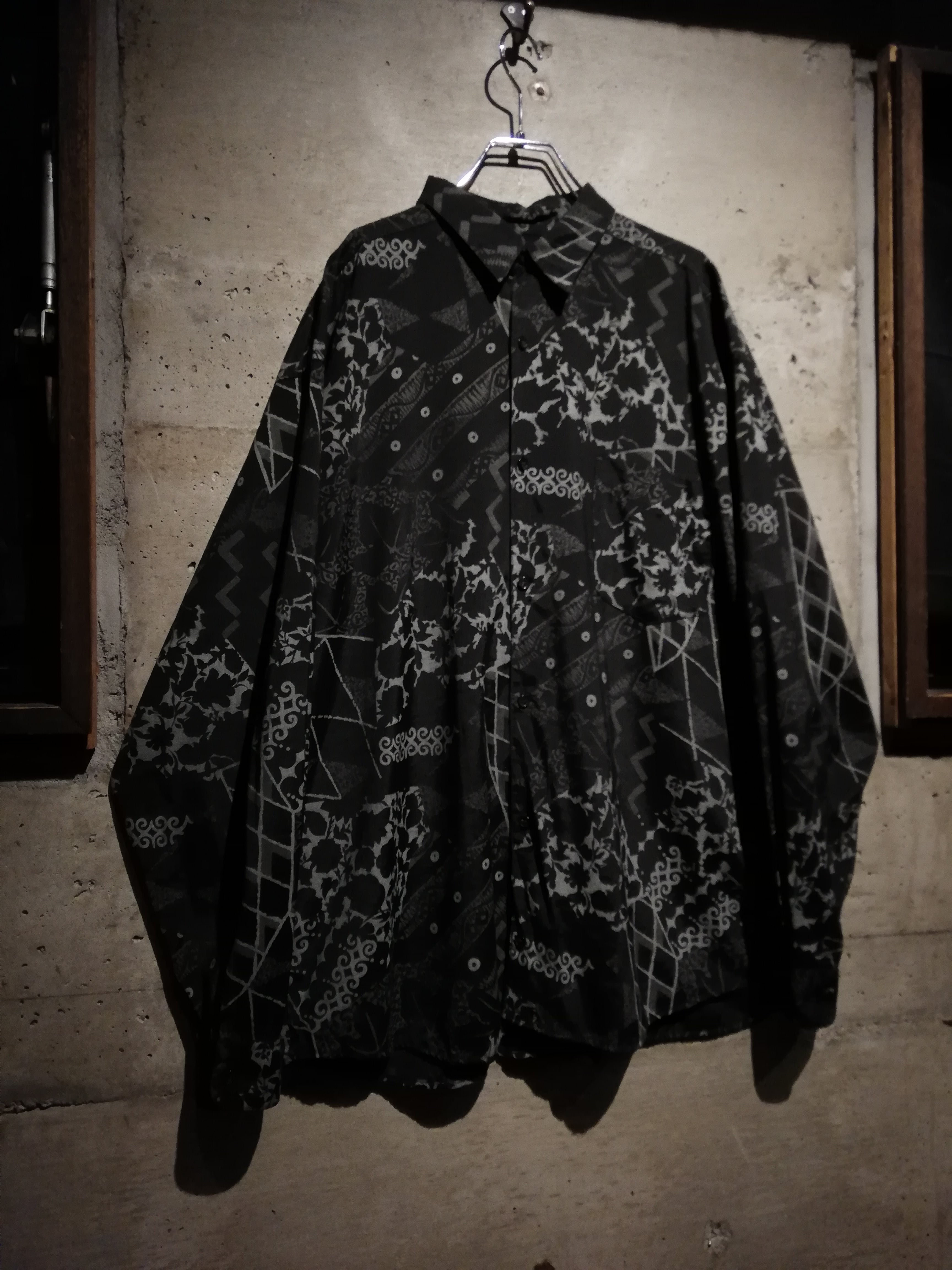 黒×グレーの配色でマルチな柄をランダムに落とし込んだ長袖シャツ。