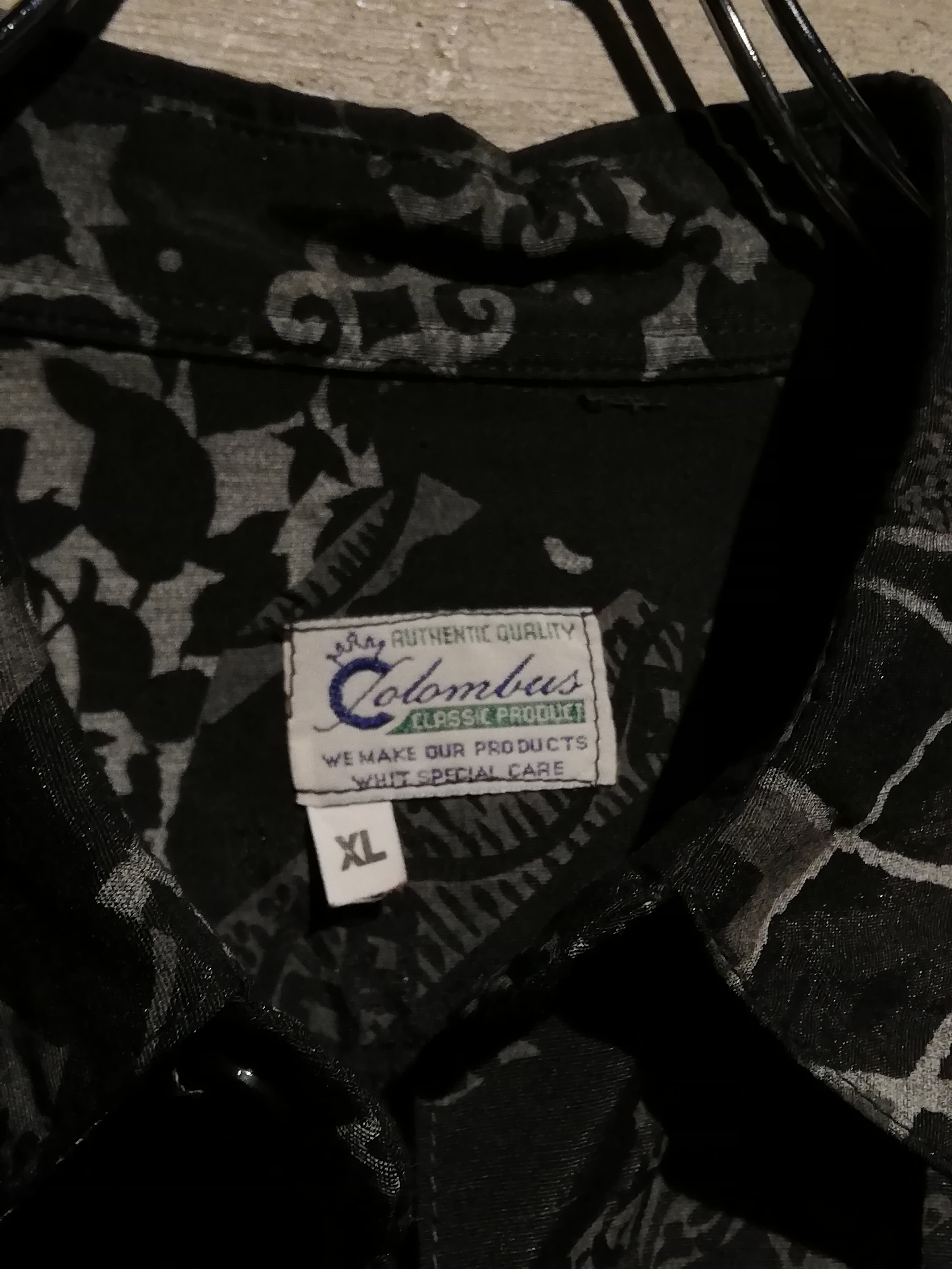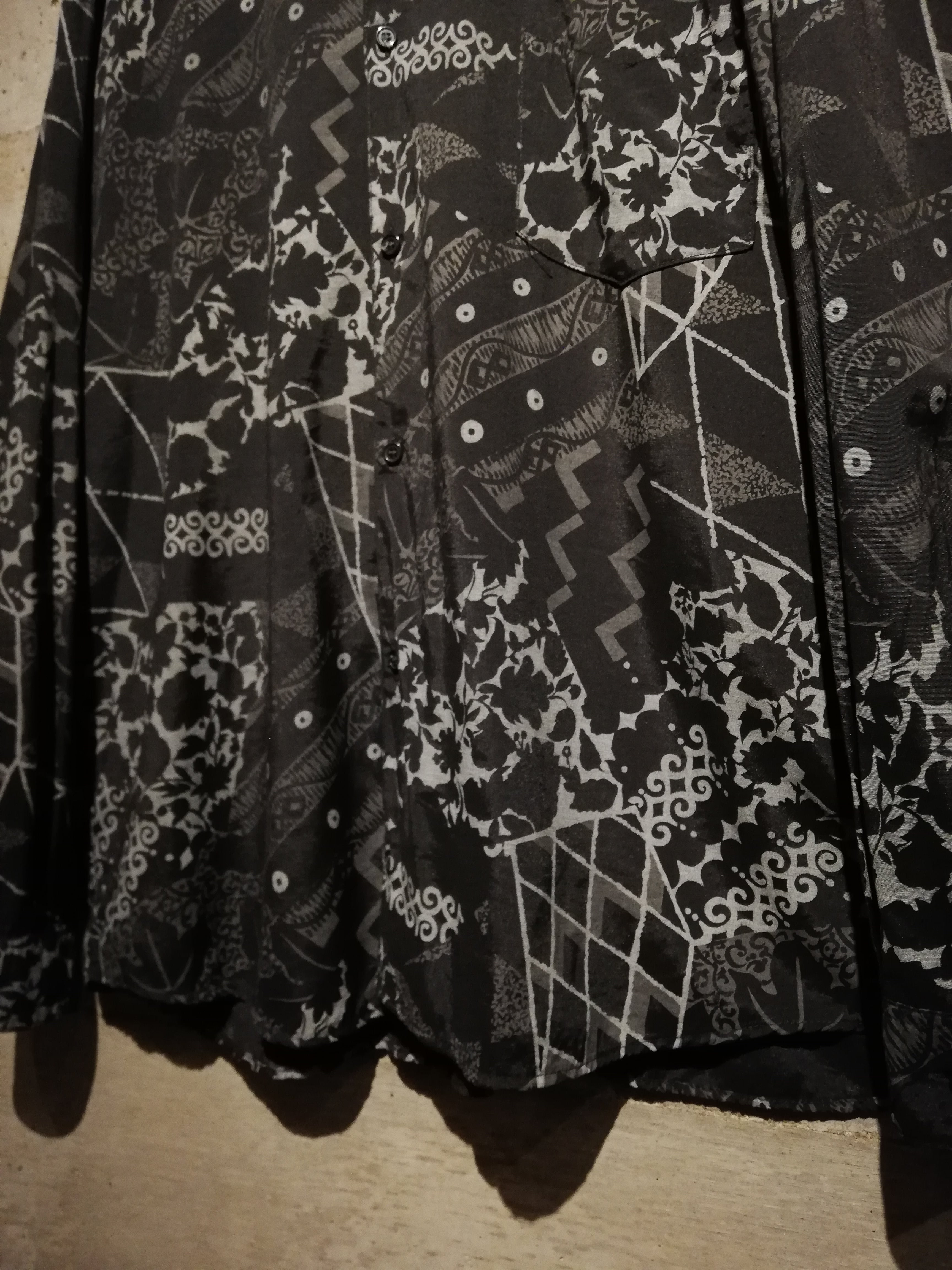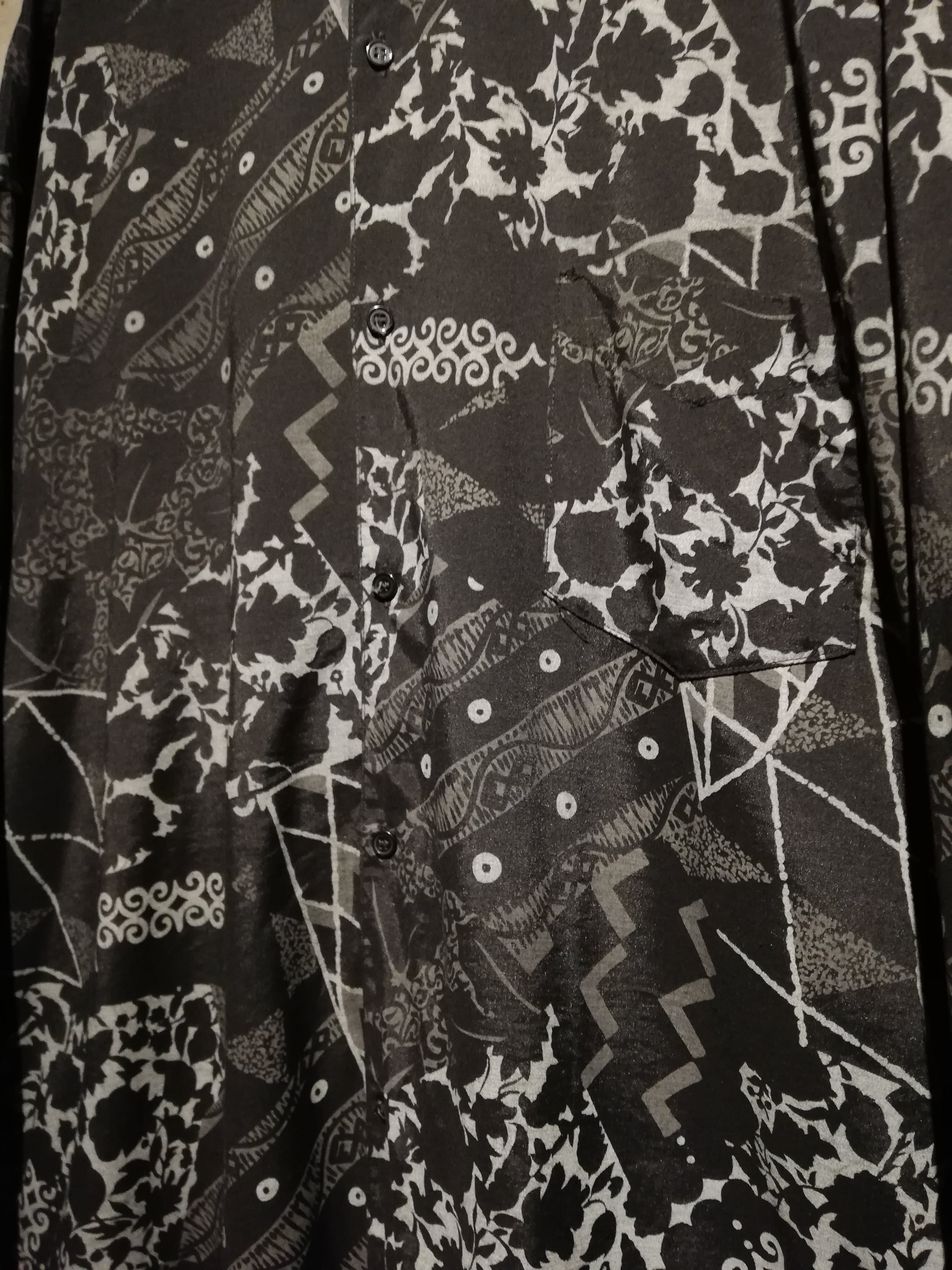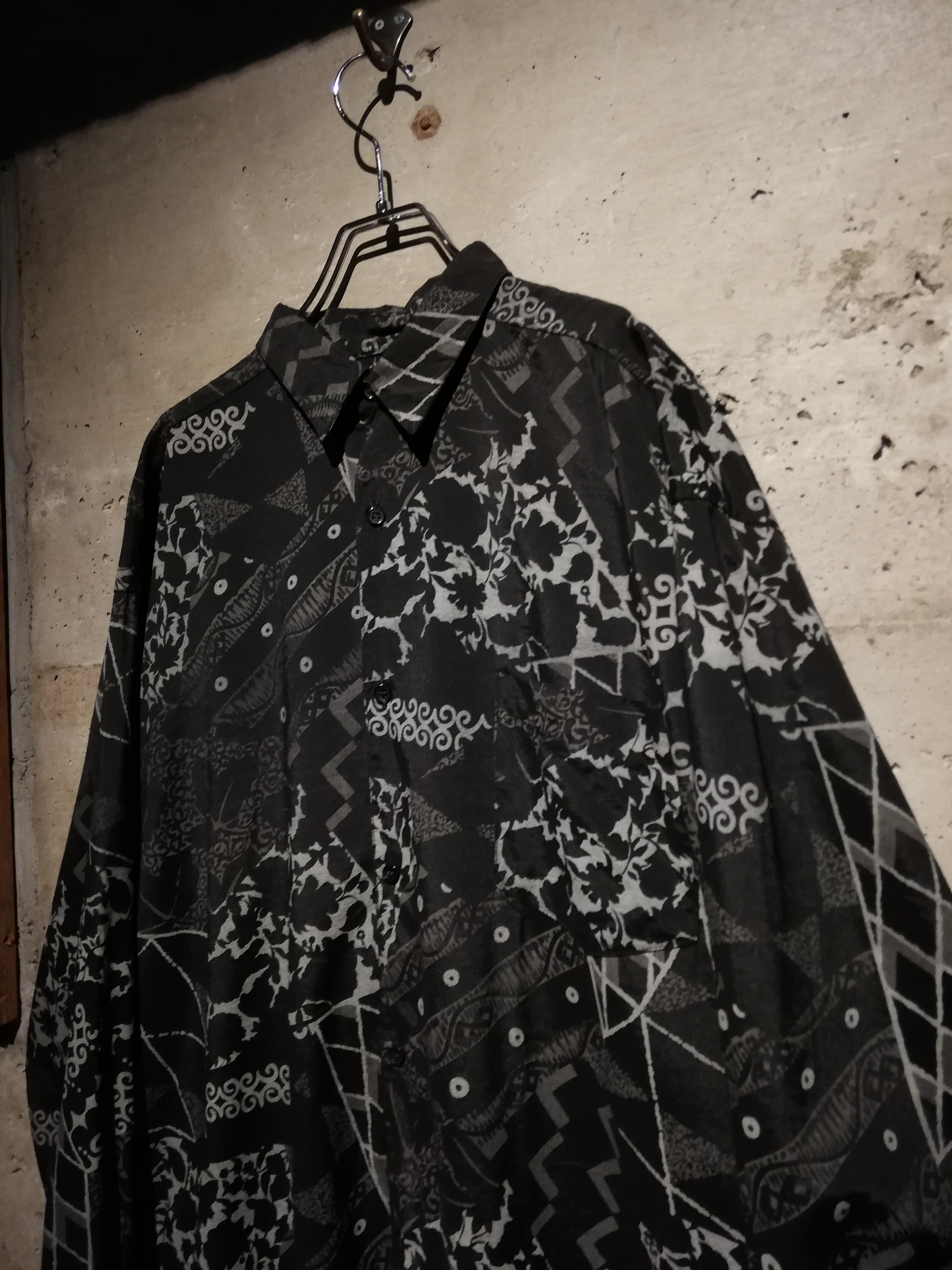 黒×グレーの配色でマルチな柄をランダムに落とし込んだ長袖シャツ。