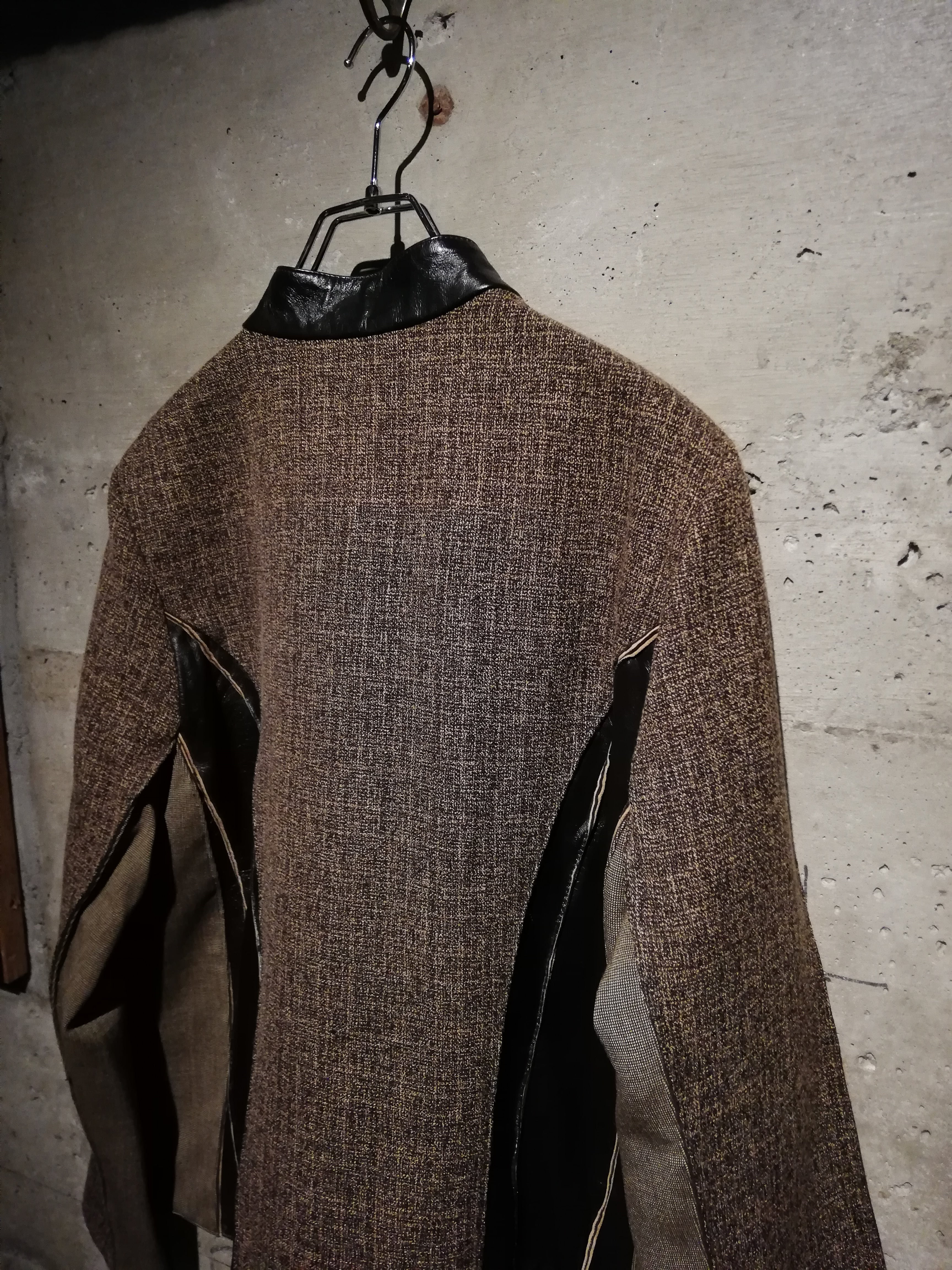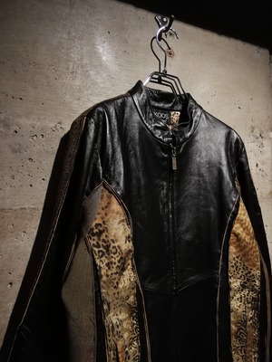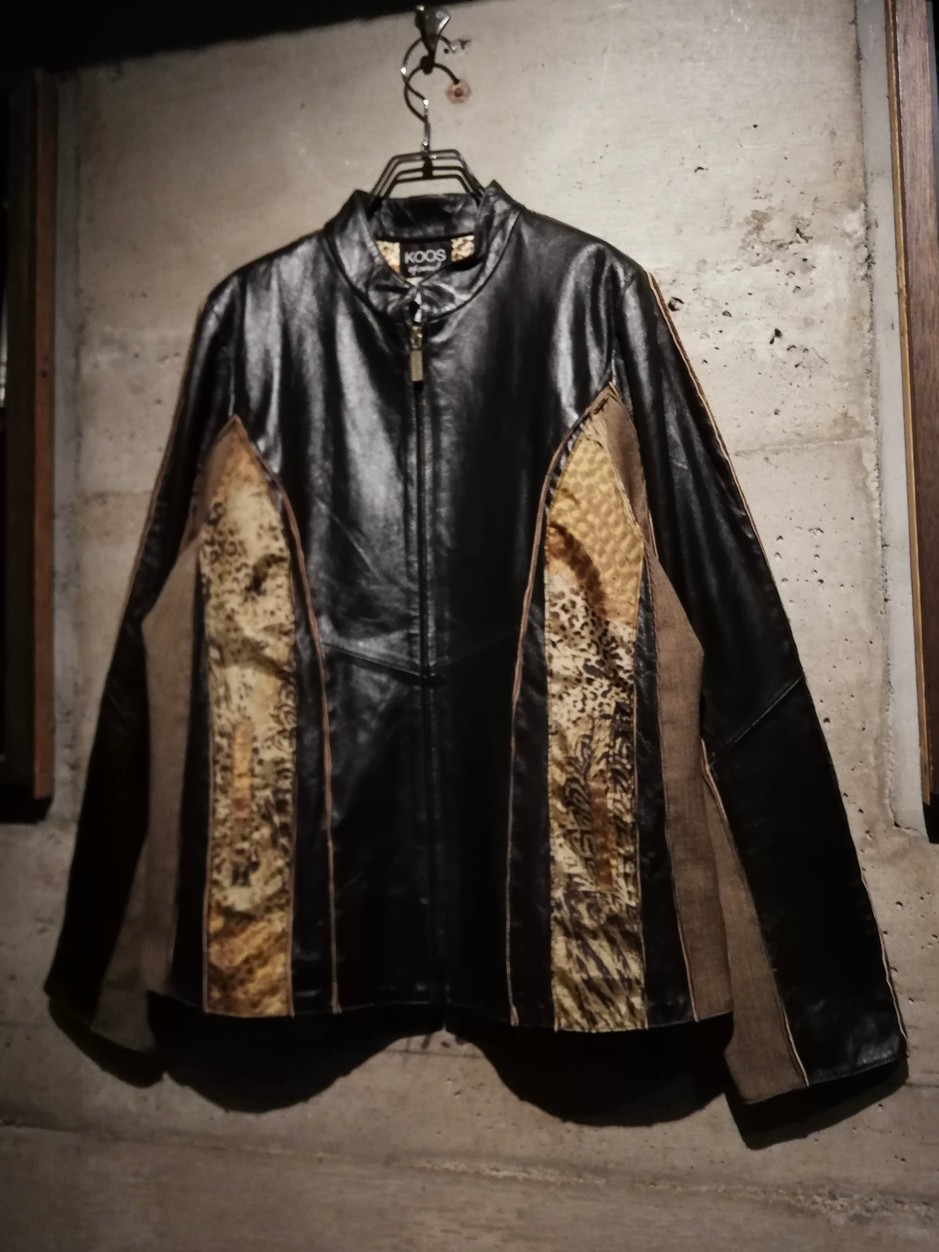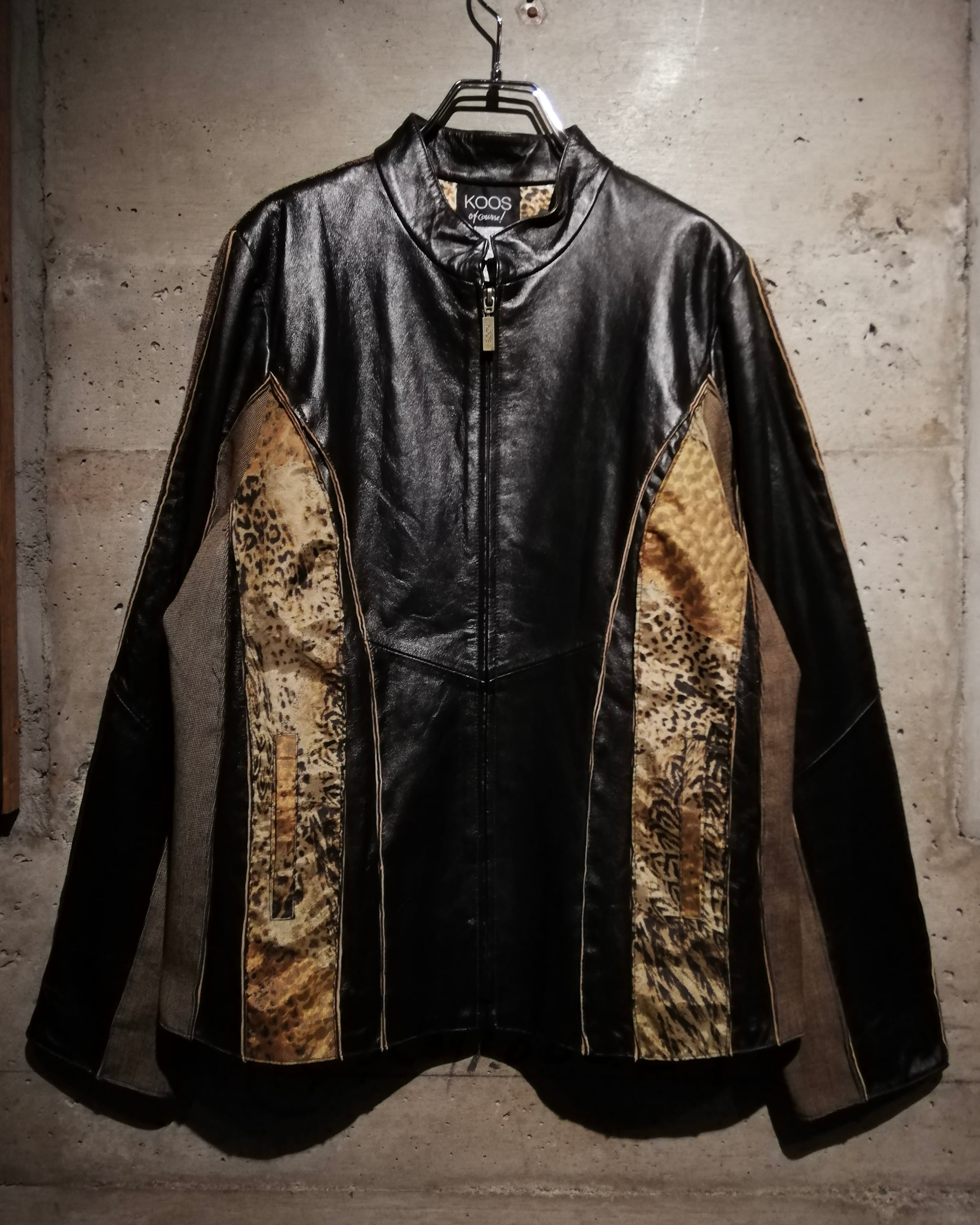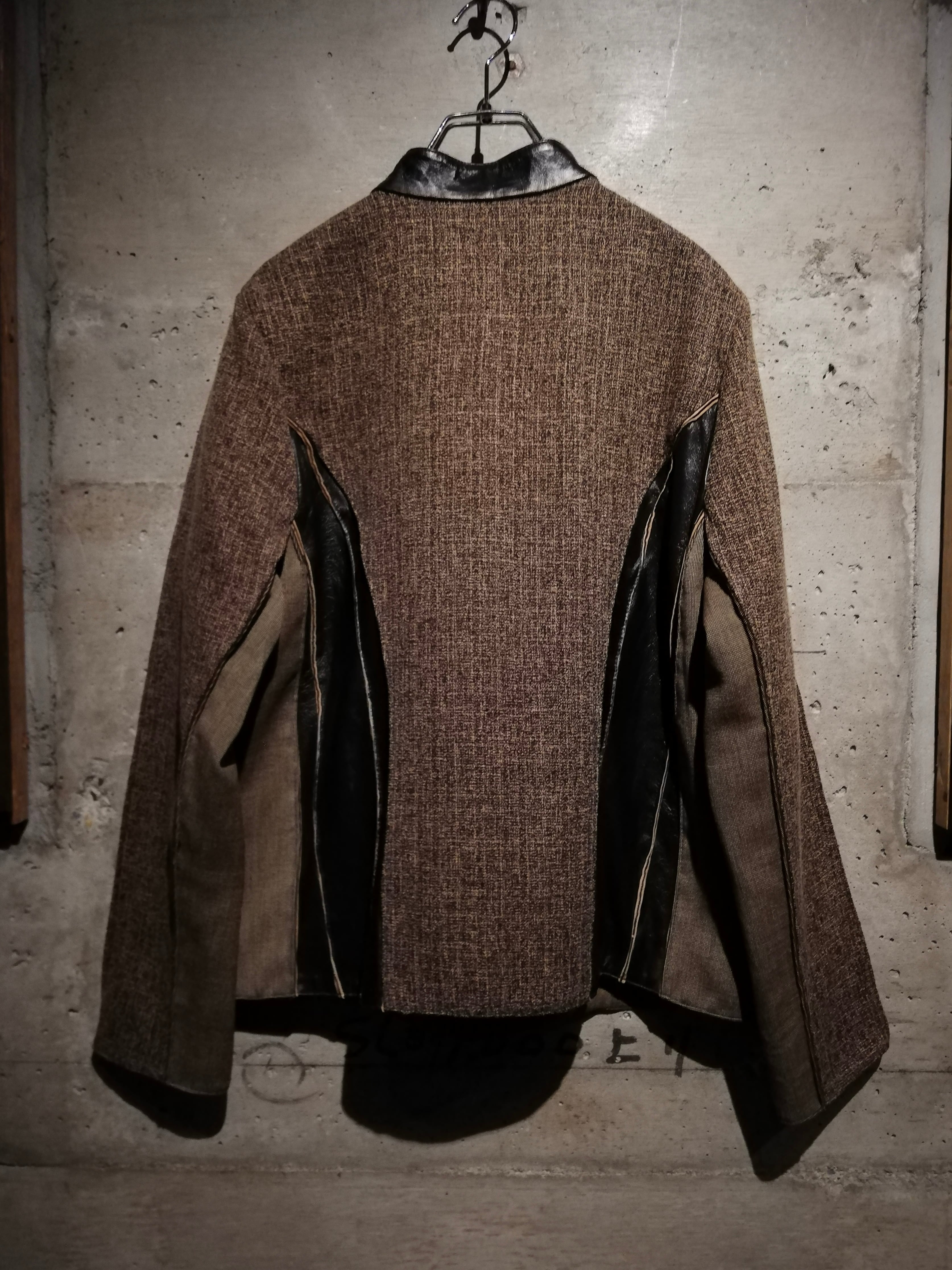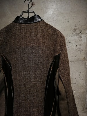 ブラウンのスムースレザー、ツイード、細かなチェック、マルチなアニマル柄の生地で切替えたジップアップジャケット。