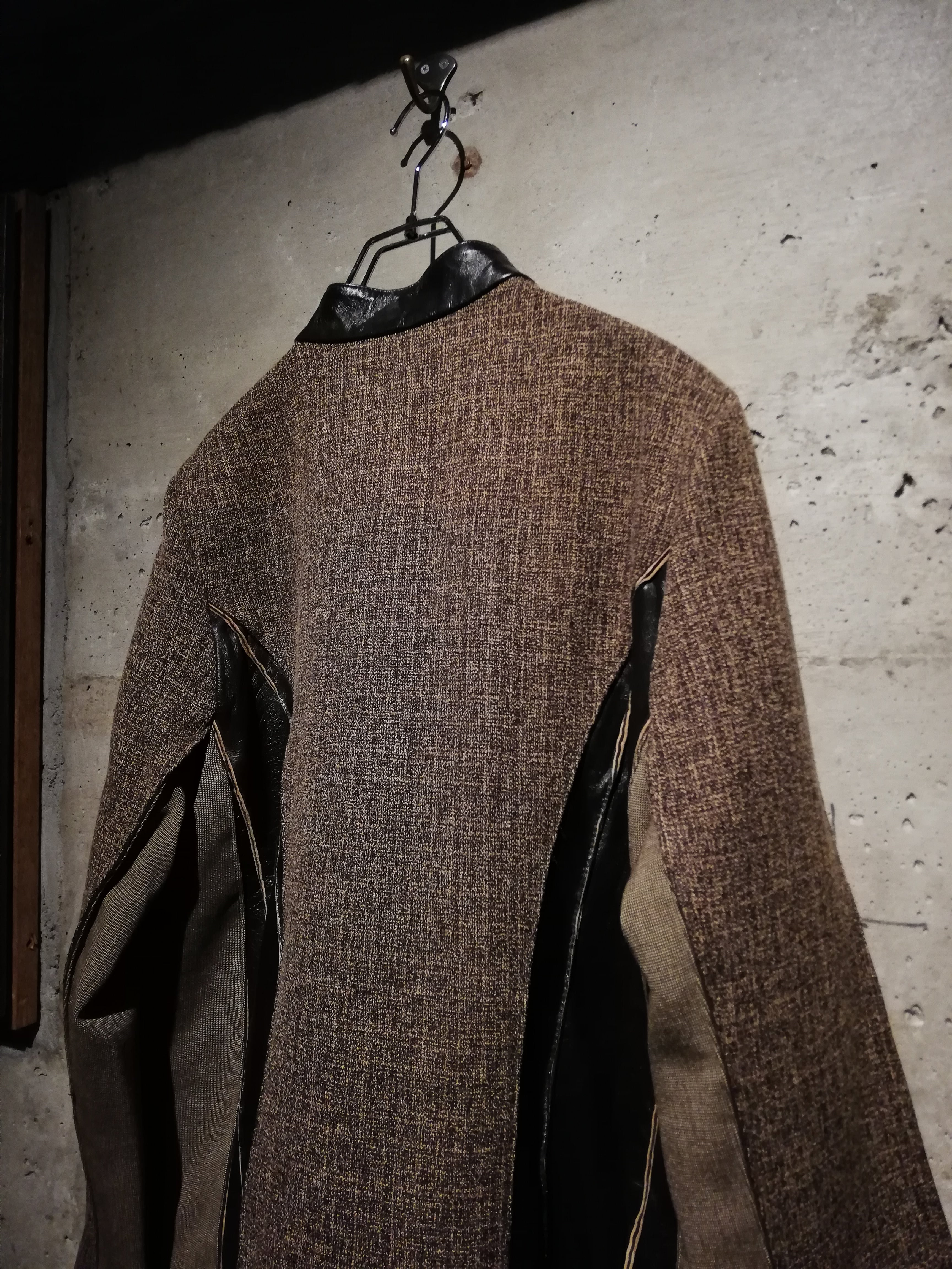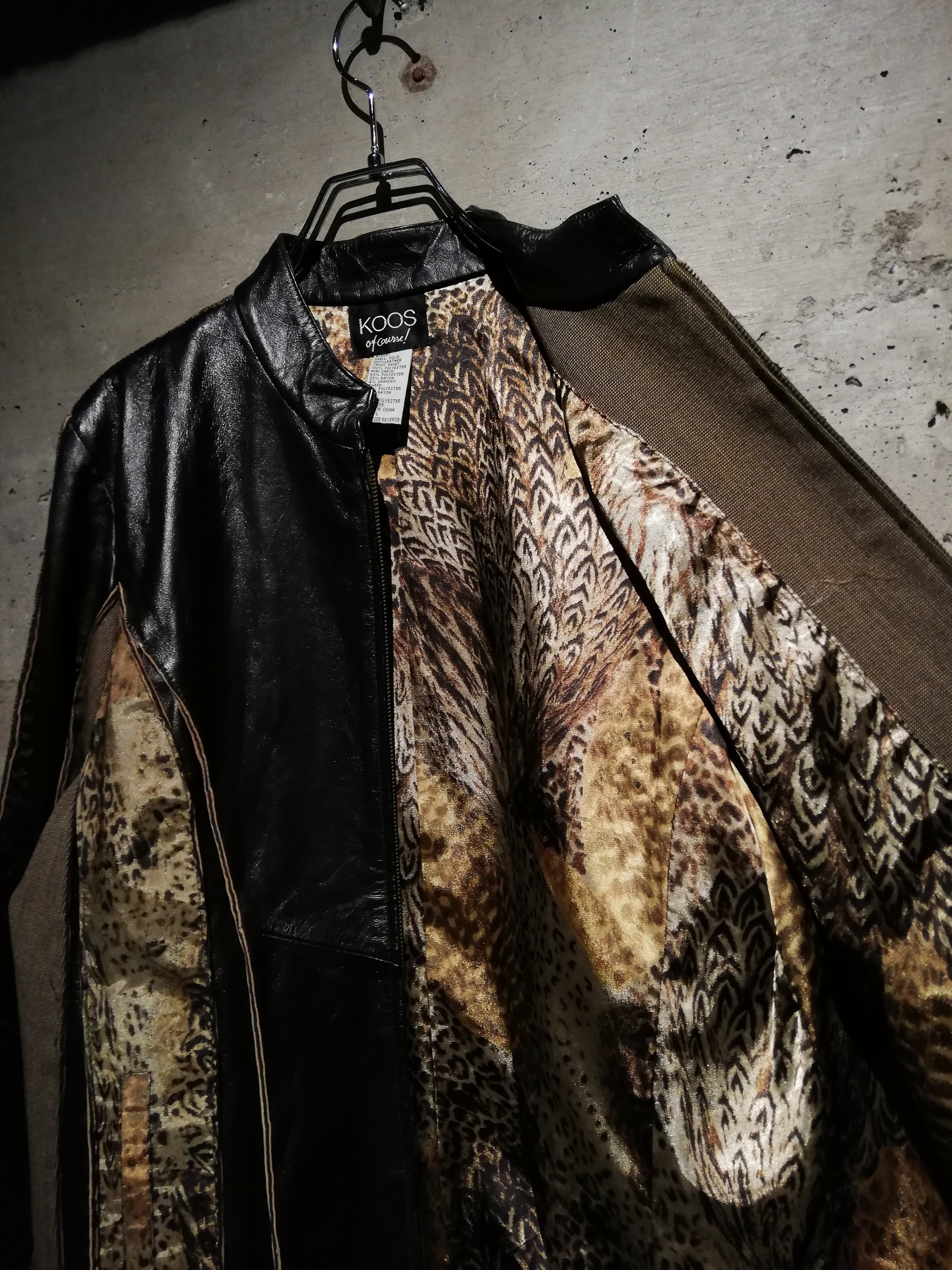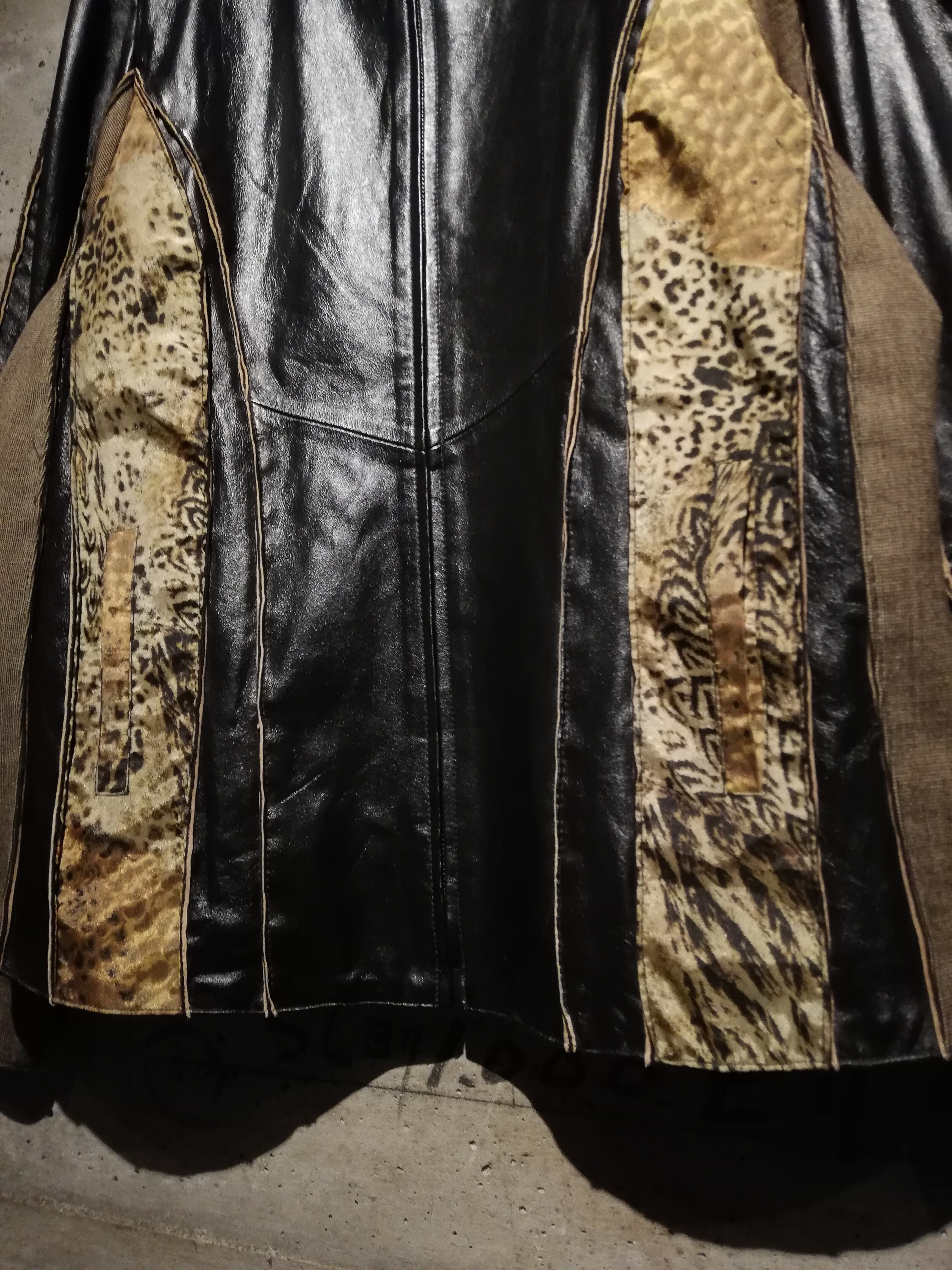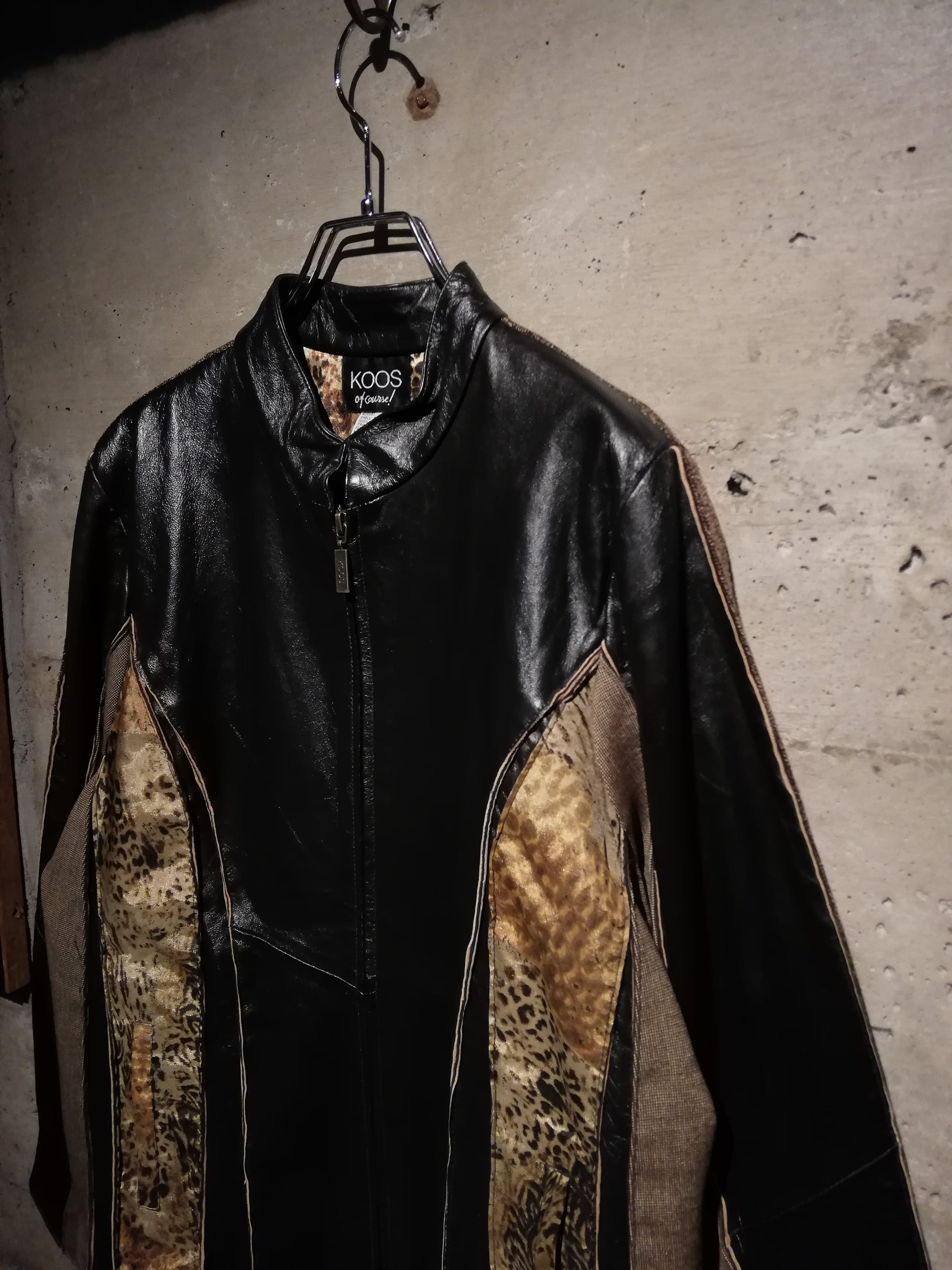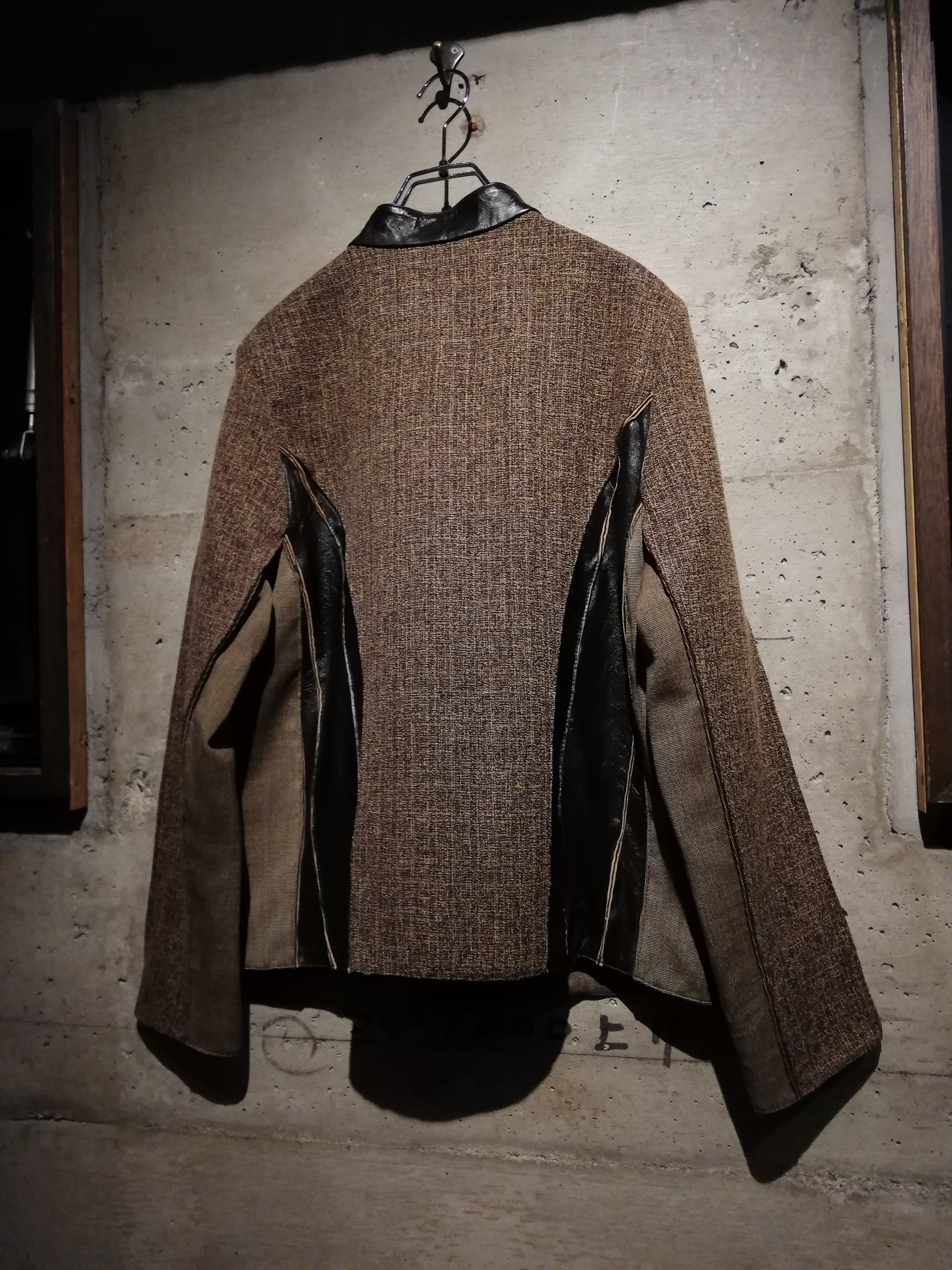 ブラウンのスムースレザー、ツイード、細かなチェック、マルチなアニマル柄の生地で切替えたジップアップジャケット。