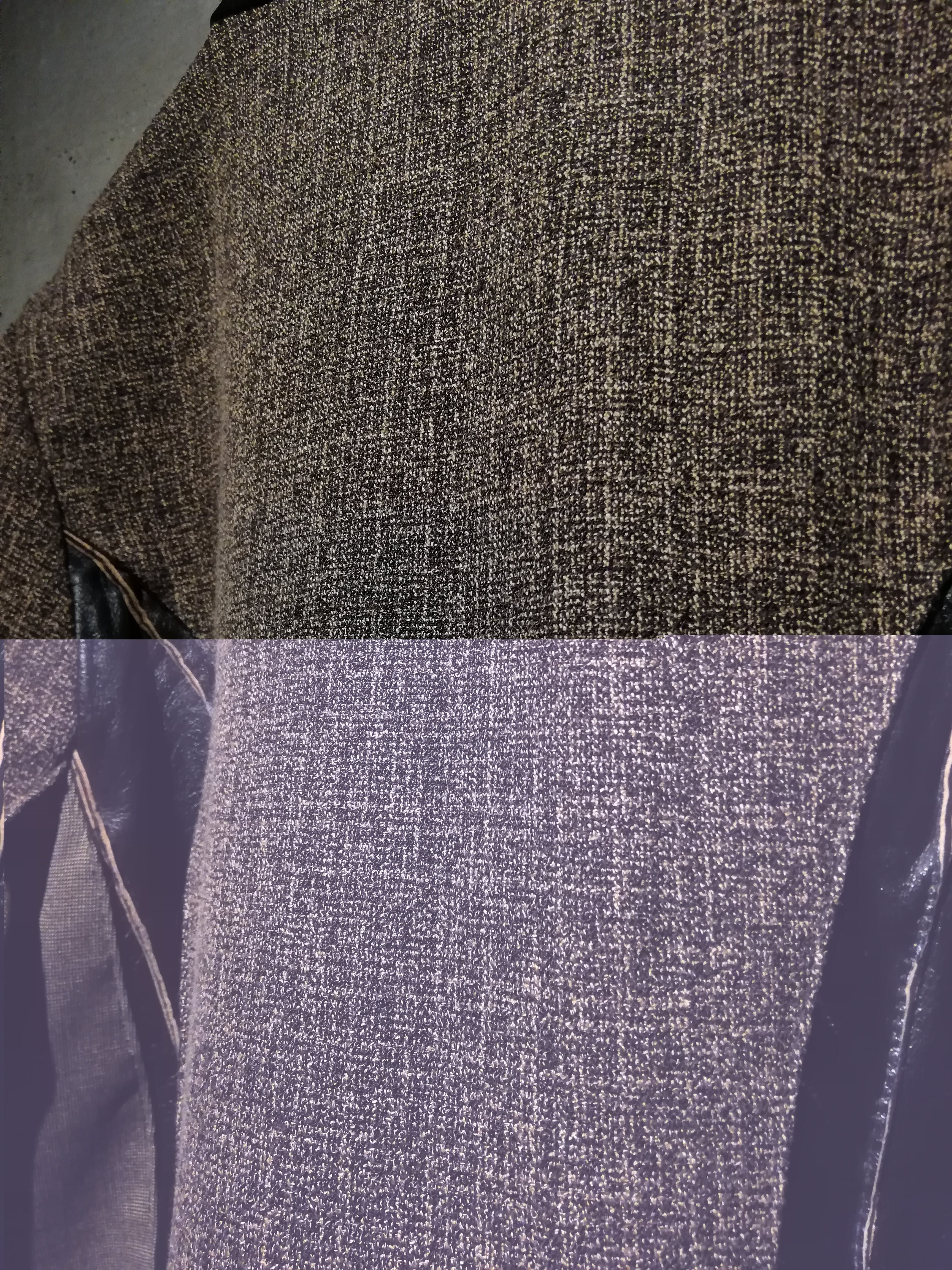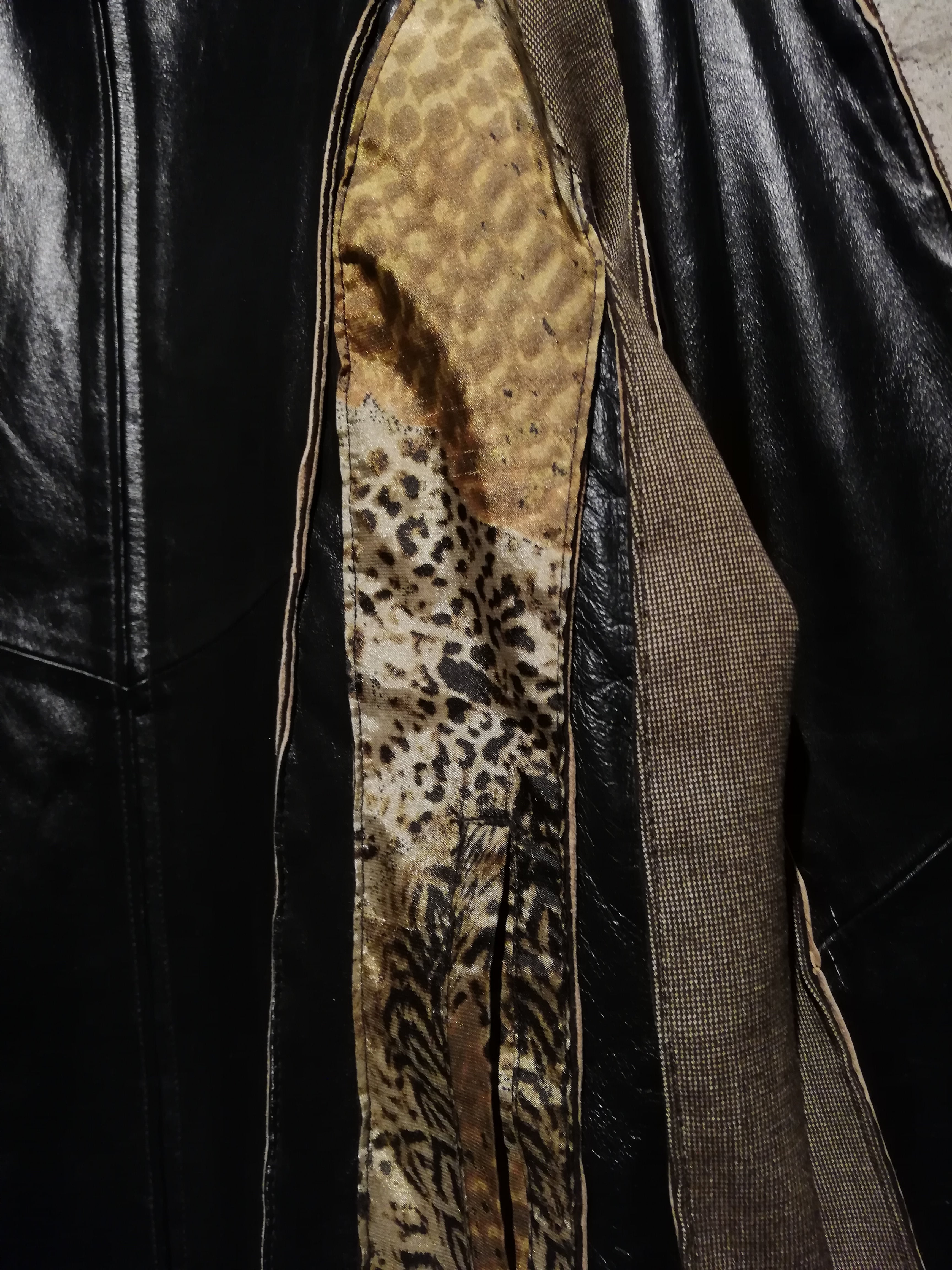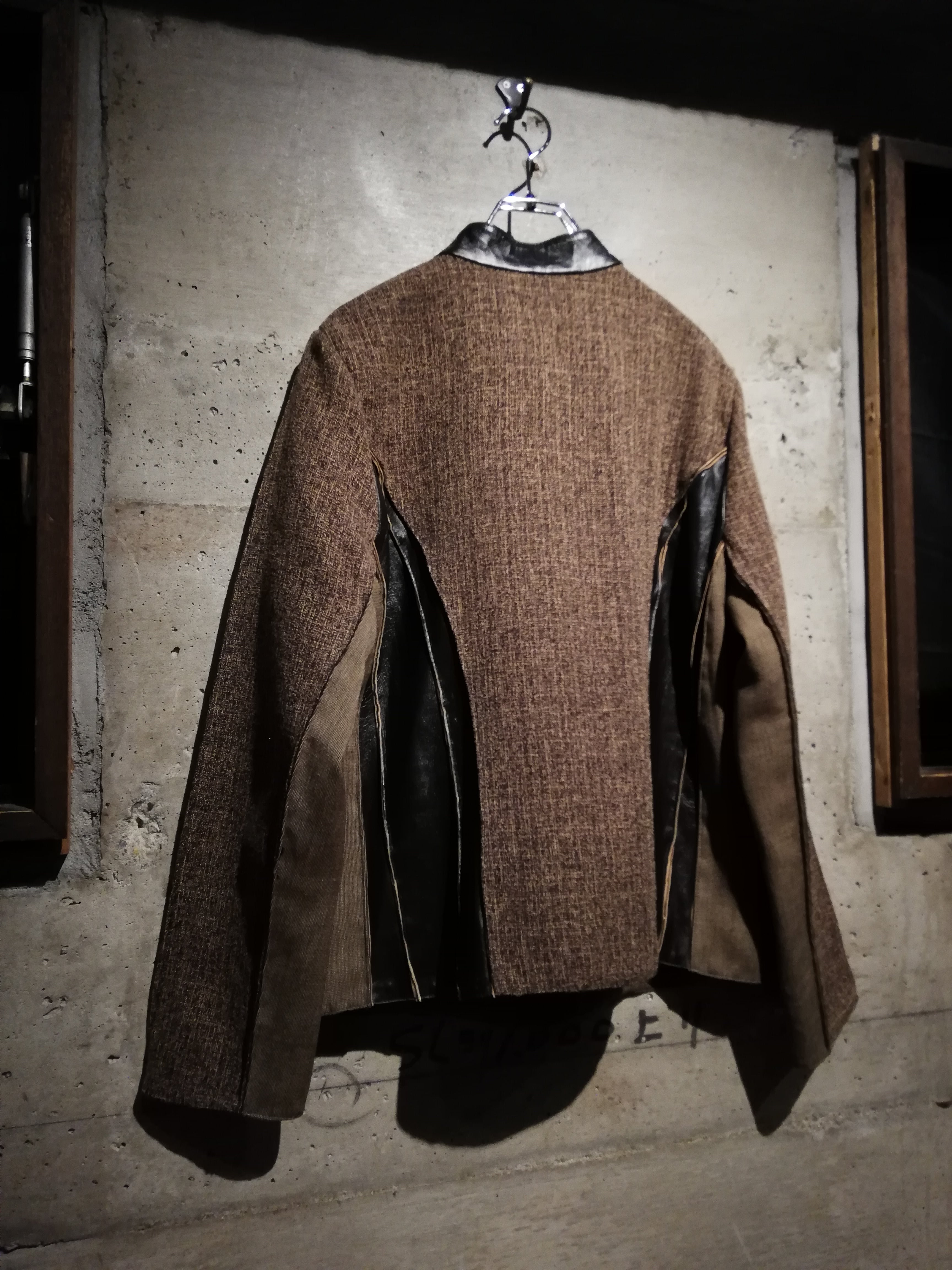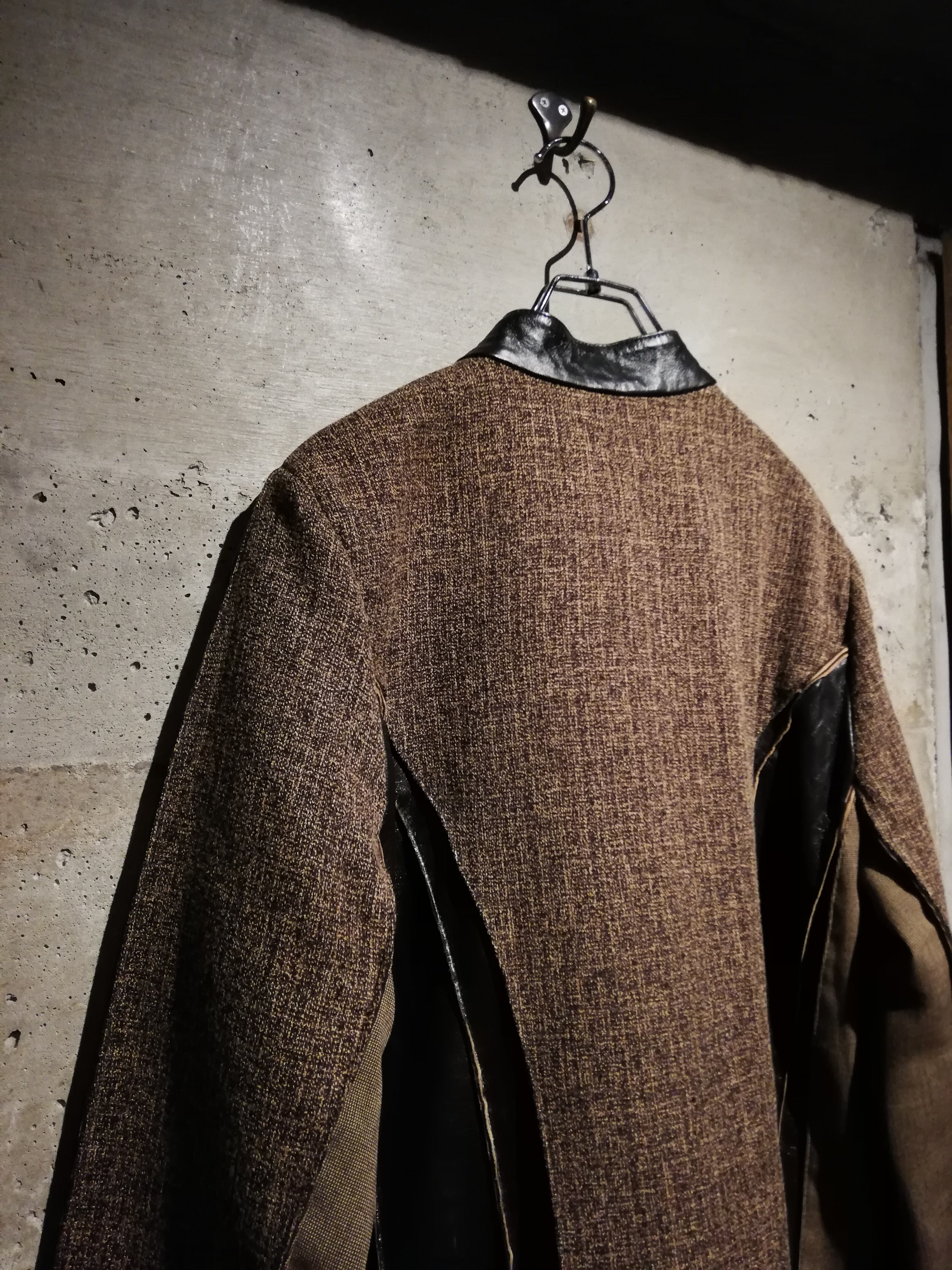 ブラウンのスムースレザー、ツイード、細かなチェック、マルチなアニマル柄の生地で切替えたジップアップジャケット。