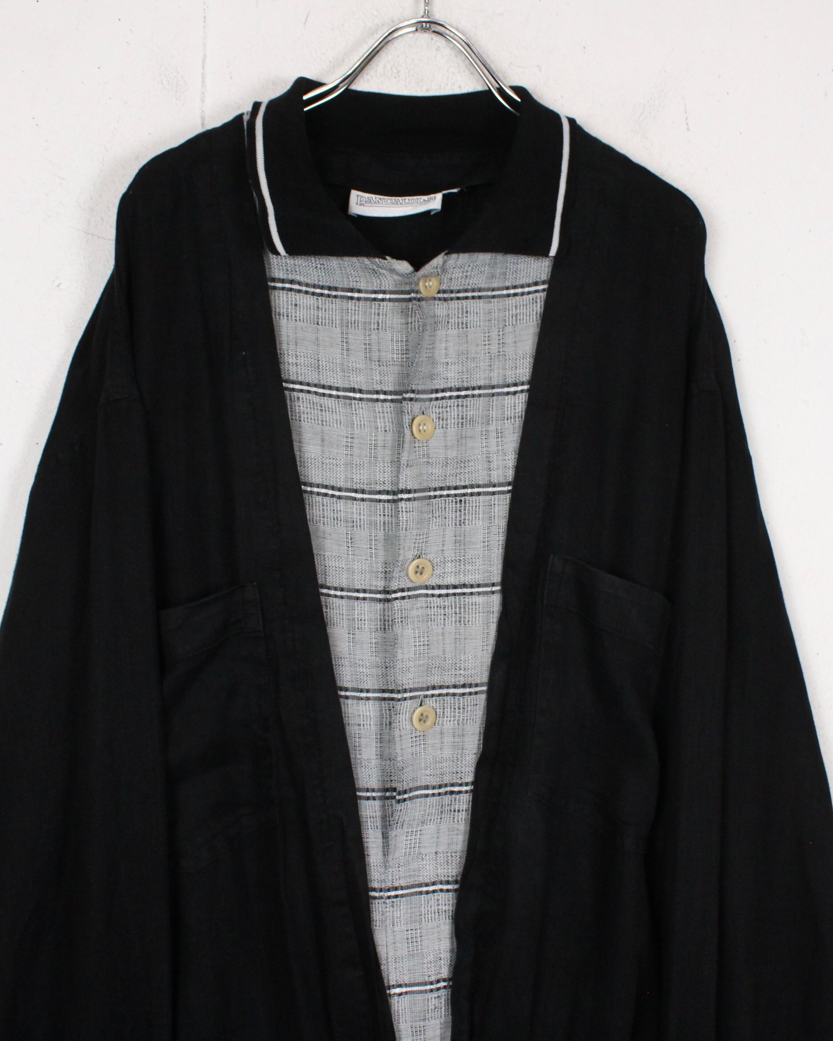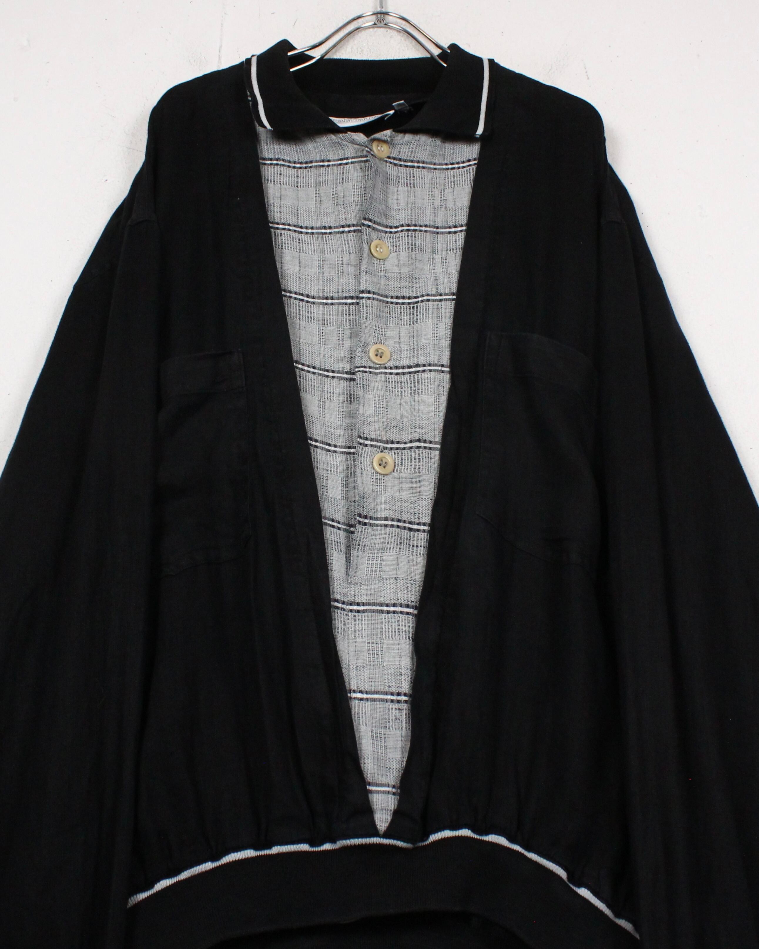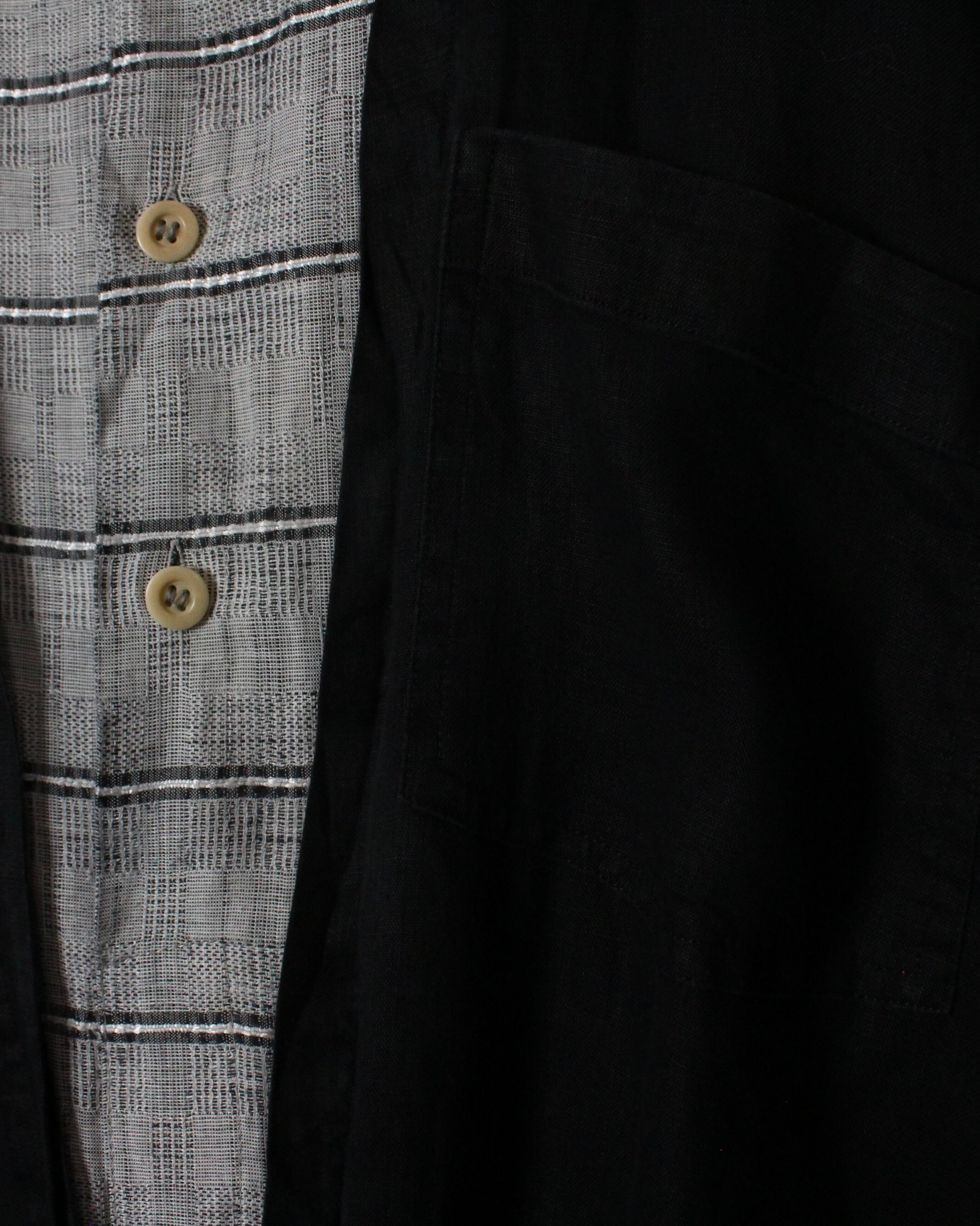 一枚のお洋服の中でレイヤードを表現した、非常に洒落た1着。ボディにはブラックリネンを用いており、チェック部分とは異なる素材感でよりアイテム同士のコントラストを際立てています。
