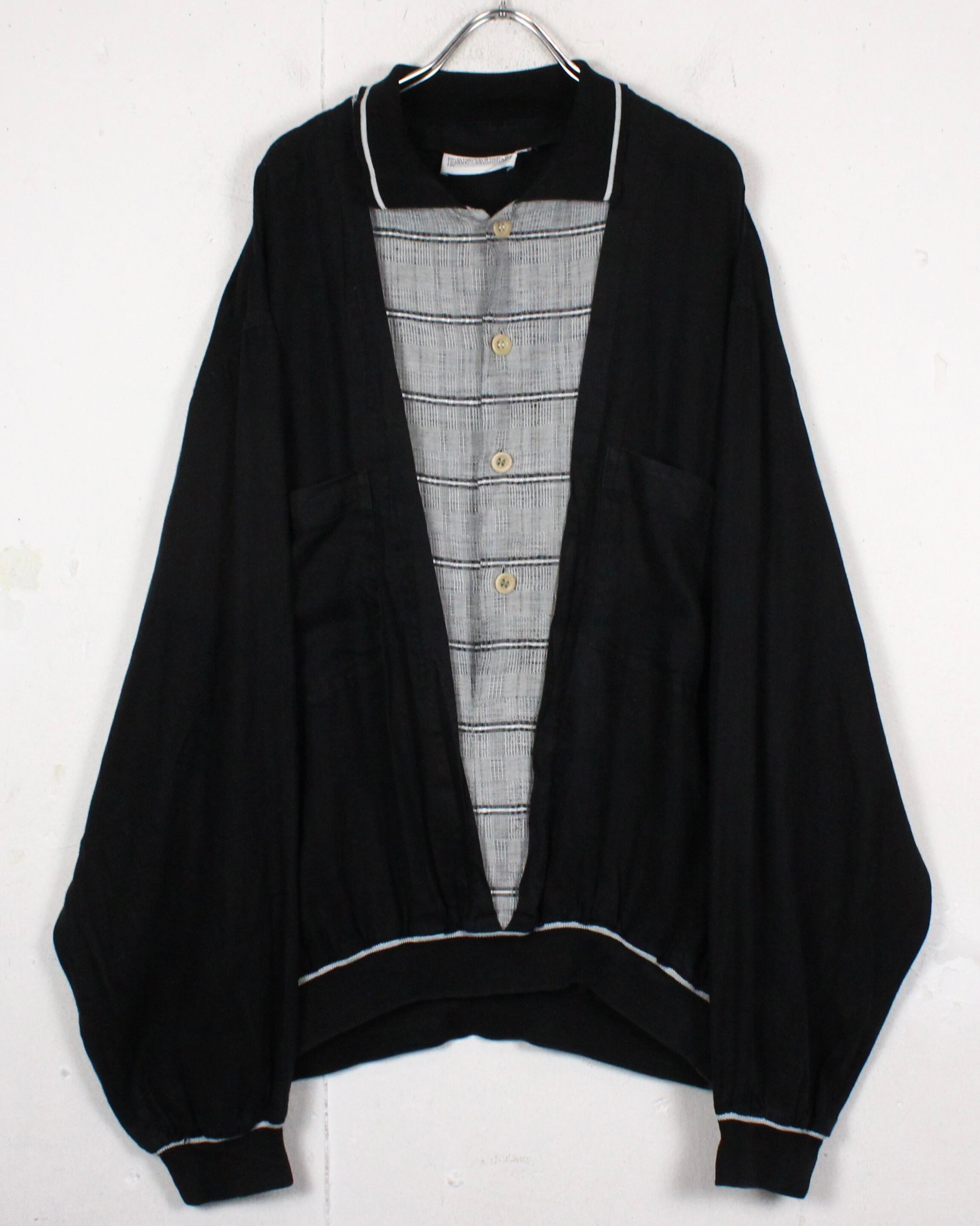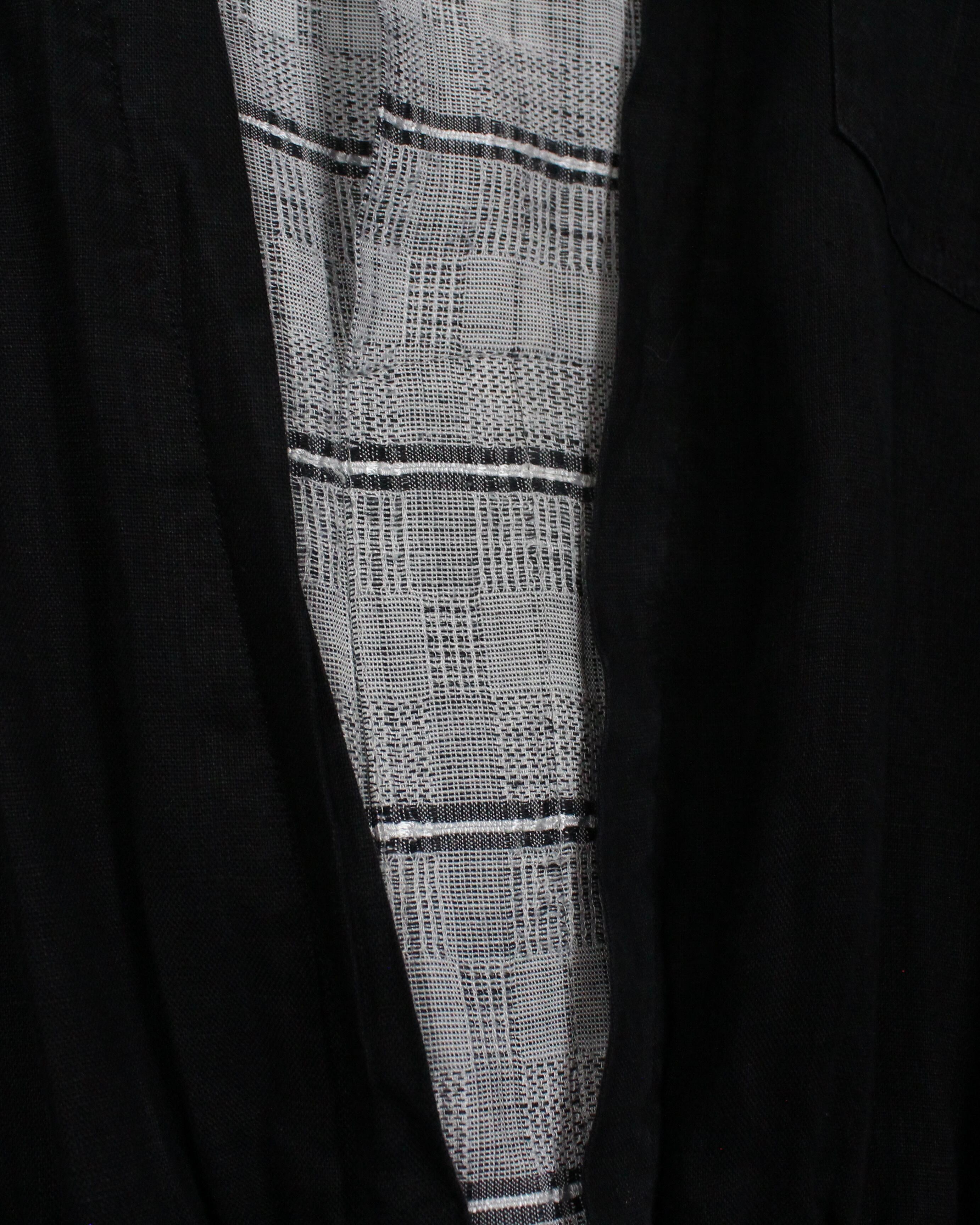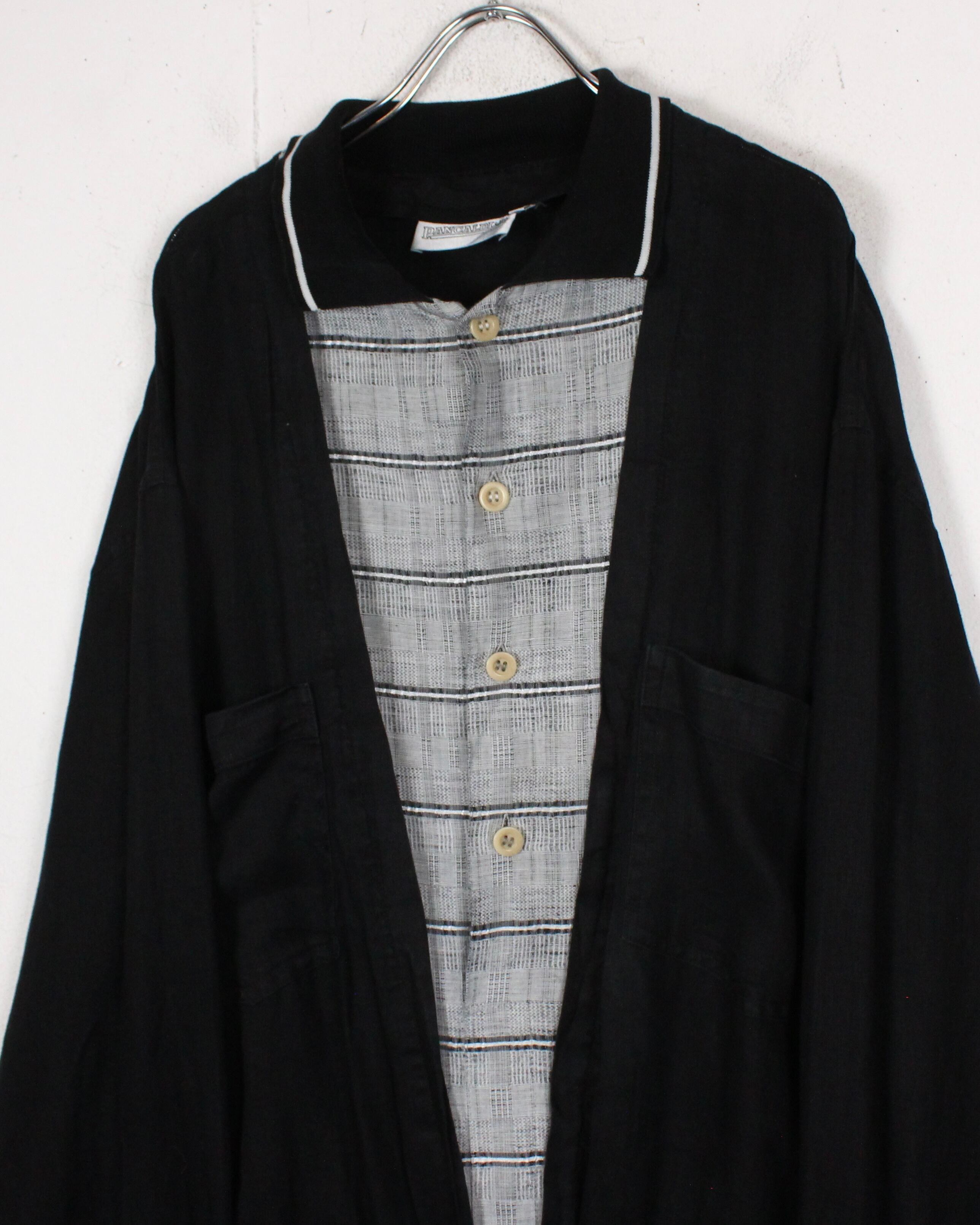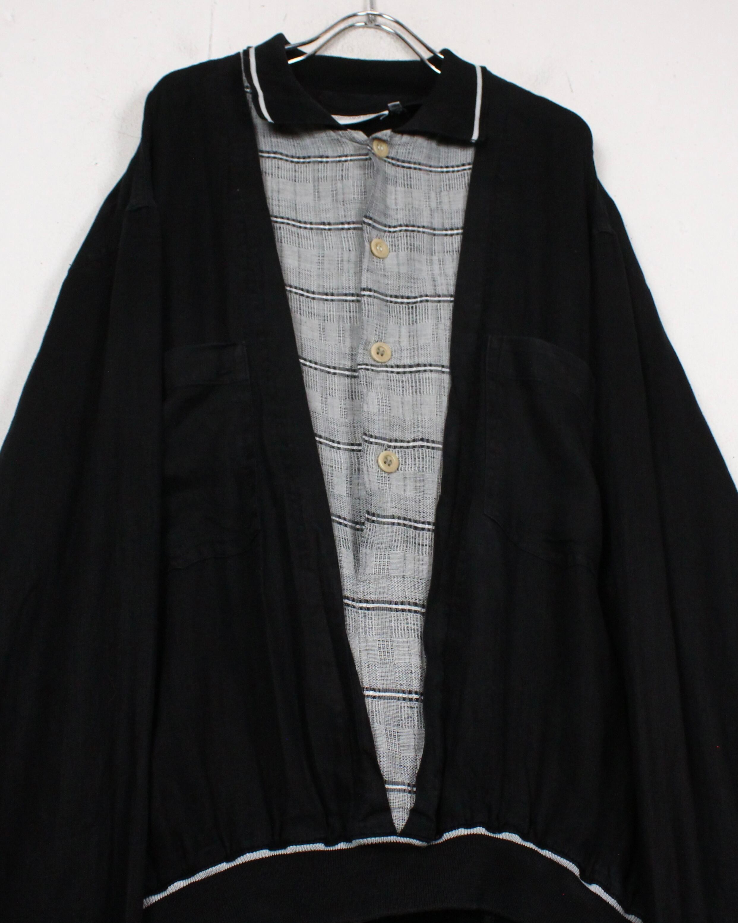 一枚のお洋服の中でレイヤードを表現した、非常に洒落た1着。ボディにはブラックリネンを用いており、チェック部分とは異なる素材感でよりアイテム同士のコントラストを際立てています。