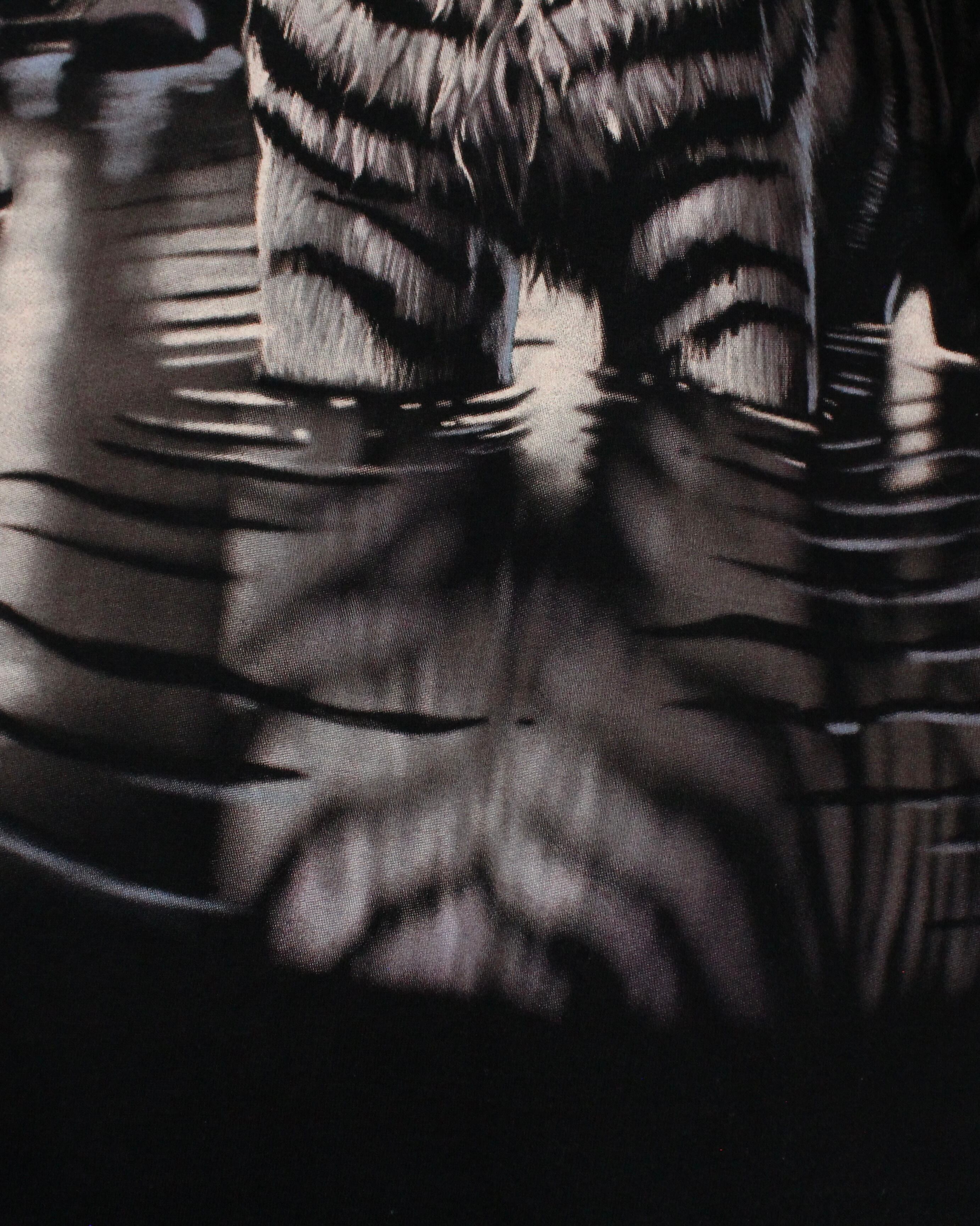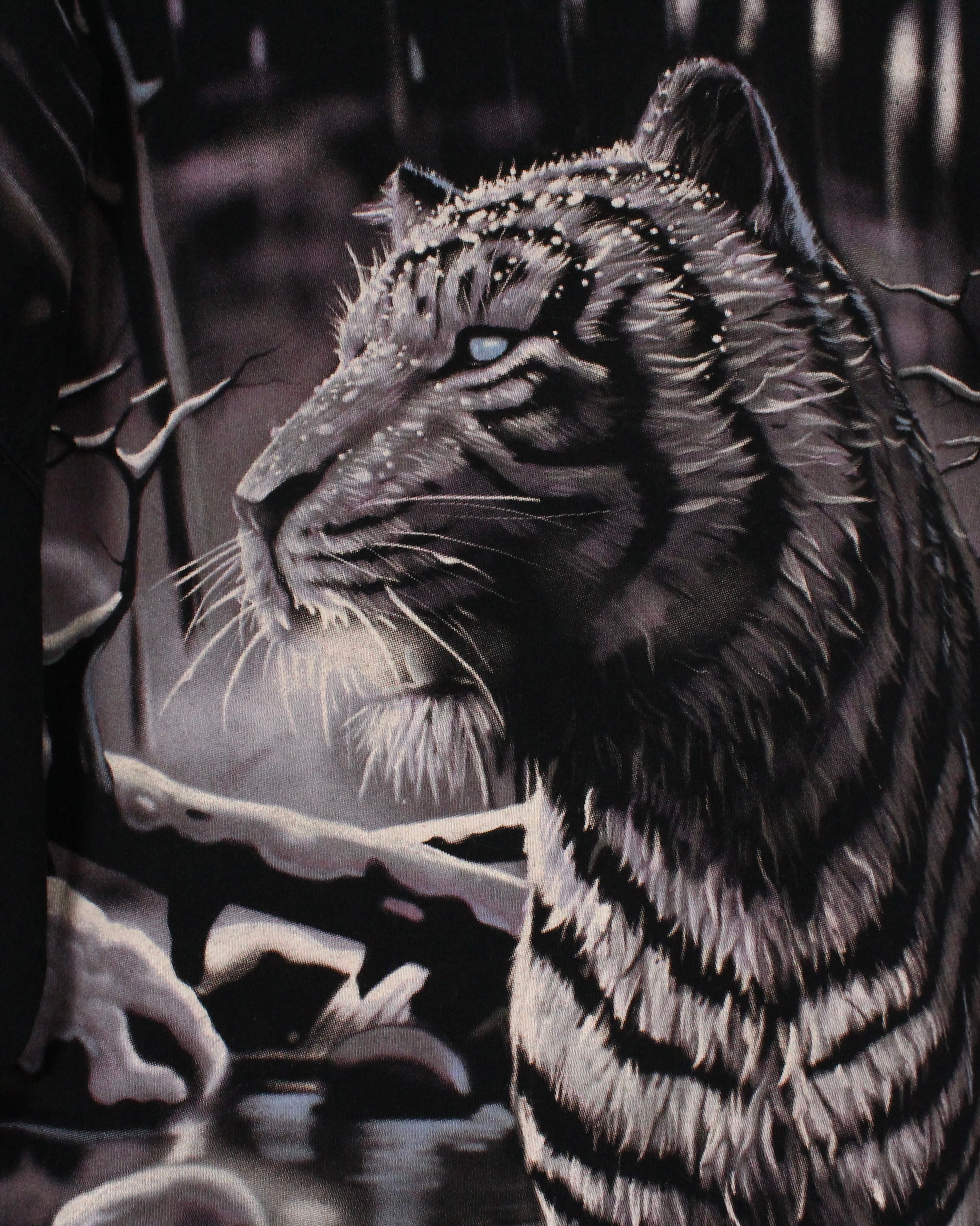 背面にも雪山の水面に構えるホワイトタイガーをプリントし、前後死角無しの抜かりのないデザイン性を誇ります。