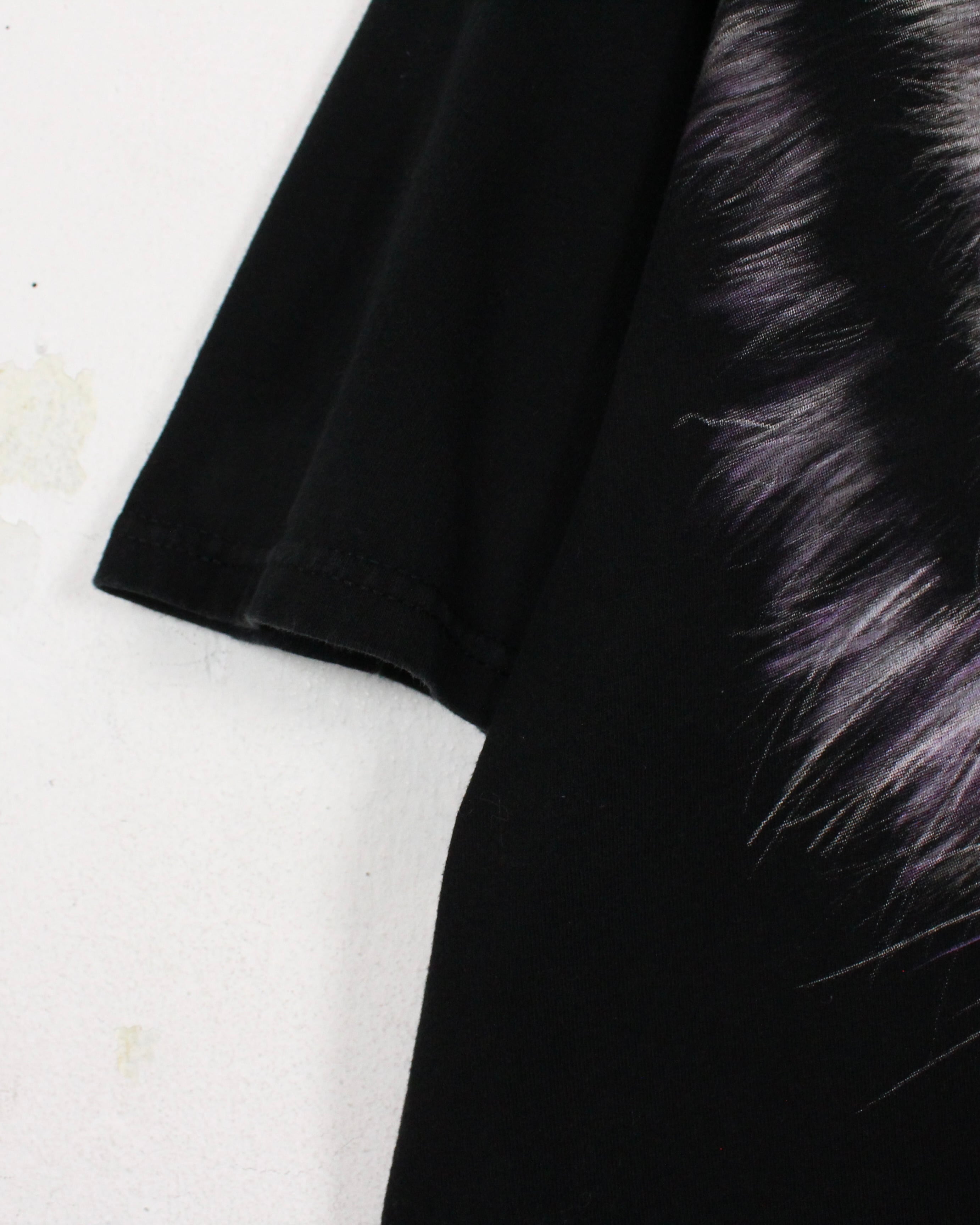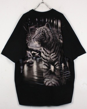ブラックのボディに、ティファニーブルーの只ならぬ眼差しでこちらを見つめる勇ましいホワイトタイガーをプリントで載せたTシャツ。