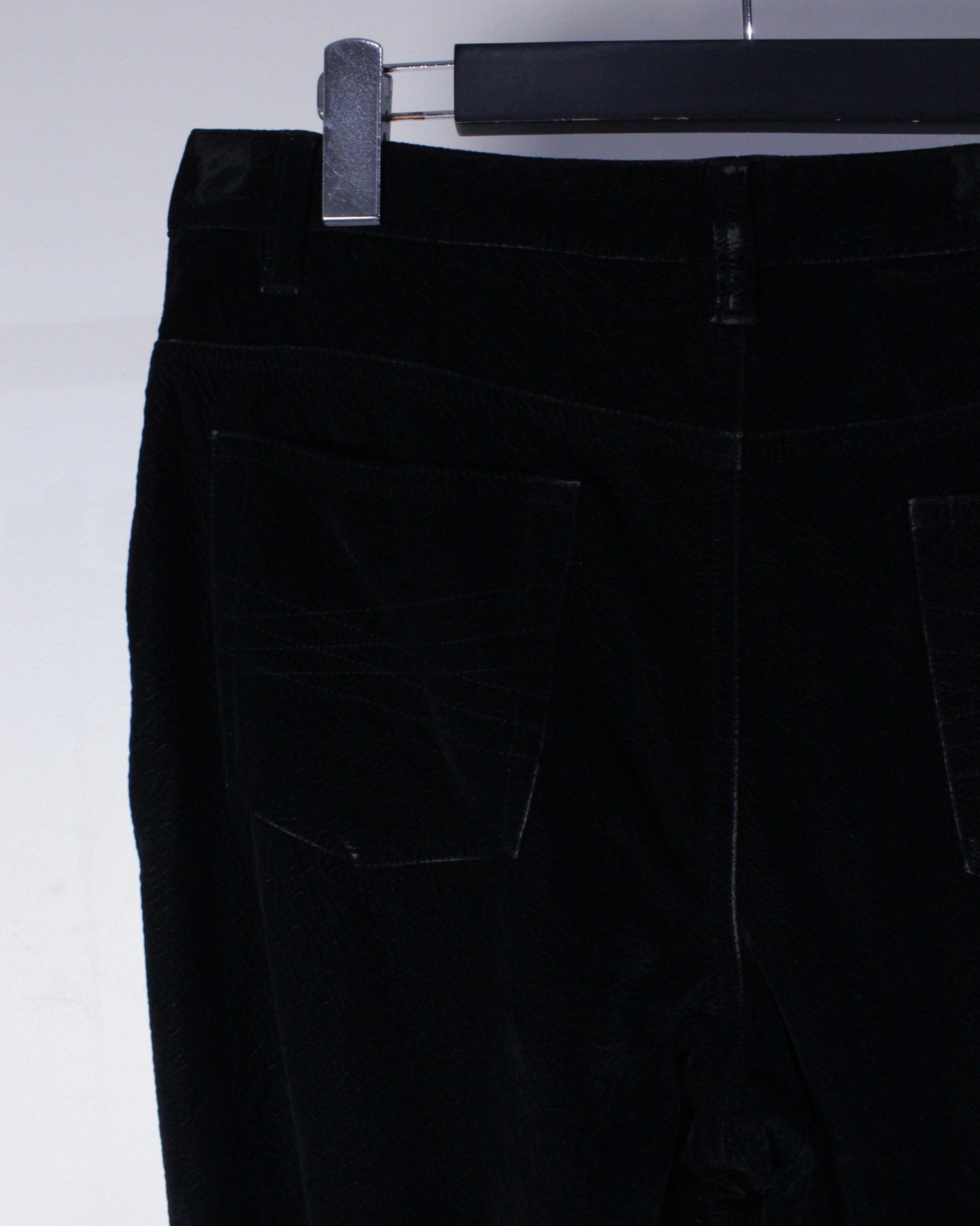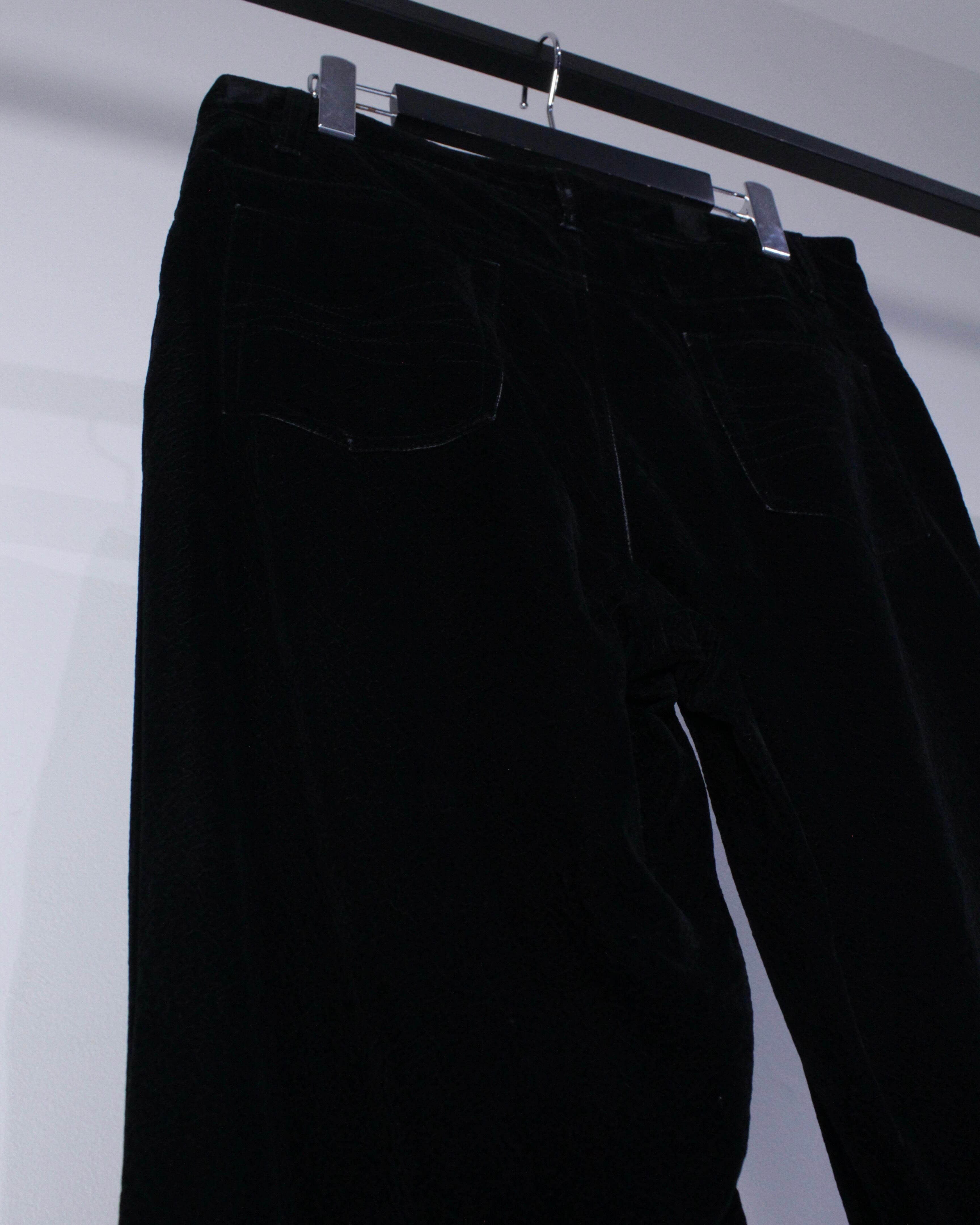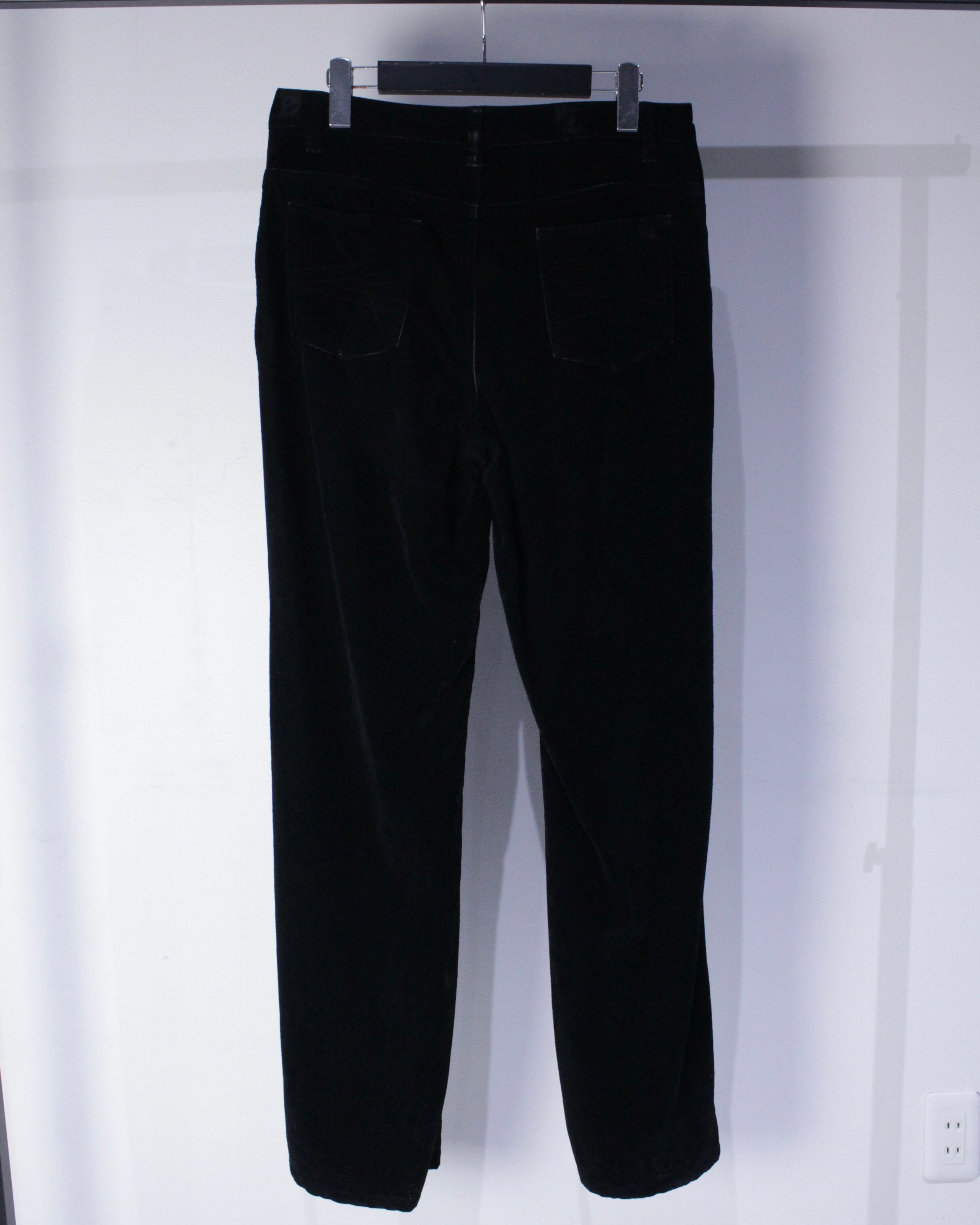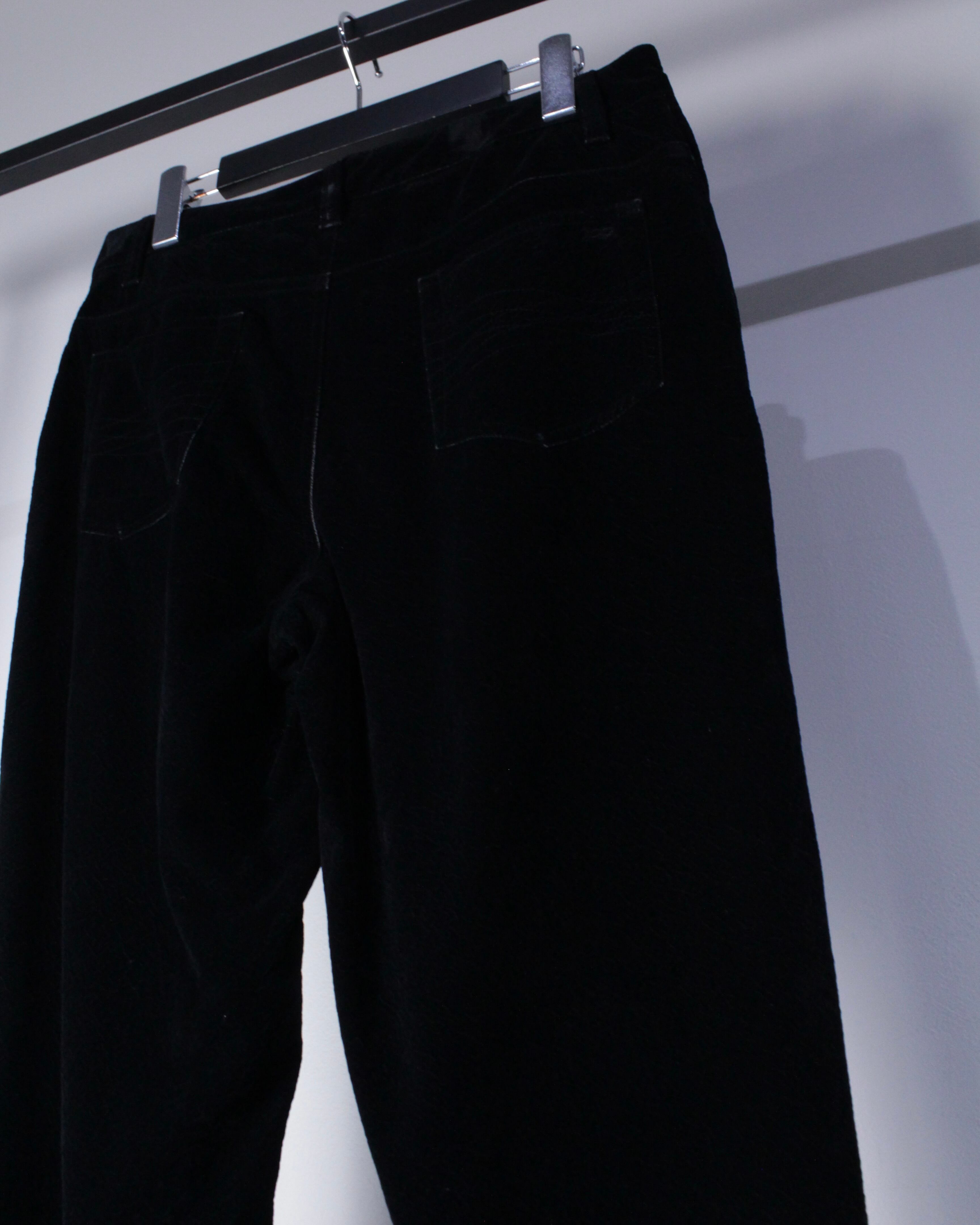 ボンディング加工を施した、鈍い光沢を放つベロアを用いたパンツ。