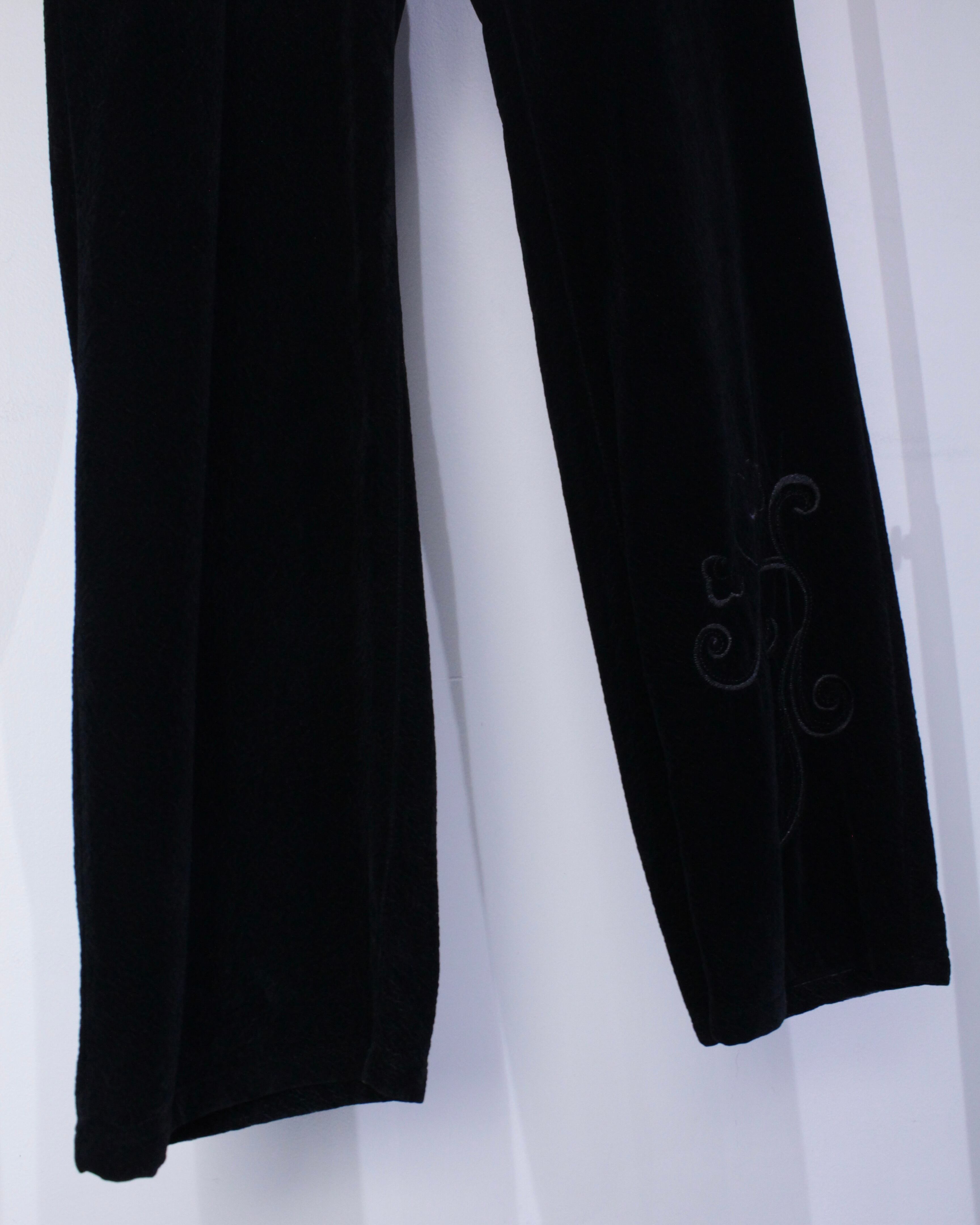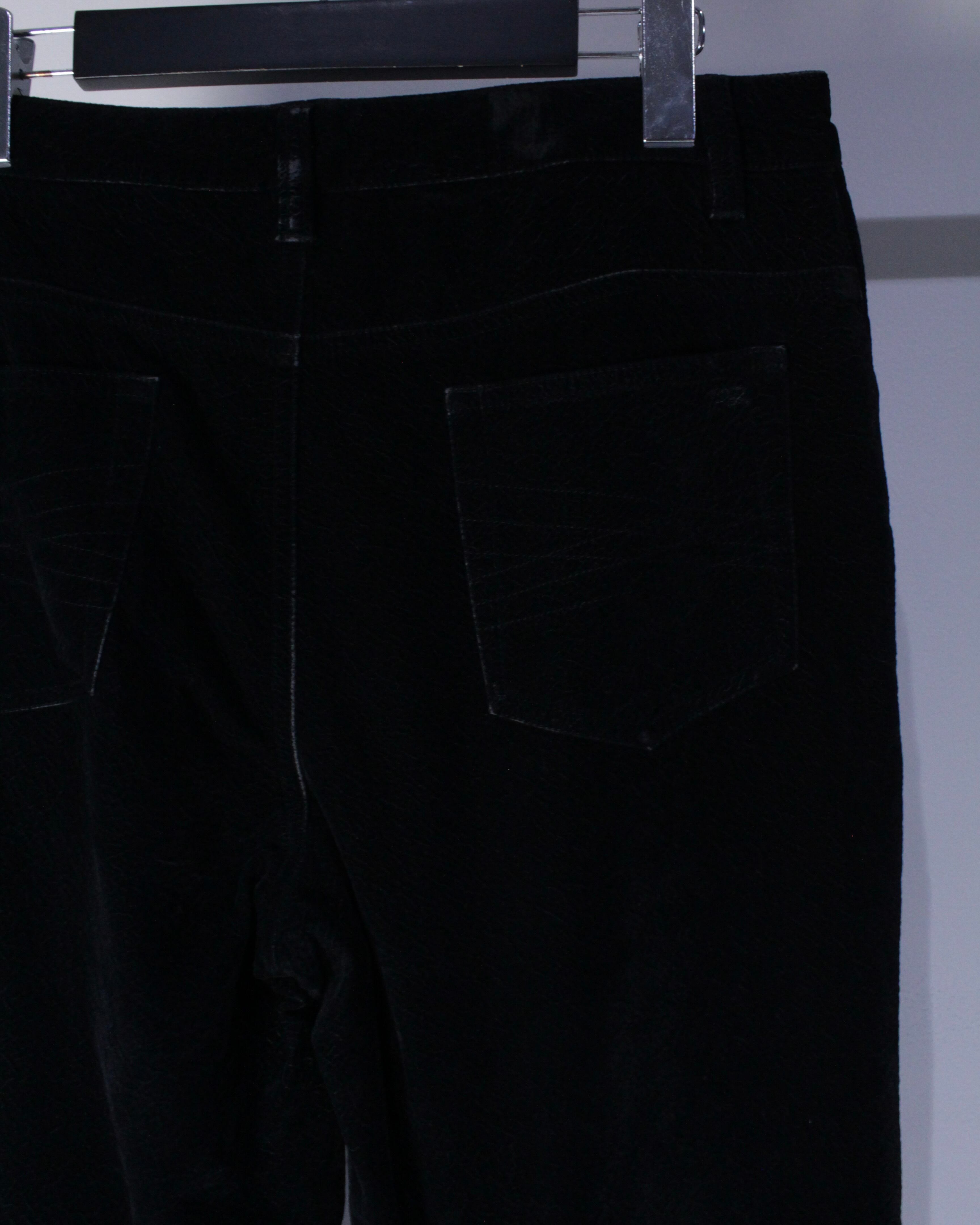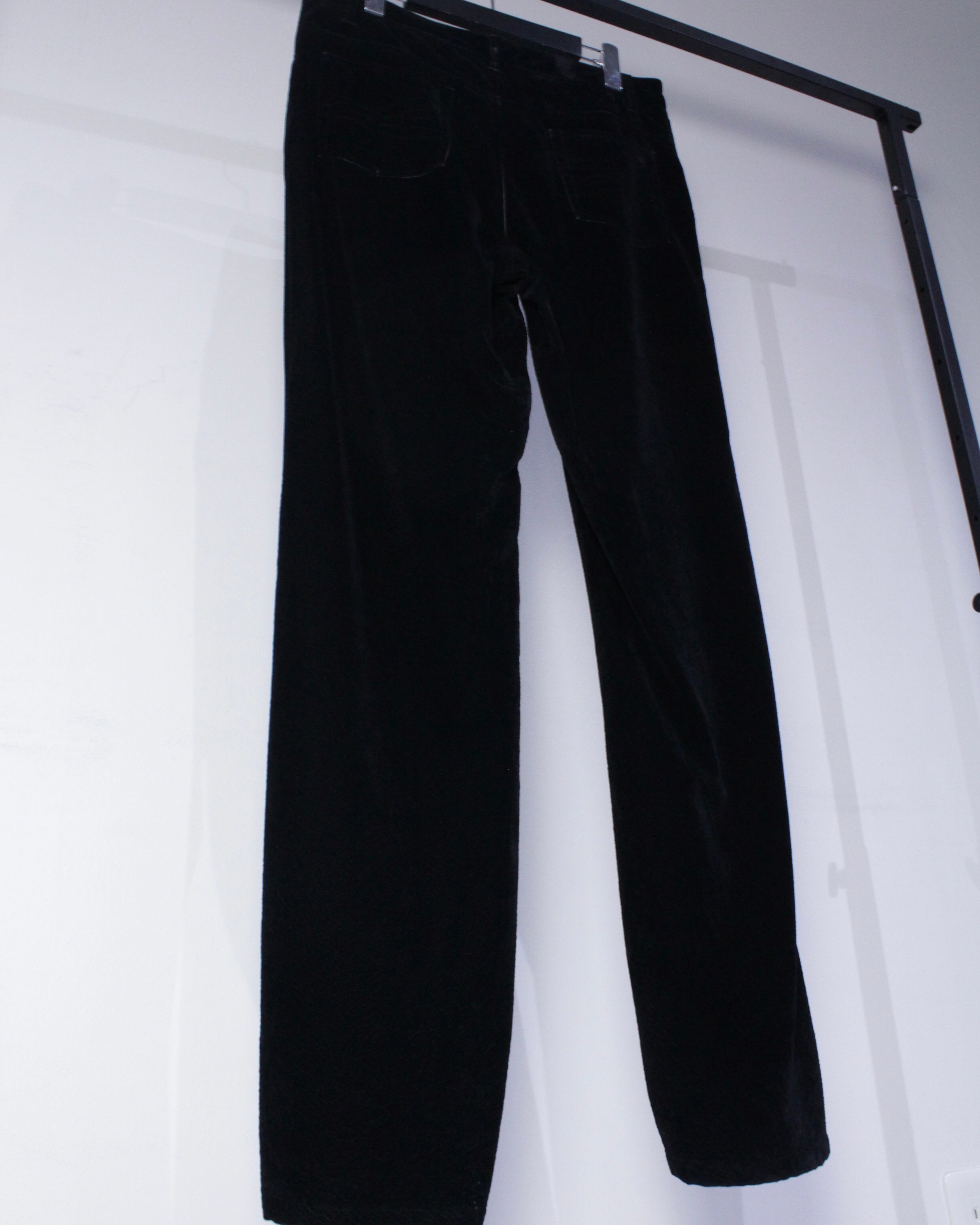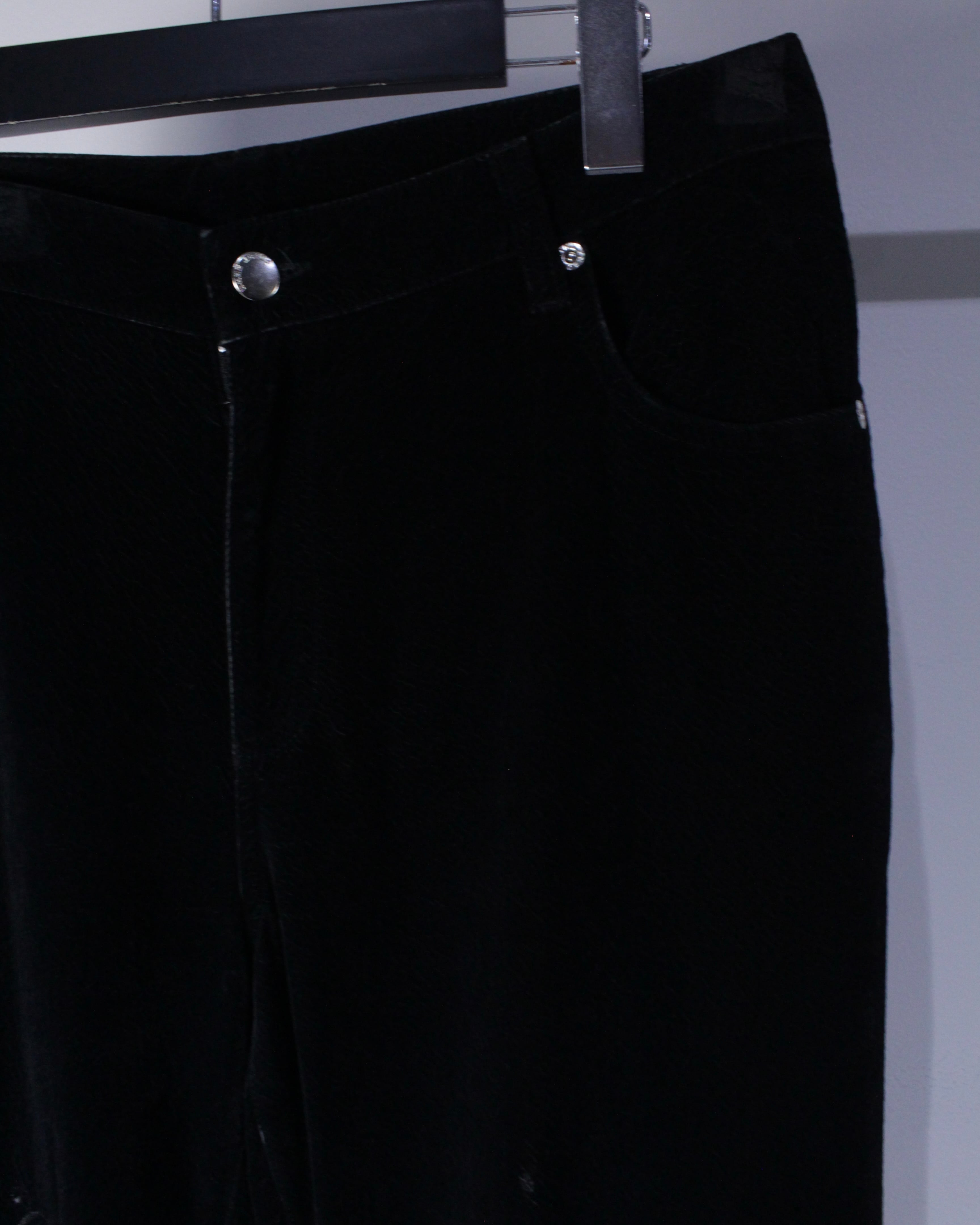 ボンディング加工を施した、鈍い光沢を放つベロアを用いたパンツ。