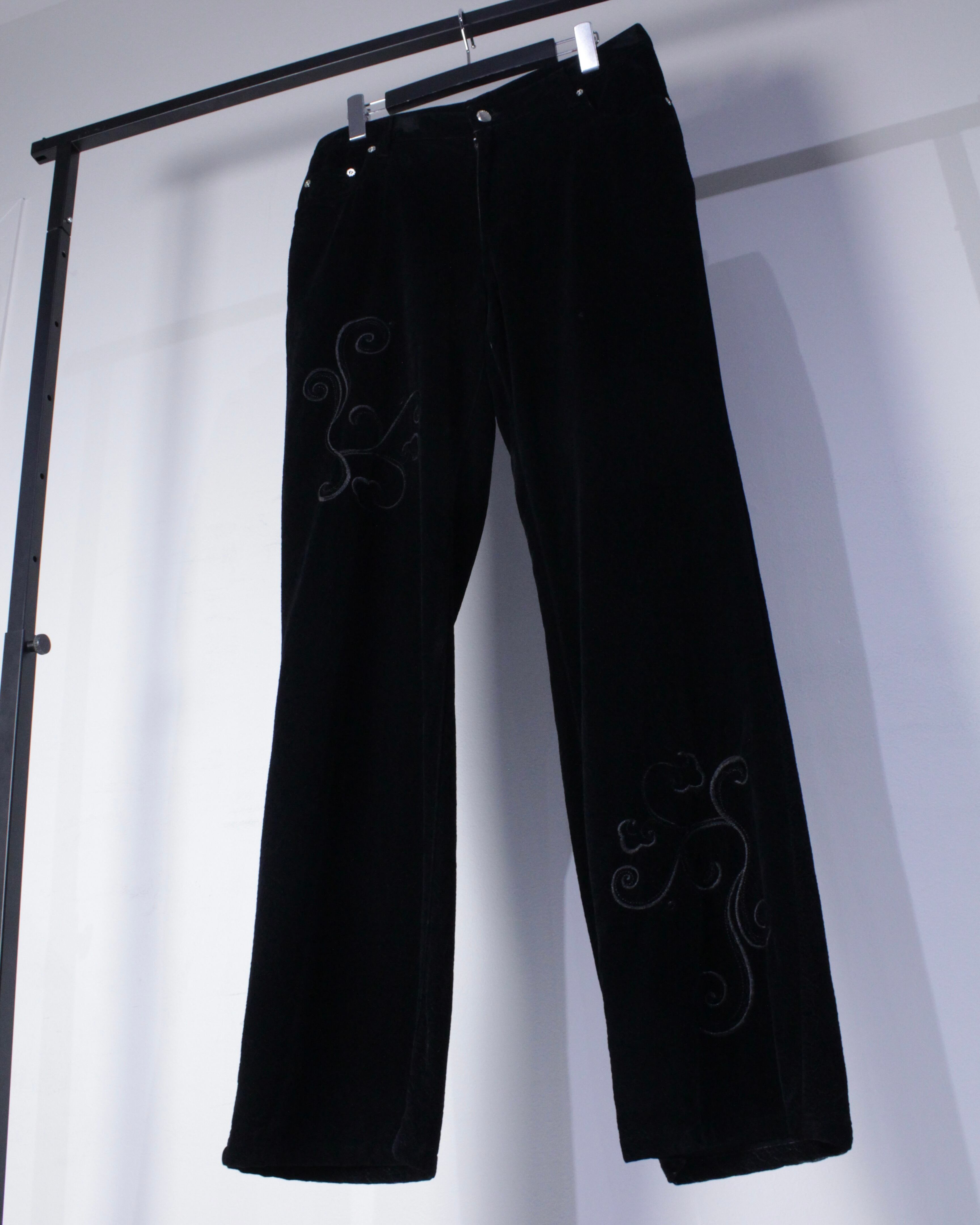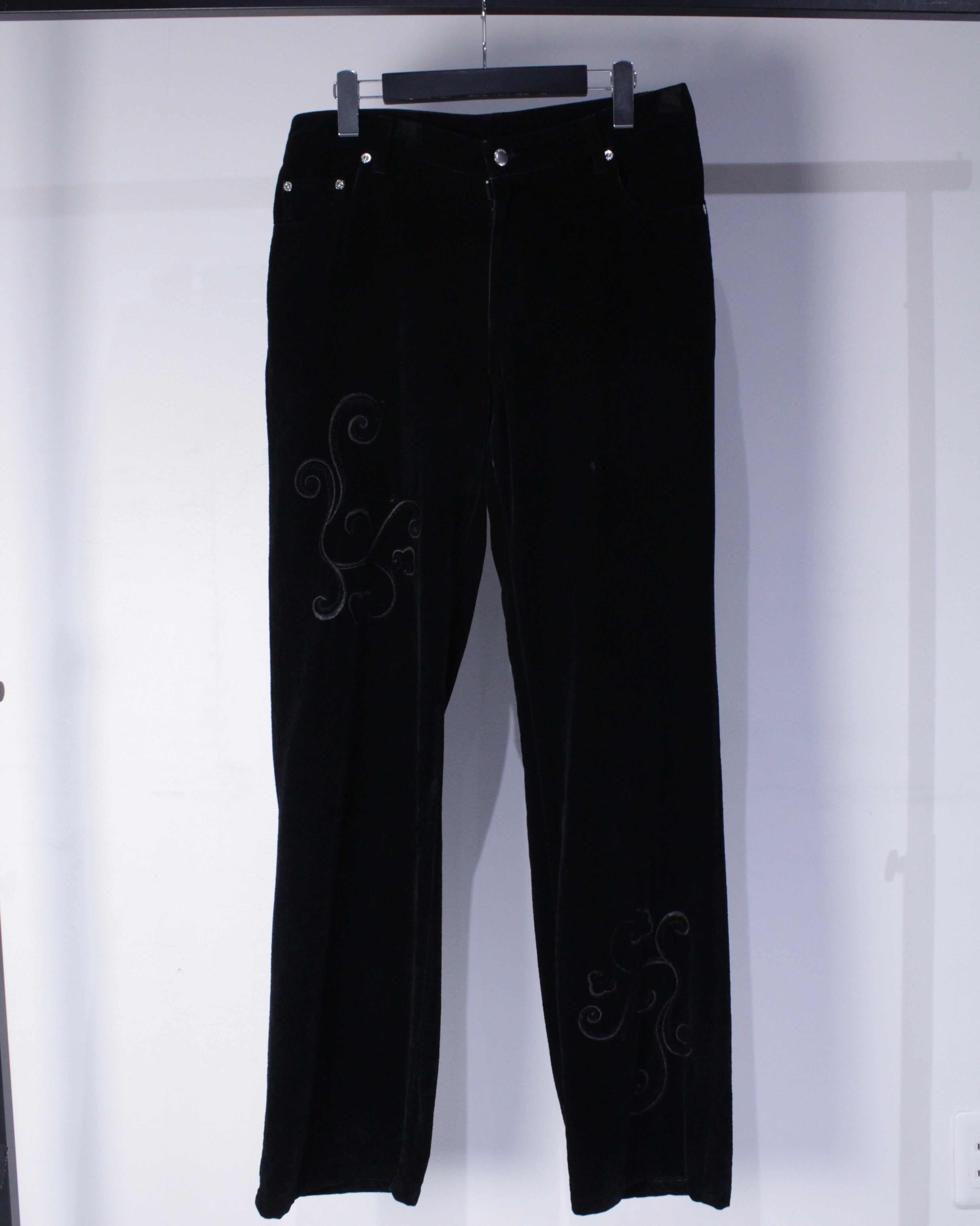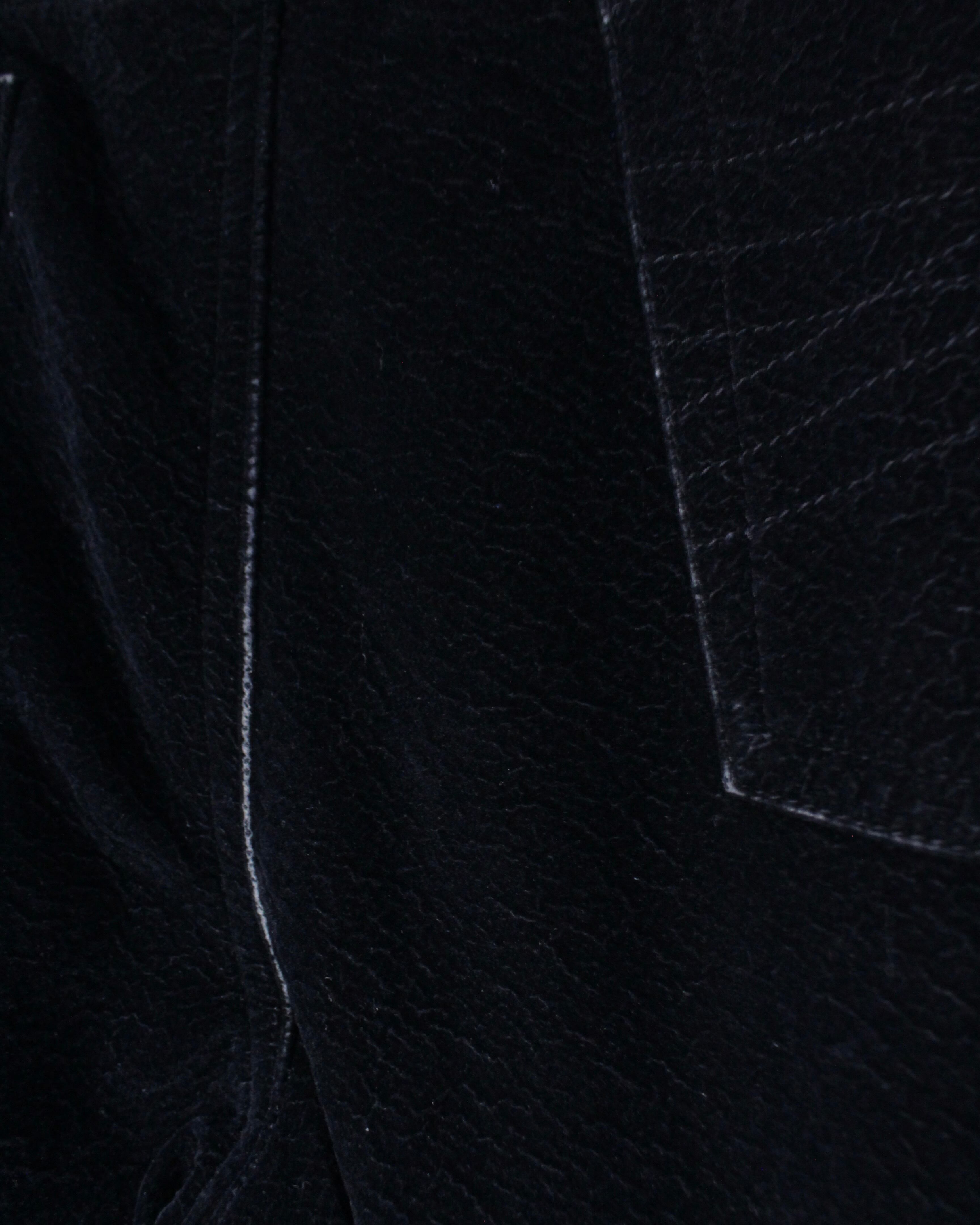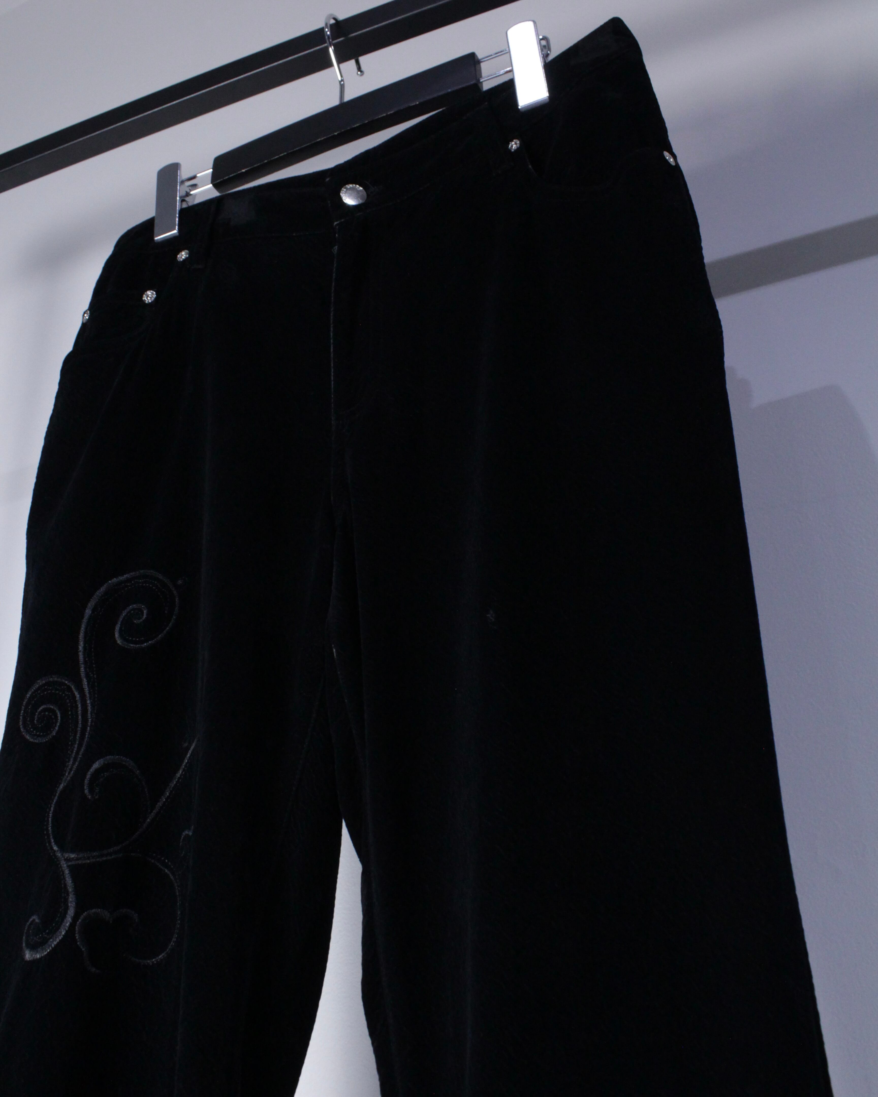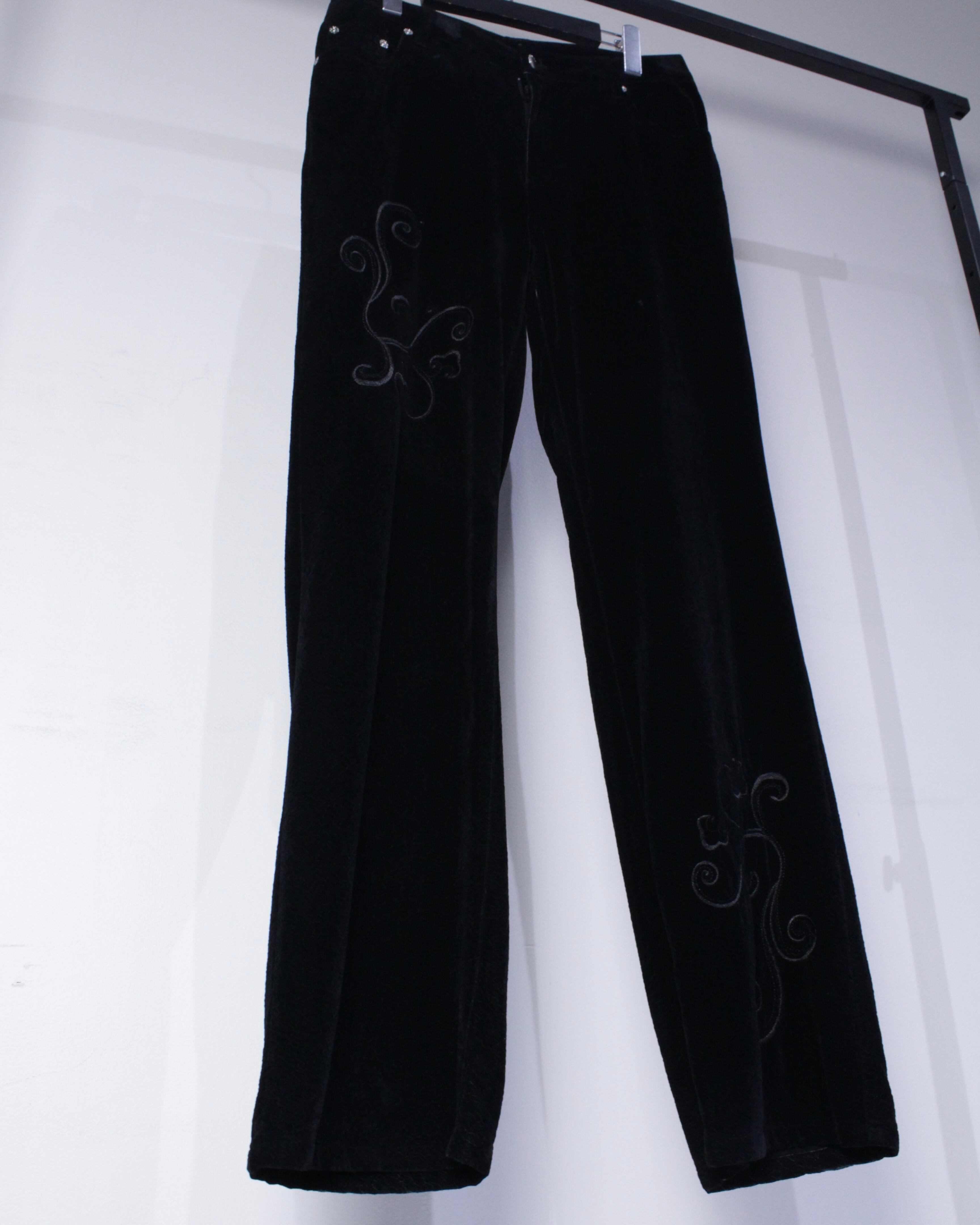 ボンディング加工を施した、鈍い光沢を放つベロアを用いたパンツ。