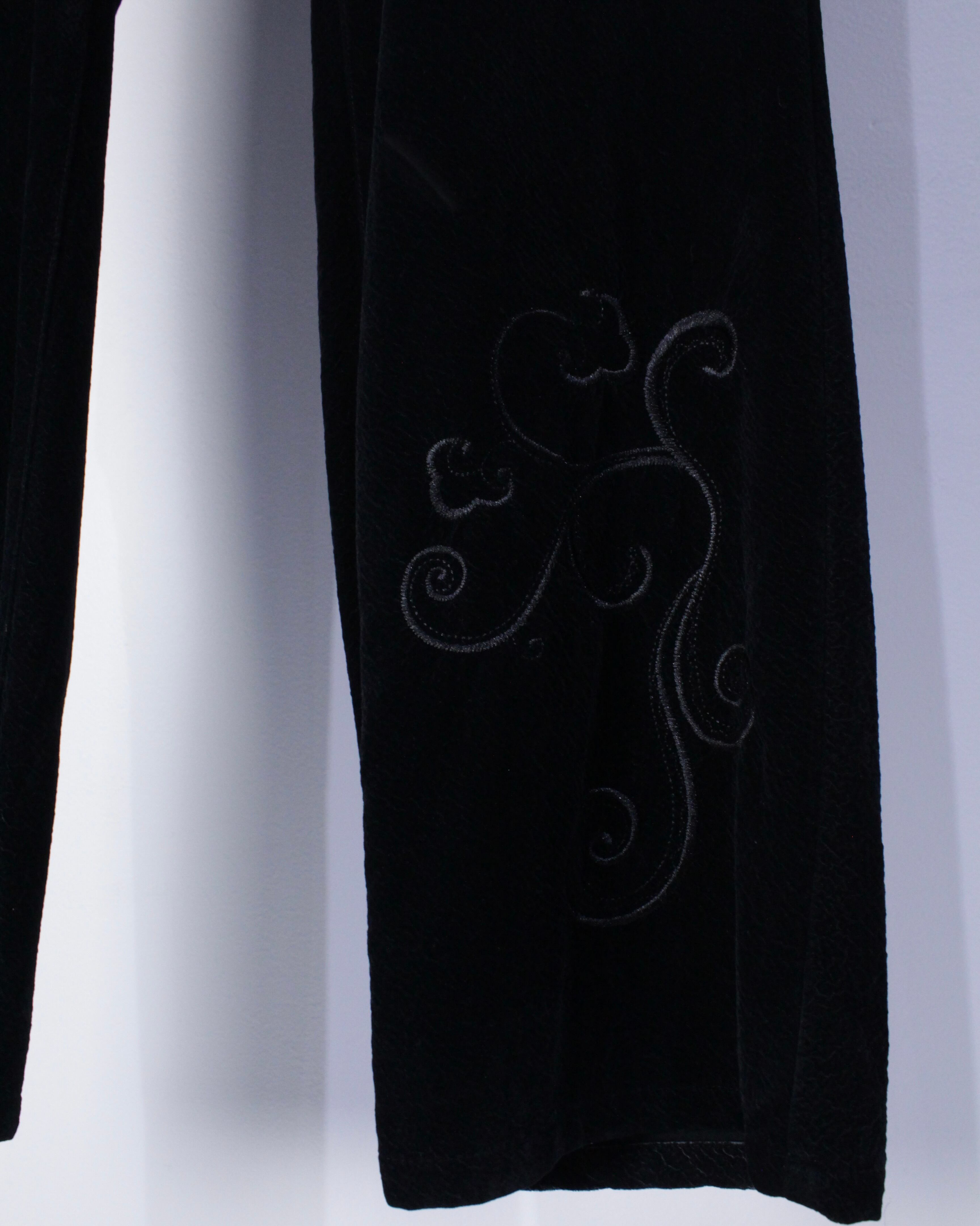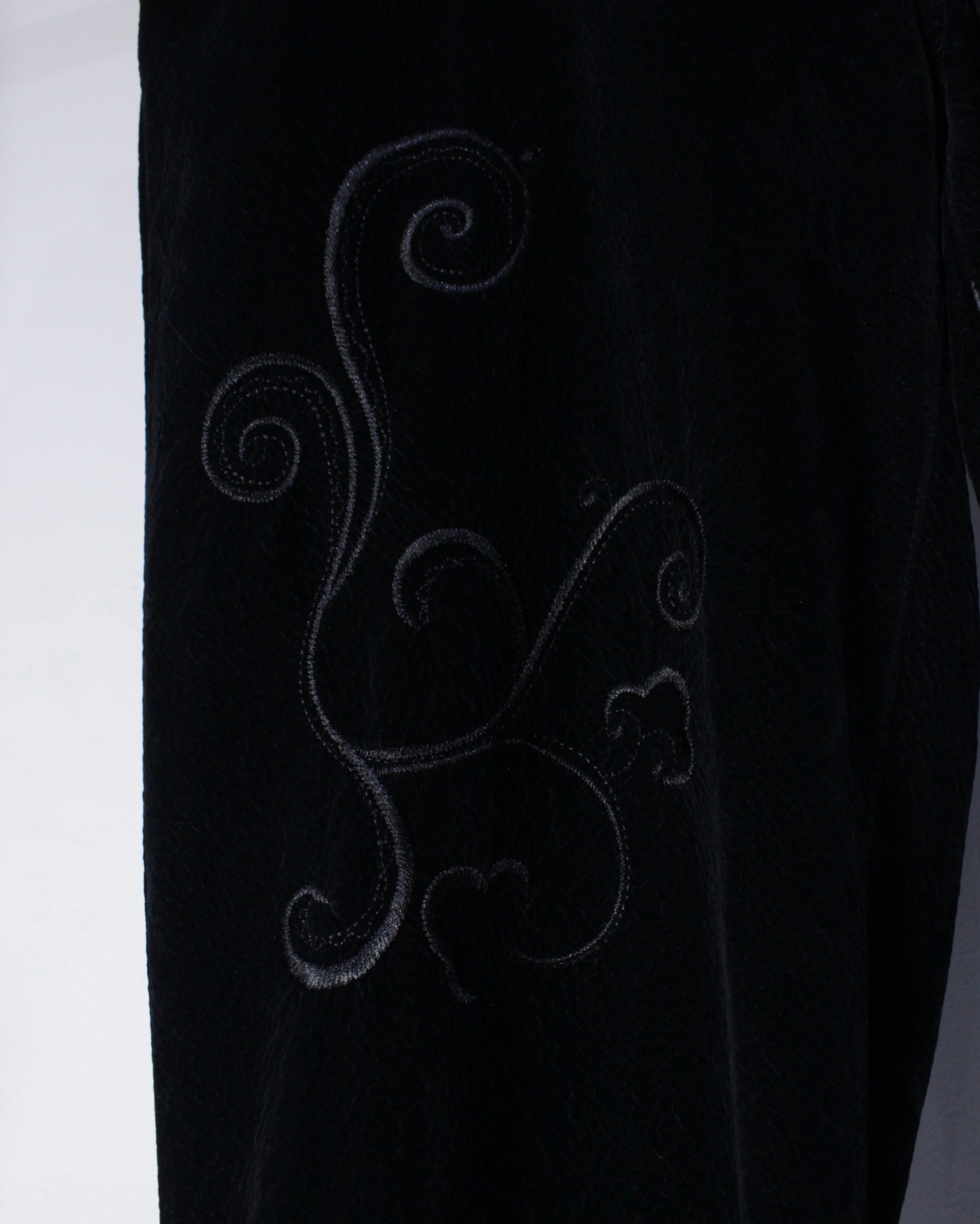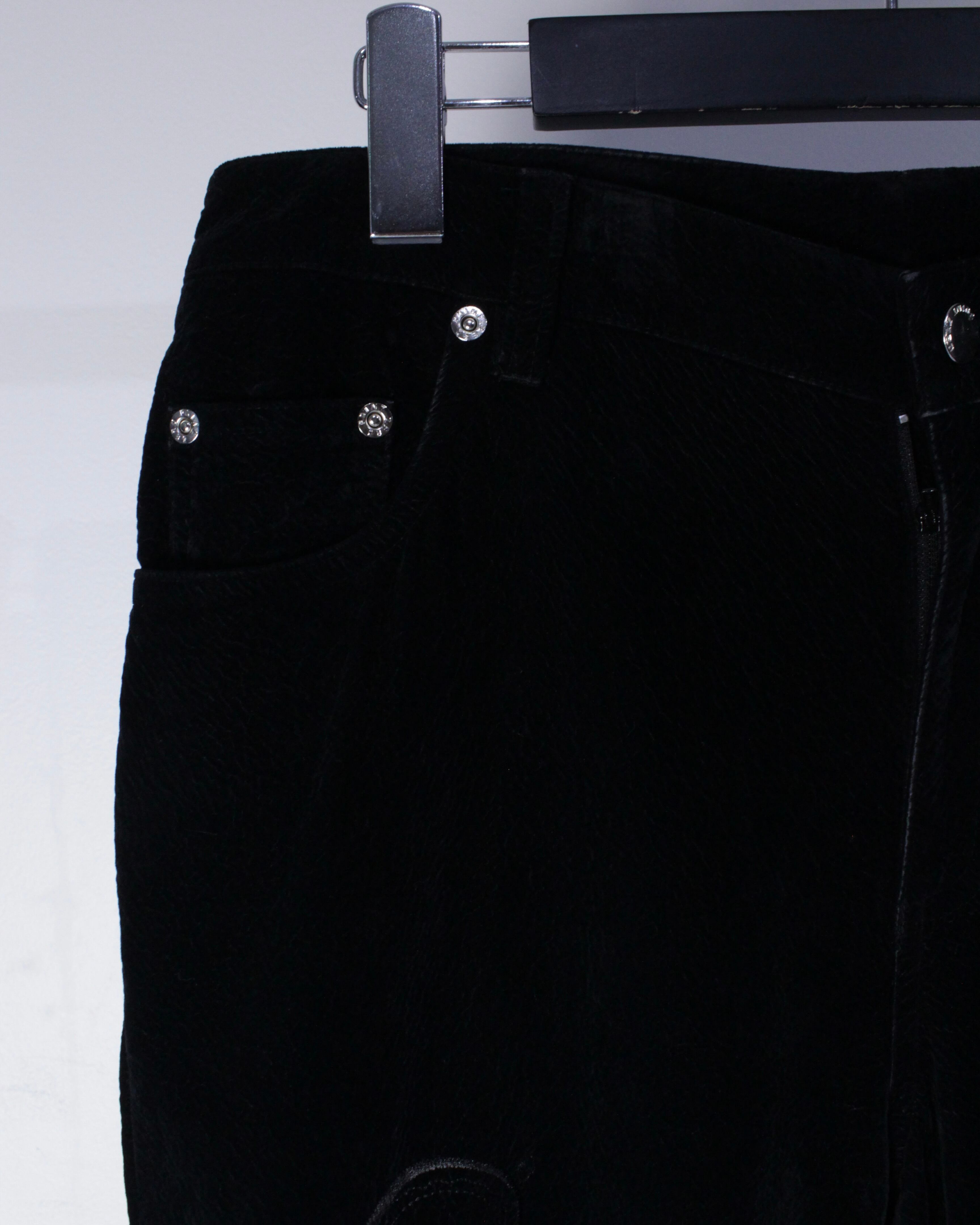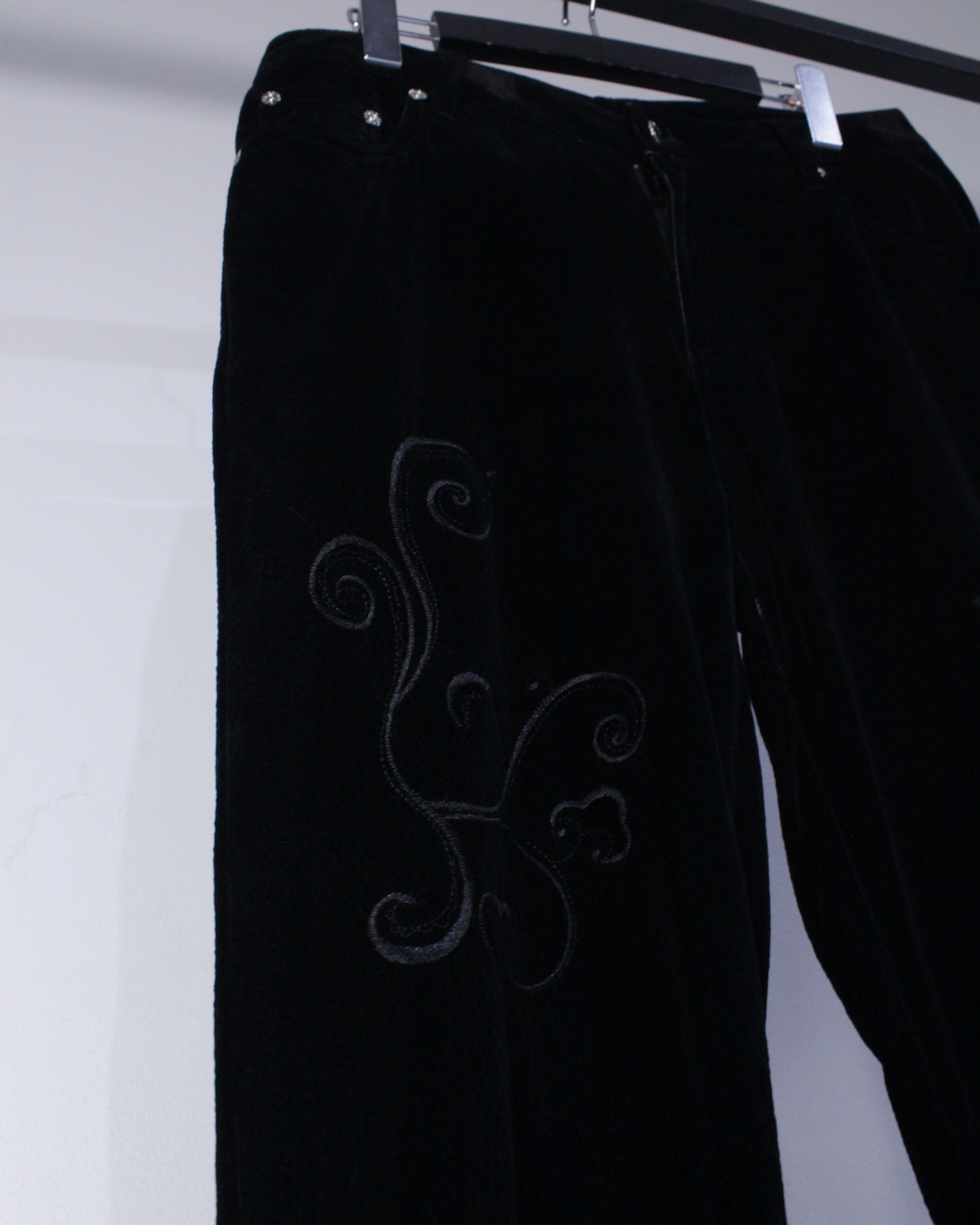 ボンディング加工を施した、鈍い光沢を放つベロアを用いたパンツ。