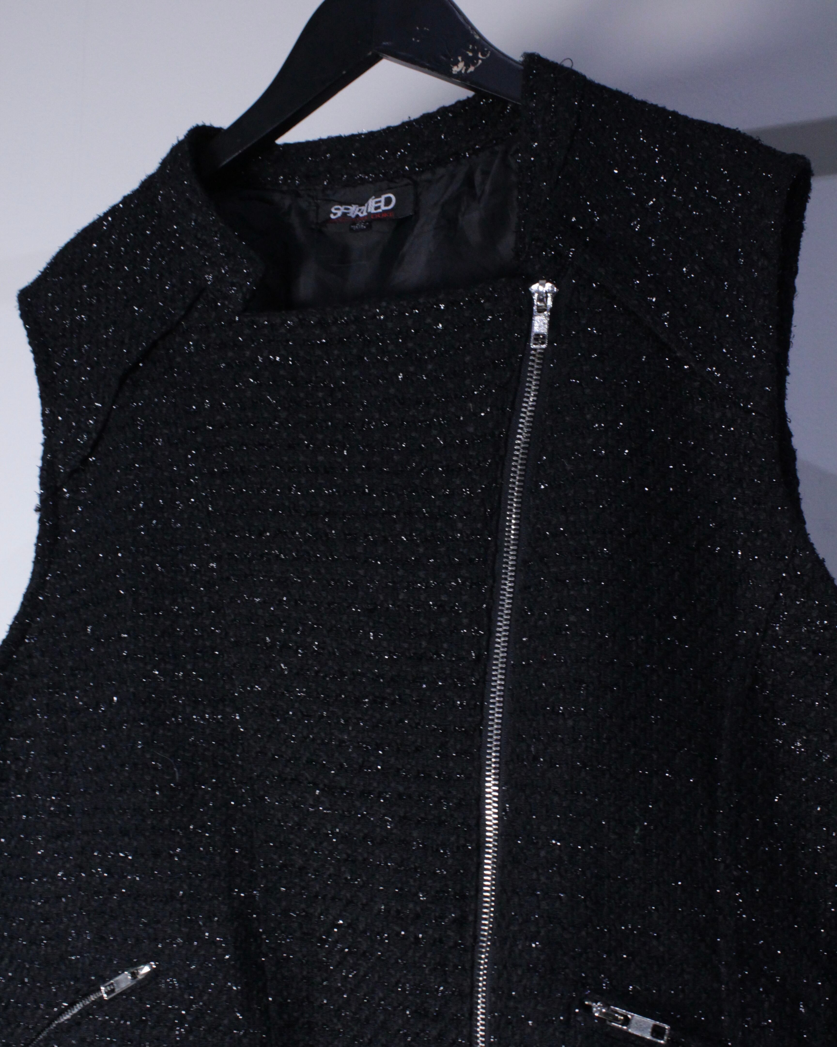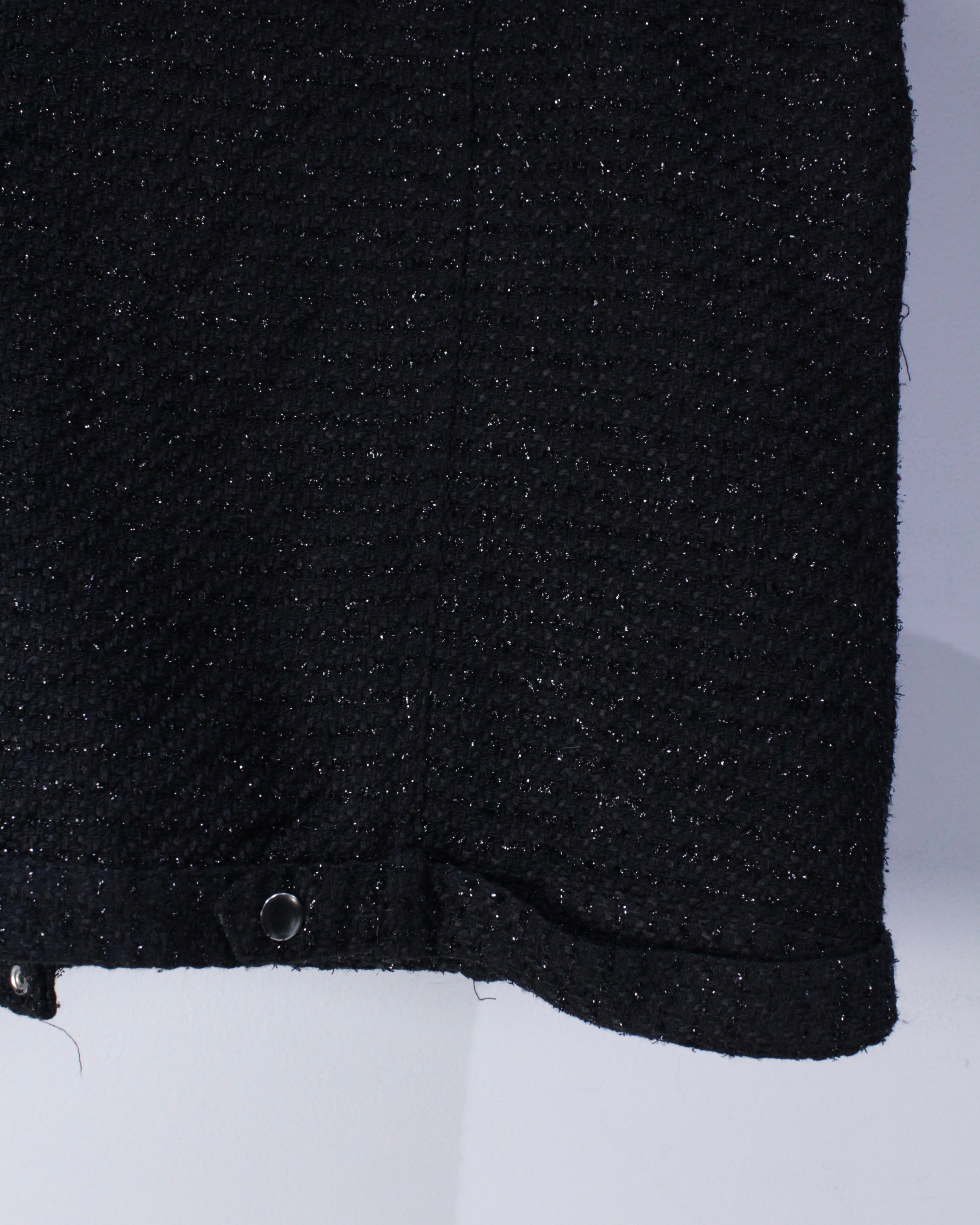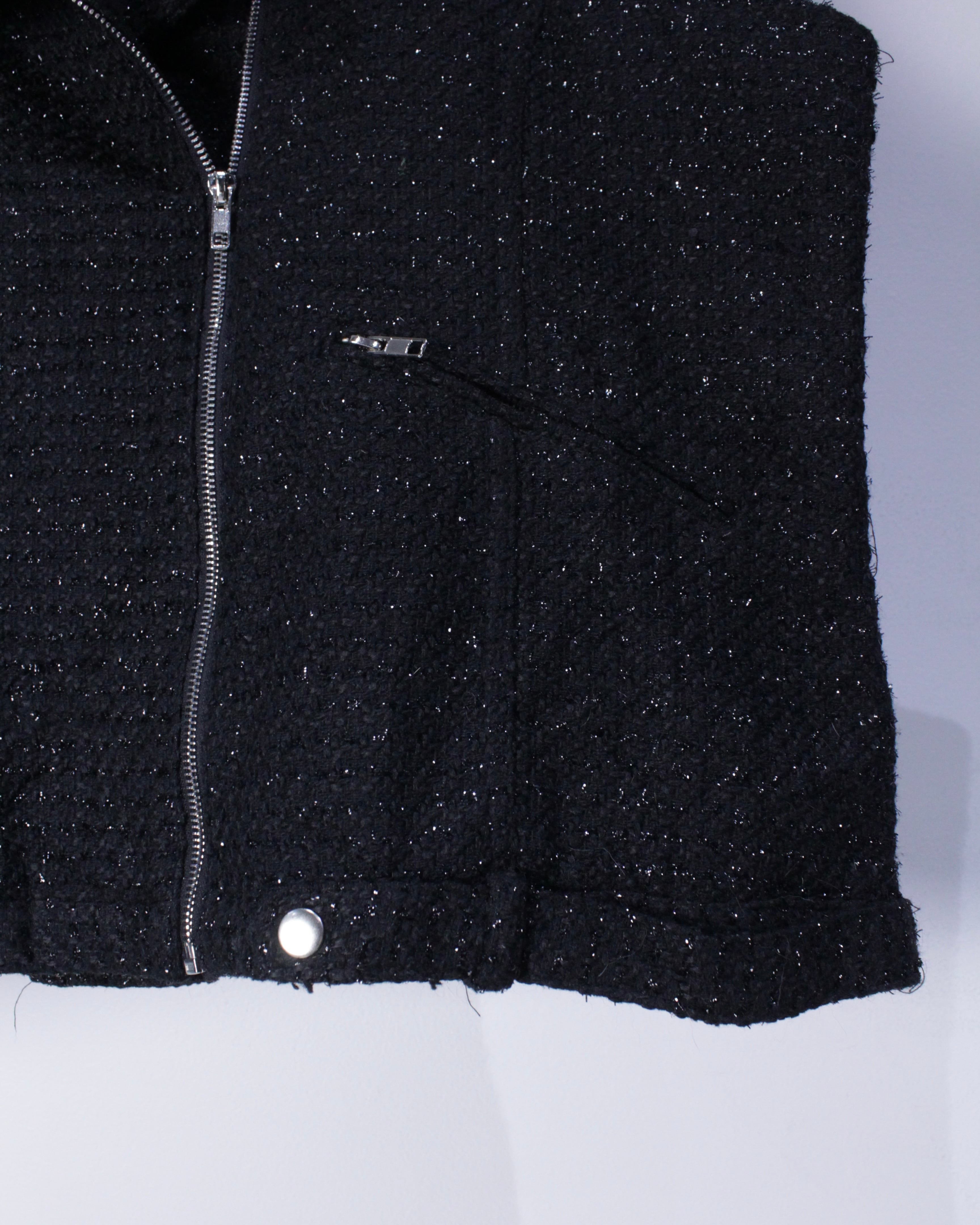 フロントはダブルライダース型で、裾のベルトもしっかりと踏襲。モードな雰囲気を漂うデザインを、ラグジュアリーなツイードと掛け合わせたデザインバランスが素晴らしい、、、