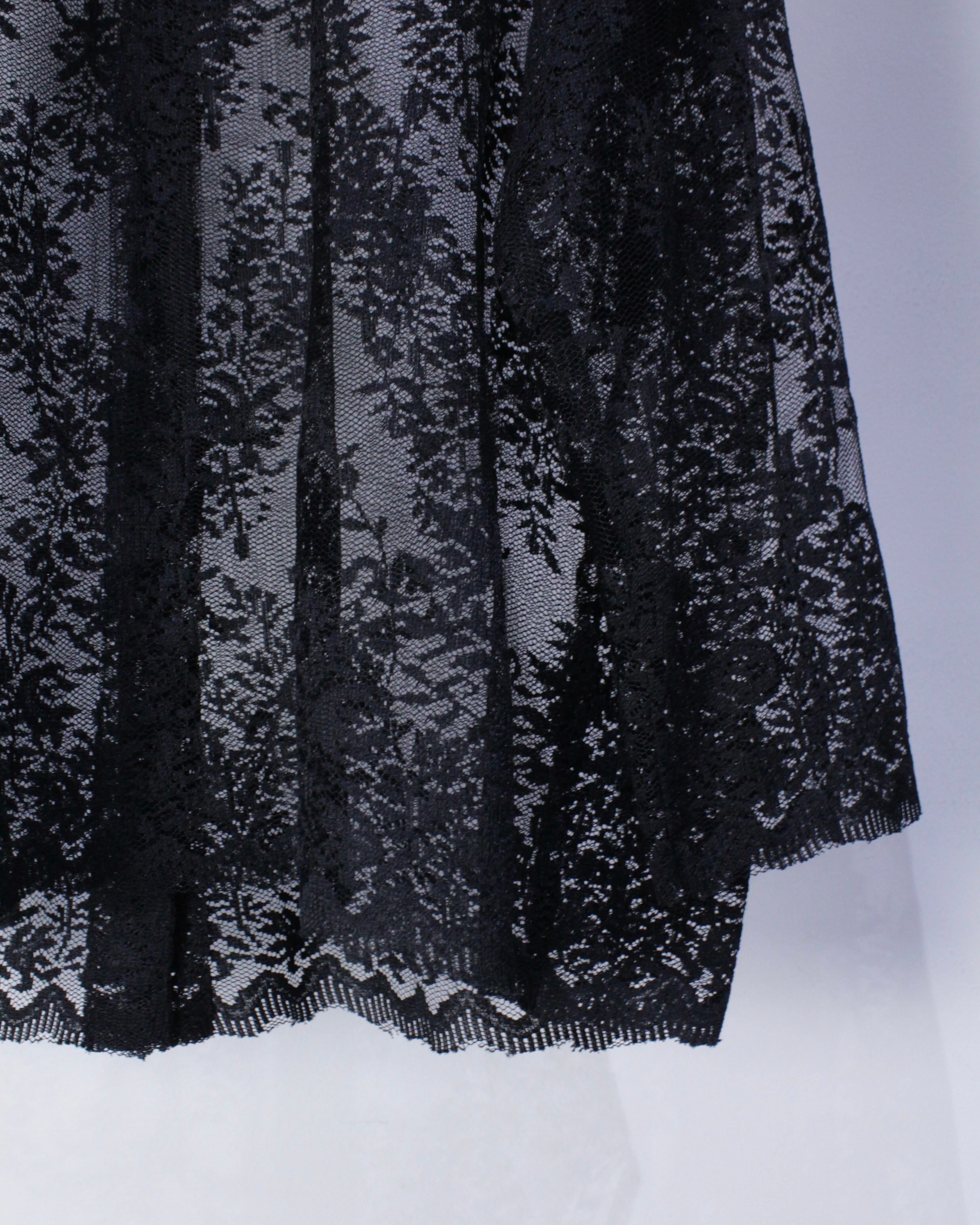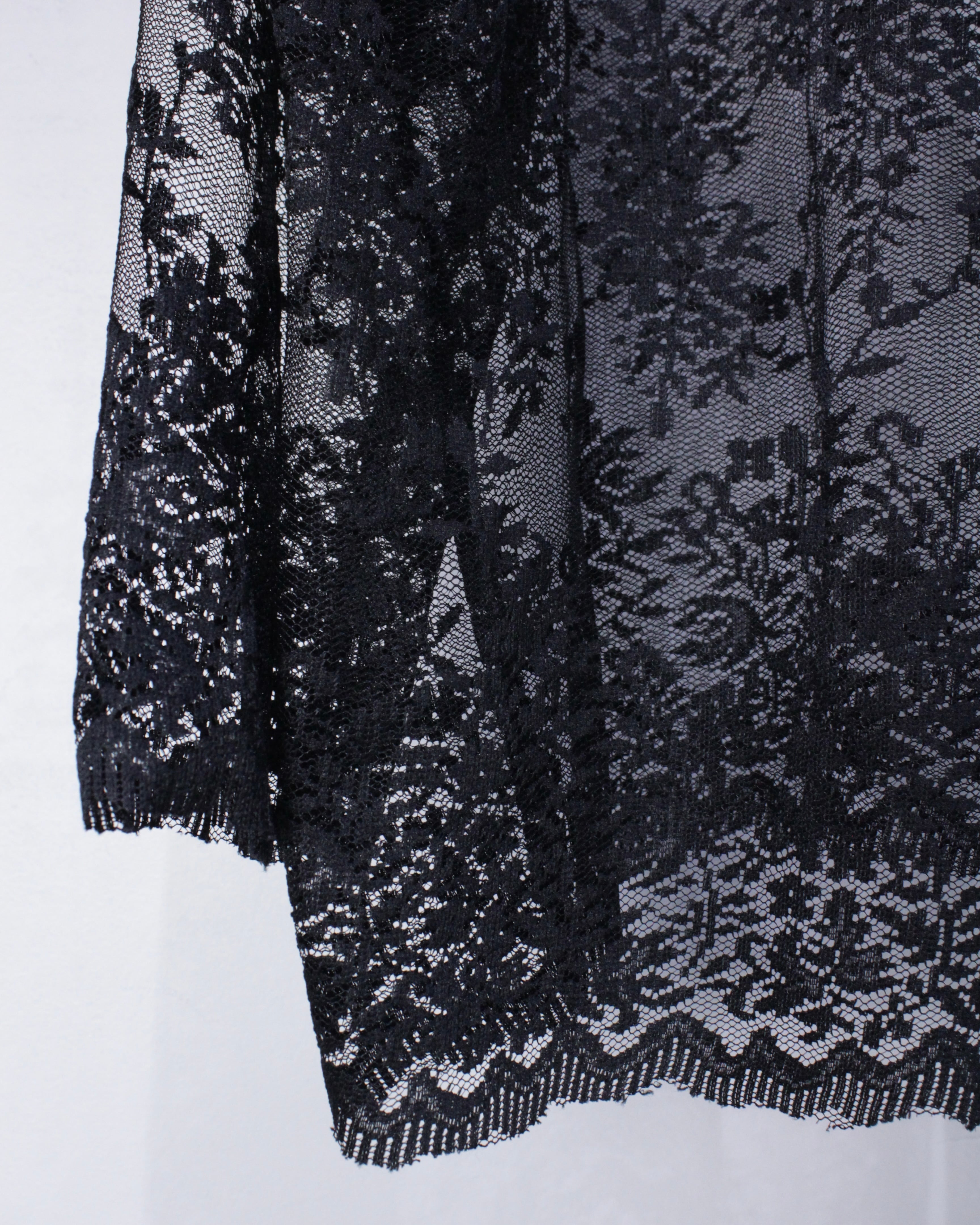 オールブラックのボディながら、レース特有の透け感、立体感のある柄が独特な奥行きを演出。レースの繊細な柄の表情と透け感によって生まれる柔らかな色気のある雰囲気が非常に美しい、、、