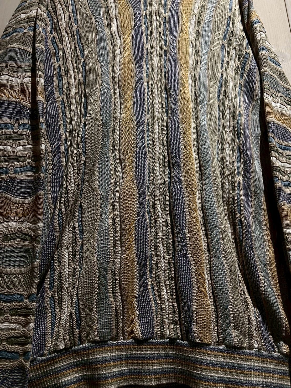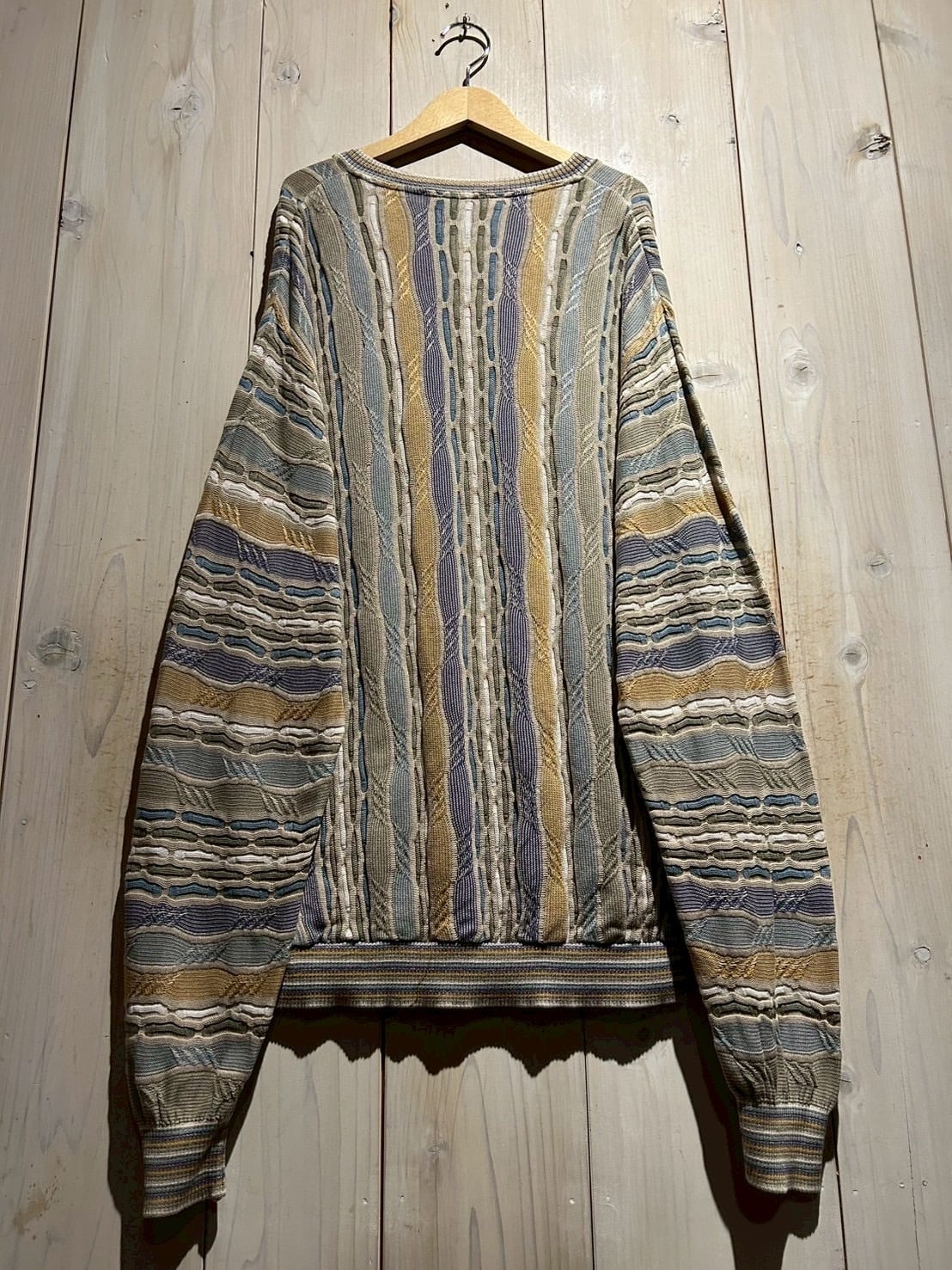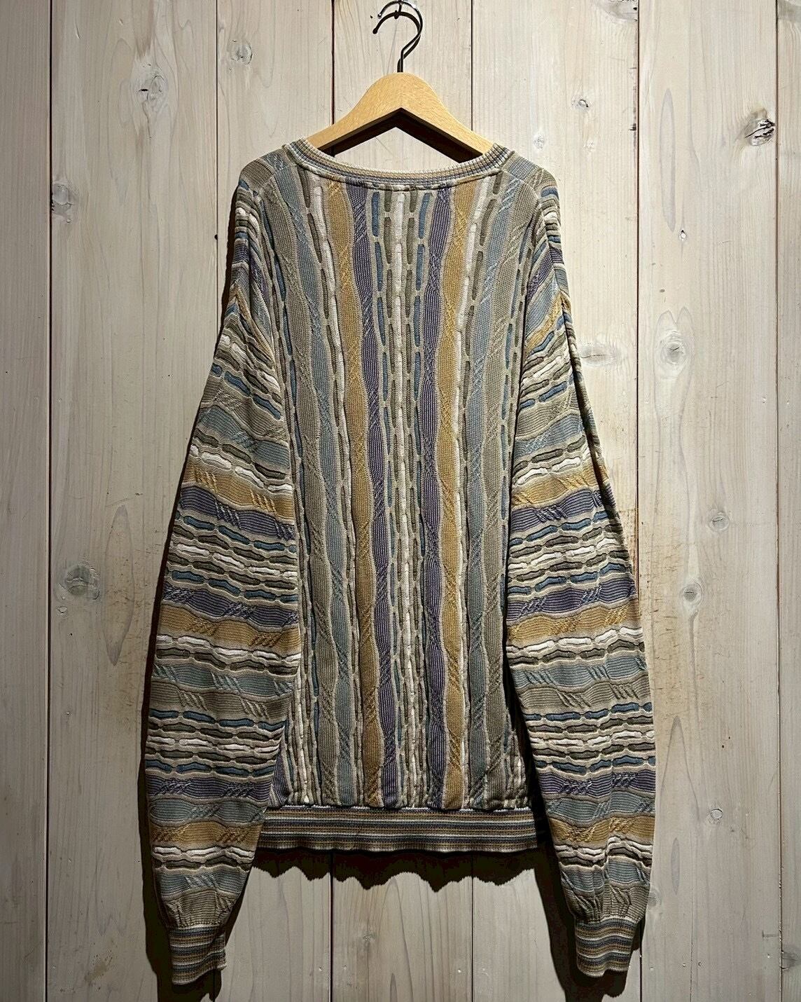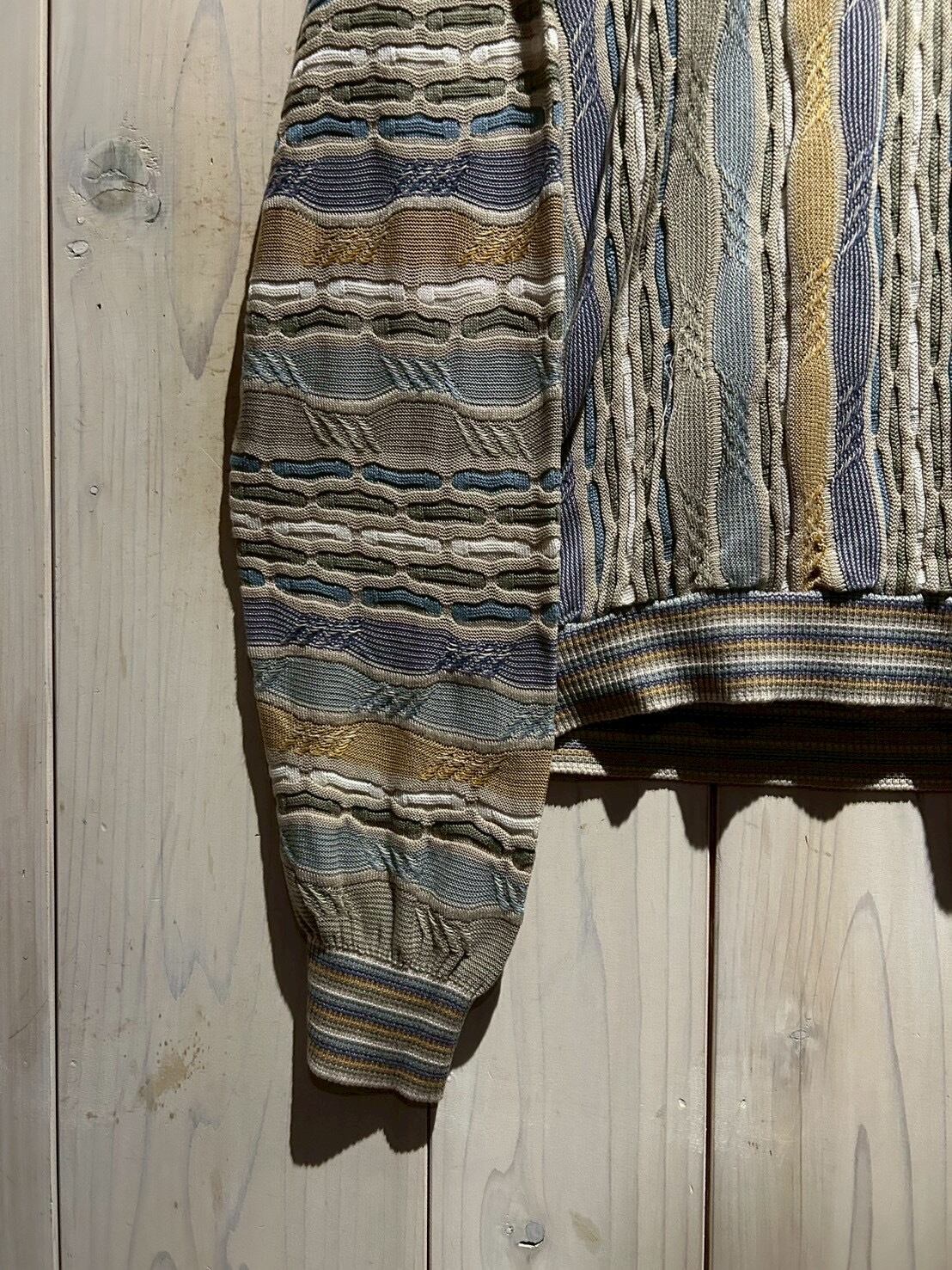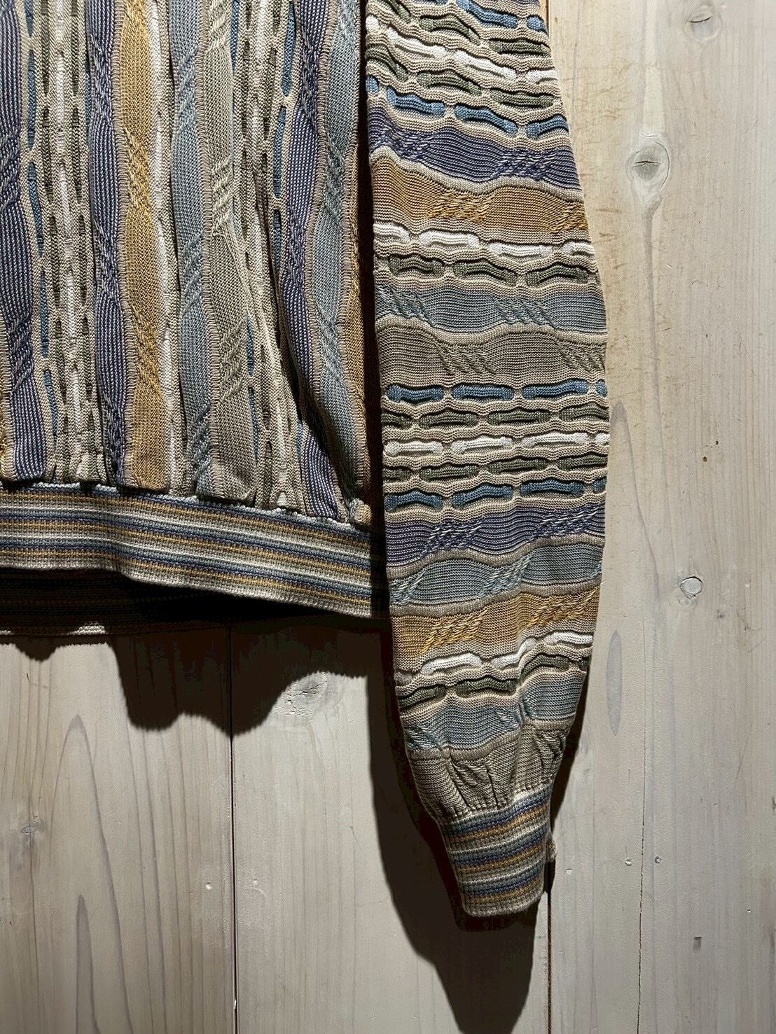 白、ベージュ、カーキ、ブルーの淡いカラーで纏められた逸品。3Dニット特有の美しいうねりが効いたボディは非常に緻密で、ハイクオリティな1着。3Dニットと言えば"COOGI"や"TUNDRA"の二大巨頭を思い浮かべますが、こちらはそれにも劣らない上品な見映えに。パステルカラーが洒落てますね◎