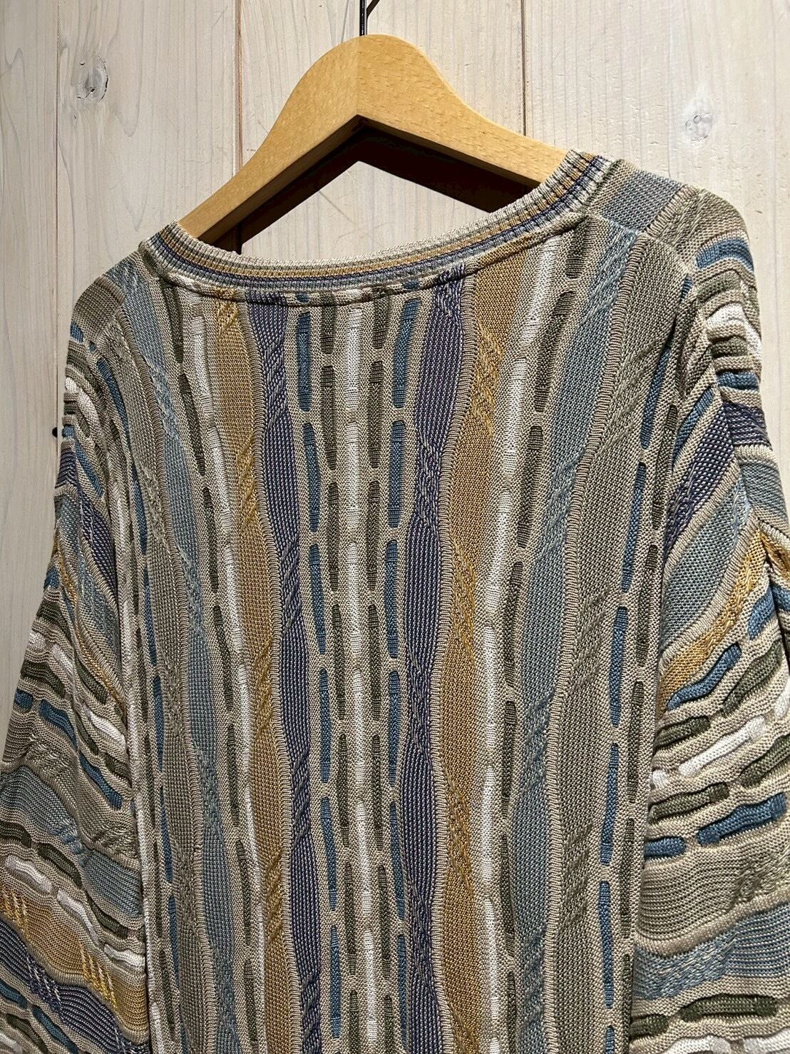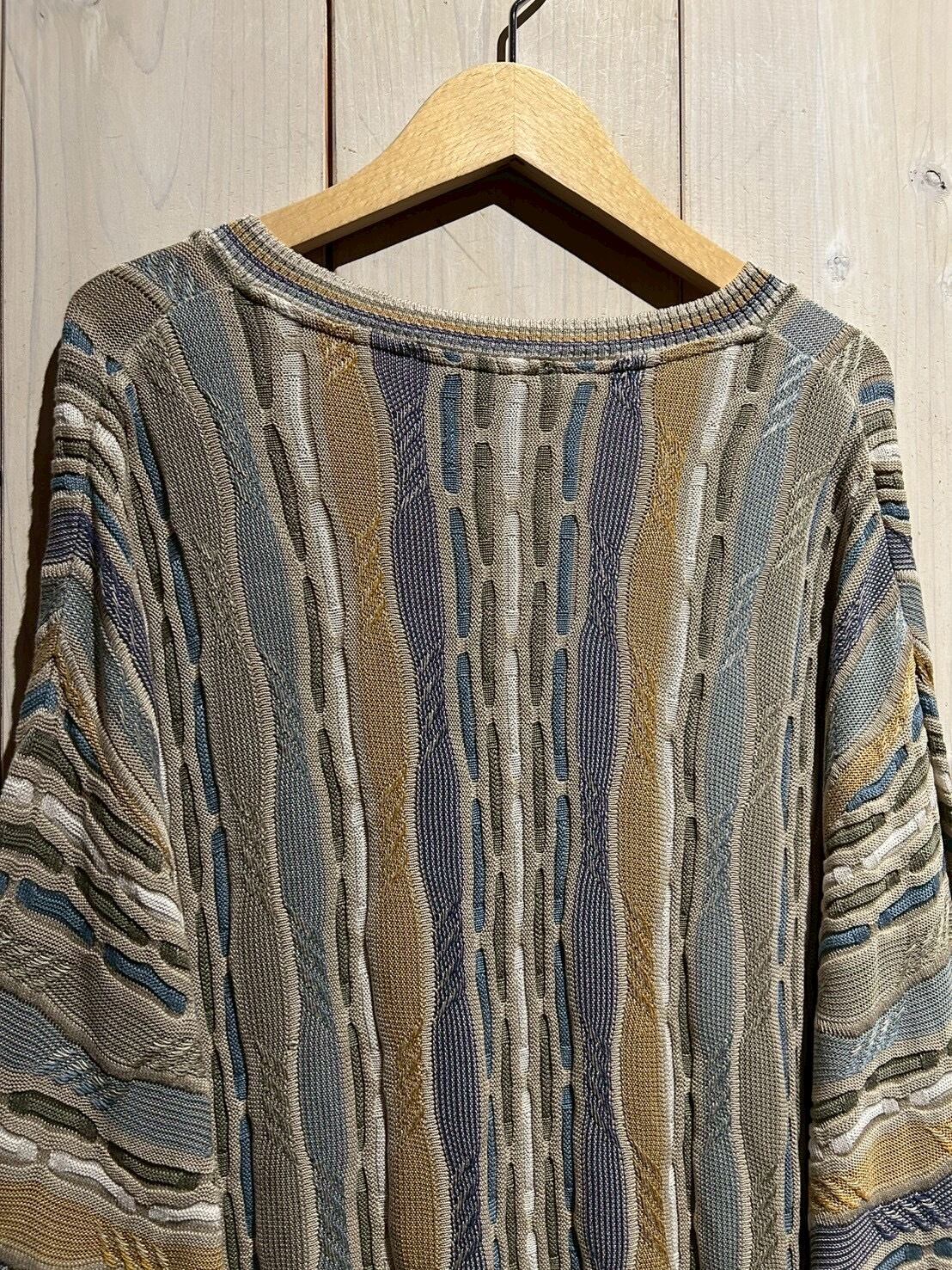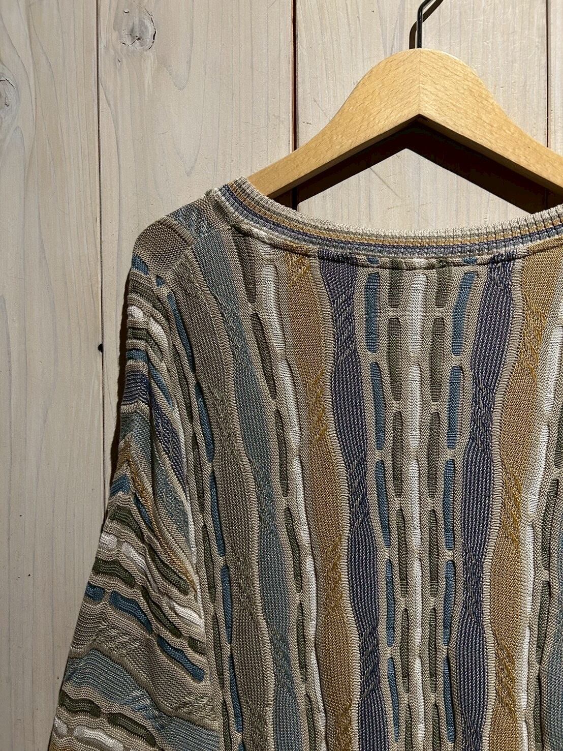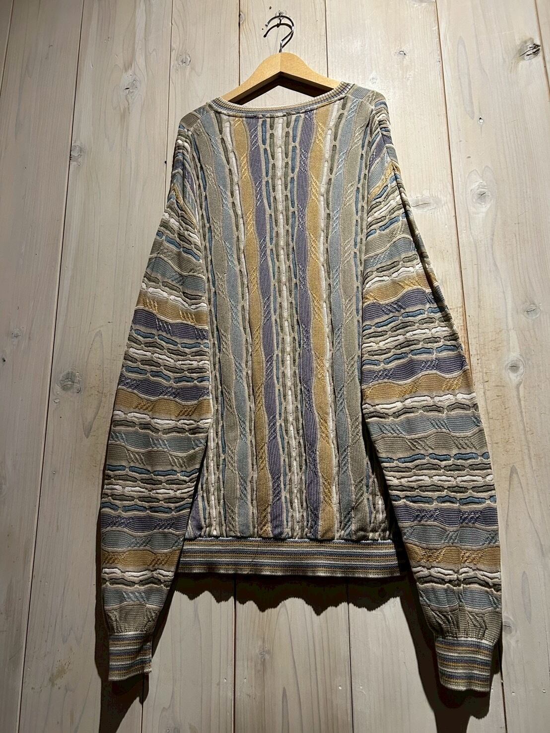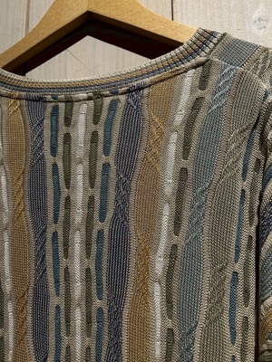 白、ベージュ、カーキ、ブルーの淡いカラーで纏められた逸品。3Dニット特有の美しいうねりが効いたボディは非常に緻密で、ハイクオリティな1着。3Dニットと言えば"COOGI"や"TUNDRA"の二大巨頭を思い浮かべますが、こちらはそれにも劣らない上品な見映えに。パステルカラーが洒落てますね◎
