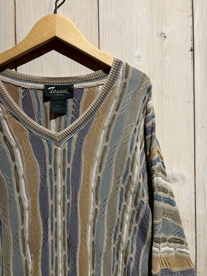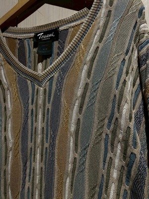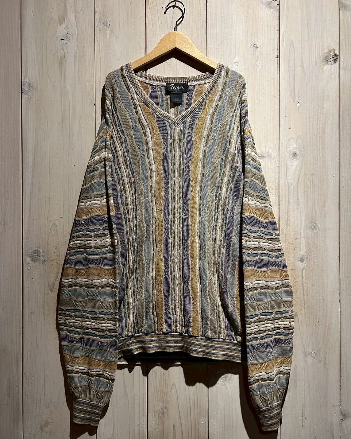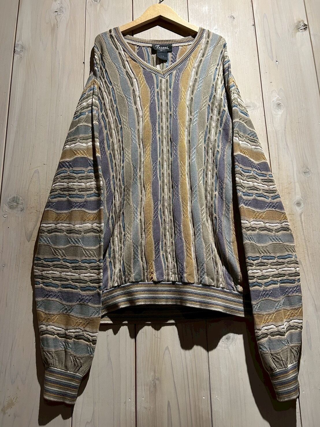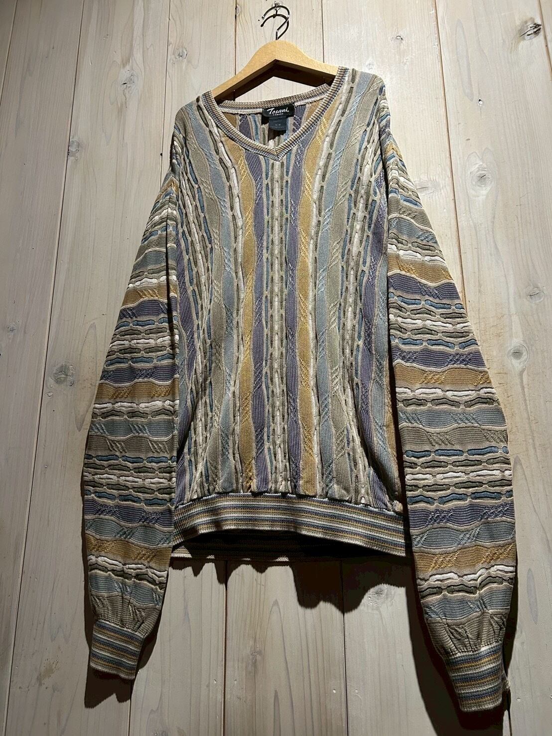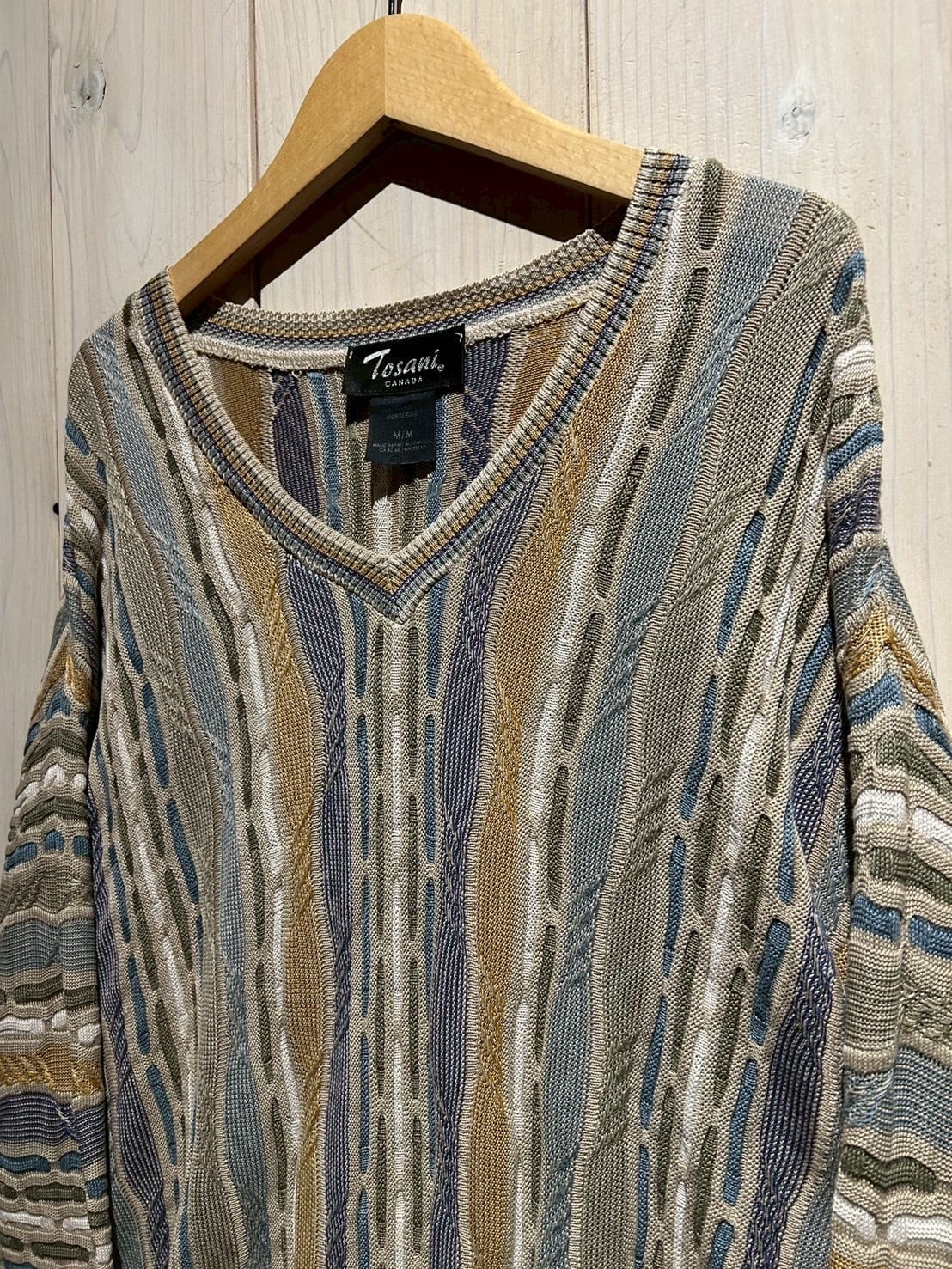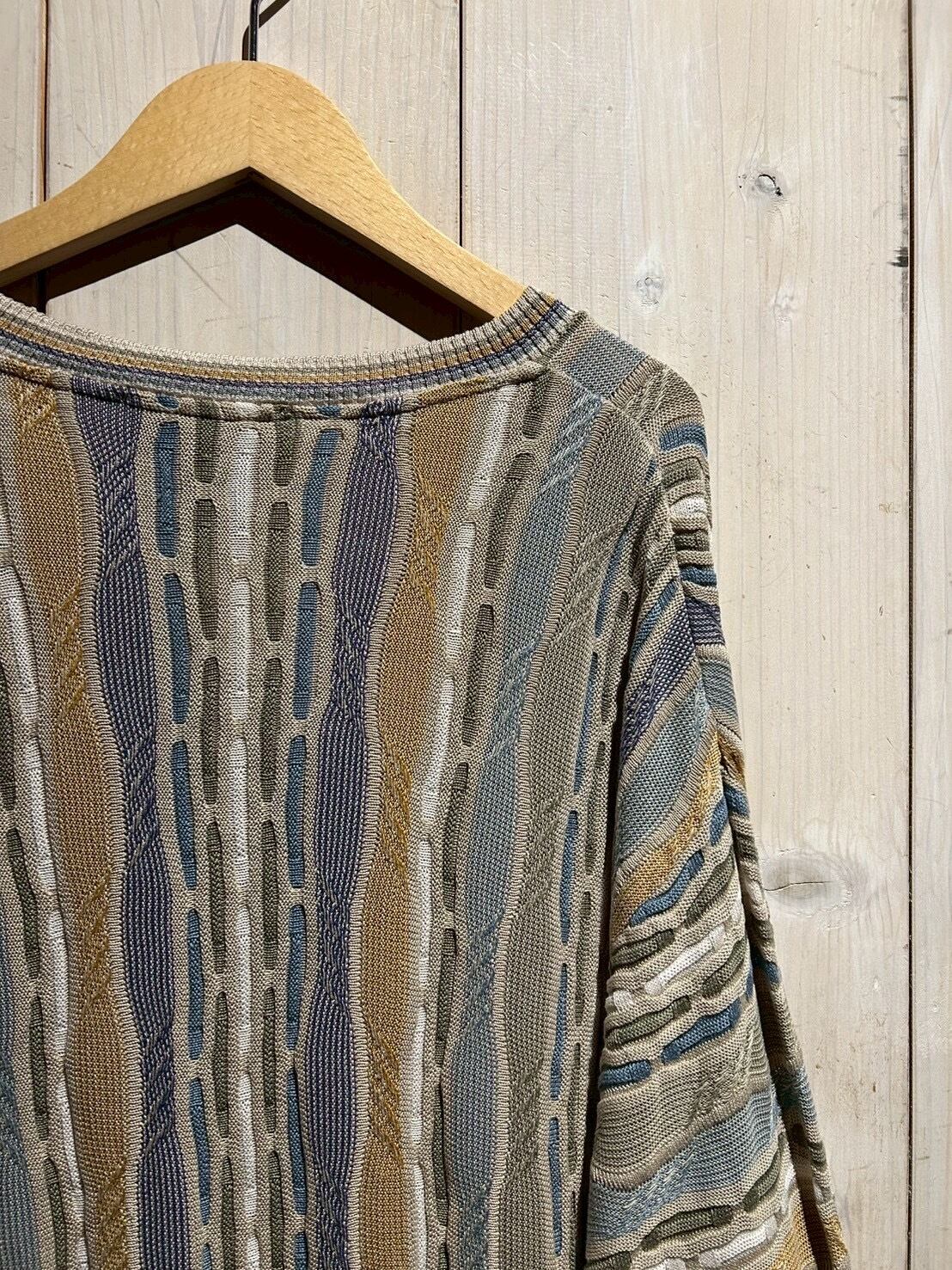 白、ベージュ、カーキ、ブルーの淡いカラーで纏められた逸品。3Dニット特有の美しいうねりが効いたボディは非常に緻密で、ハイクオリティな1着。3Dニットと言えば"COOGI"や"TUNDRA"の二大巨頭を思い浮かべますが、こちらはそれにも劣らない上品な見映えに。パステルカラーが洒落てますね◎