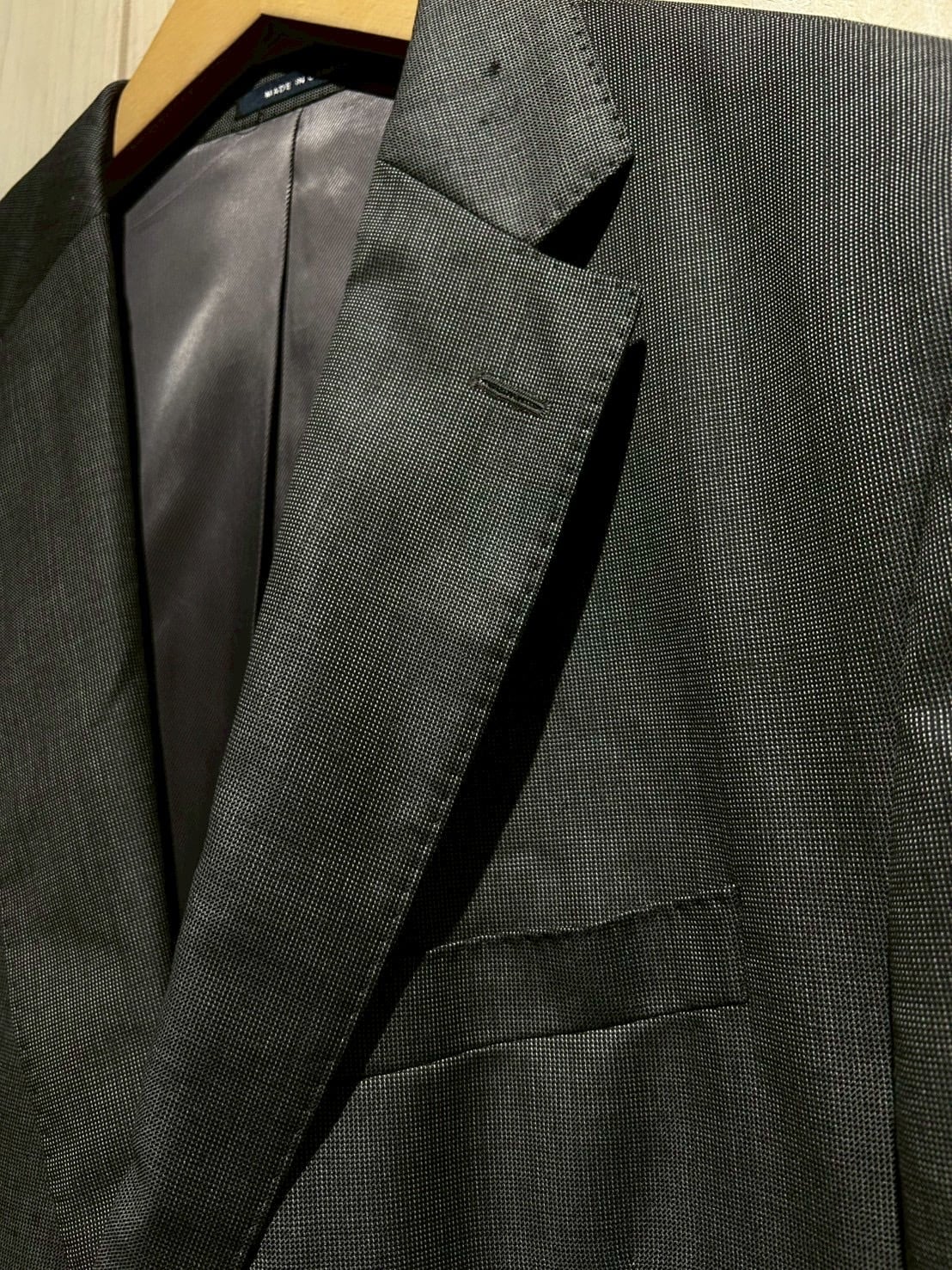 2つボタンのシングルブレスト、左胸、両サイドにポケットを配し、高級感を引き立てる洗練されたデザイン。