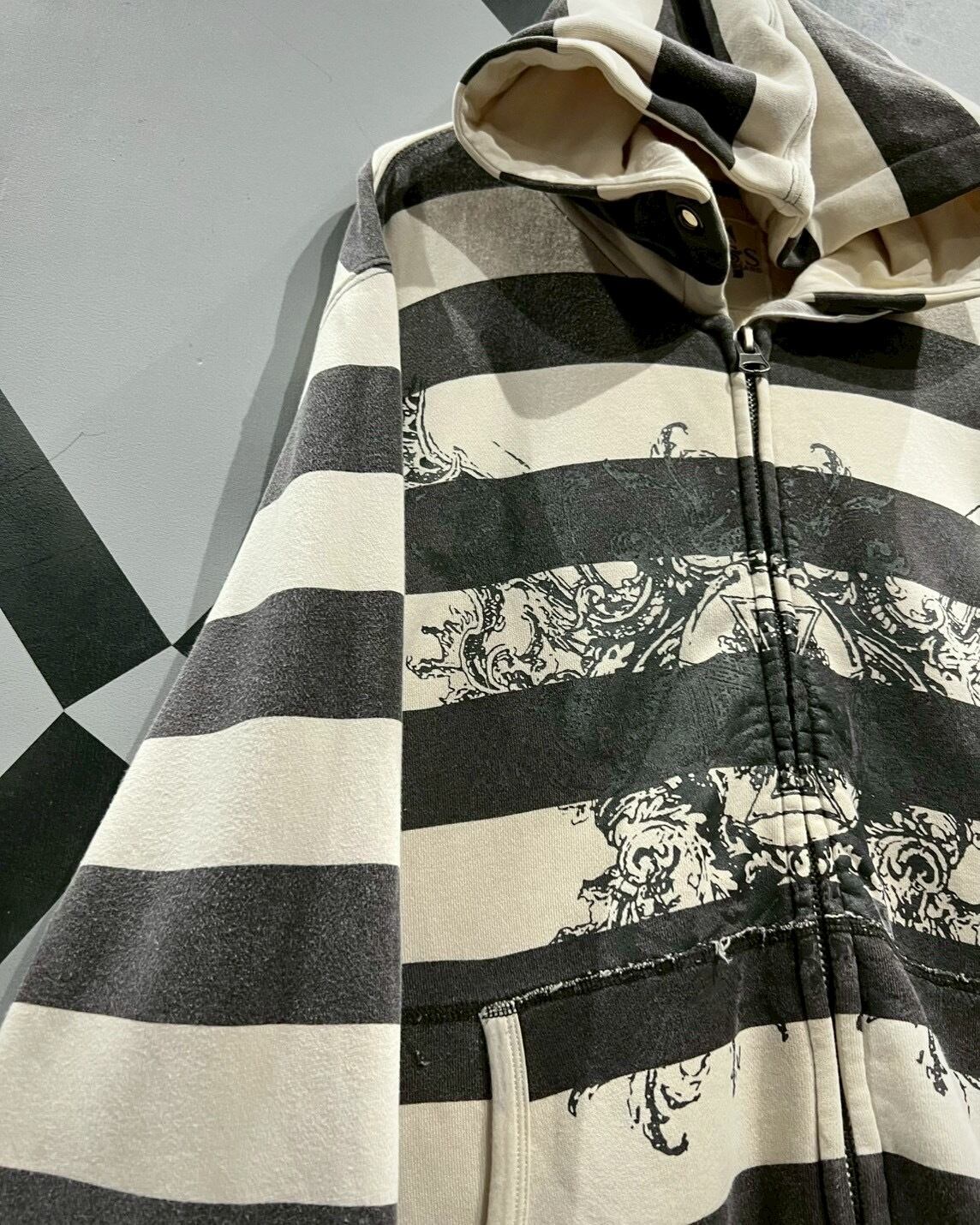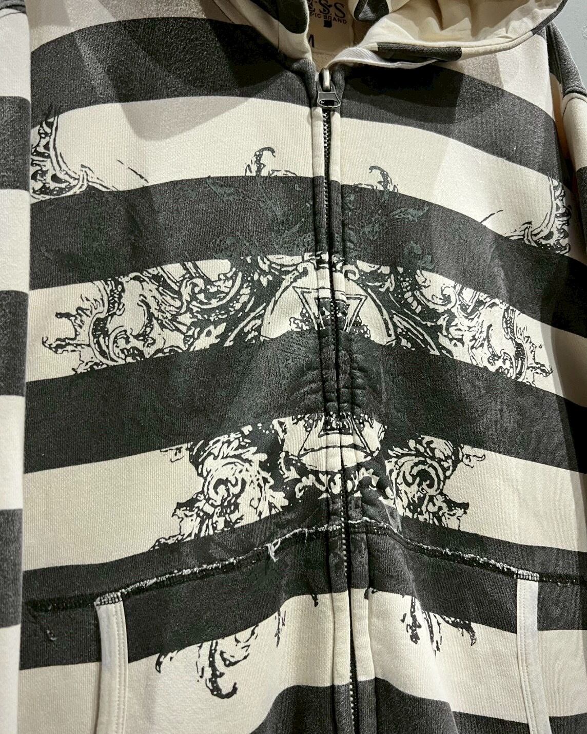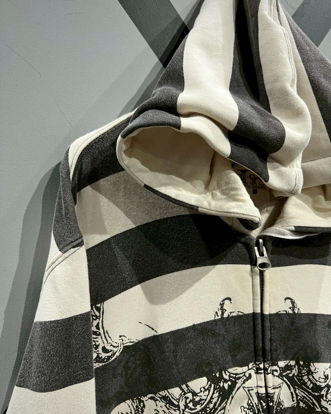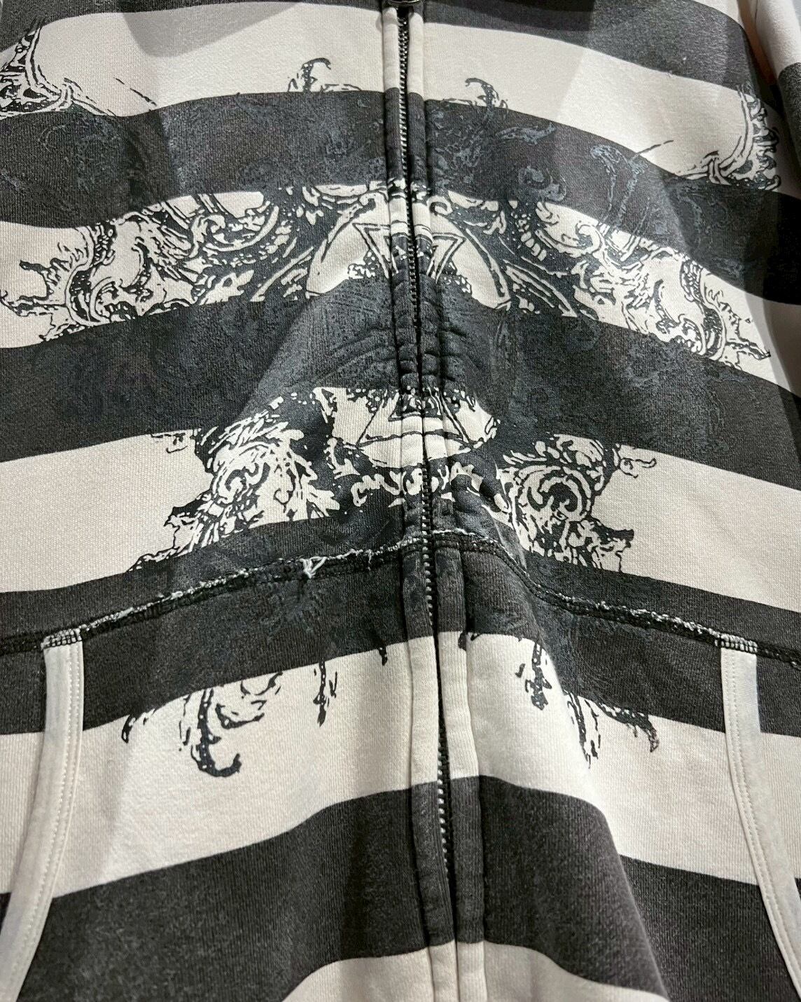 オフホワイトとブラックのボーダーに、ゴシックなデザインを載せたジップアップフーディ。