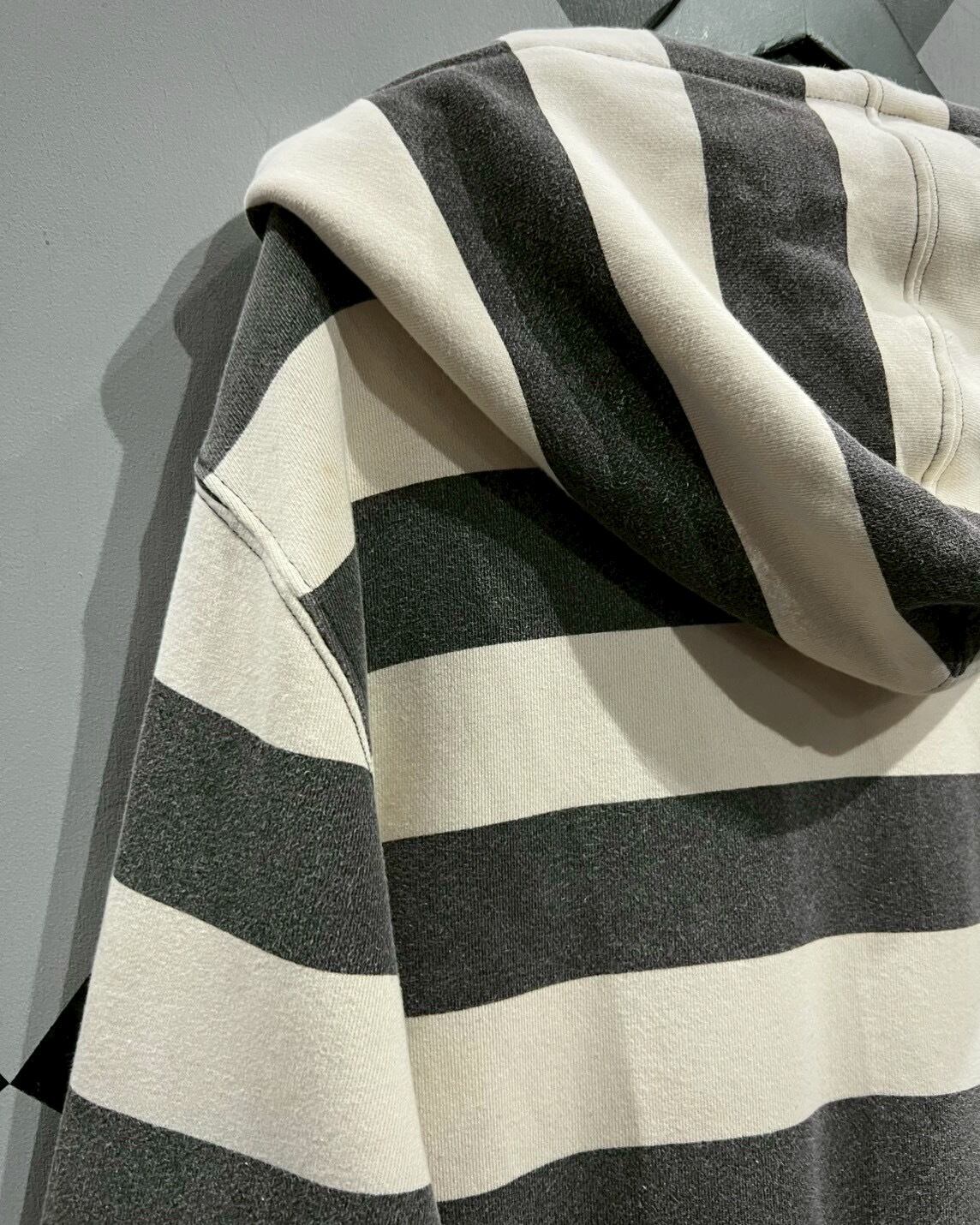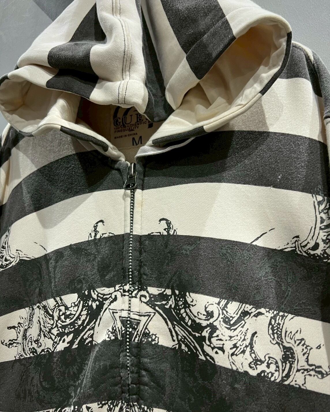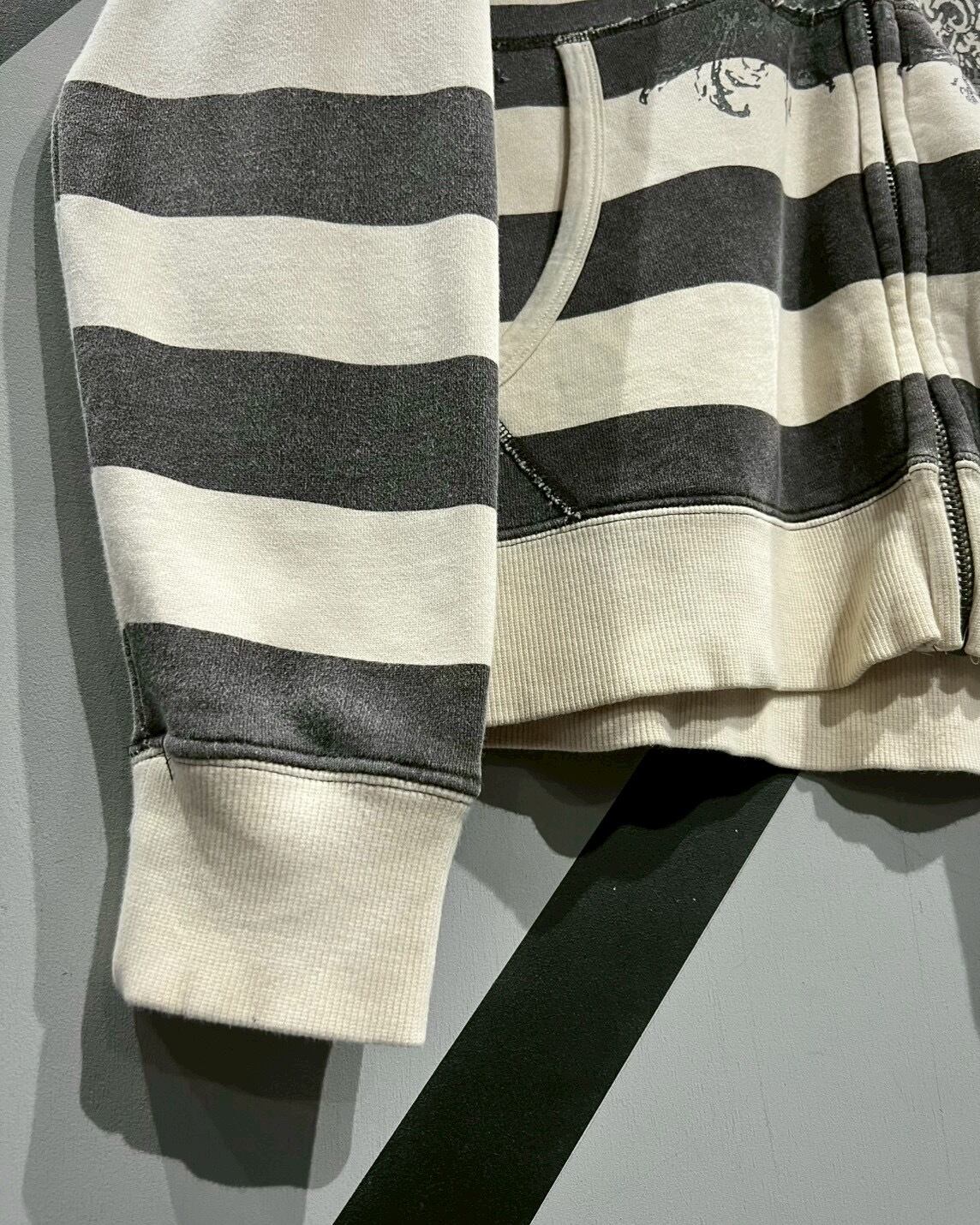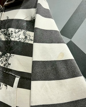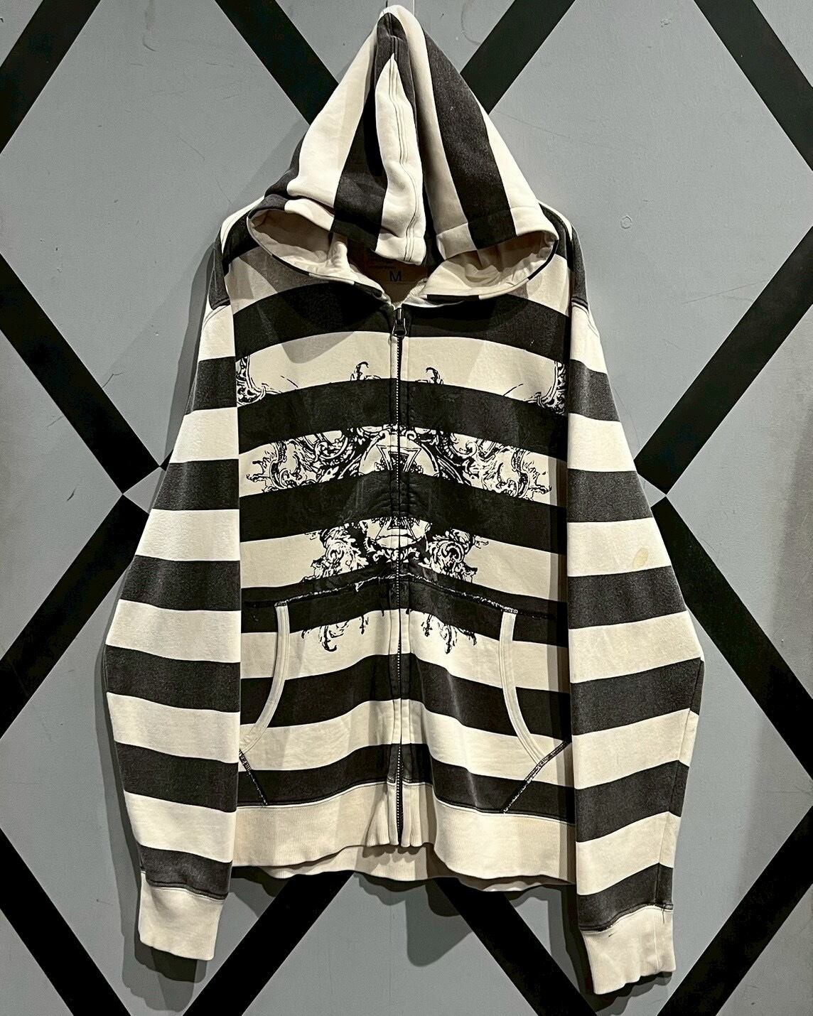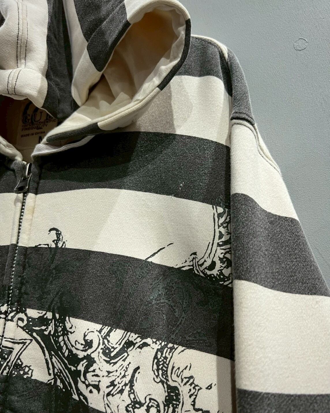 オフホワイトとブラックのボーダーに、ゴシックなデザインを載せたジップアップフーディ。
