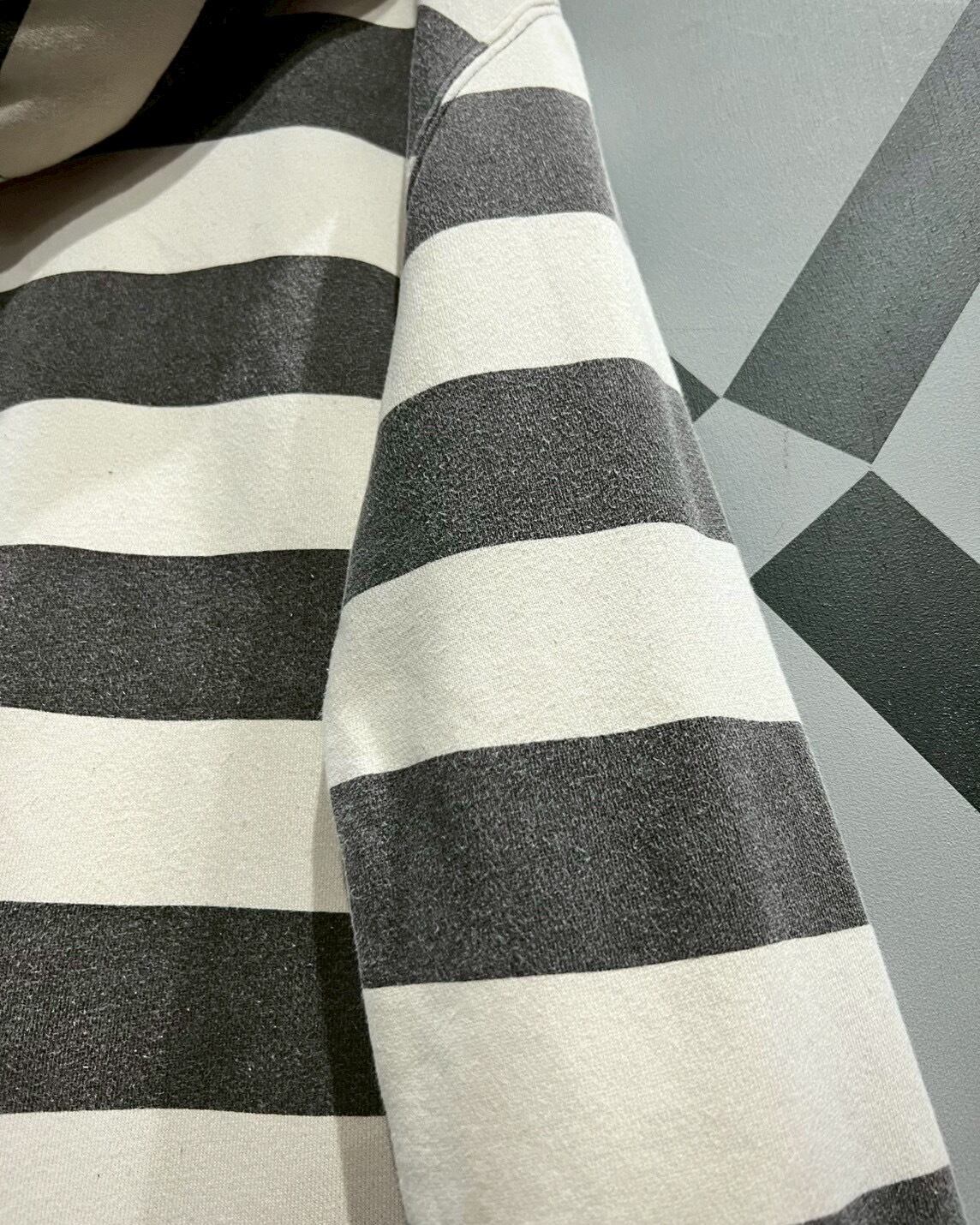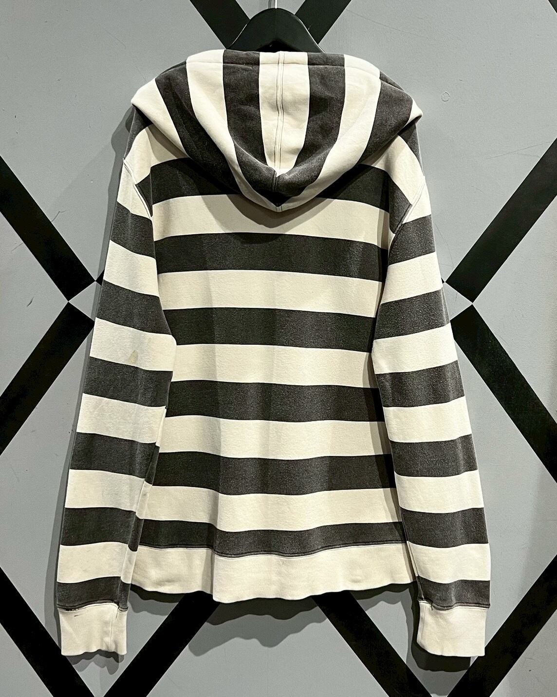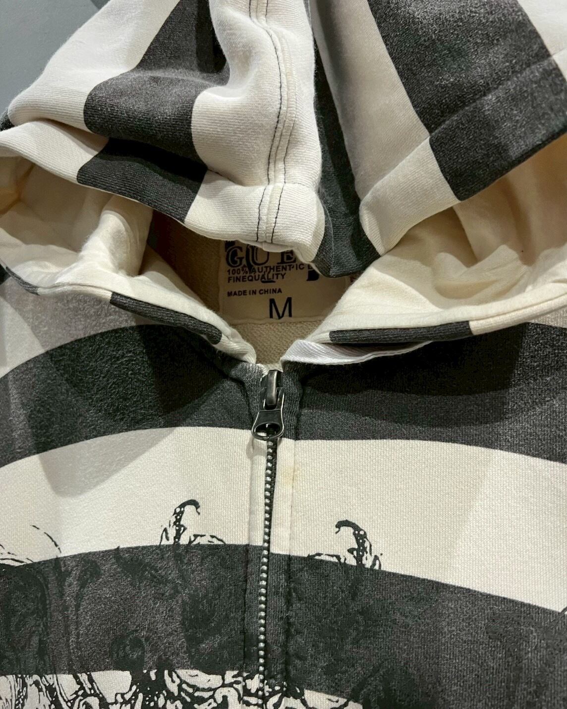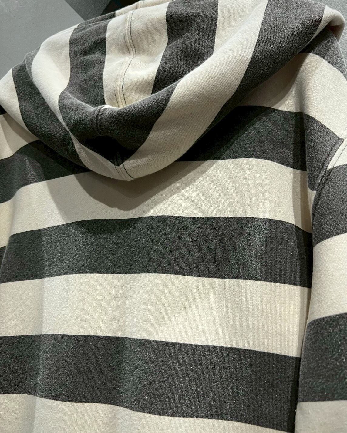 オフホワイトとブラックのボーダーに、ゴシックなデザインを載せたジップアップフーディ。
