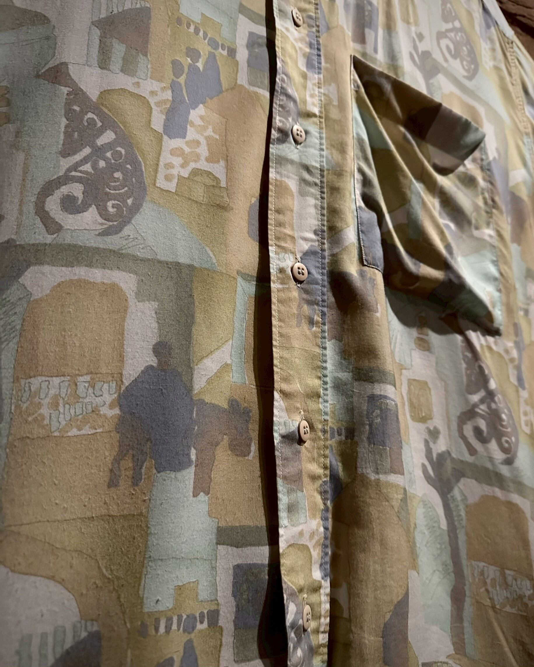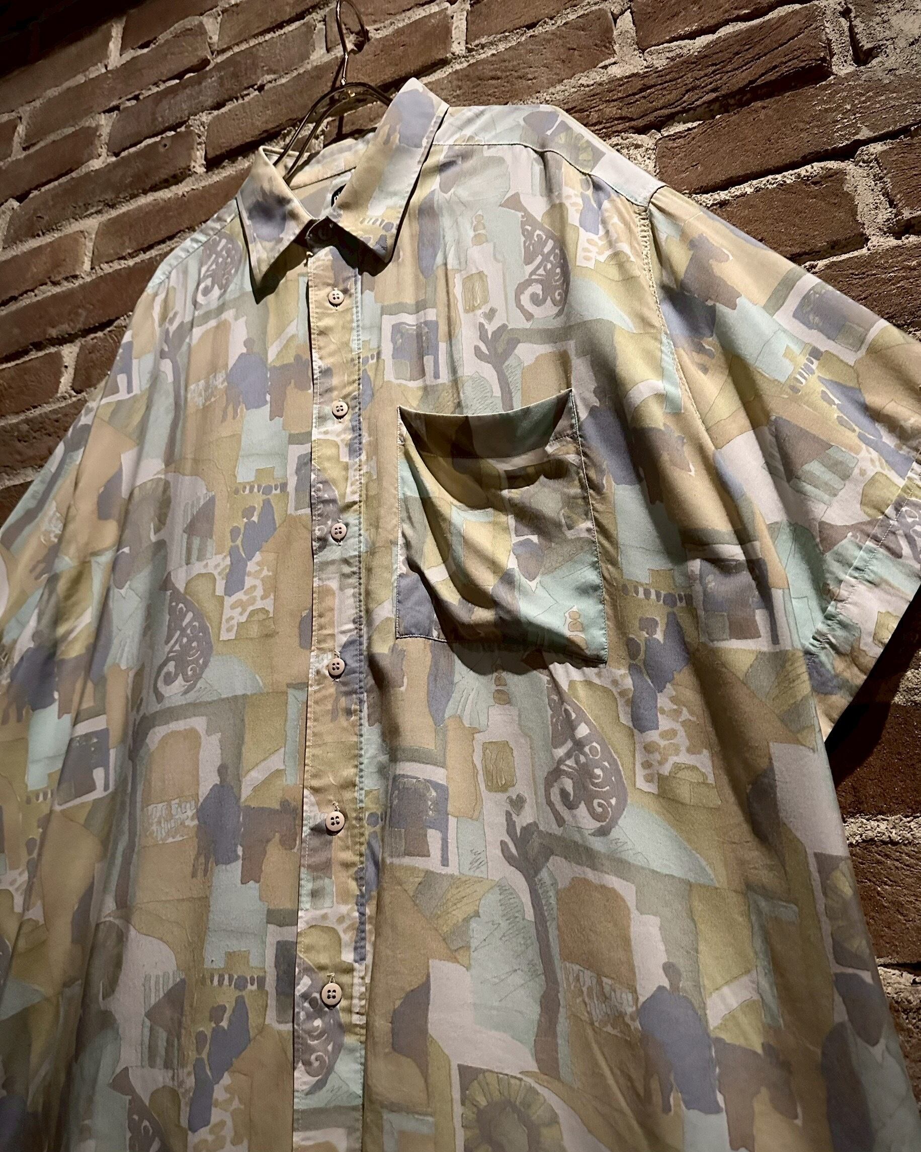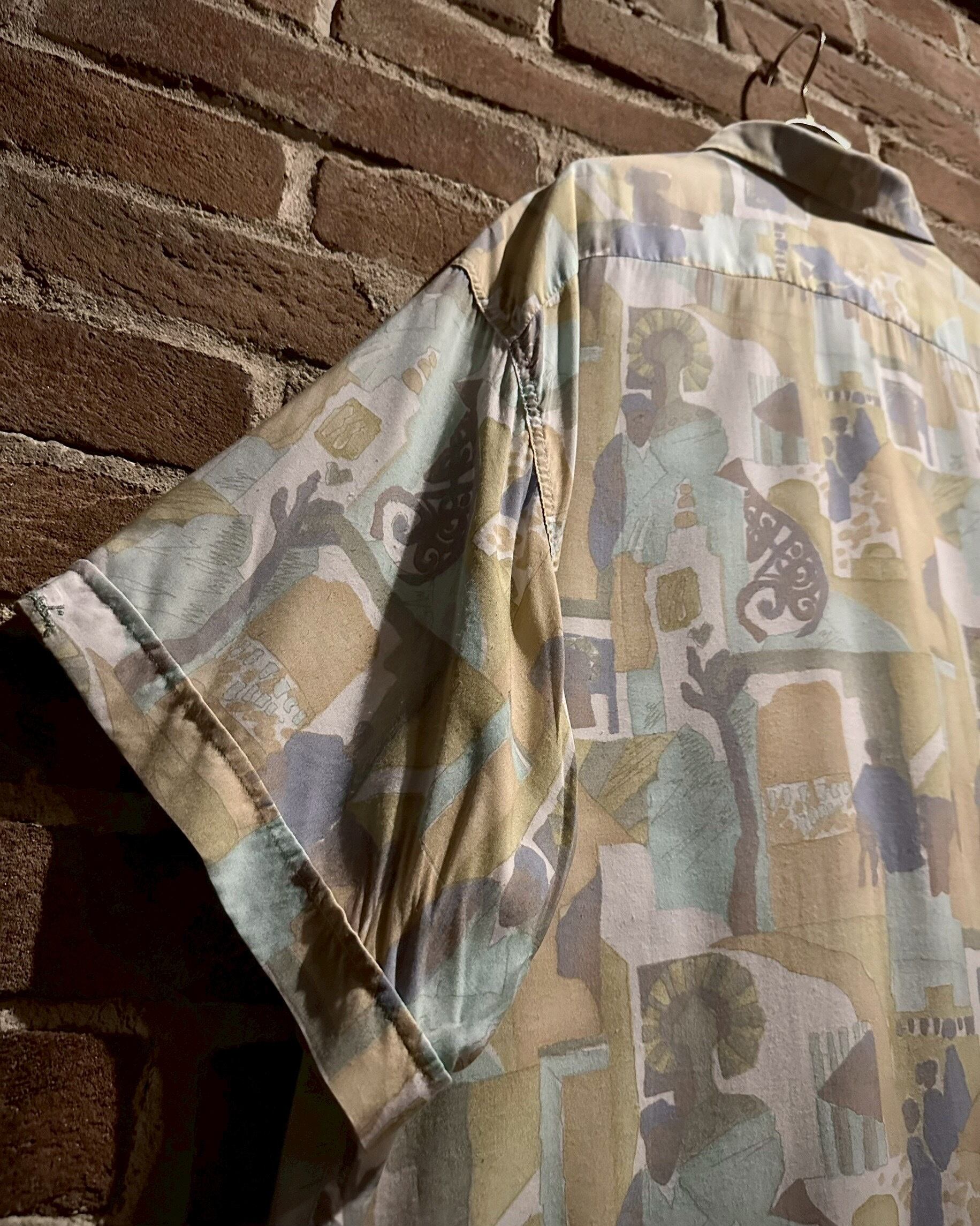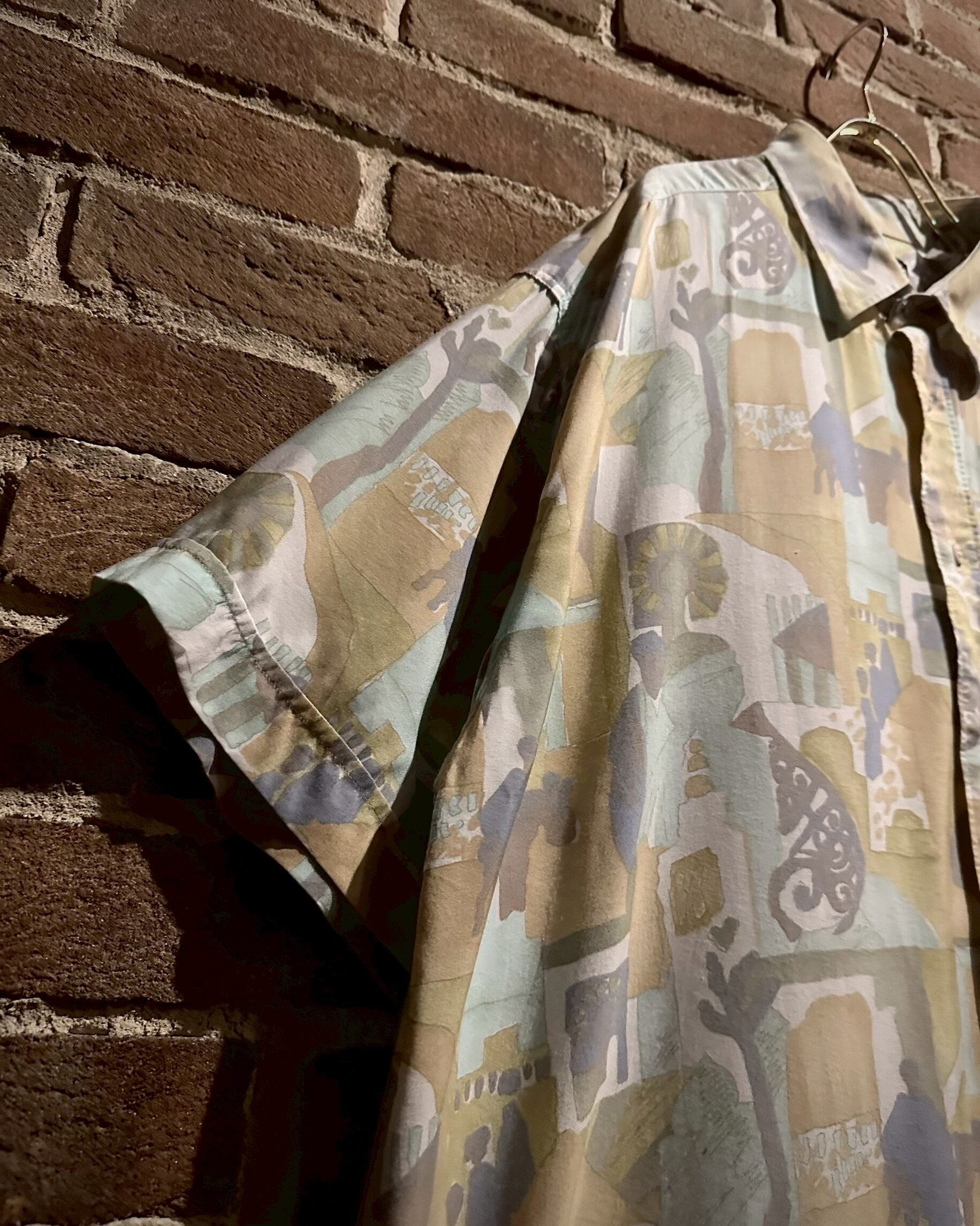 ハリのある柔らかなビスコースを用いたボディに、パステルカラーで街並みや人々を描いた半袖シャツ。