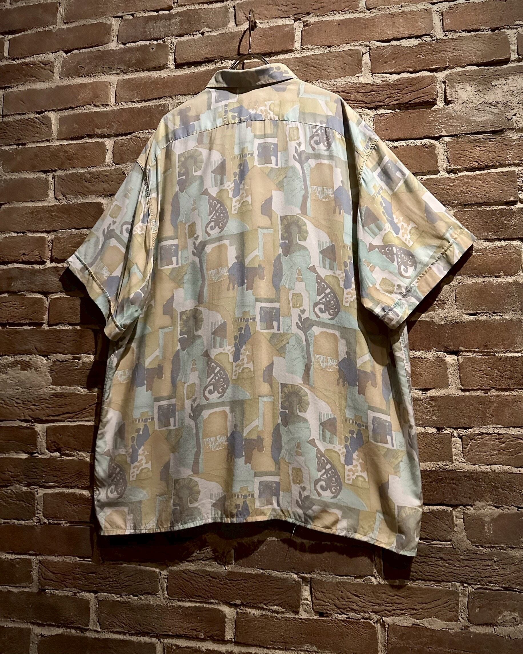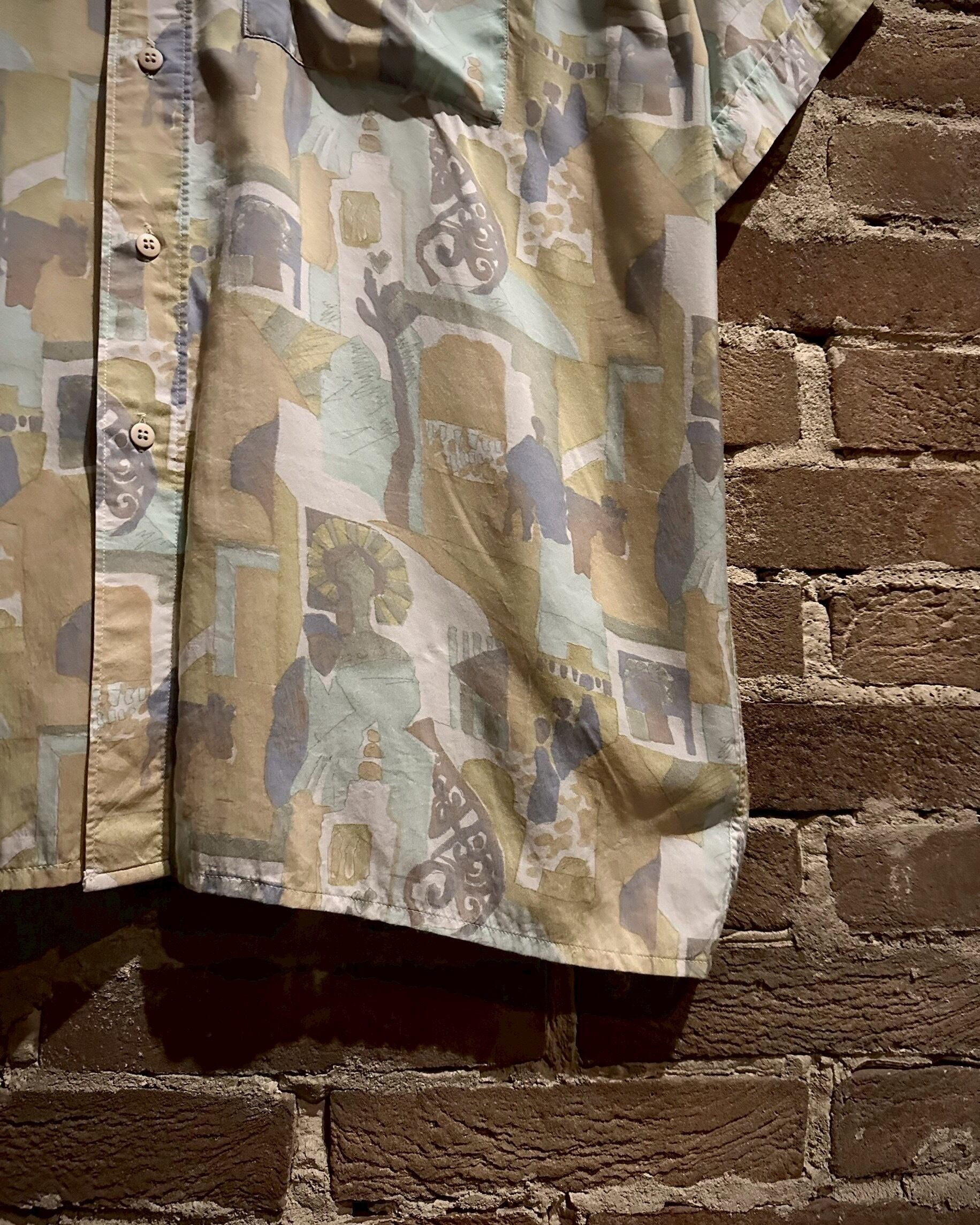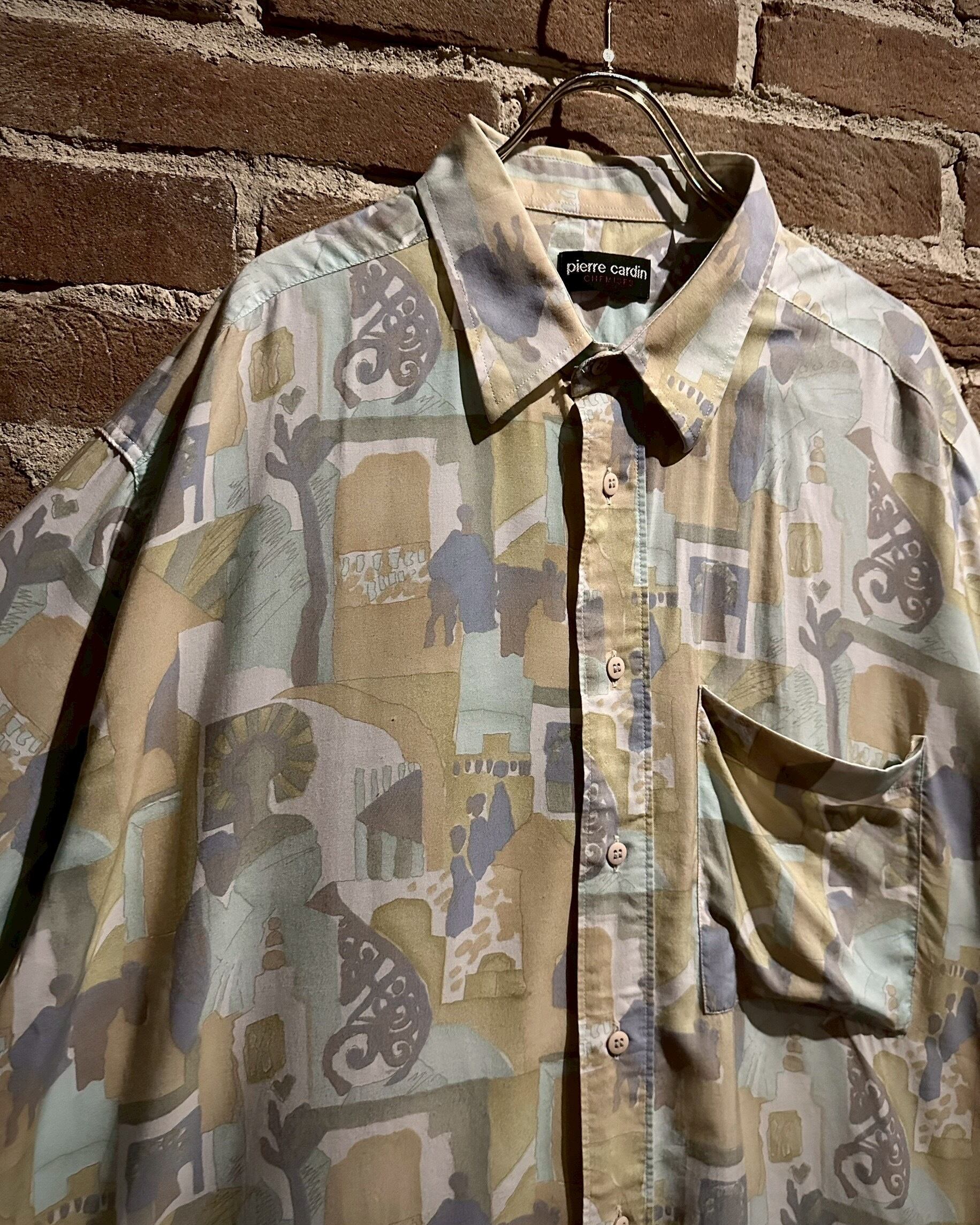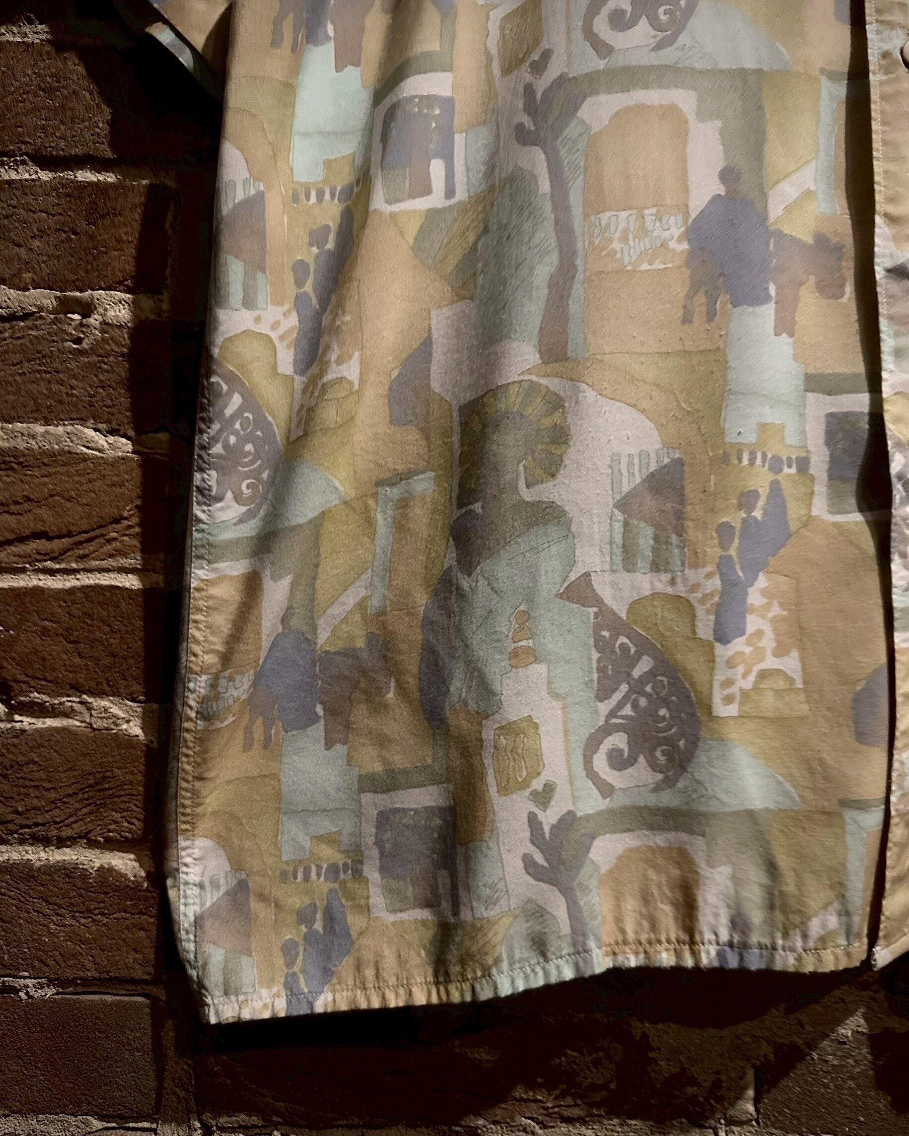 ハリのある柔らかなビスコースを用いたボディに、パステルカラーで街並みや人々を描いた半袖シャツ。