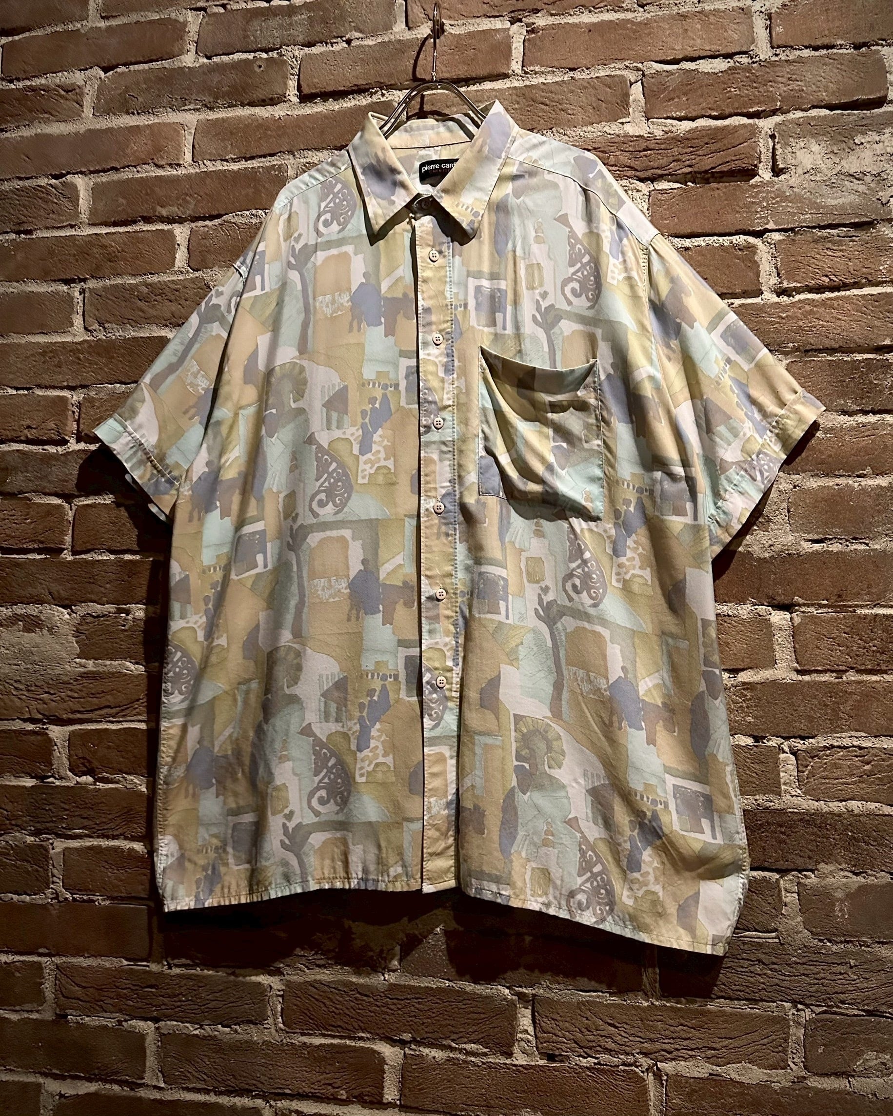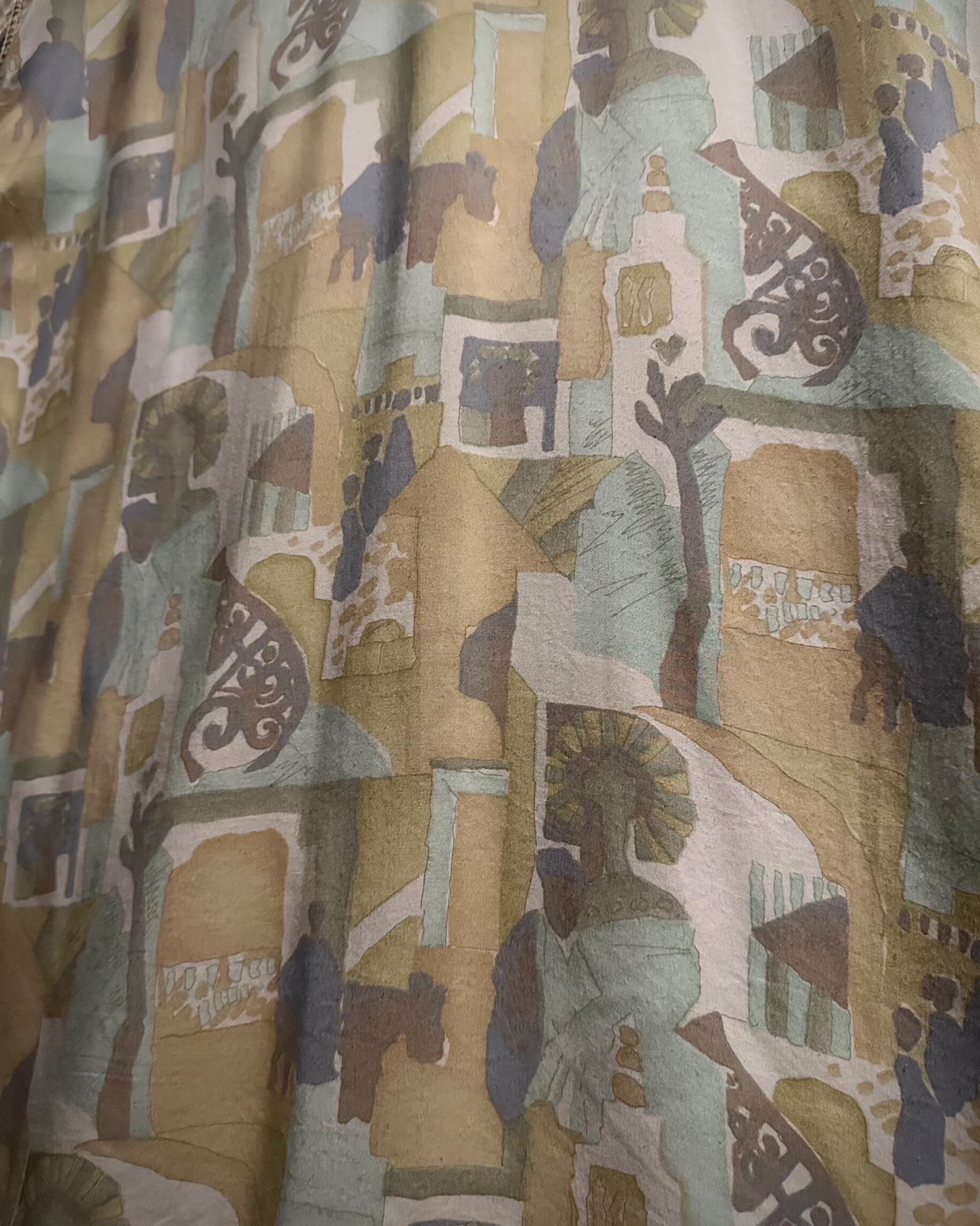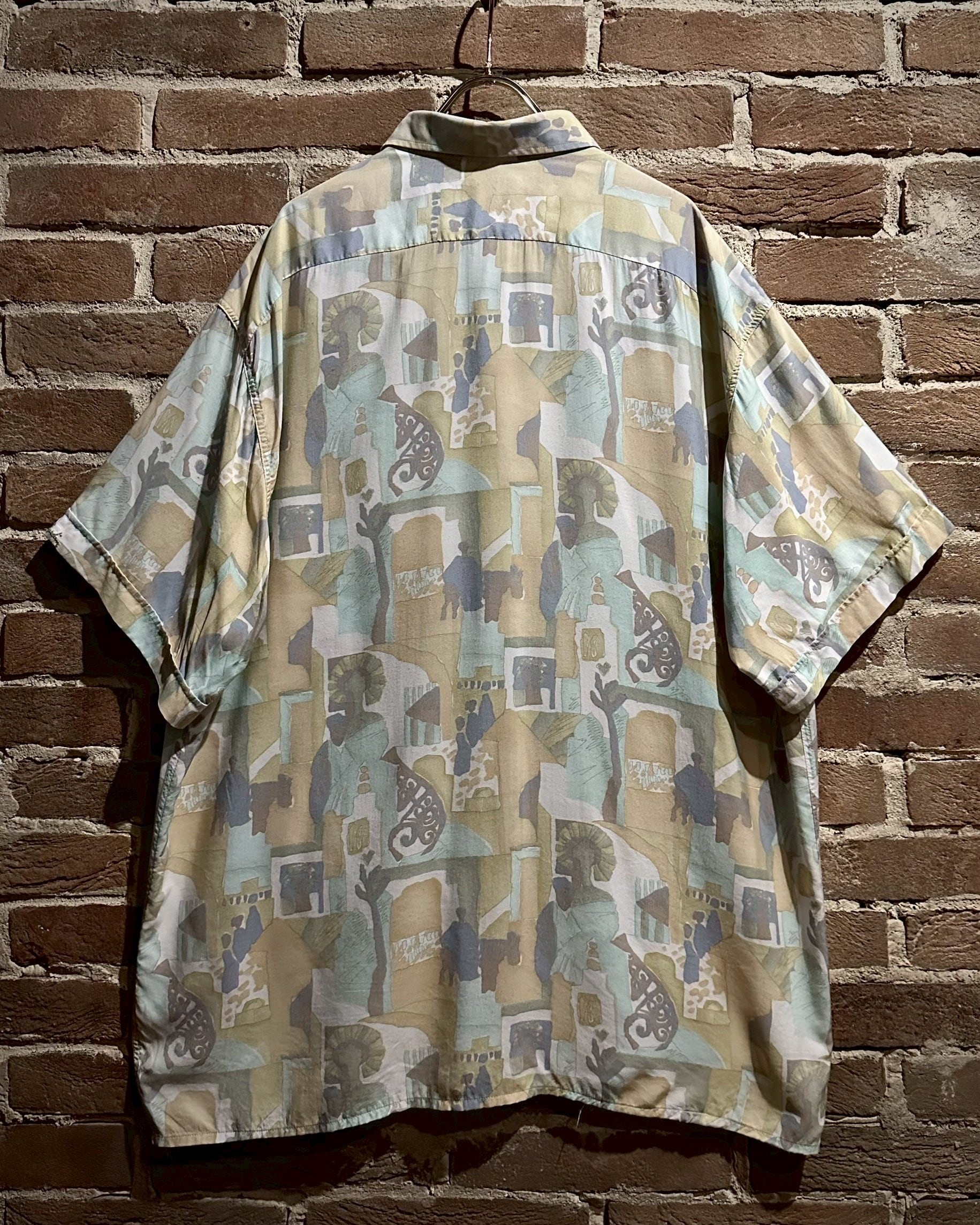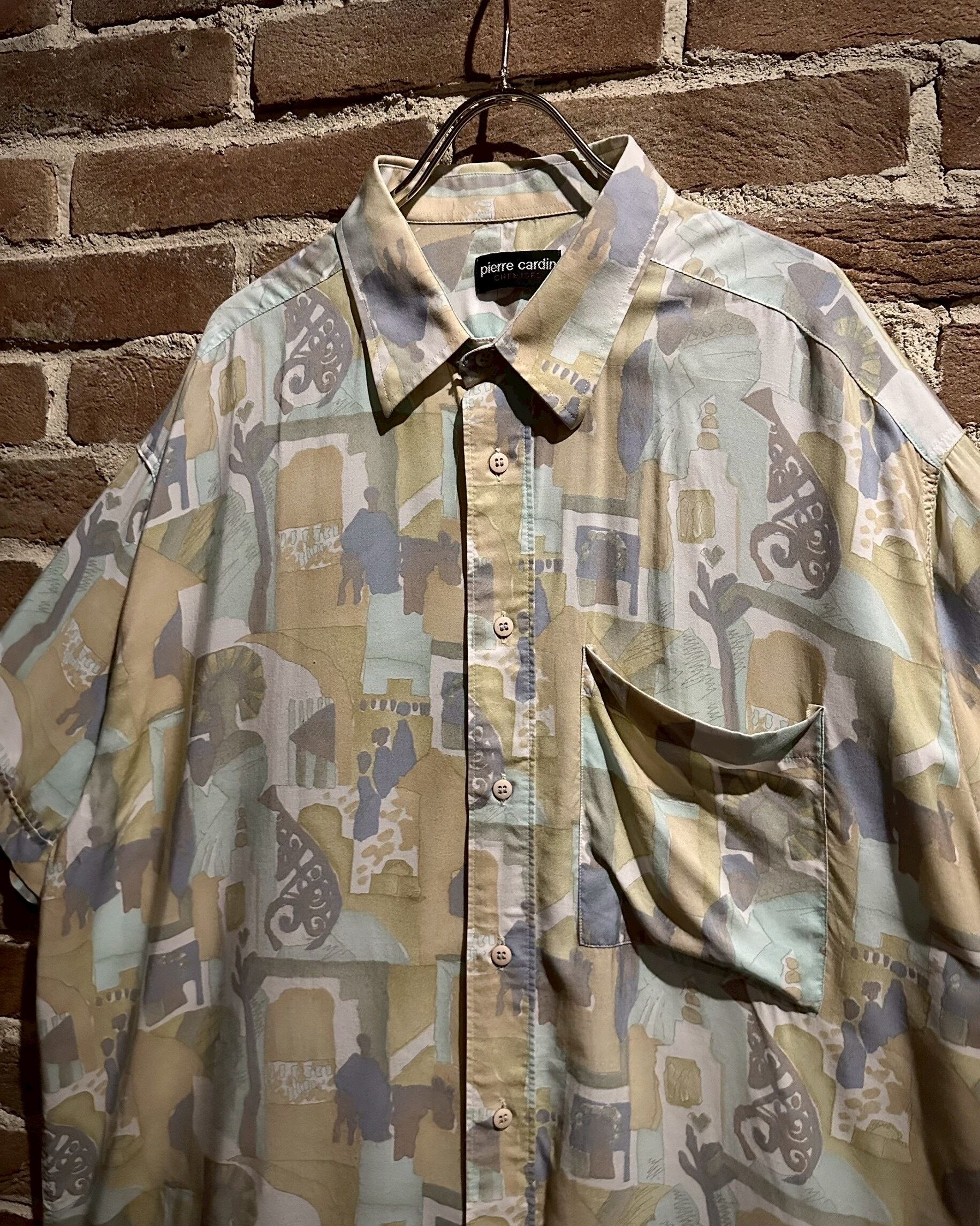 ハリのある柔らかなビスコースを用いたボディに、パステルカラーで街並みや人々を描いた半袖シャツ。