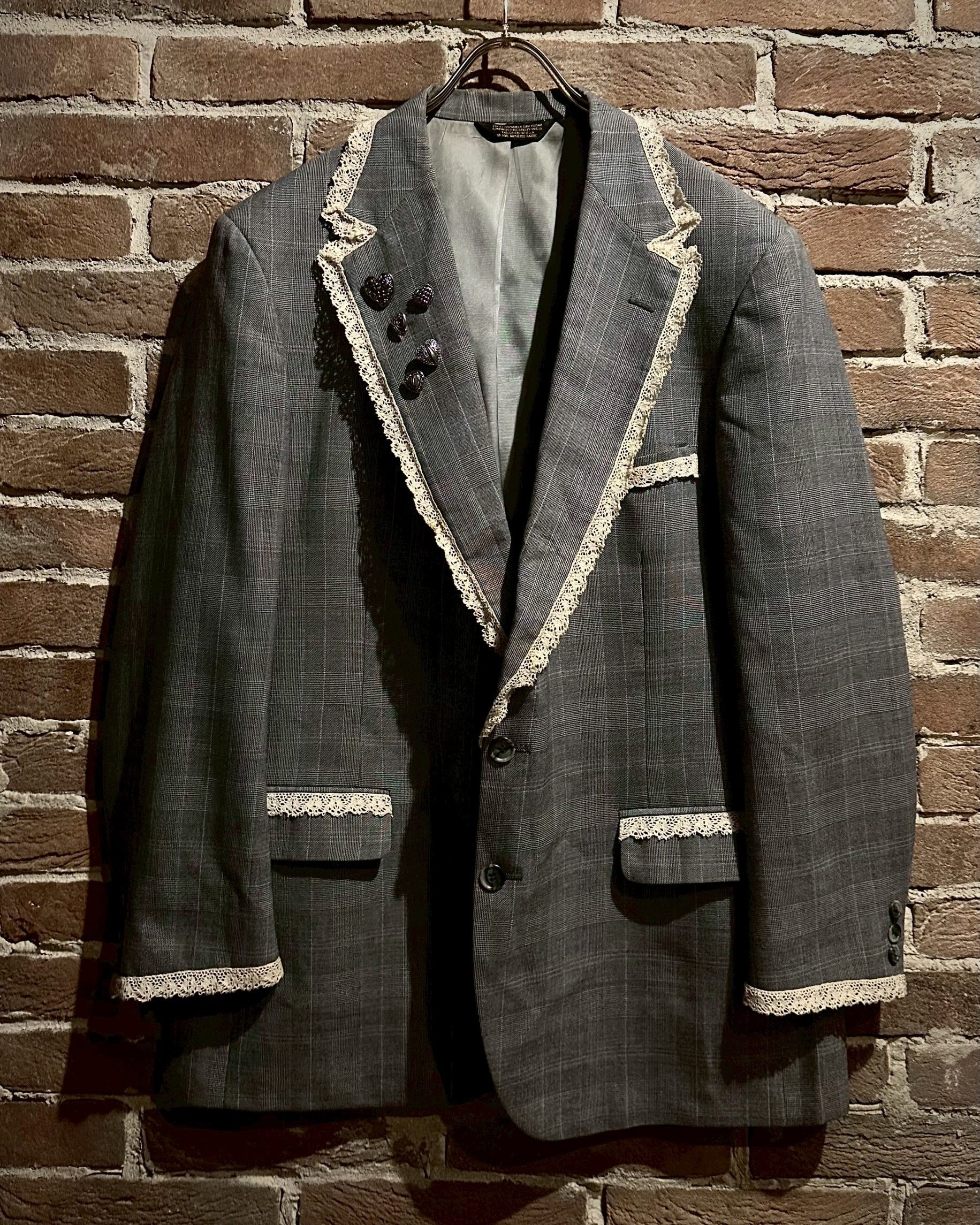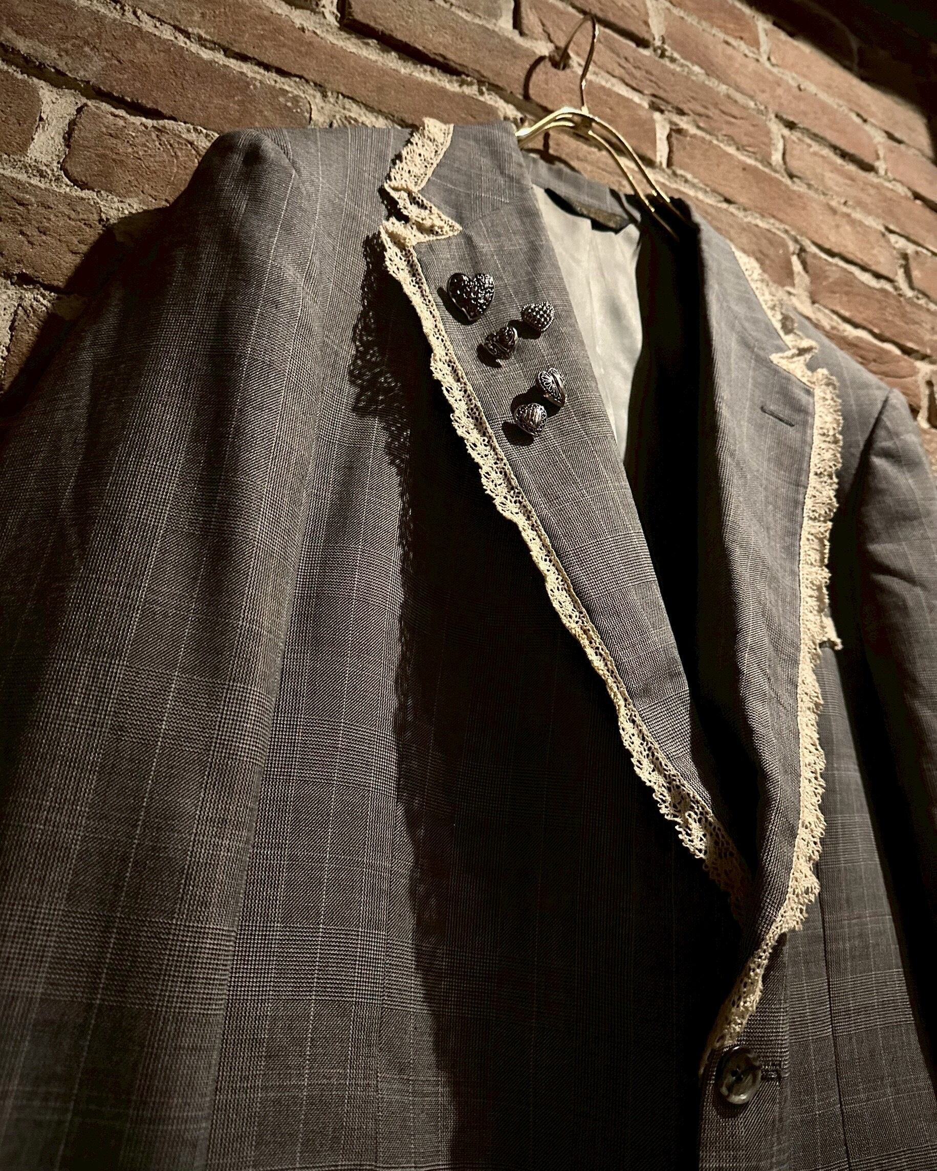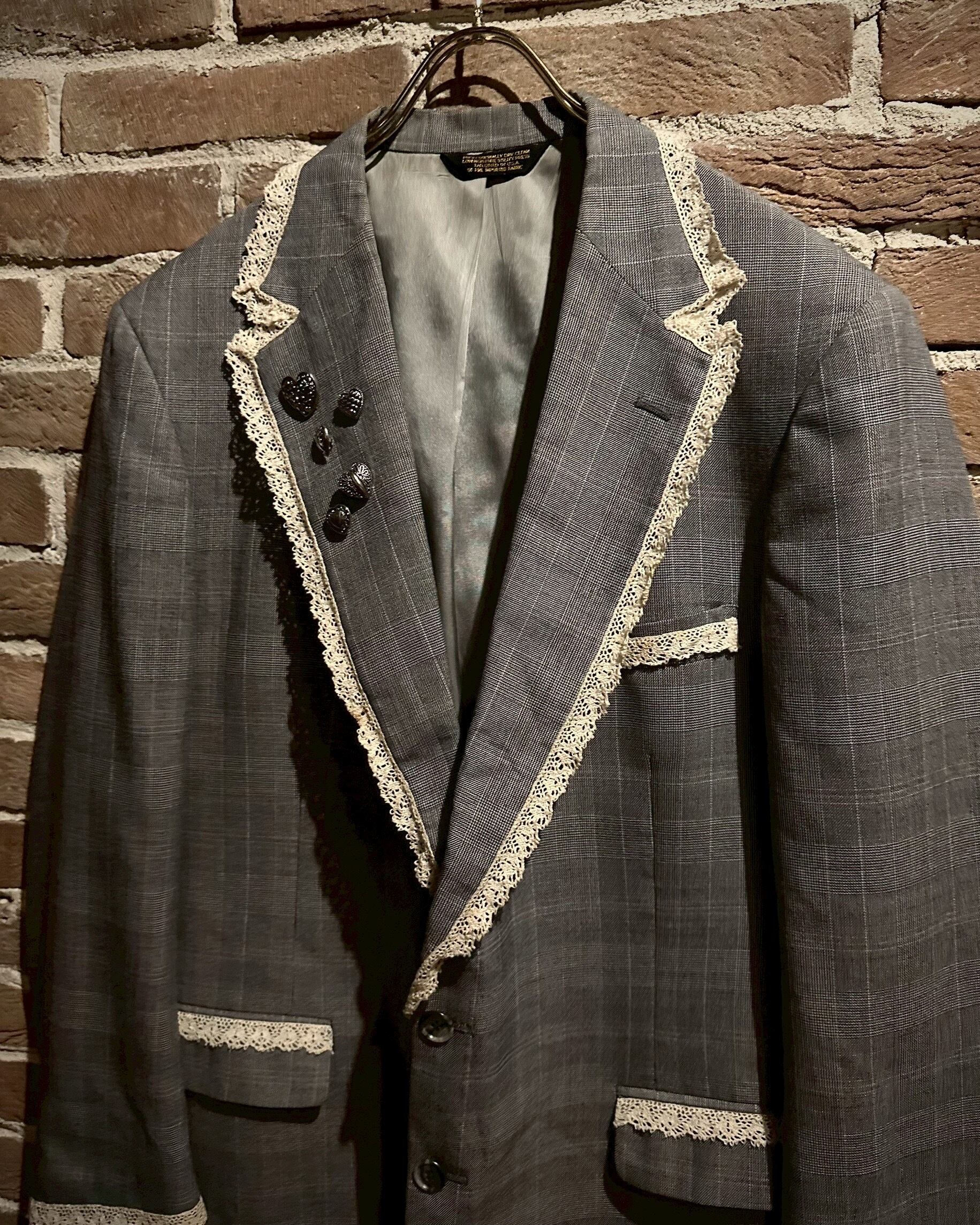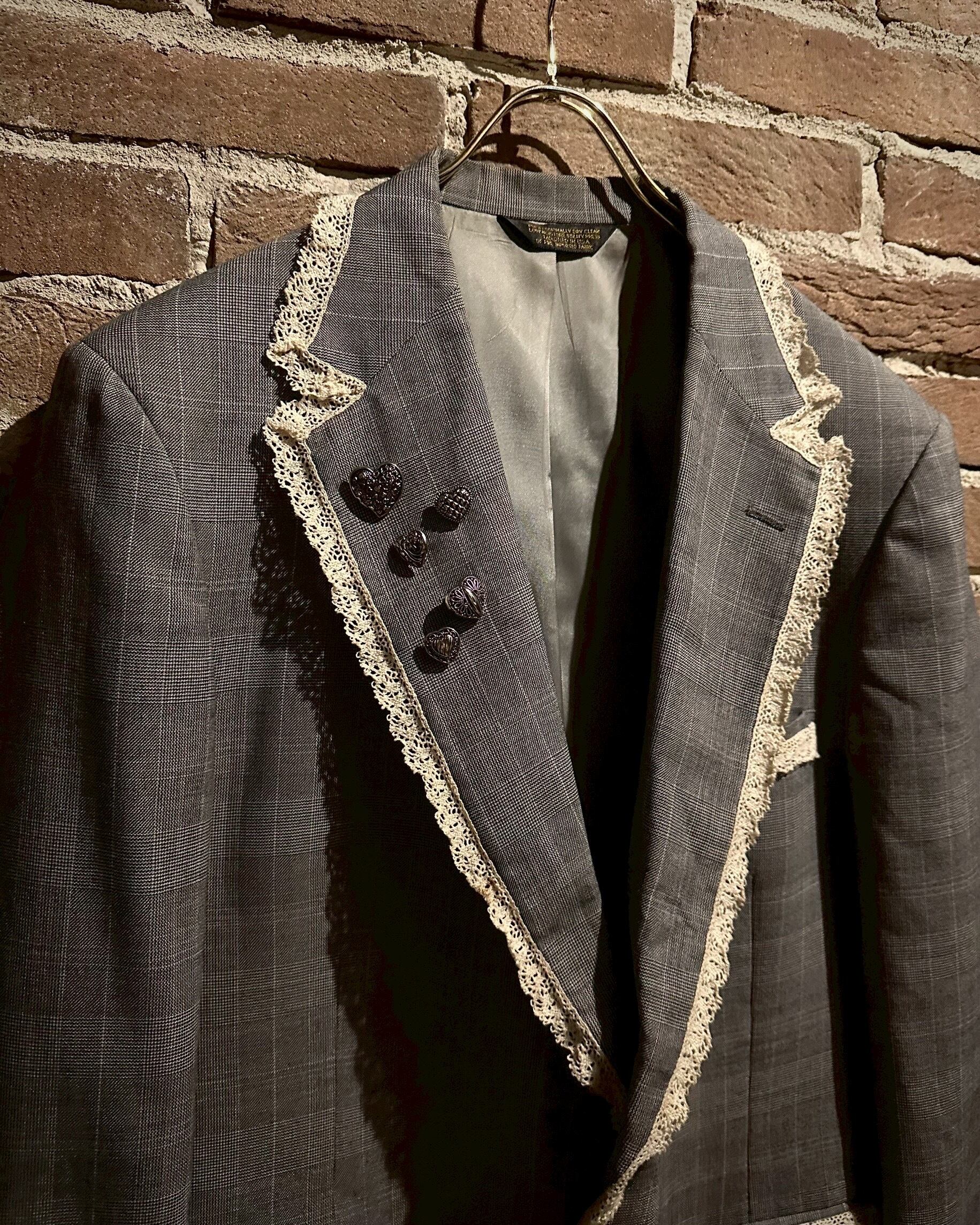 レース地を取り付け、ラペルにはハートのシルバーボタンの装飾でデザインを施し、唯一無二なアイテムへと昇華されています。