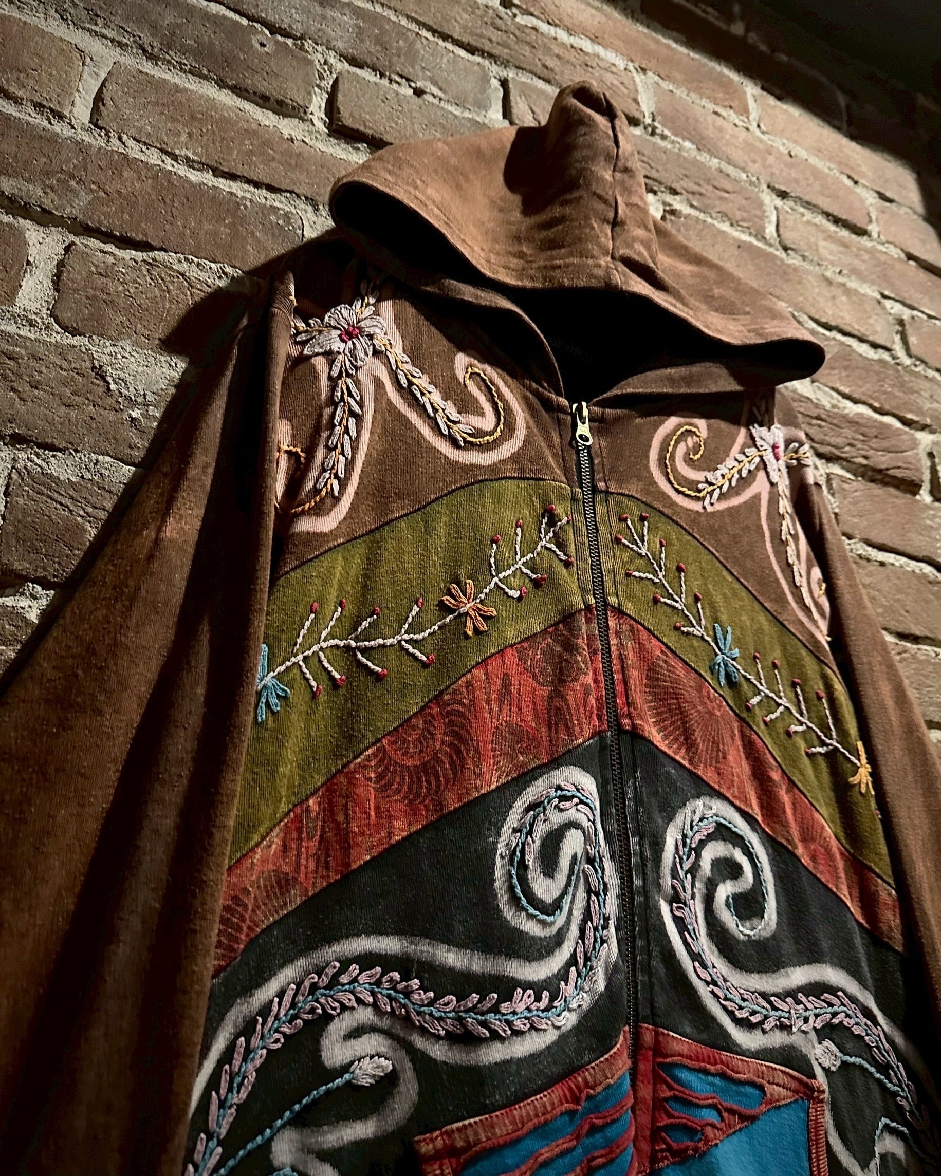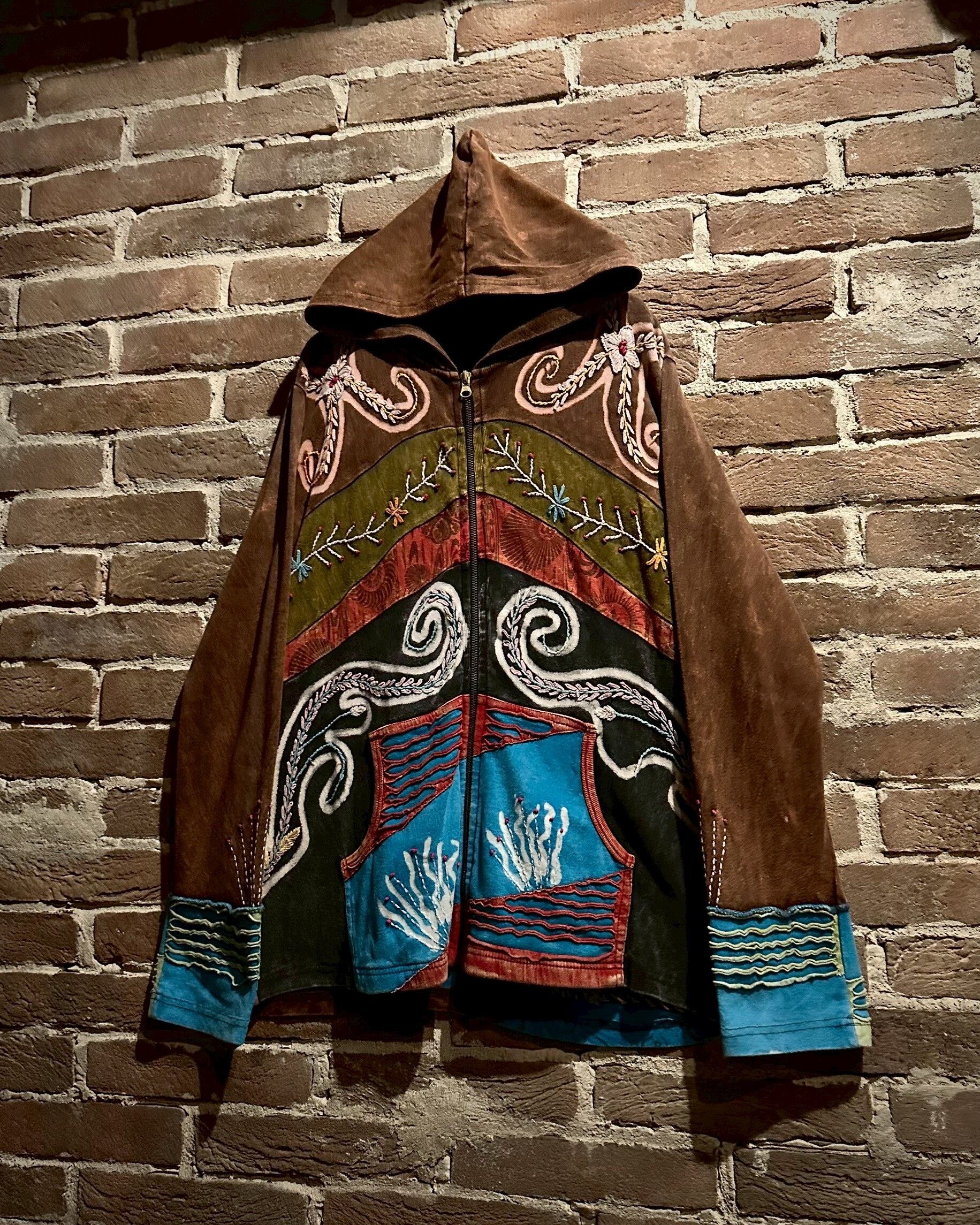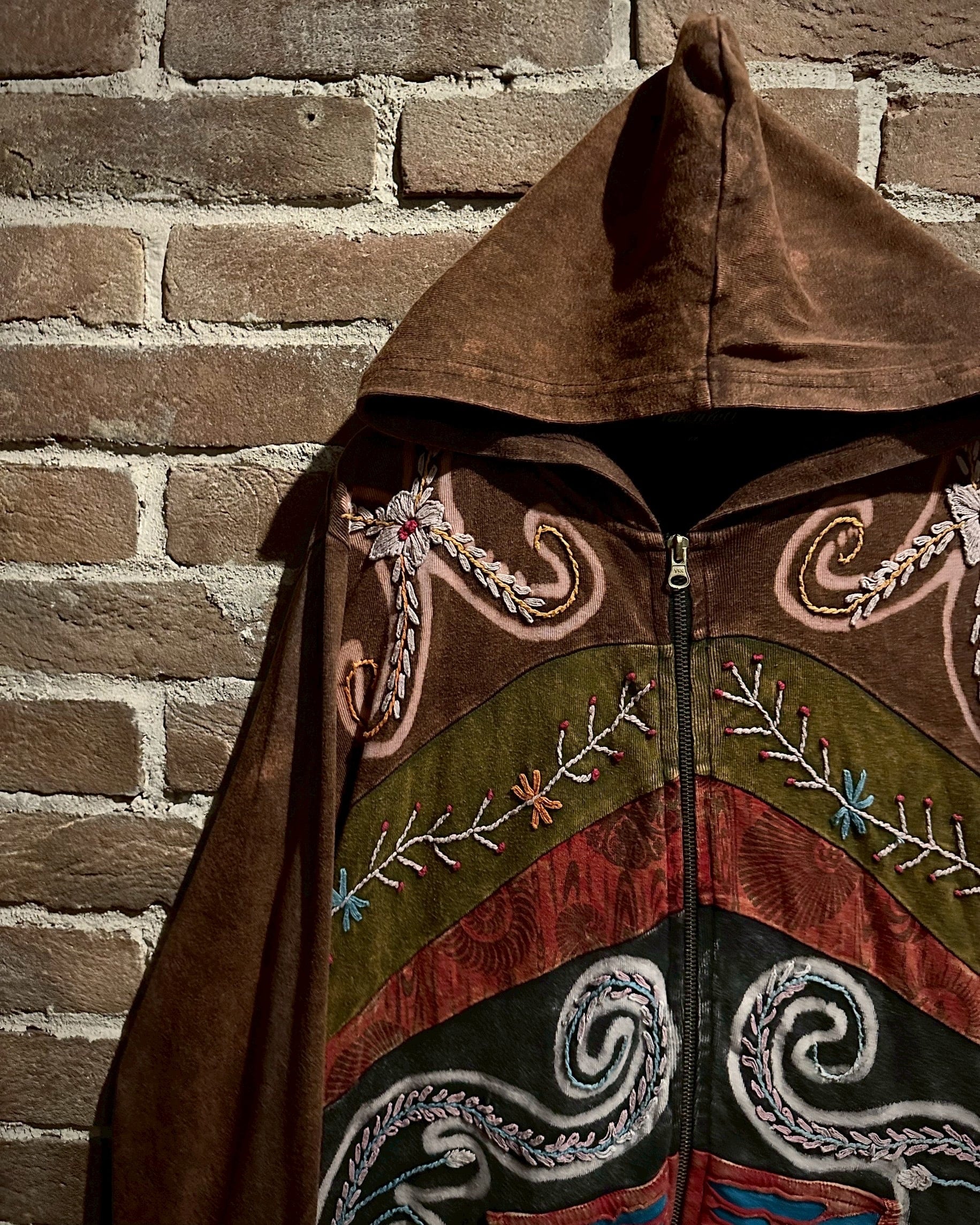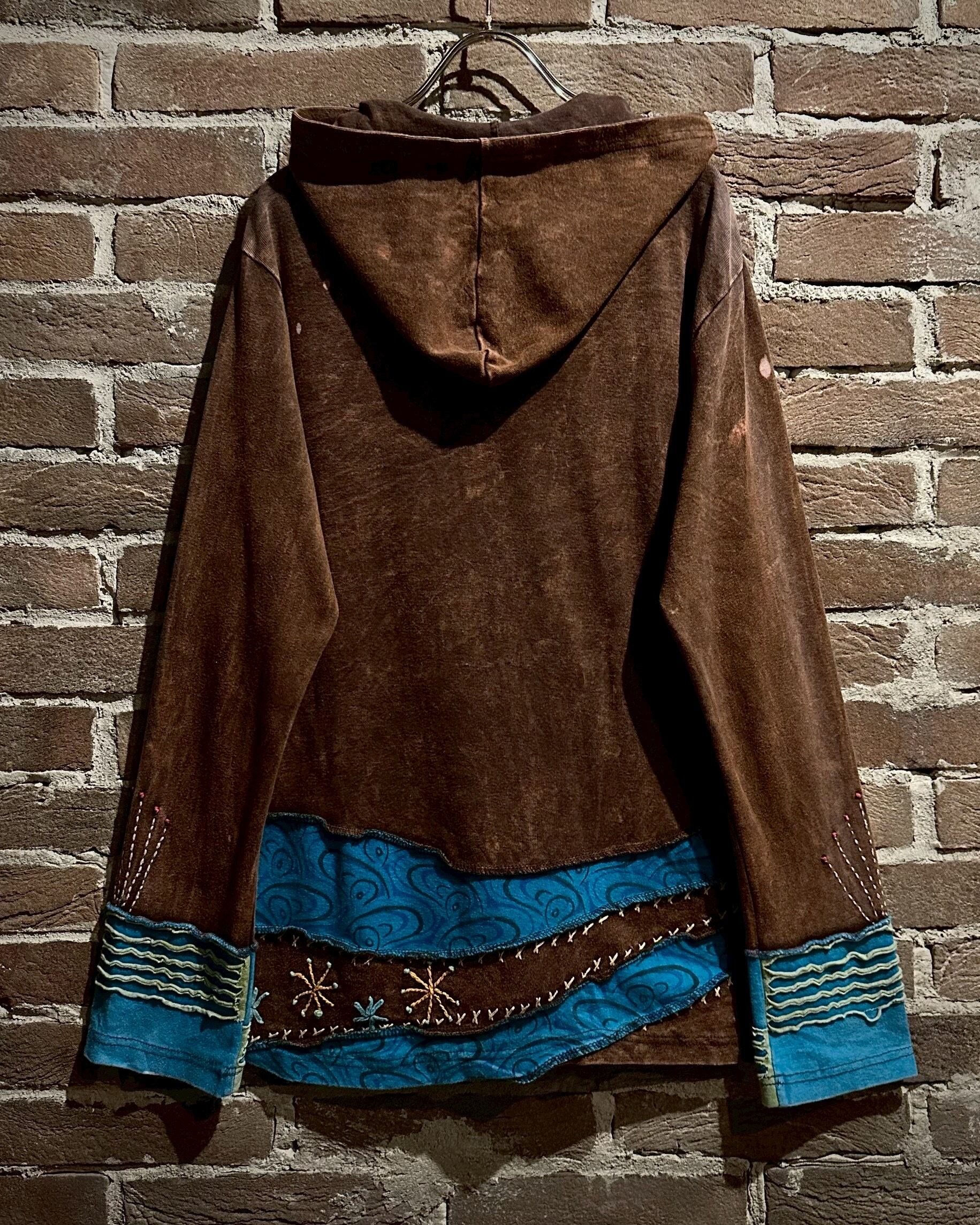 美しいフェードが効いた素材を用いて、黒×茶青×橙といったマルチな配色と、花の刺繍でパッチワークに落とし込んだジップアップパーカー。