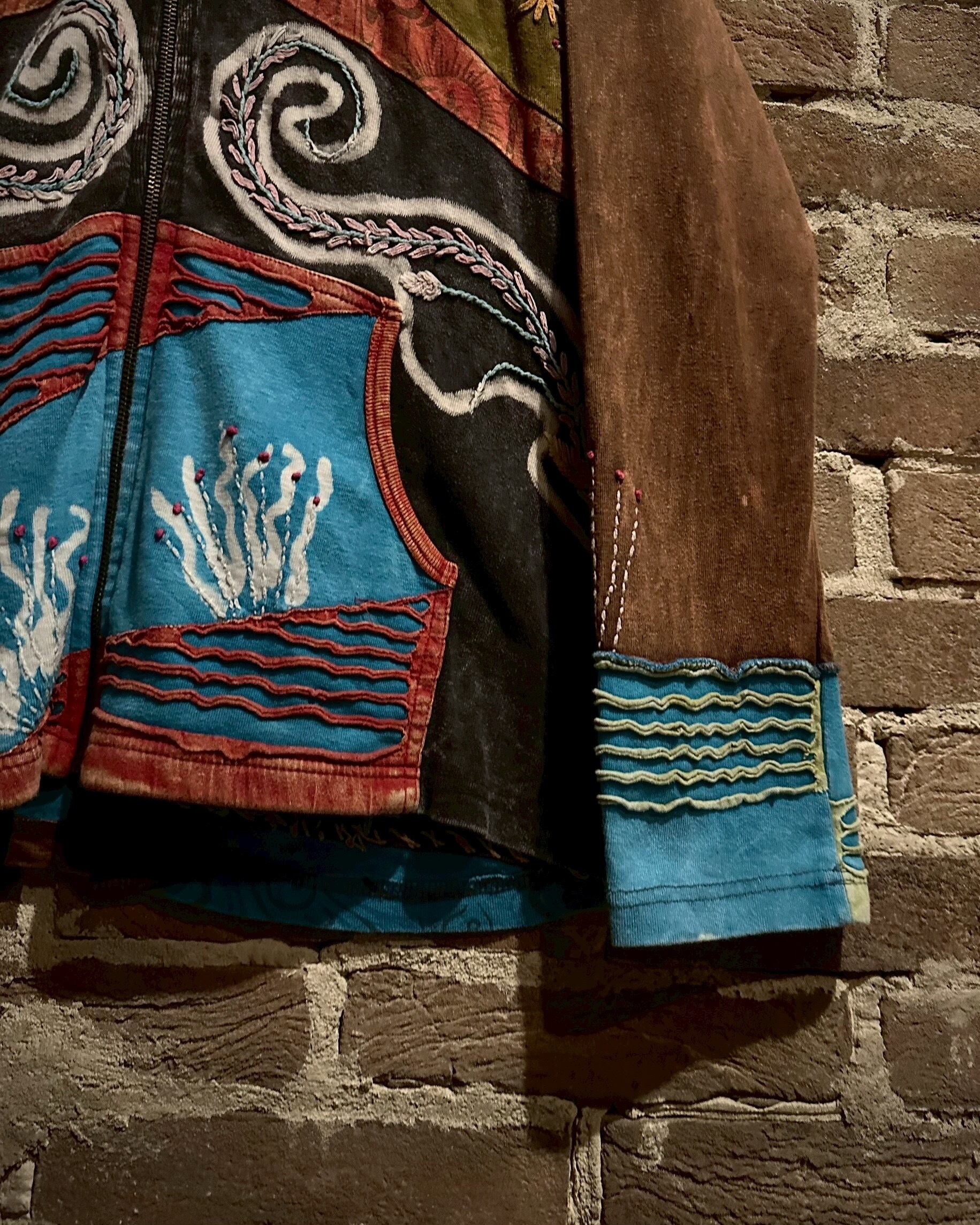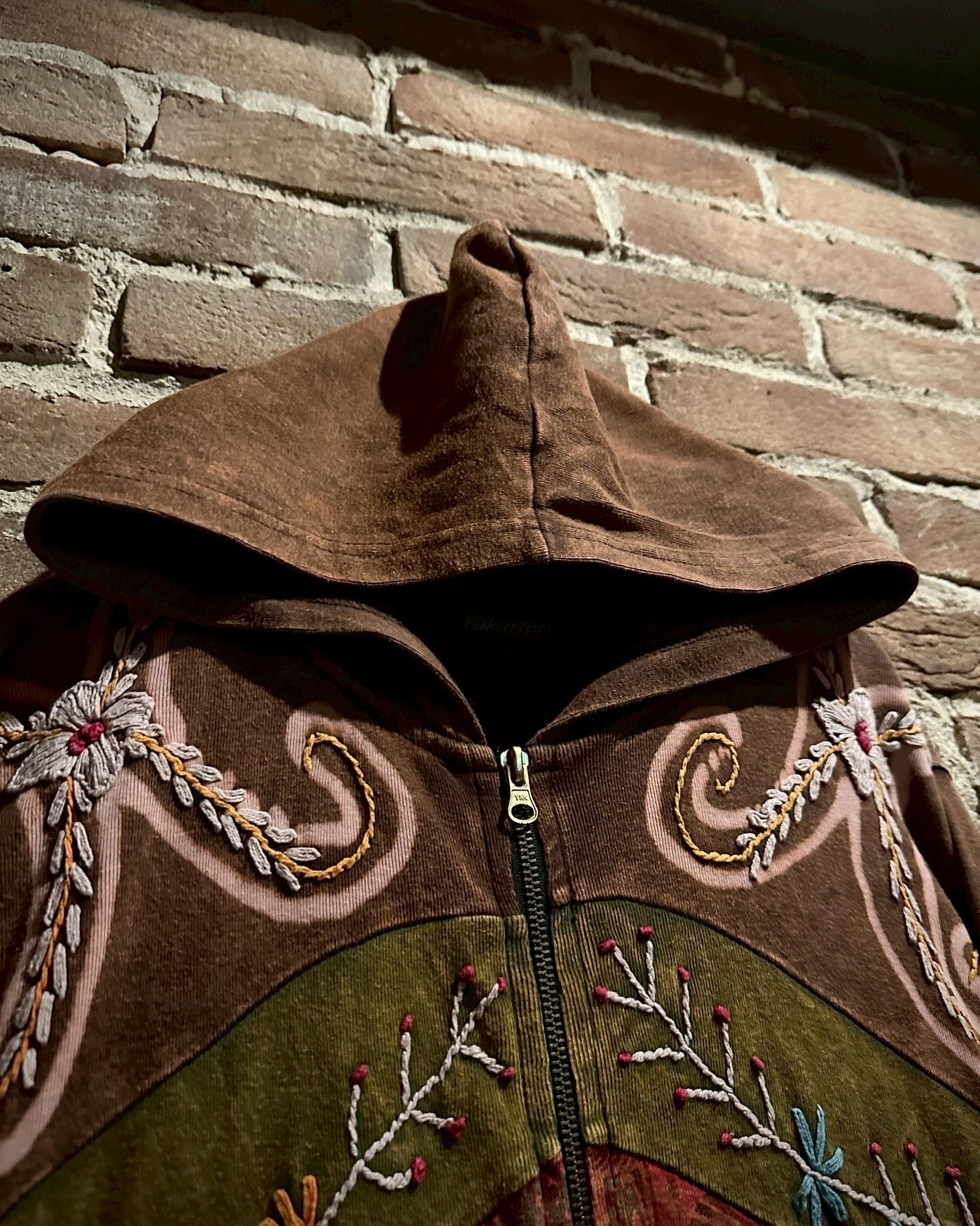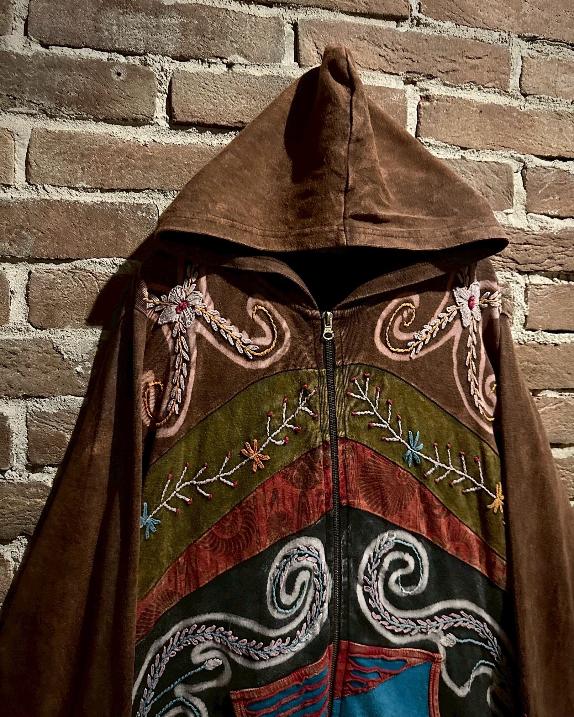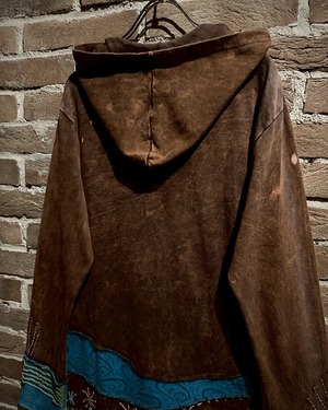 美しいフェードが効いた素材を用いて、黒×茶青×橙といったマルチな配色と、花の刺繍でパッチワークに落とし込んだジップアップパーカー。