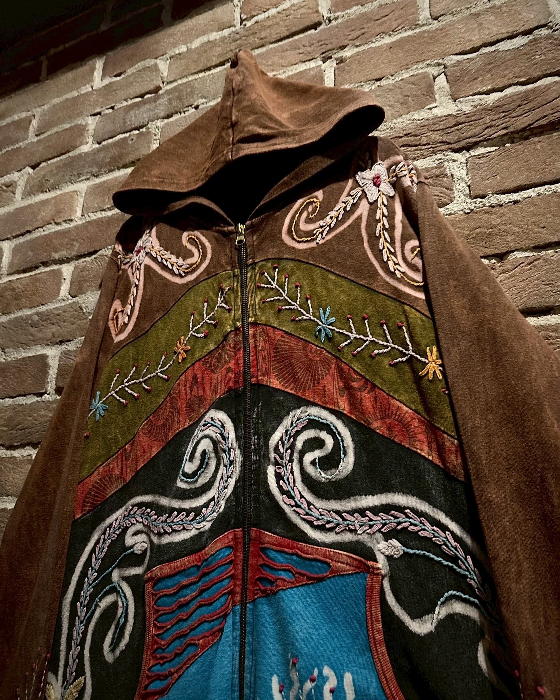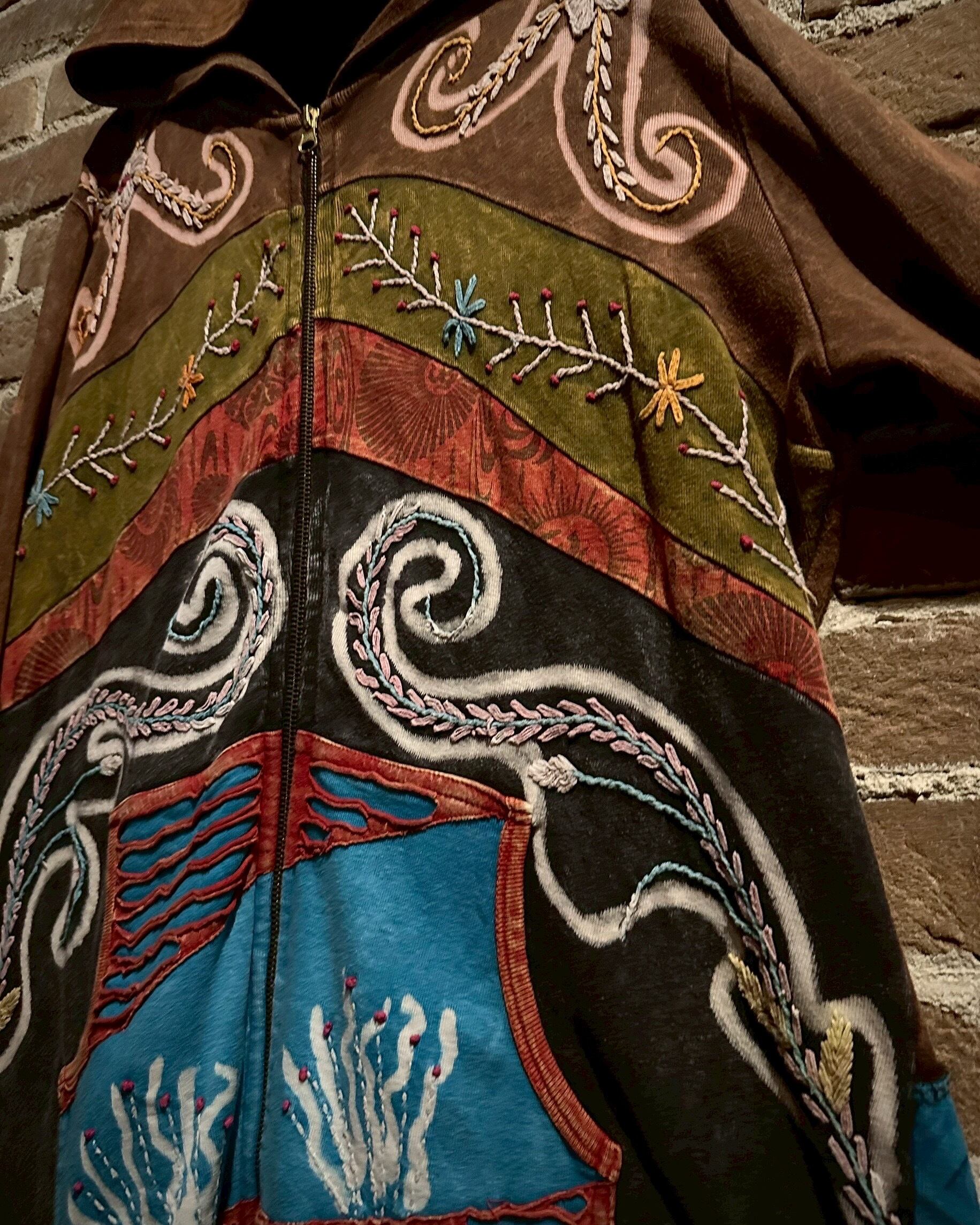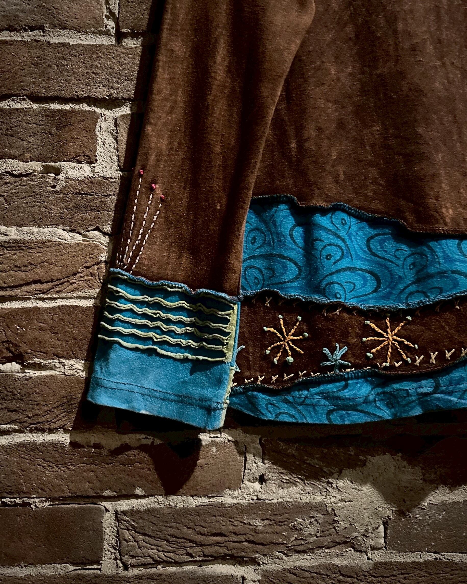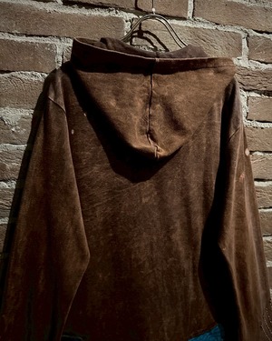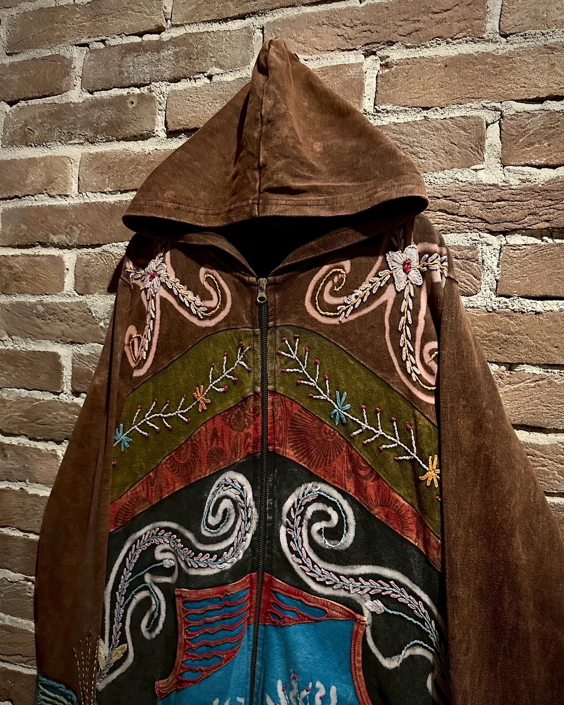 美しいフェードが効いた素材を用いて、黒×茶青×橙といったマルチな配色と、花の刺繍でパッチワークに落とし込んだジップアップパーカー。