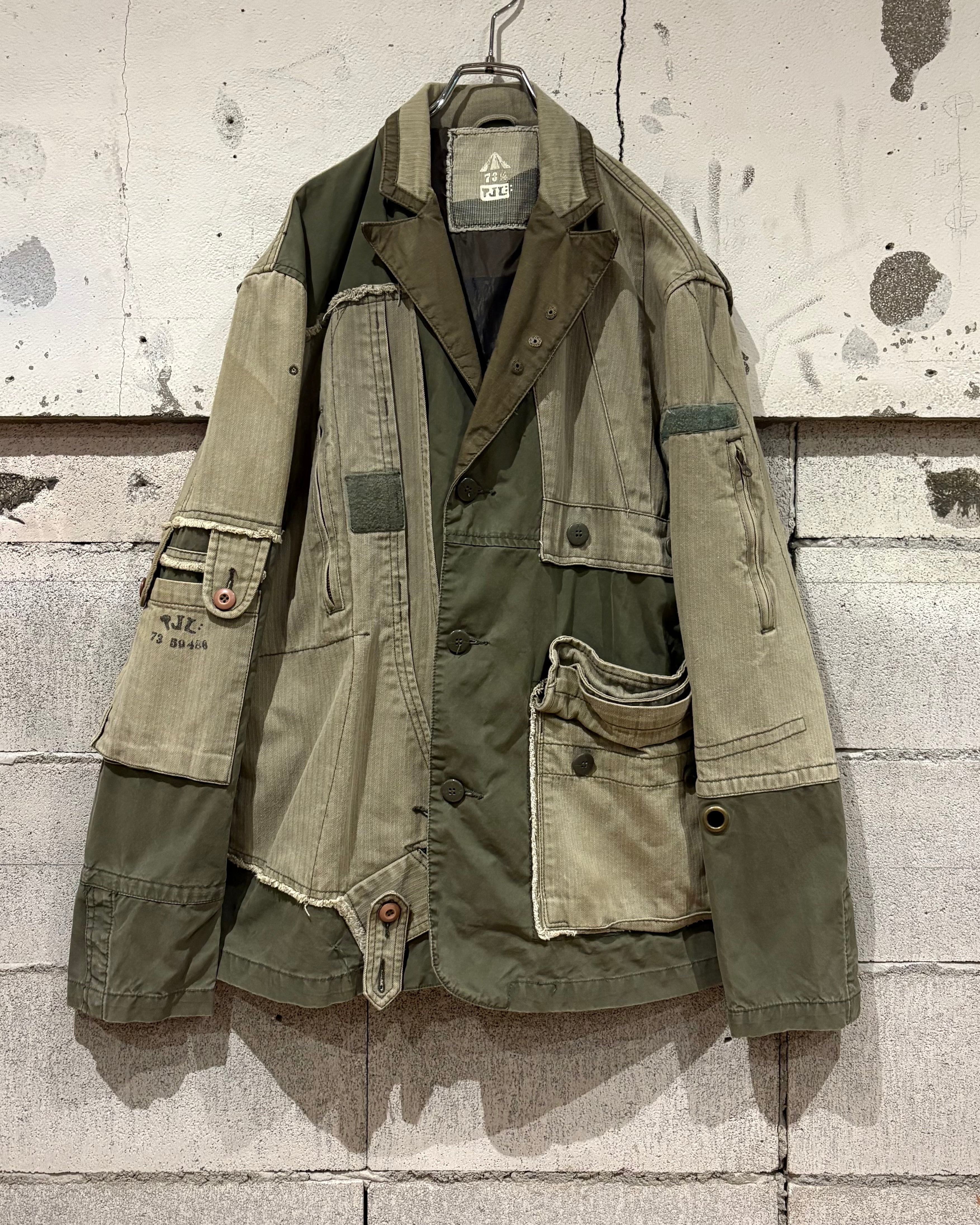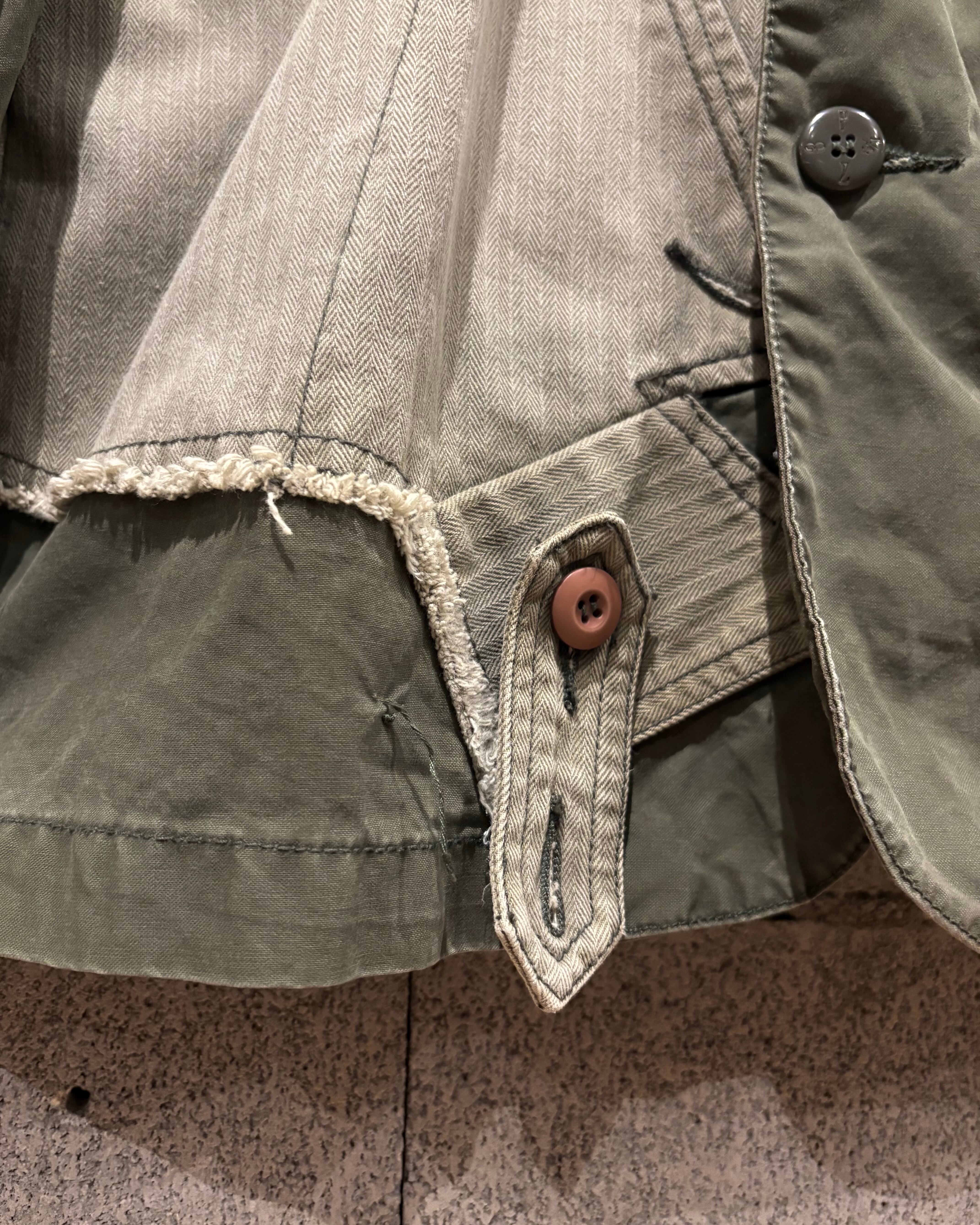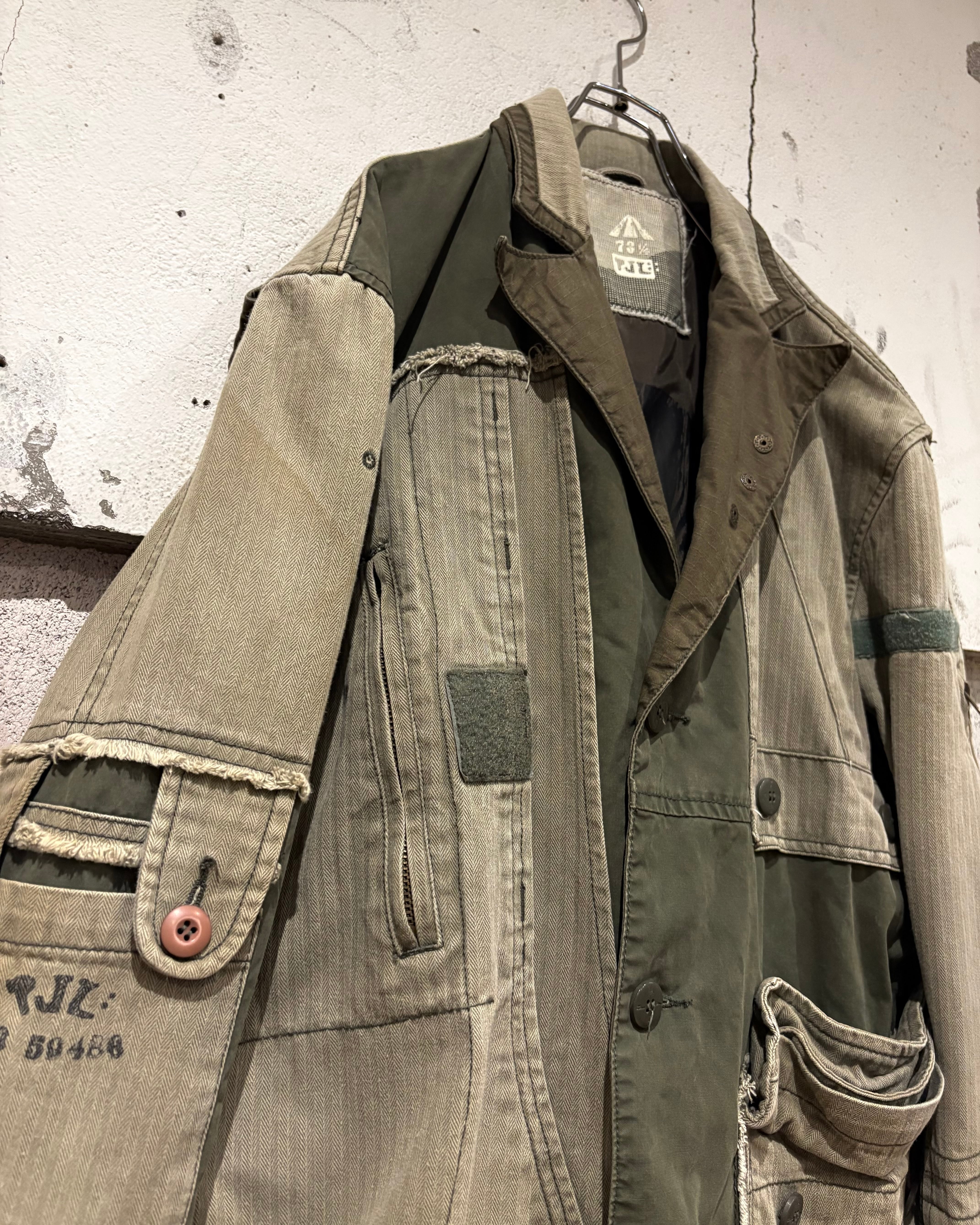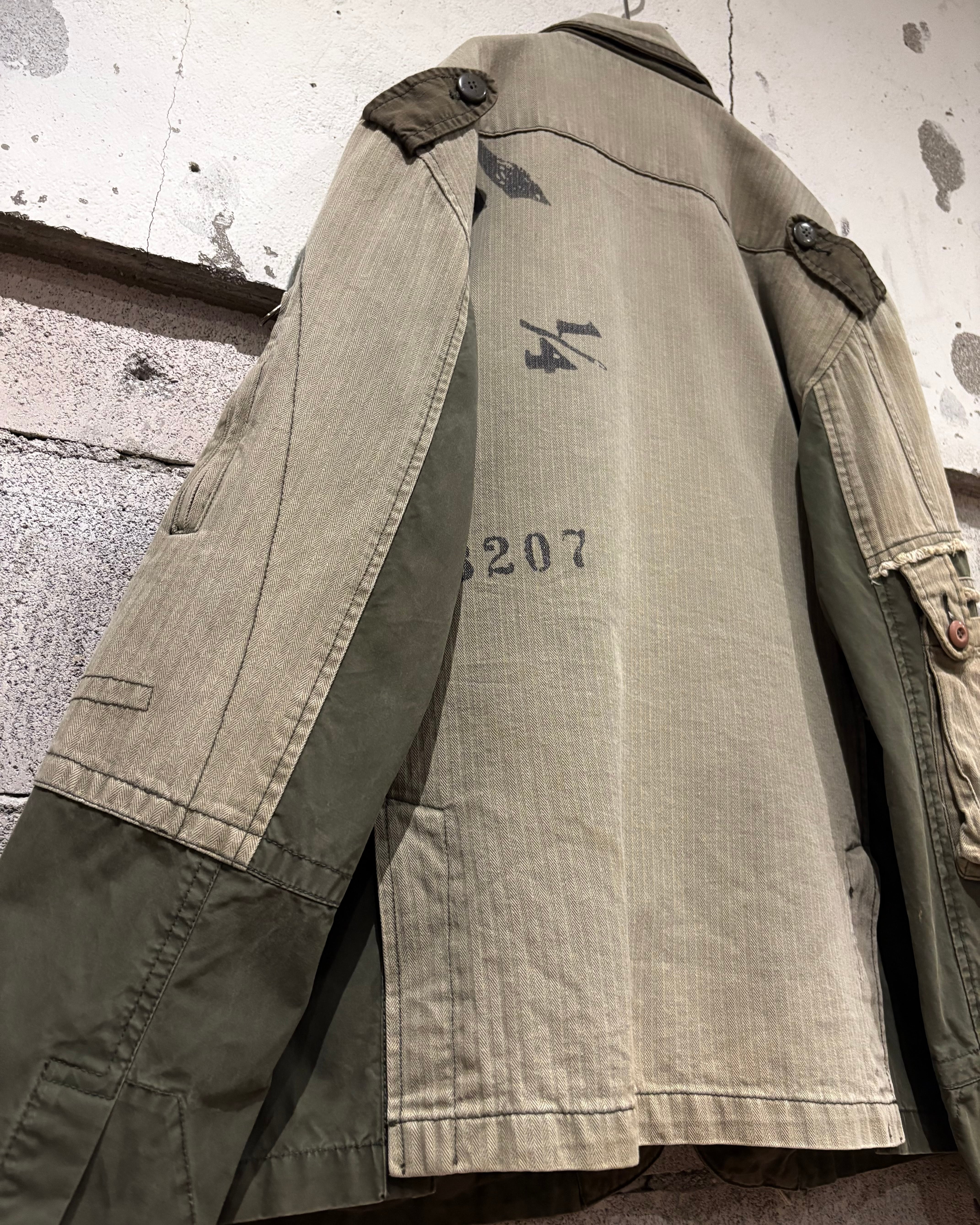 ヘリンボーン、リップストップ、高密度に織られた生地などミリタリーに用いられる様々なテキスタイルを繋ぎ合わせたテーラードジャケット。