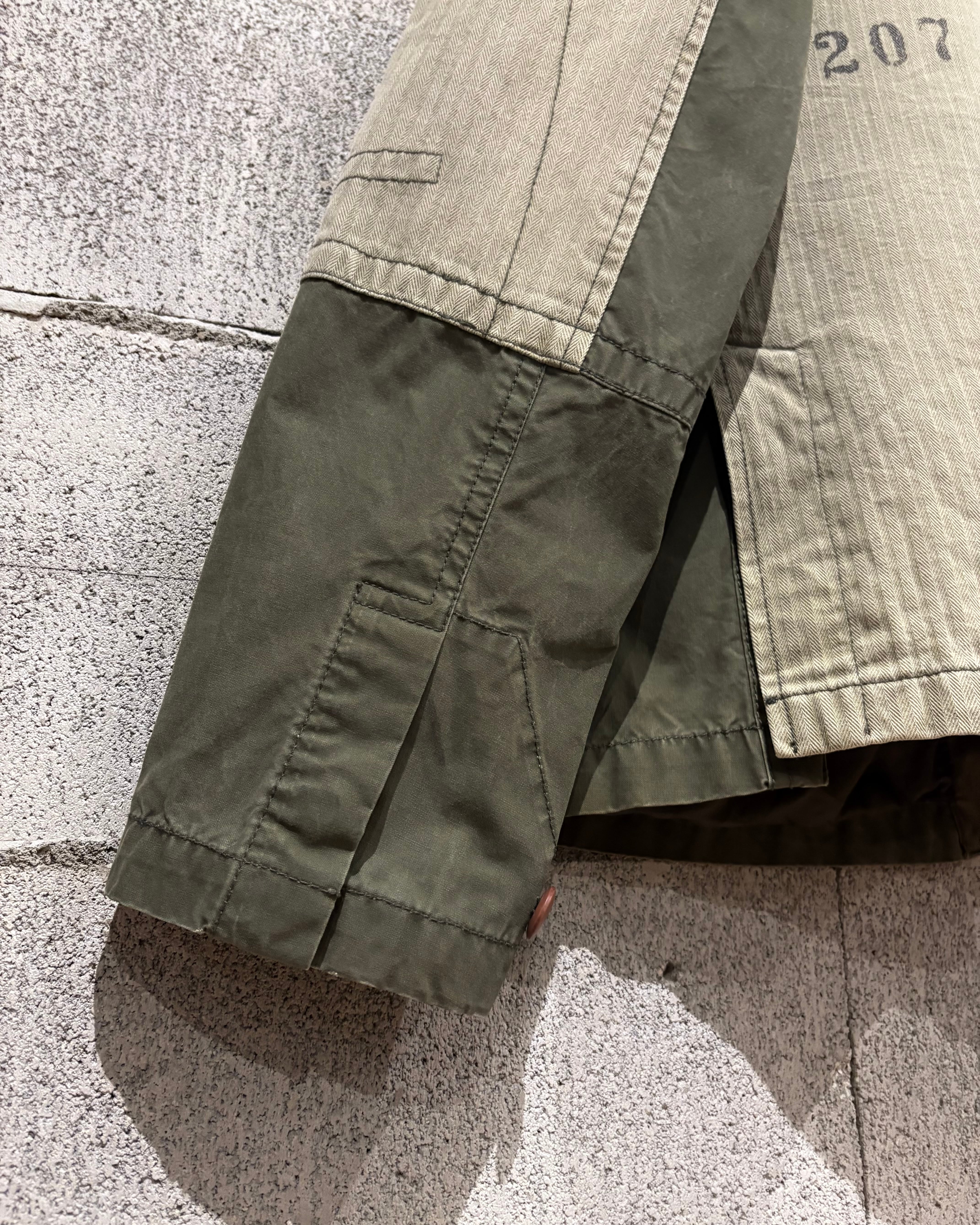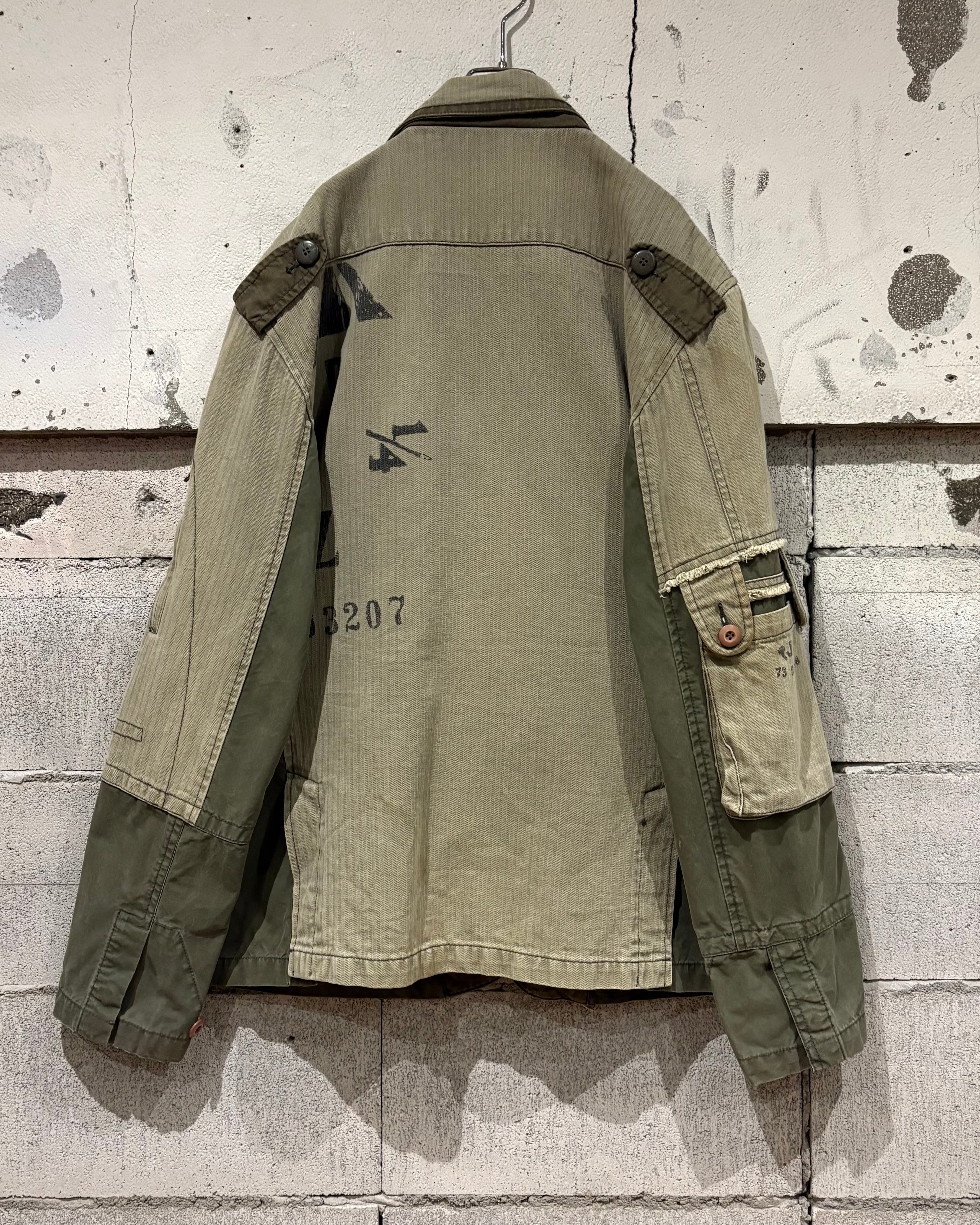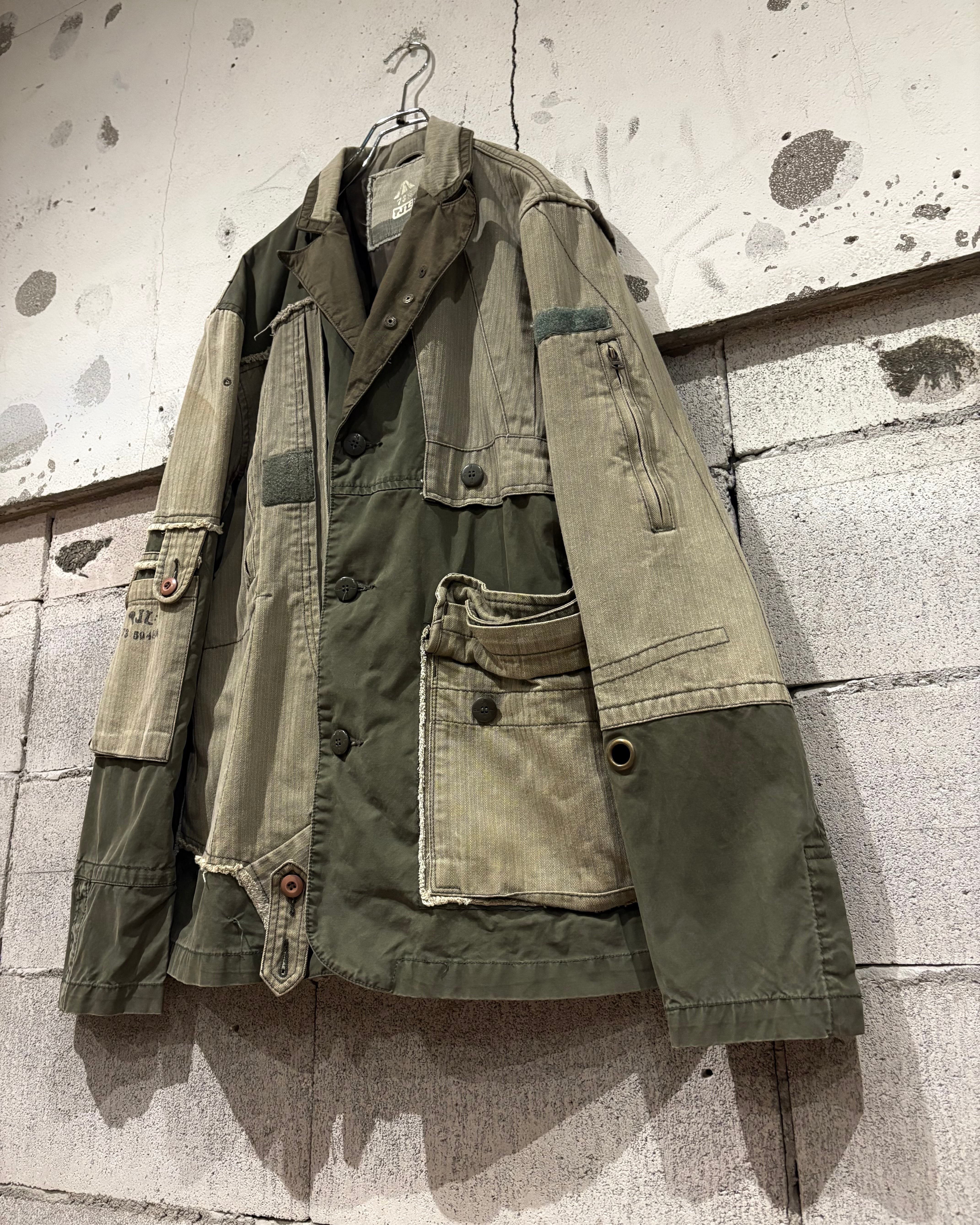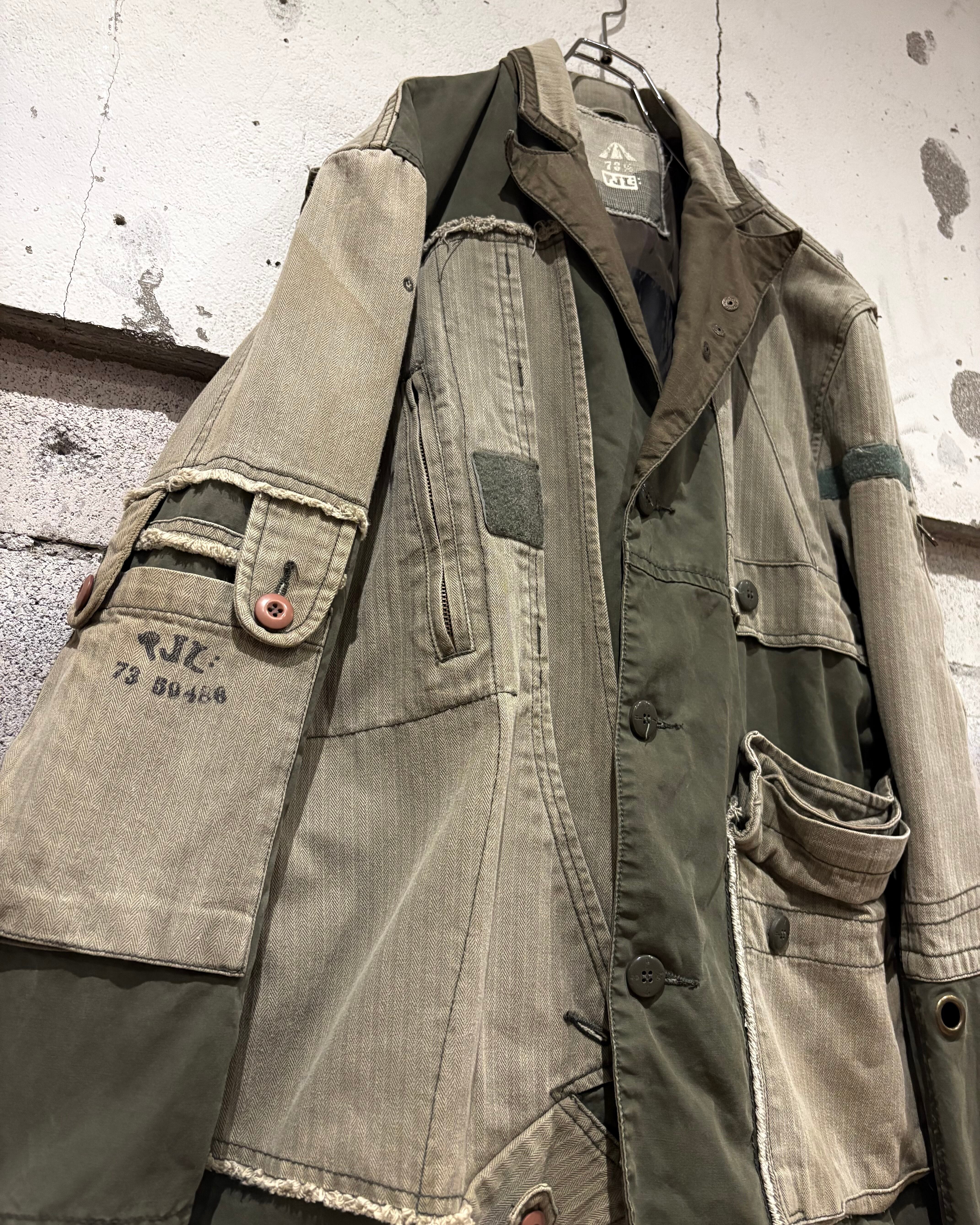 ヘリンボーン、リップストップ、高密度に織られた生地などミリタリーに用いられる様々なテキスタイルを繋ぎ合わせたテーラードジャケット。