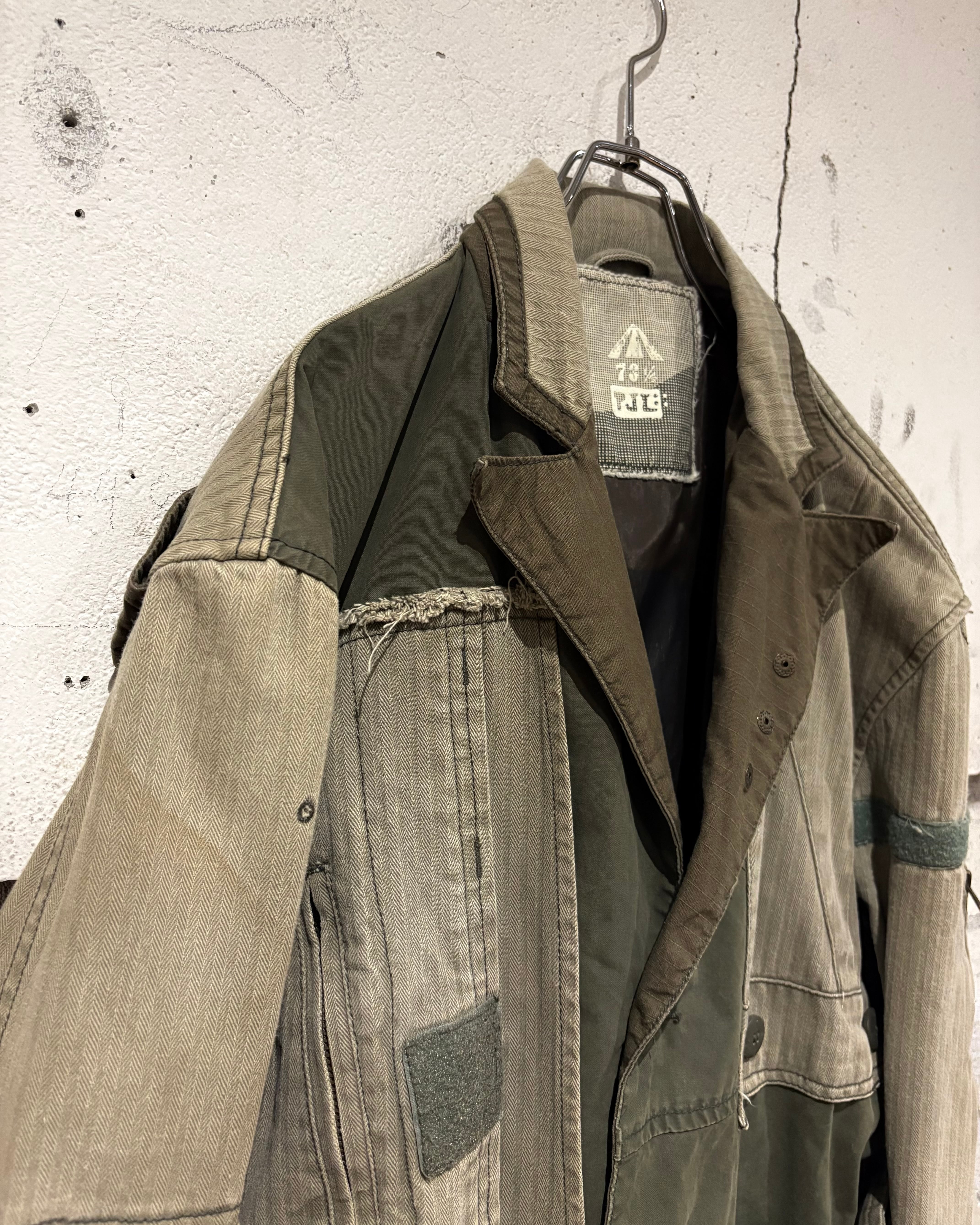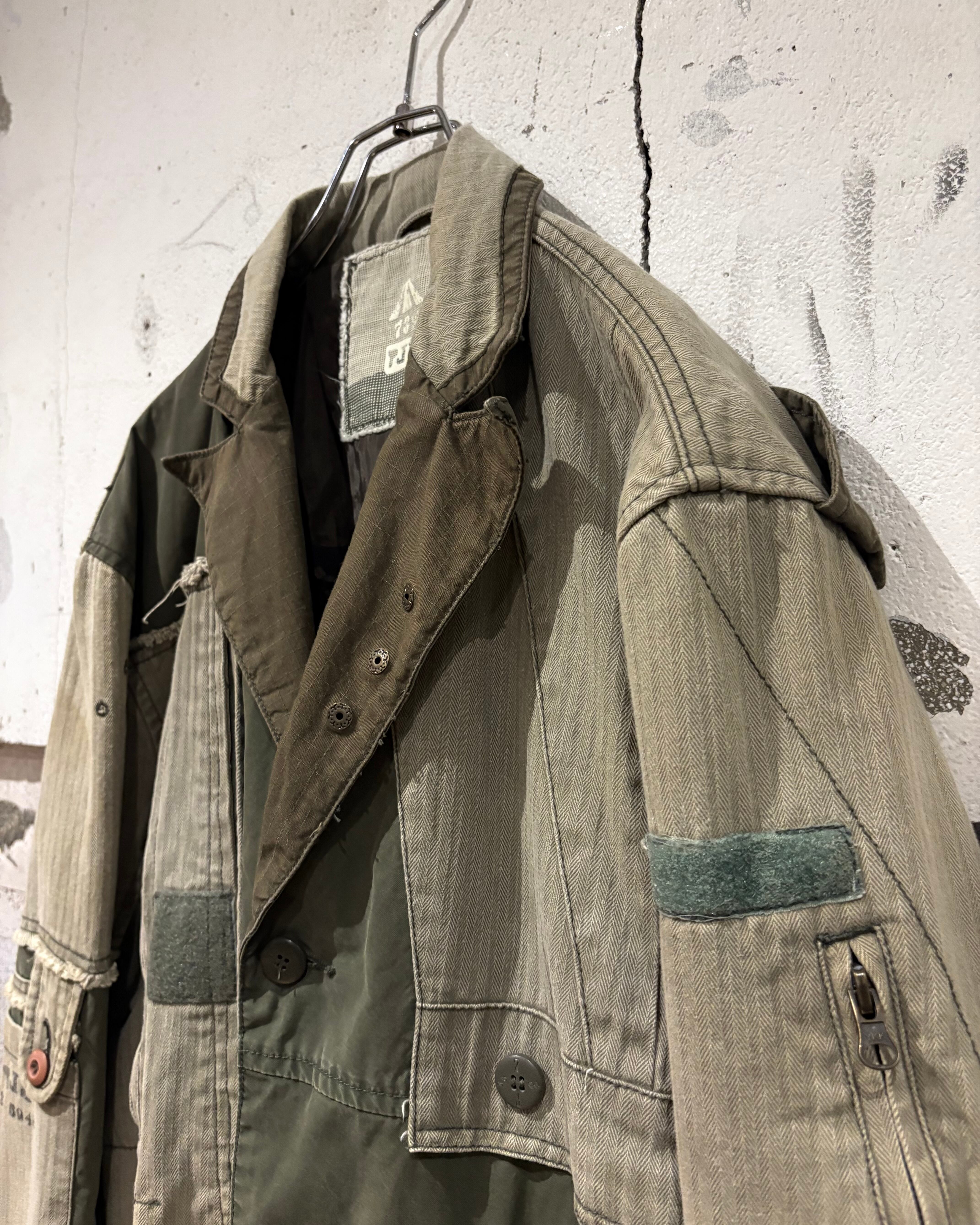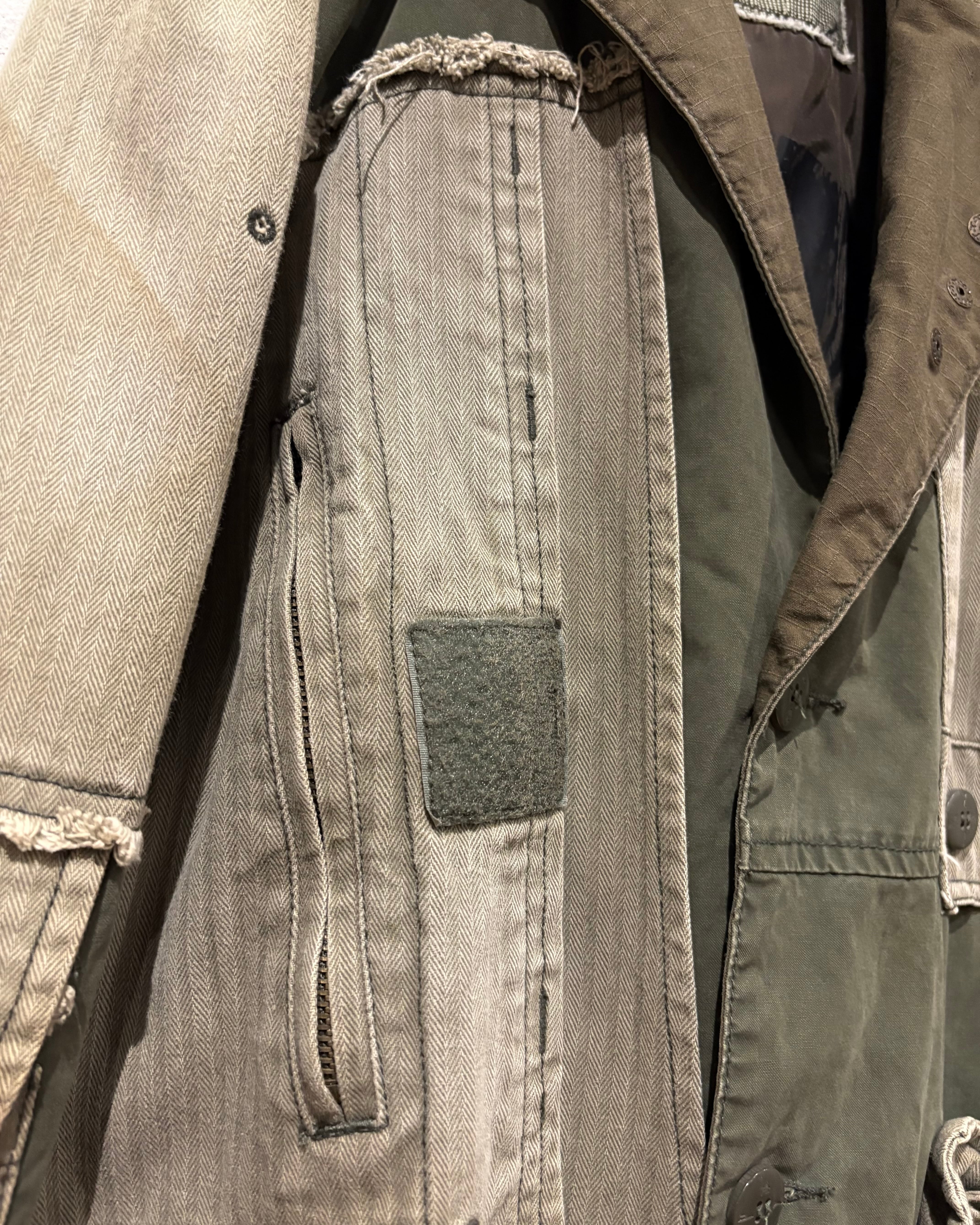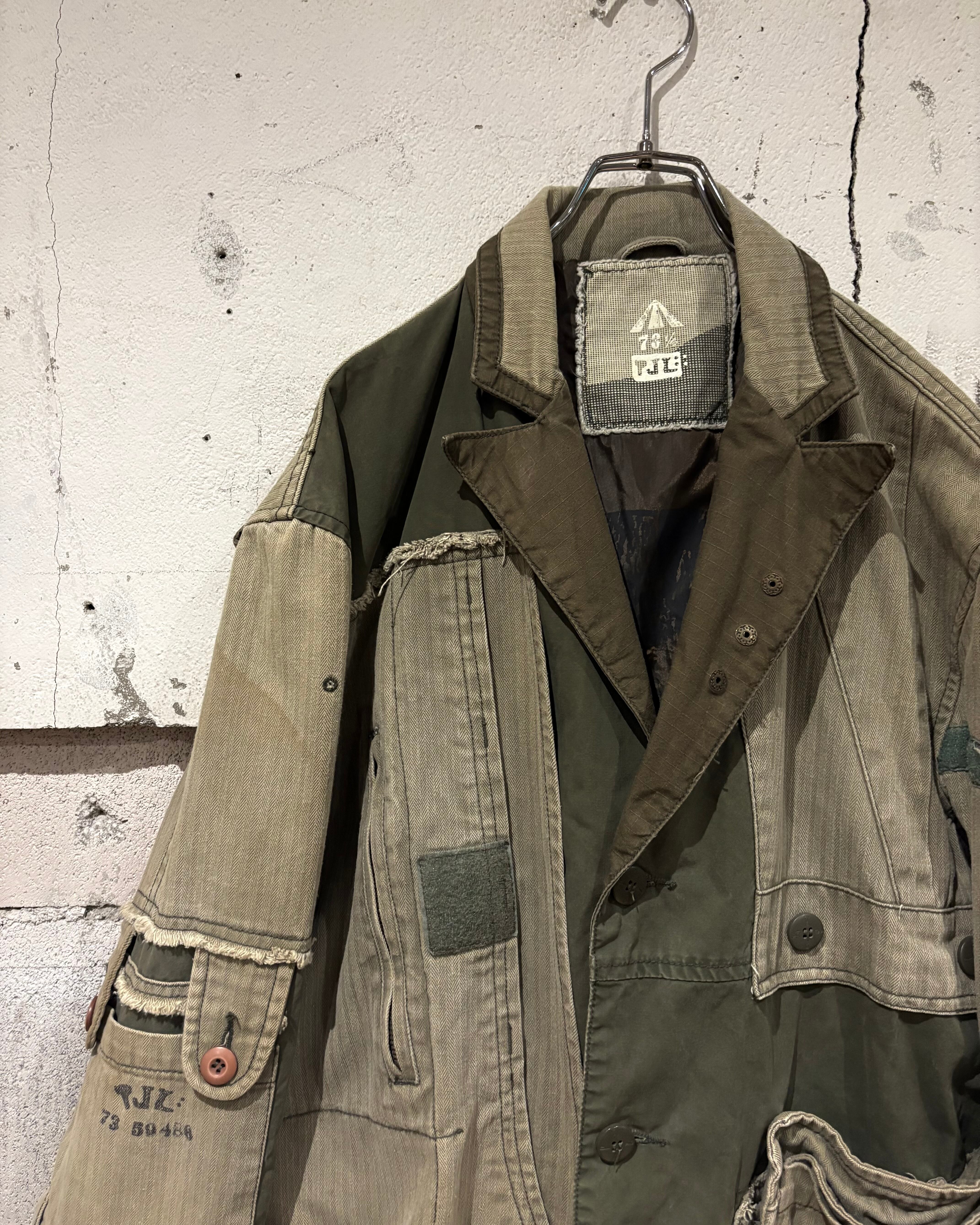 ヘリンボーン、リップストップ、高密度に織られた生地などミリタリーに用いられる様々なテキスタイルを繋ぎ合わせたテーラードジャケット。
