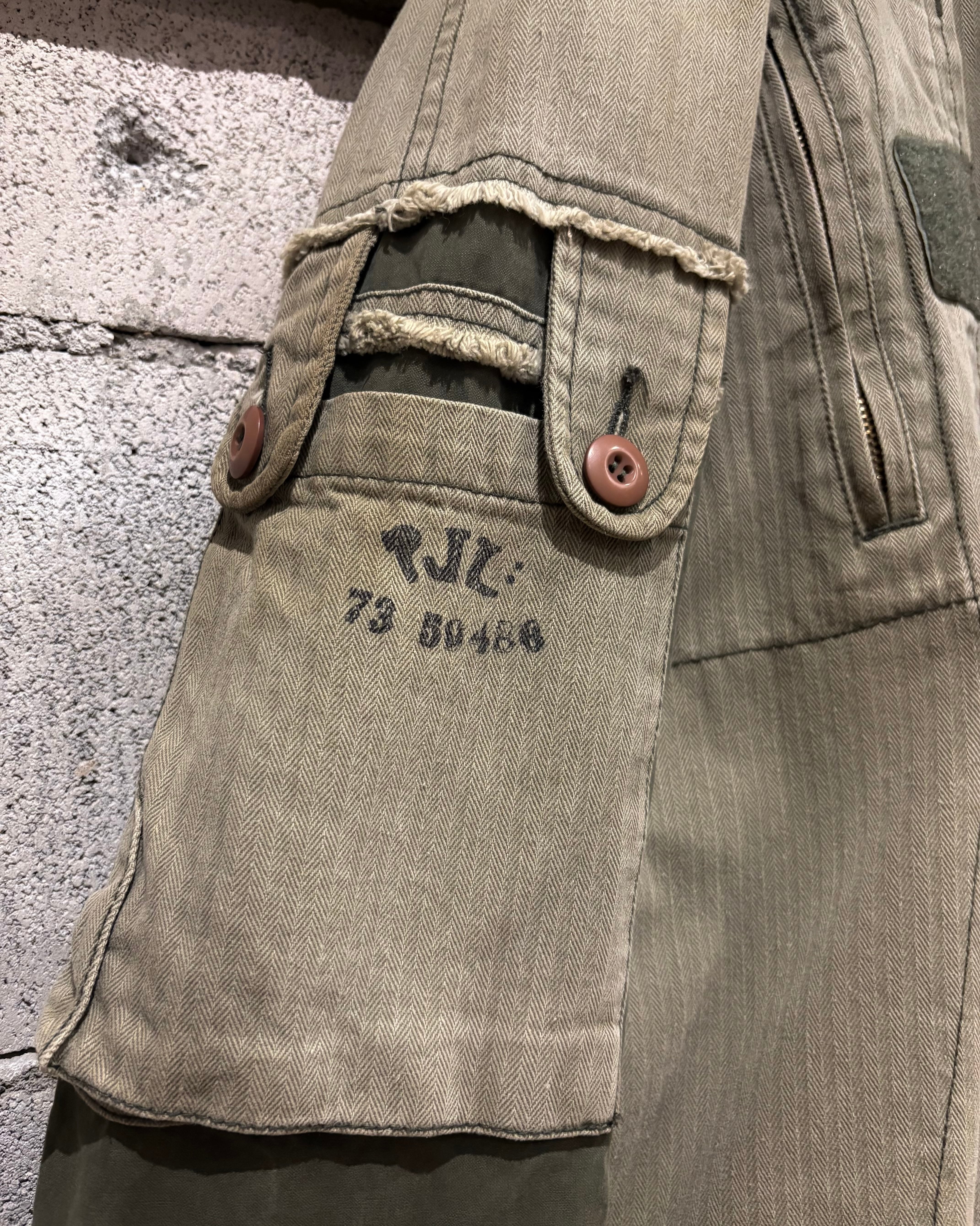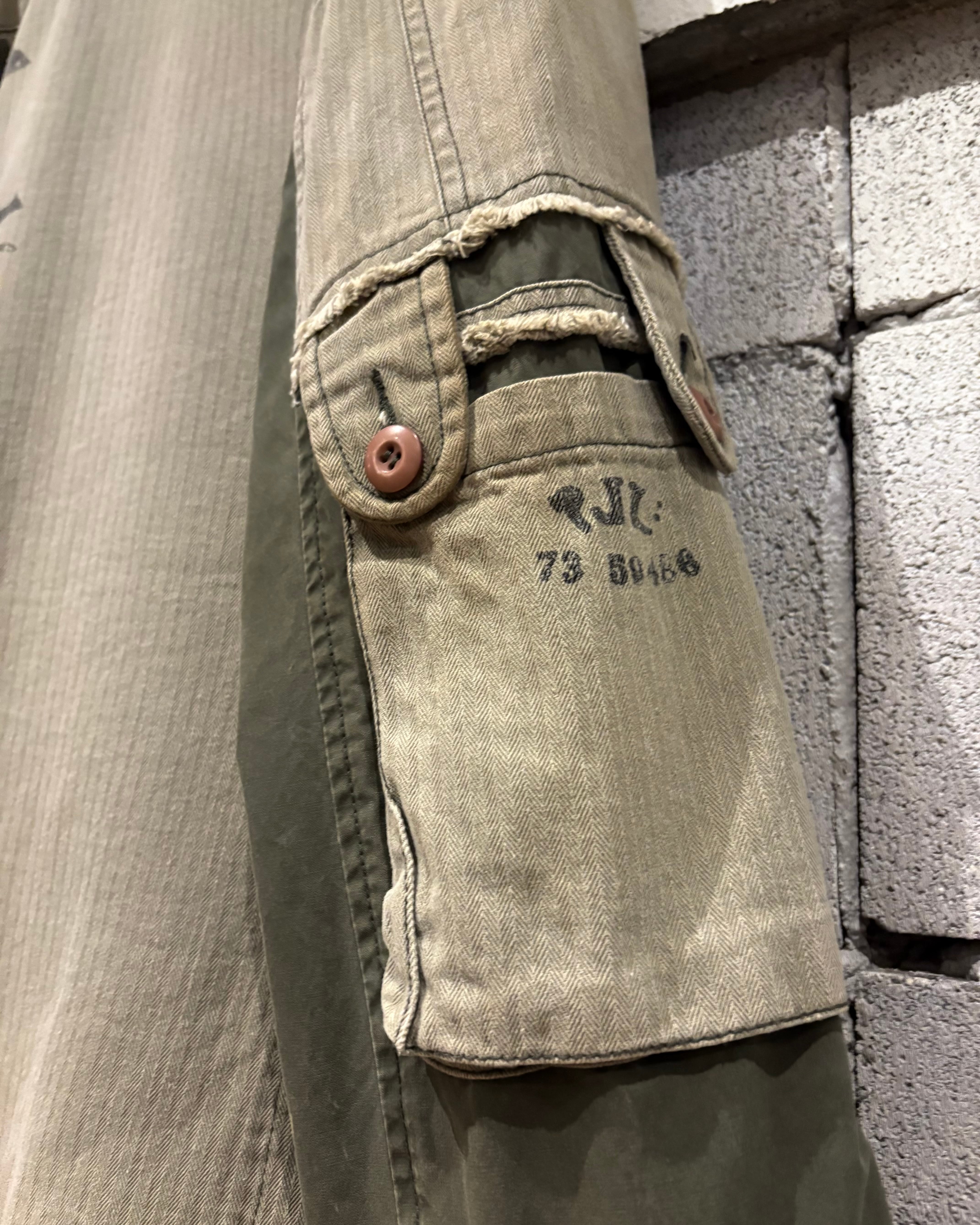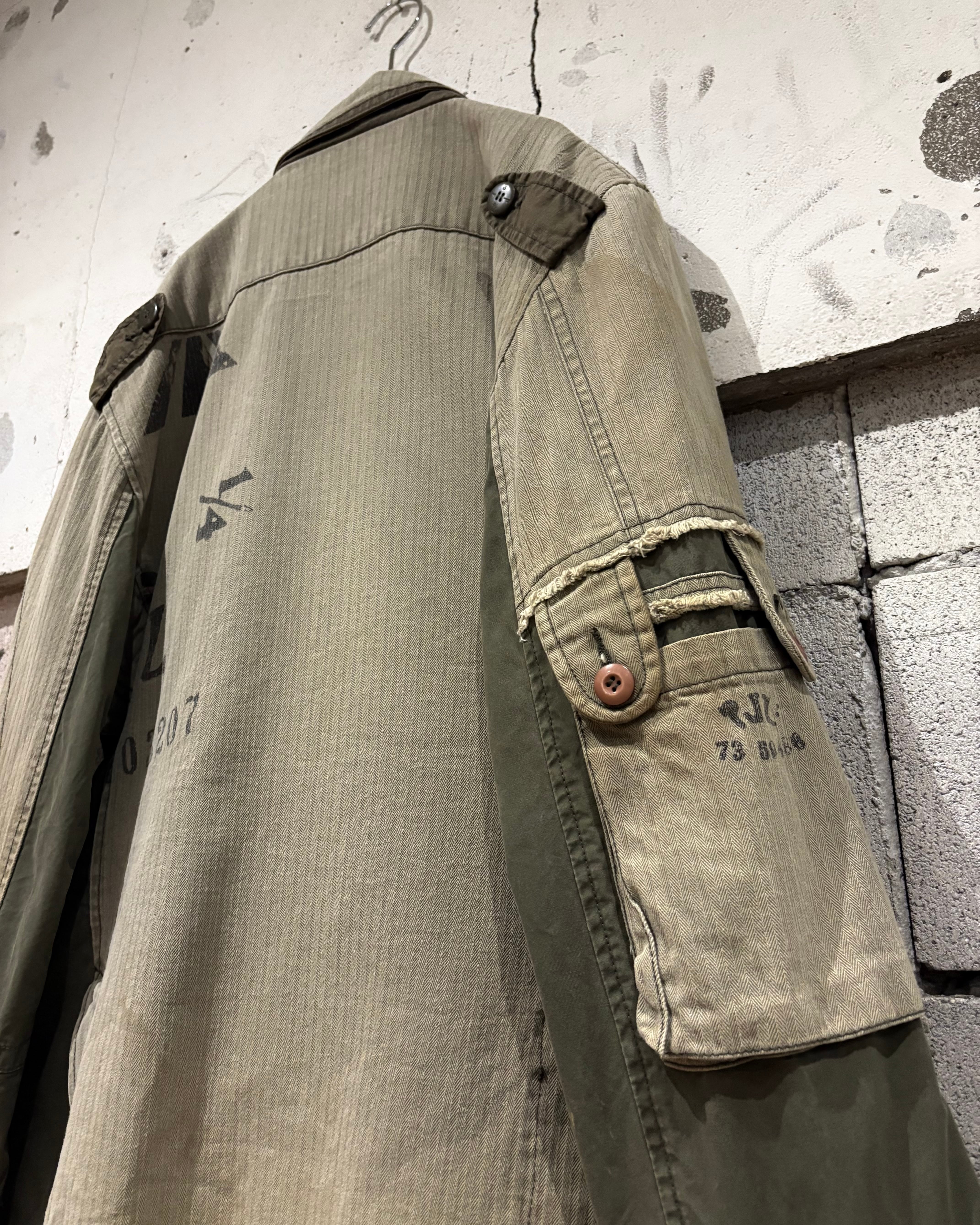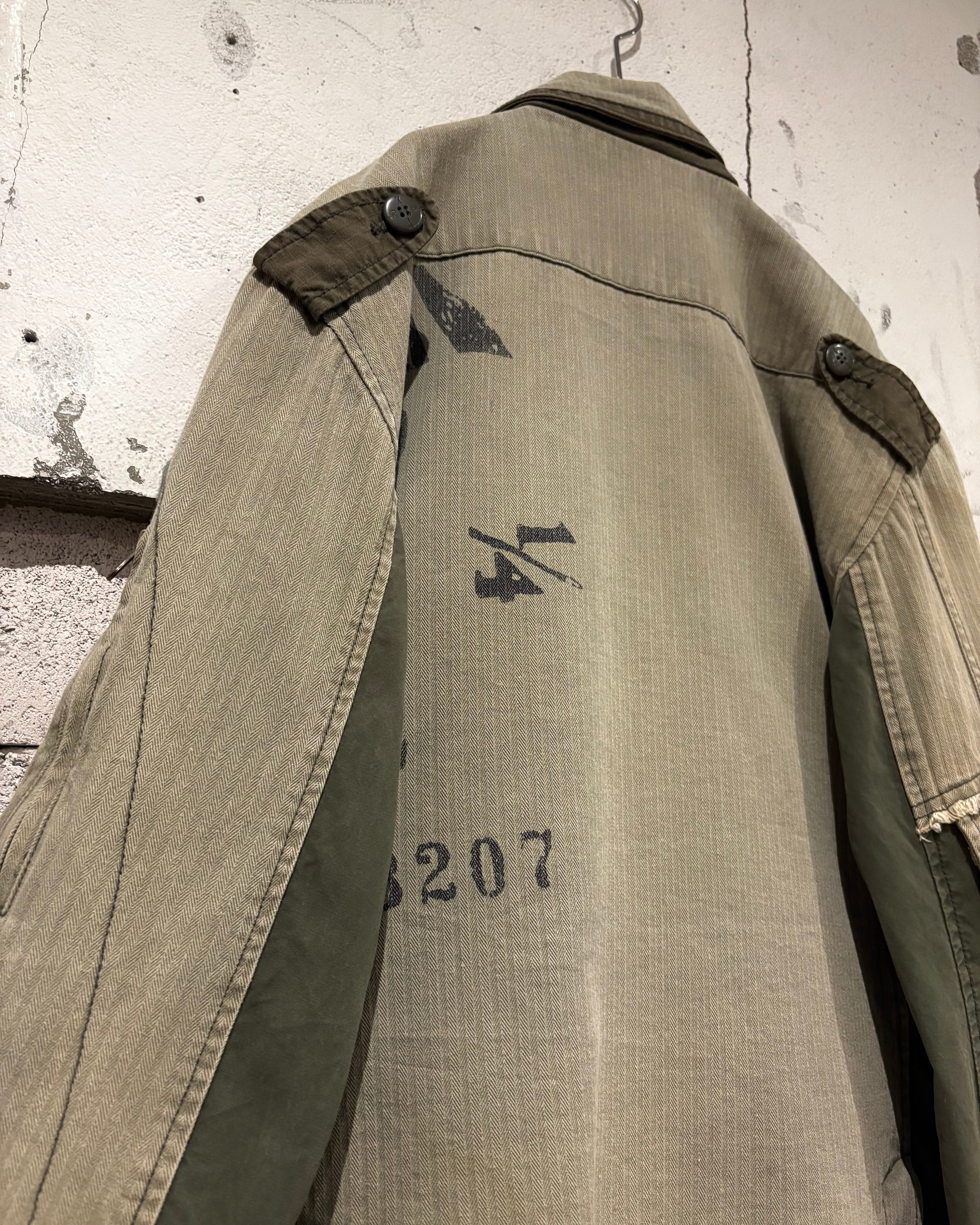 ヘリンボーン、リップストップ、高密度に織られた生地などミリタリーに用いられる様々なテキスタイルを繋ぎ合わせたテーラードジャケット。