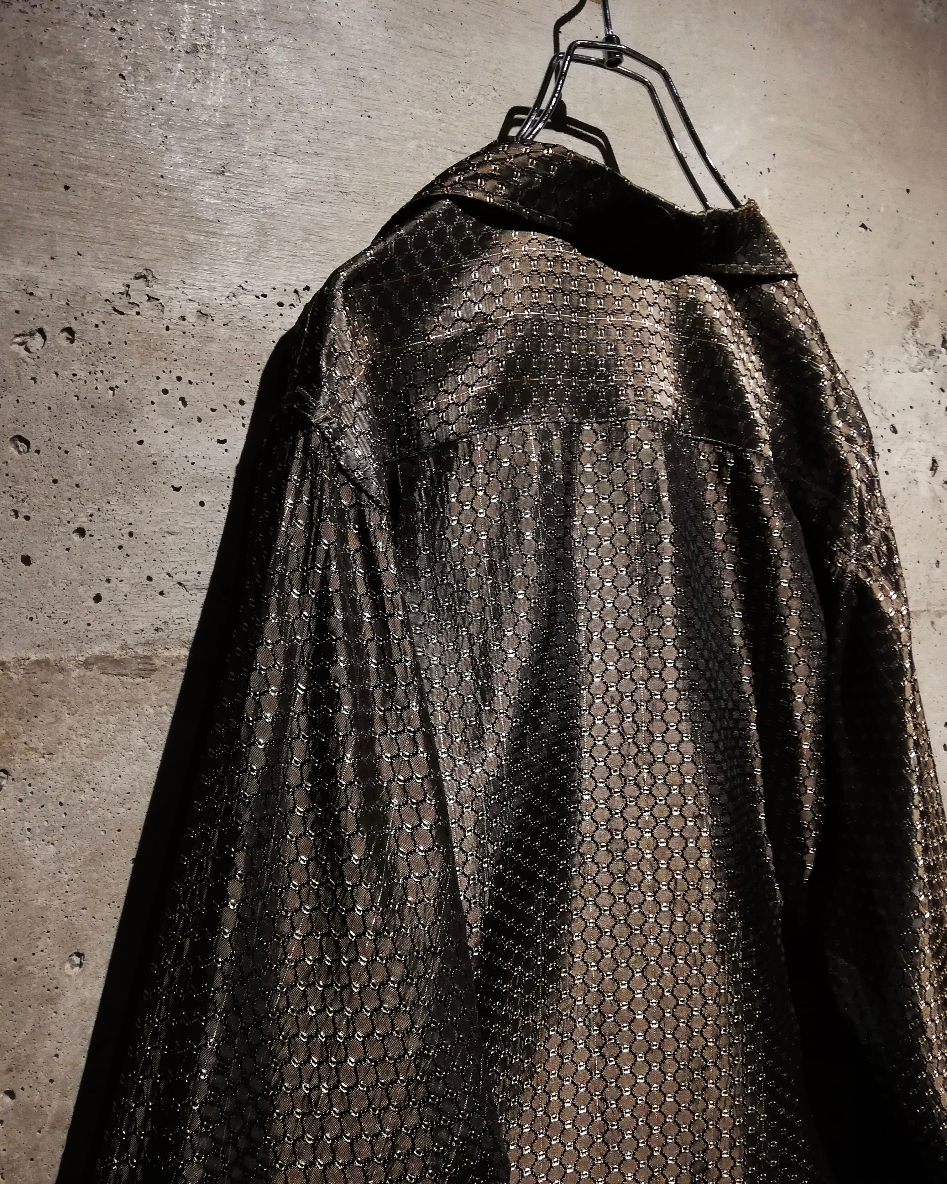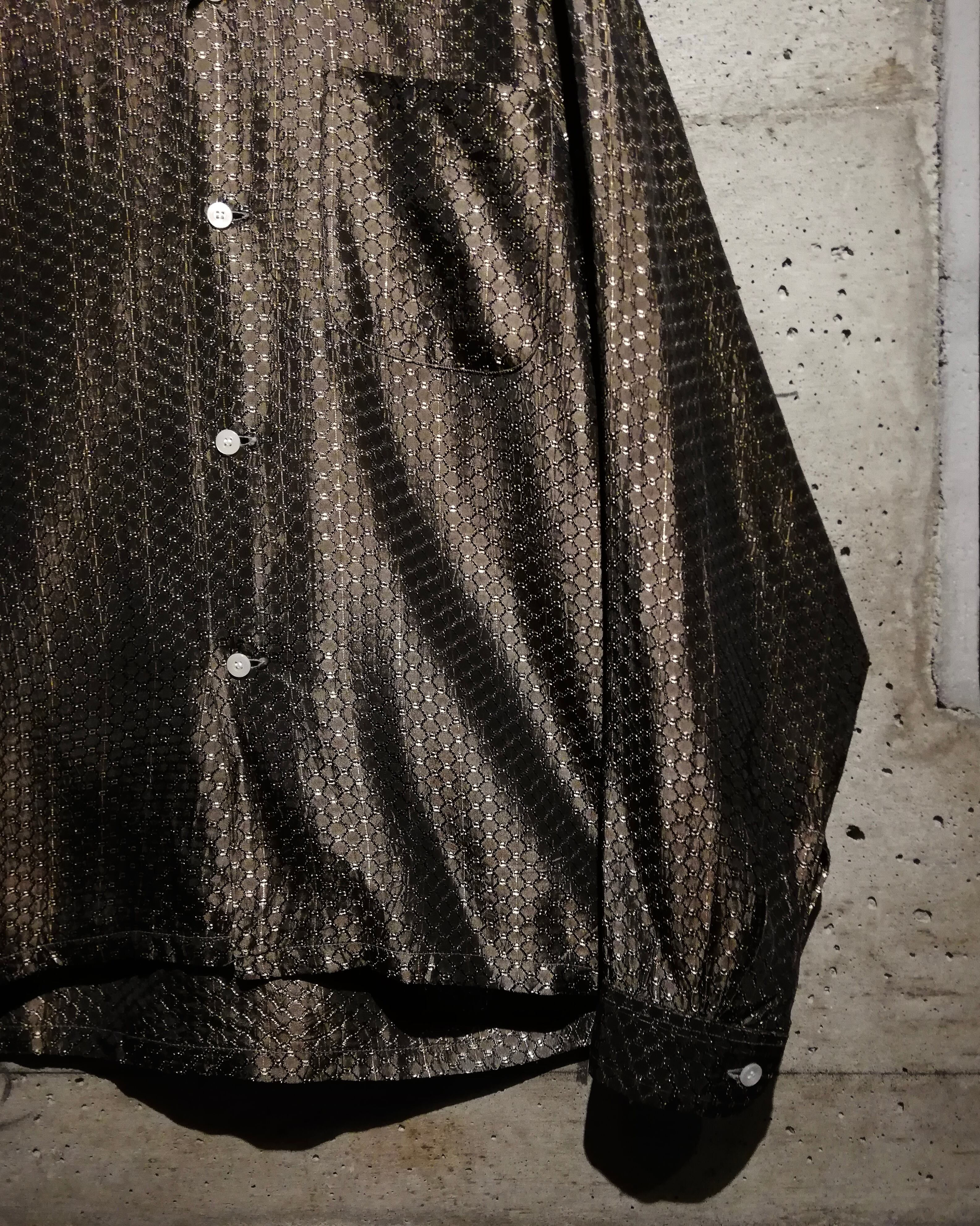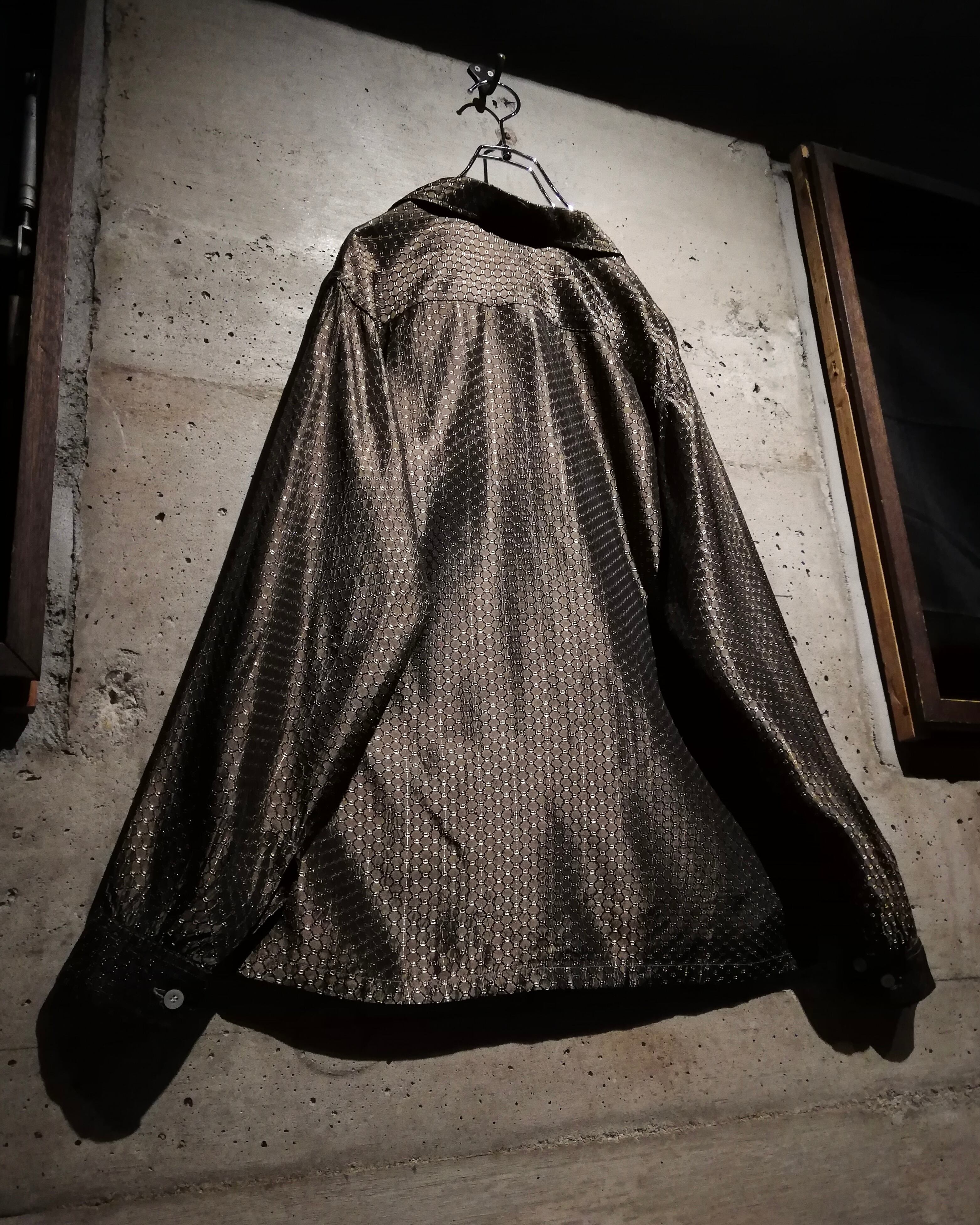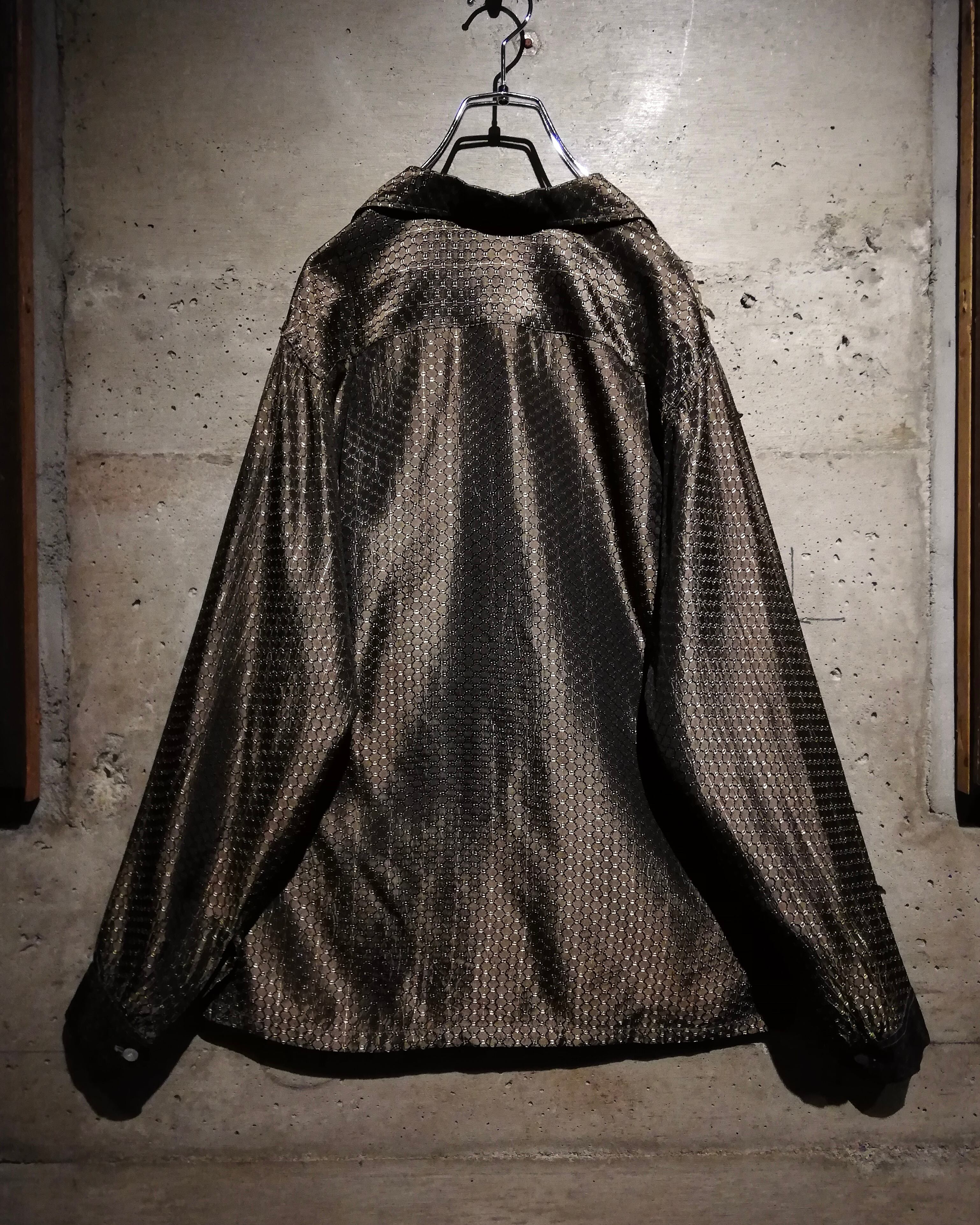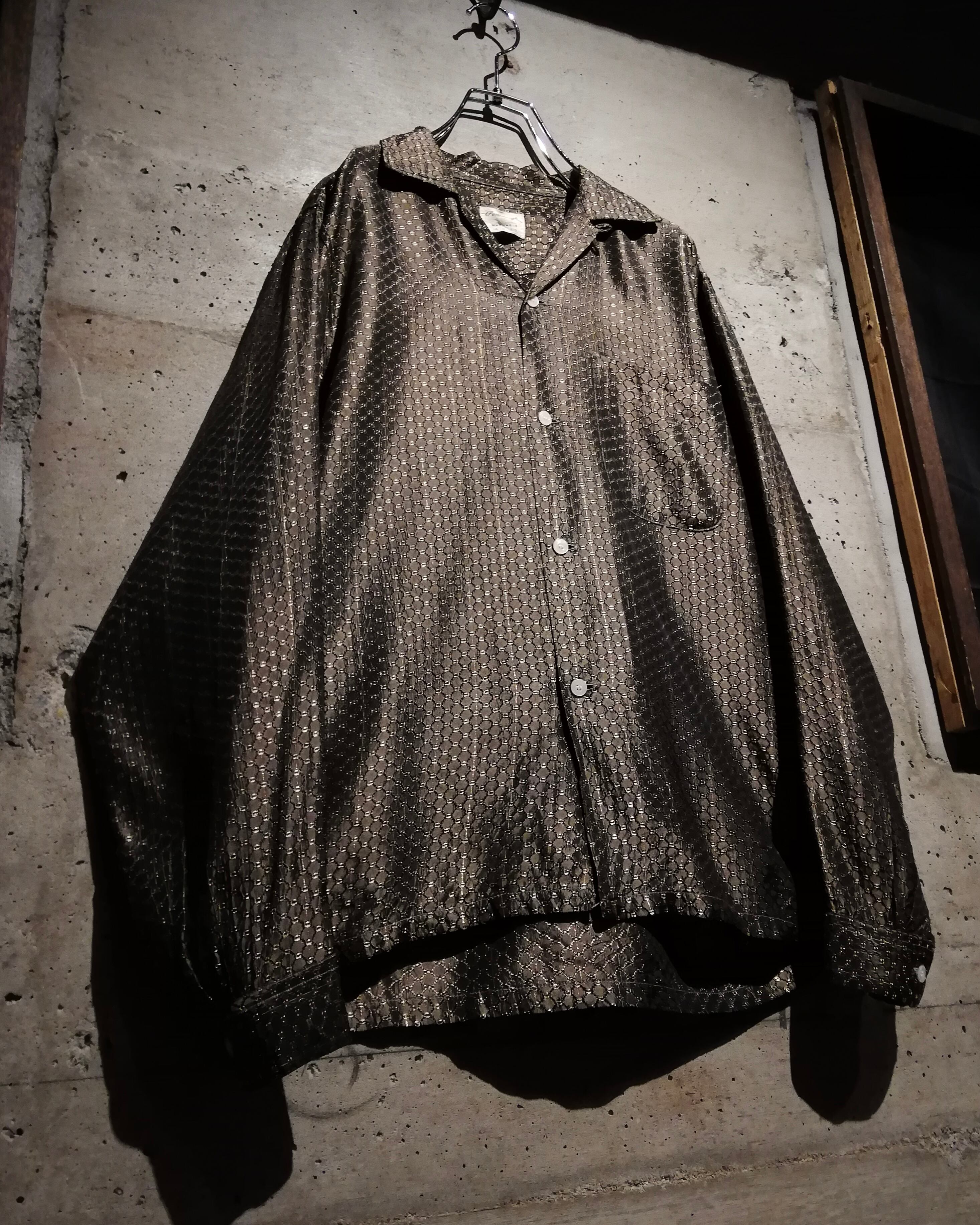 艶やかな光沢のブラウンボディに、糸の織りによって網目状の柄を表現した"Pennleigh"の50'sヴィンテージオープンカラーシャツ。