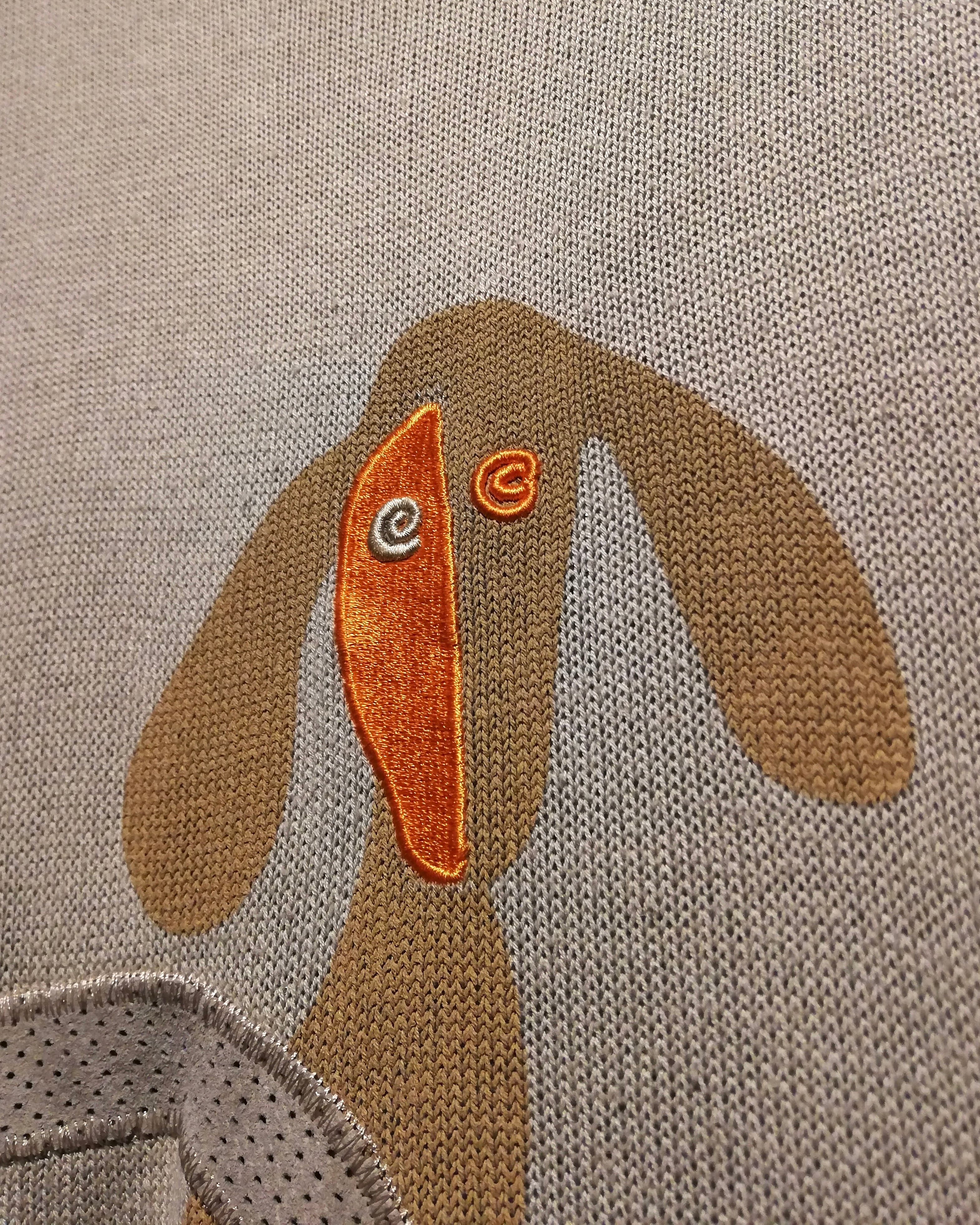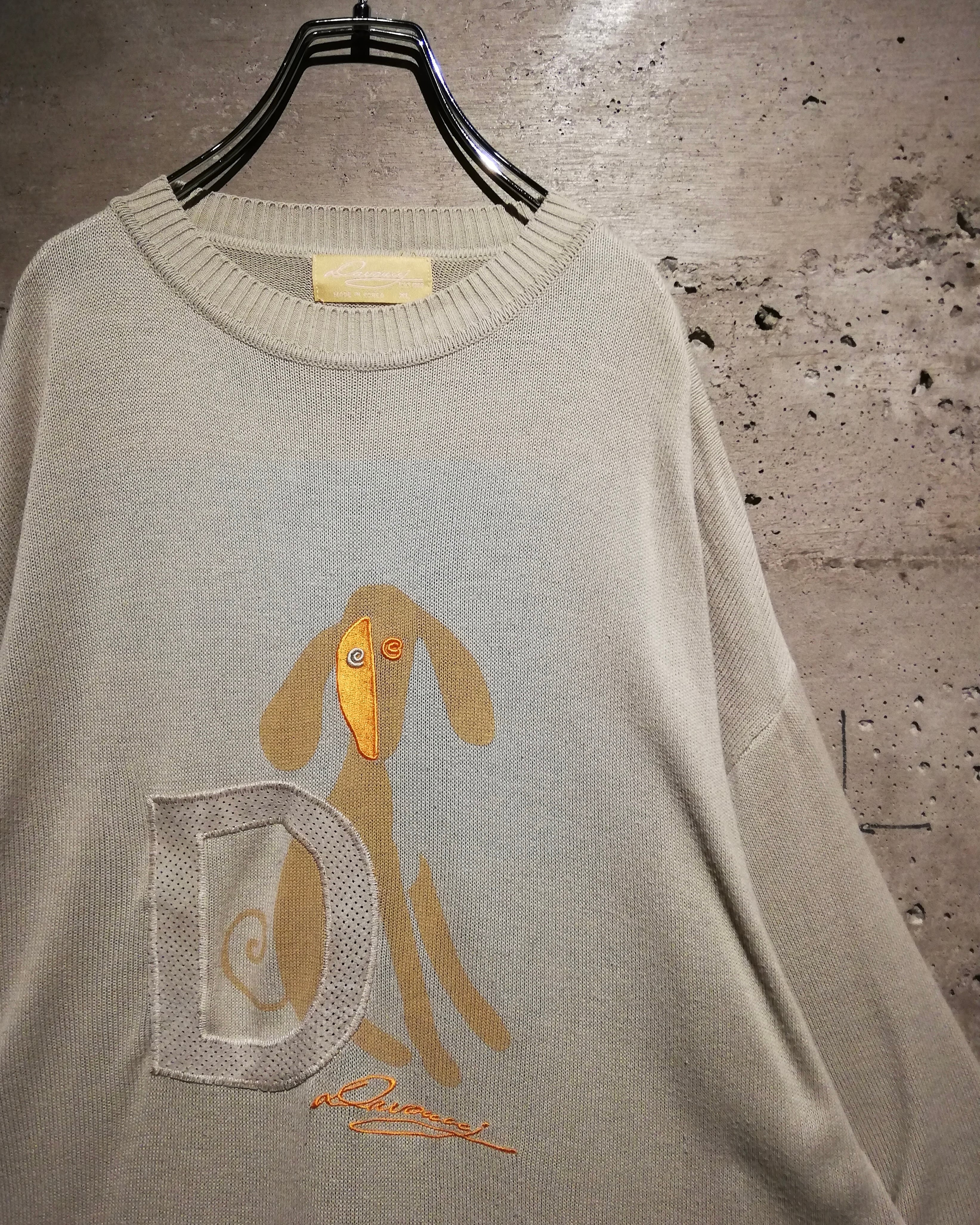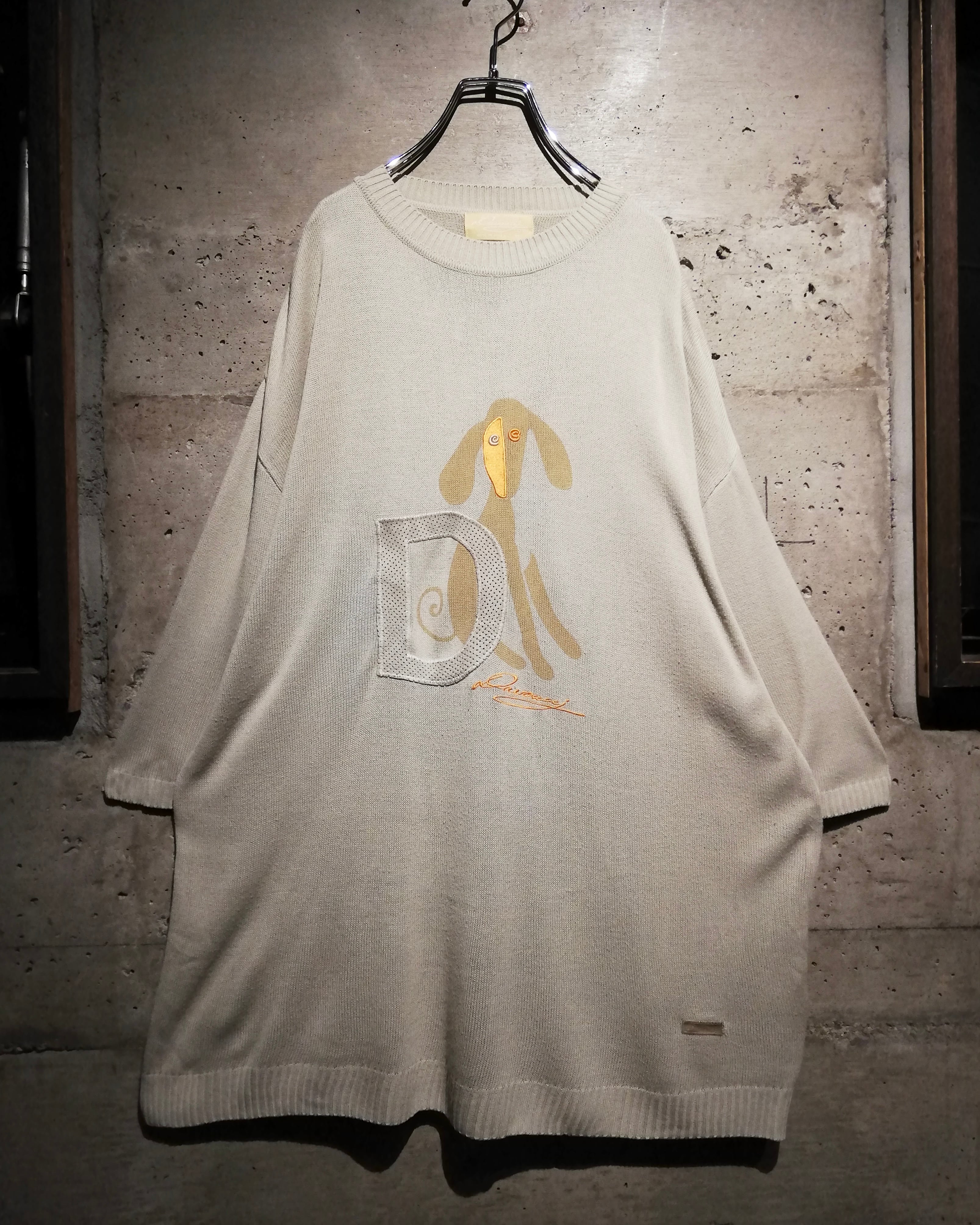 アイボリーのボディをベースに、フロントにアート風のタッチで描かれた犬&ブランドロゴの刺繍をON。ブランドの頭文字"D"を、パンチングを施したスエードレザーで表現した1枚。