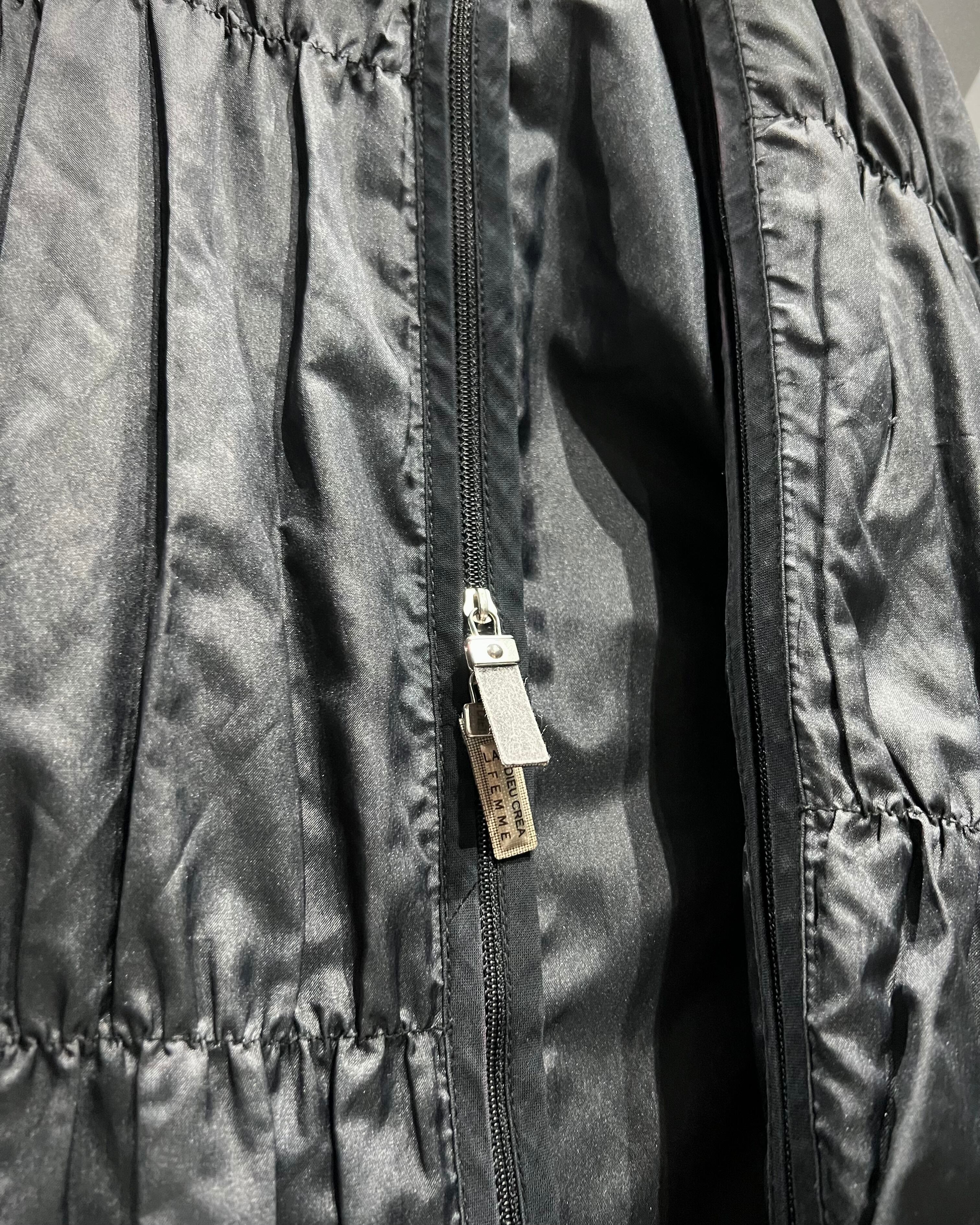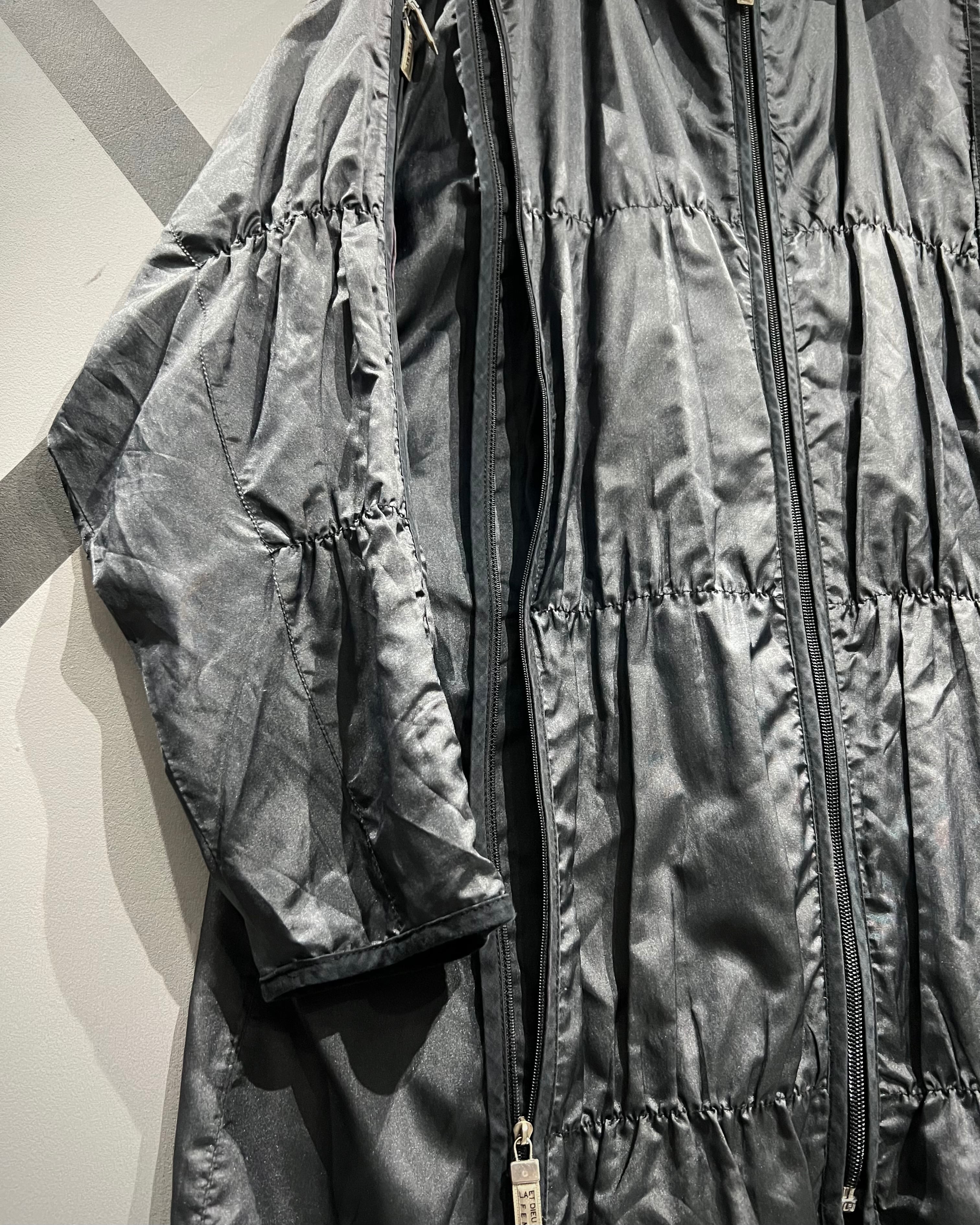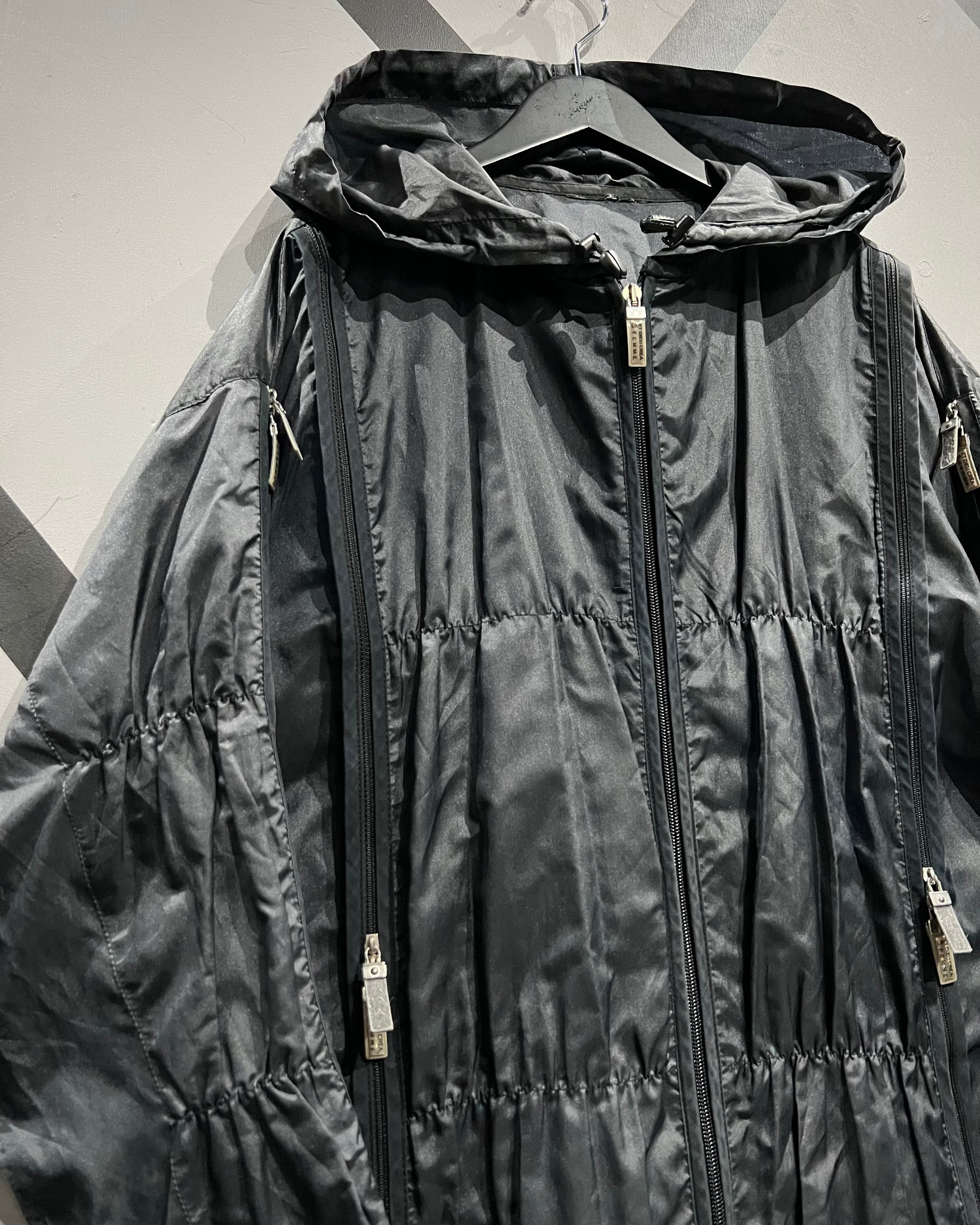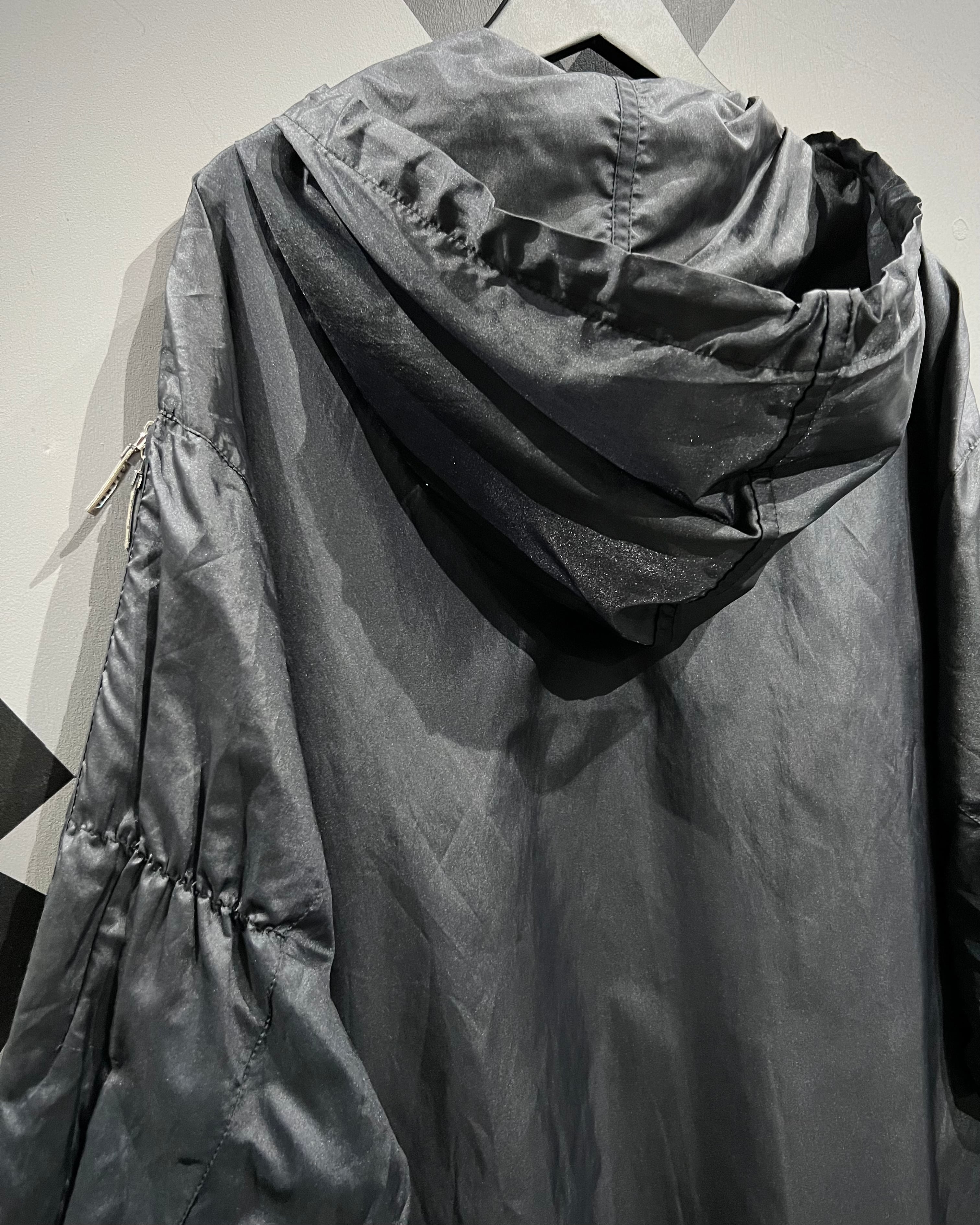 ギャザーを施したことでオールブラックのボディに立体感が生まれ、ジップポケットのディテールとマッチしてテクニカルかつモードな雰囲気を放つ1着に。