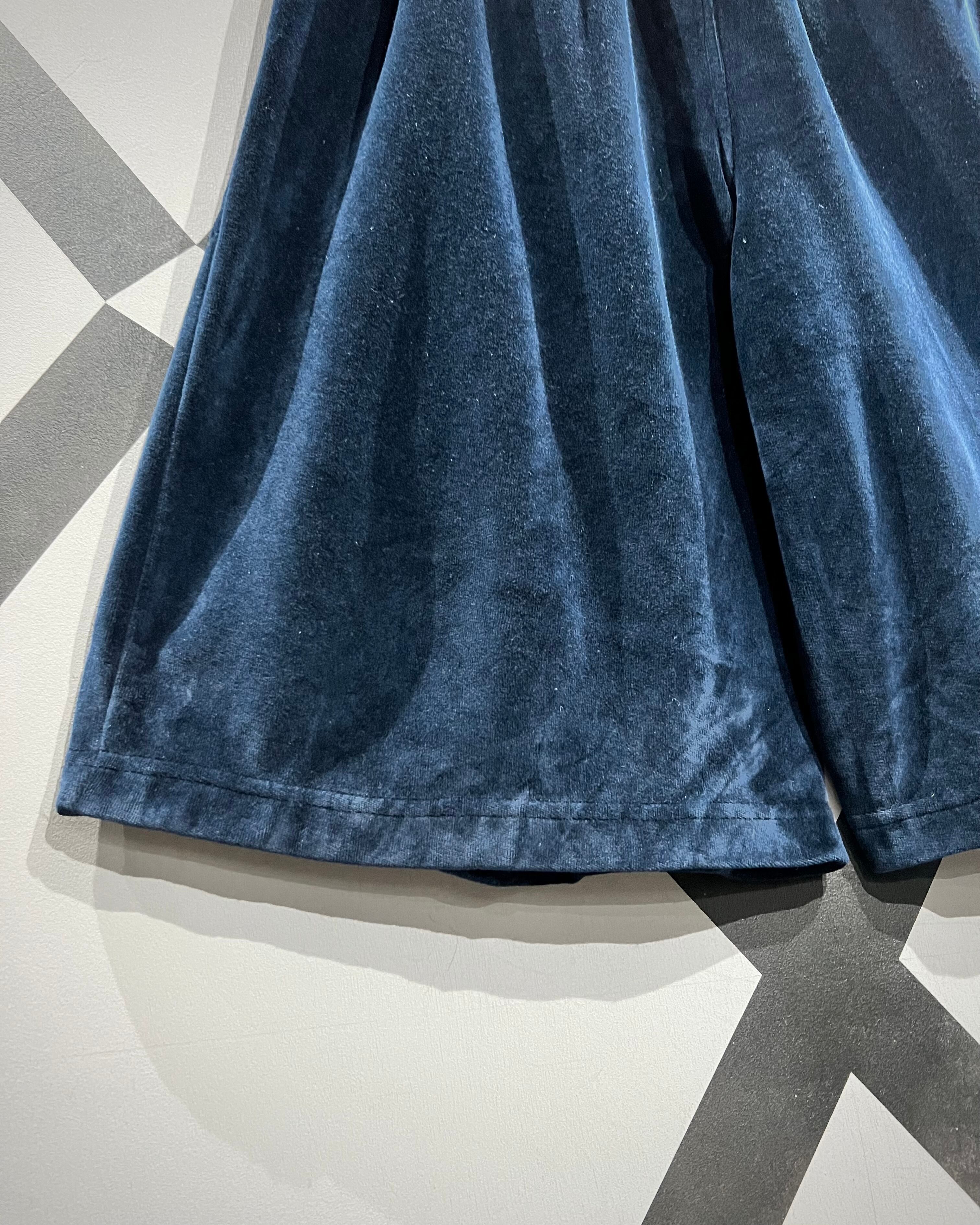 腰回りから裾までズドンと美しく縦に落ちるワイドシルエット。デザイン、シルエット共に抜群の存在感を魅せてくれ、ベロアということで今時期から秋冬としっかりと活躍してくれます。