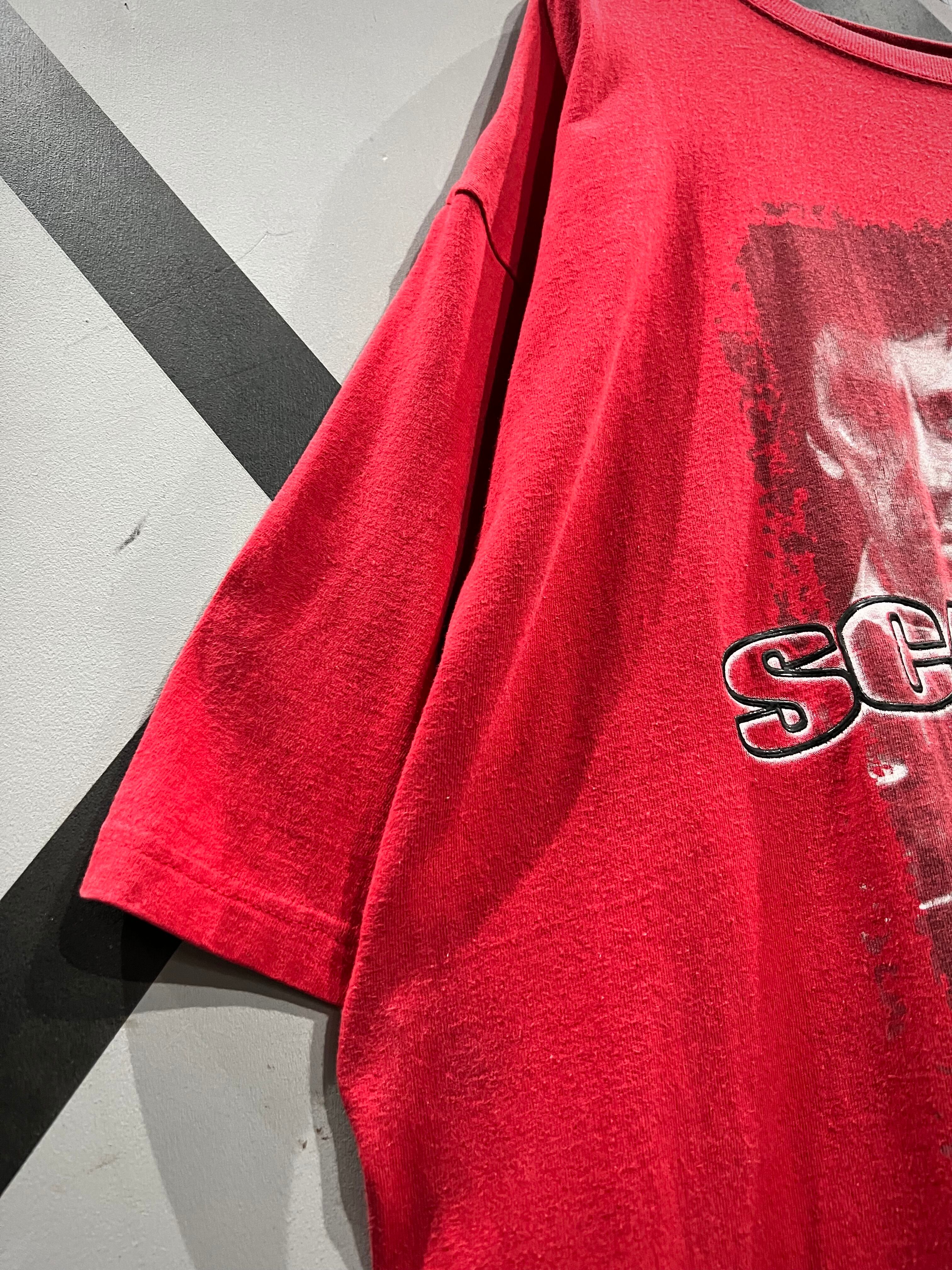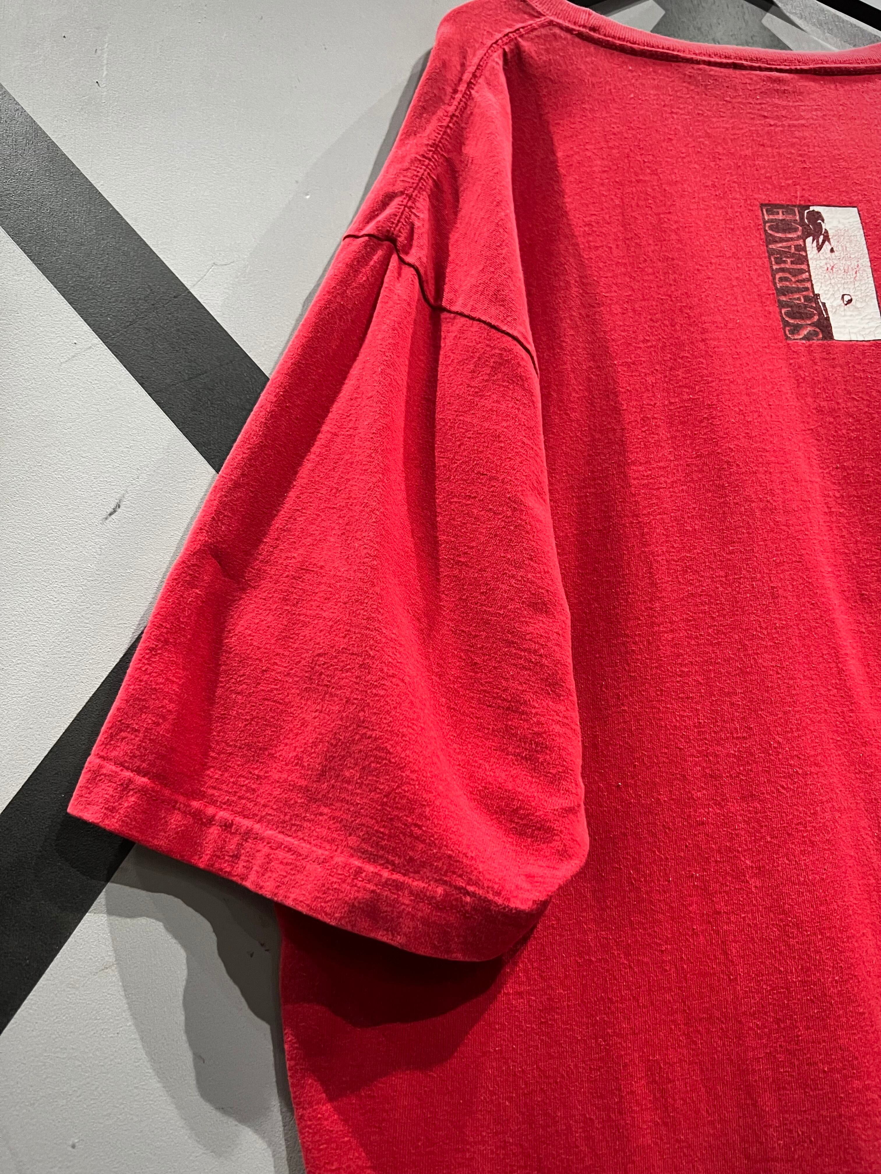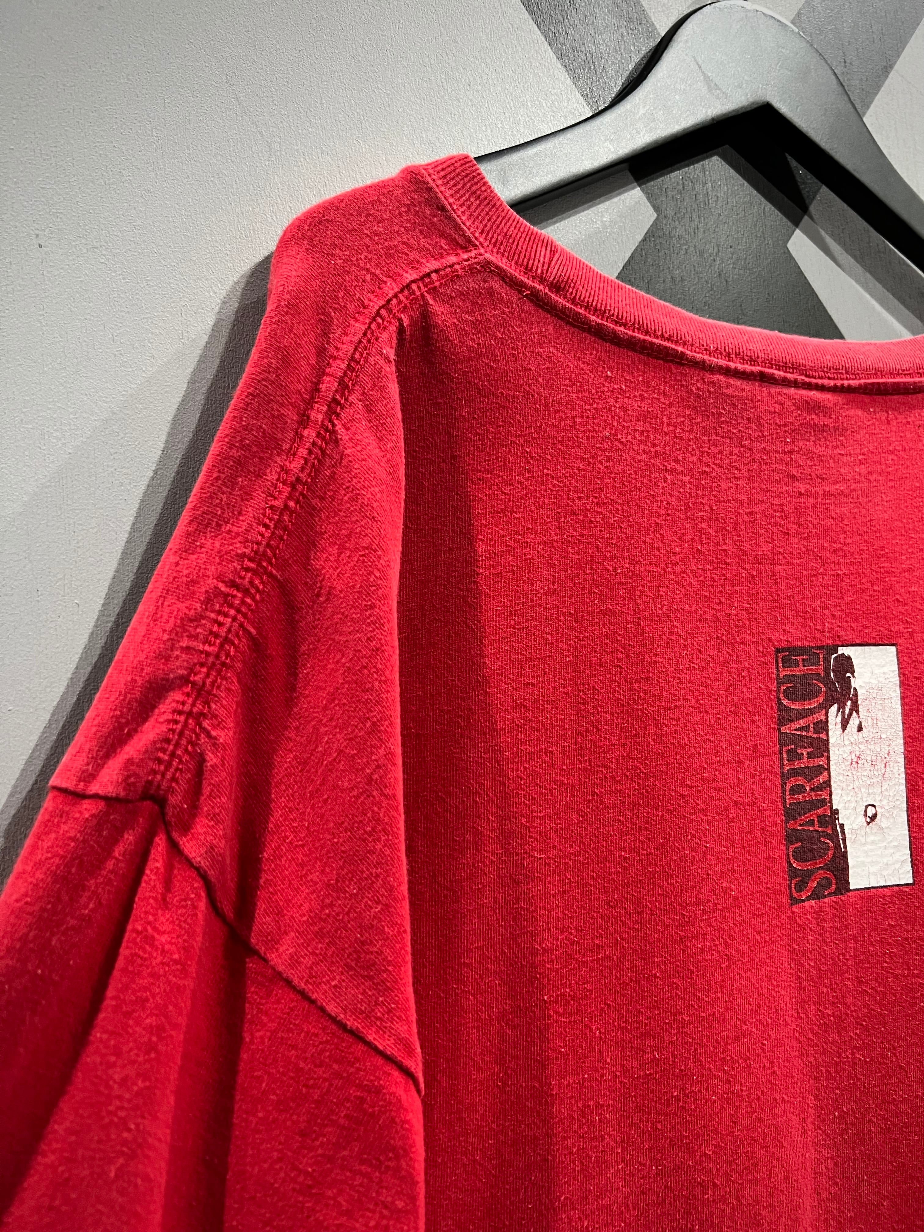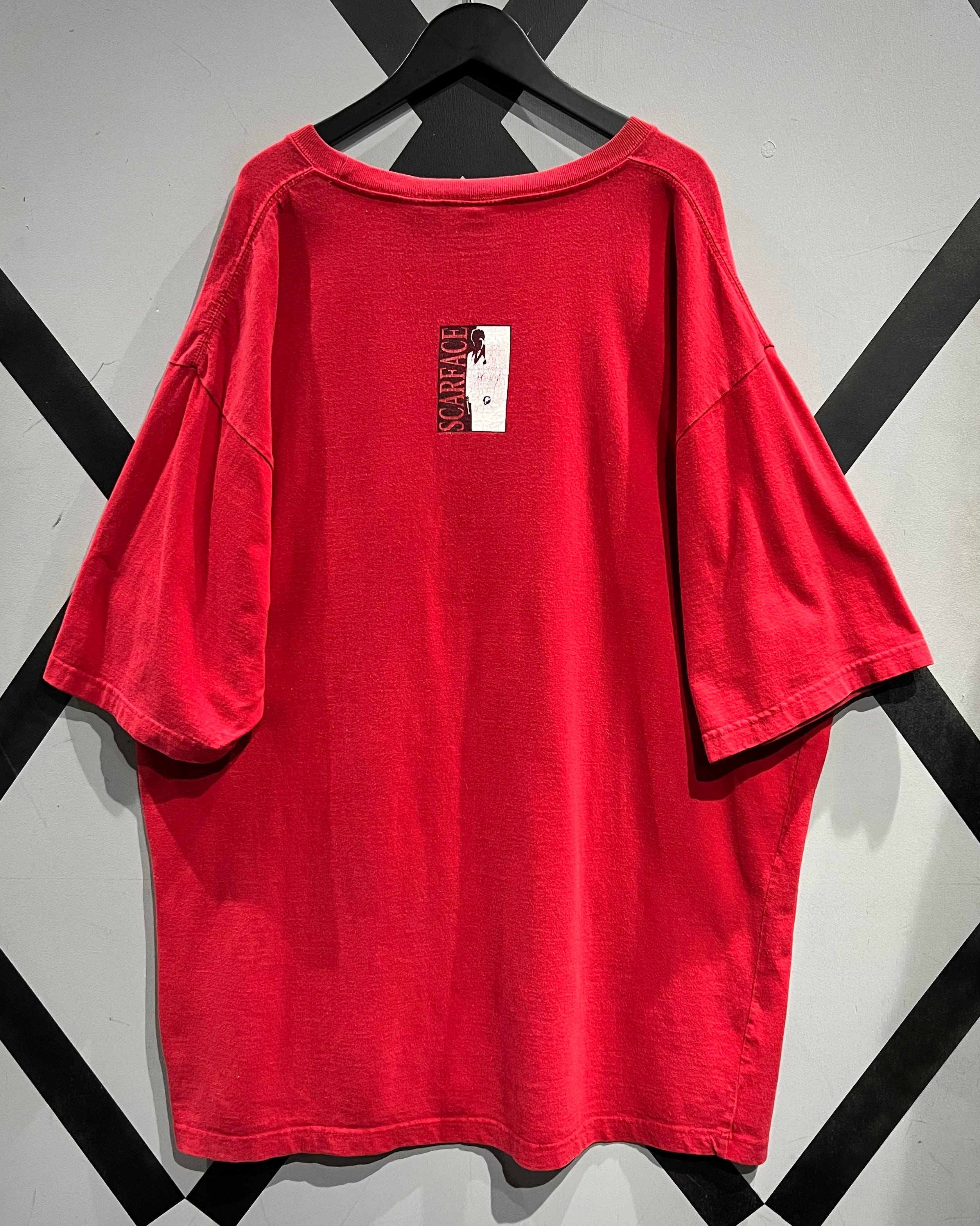 2XL表記のルーズなサイジングの赤ボディに、映画の名シーンプリントでON。経年による絶妙なヒビ割れも良く、その上からはラバープリントで"'SCARFACE"の文字。映画自体の迫力をそのまま一つの洋服に落とし込んだようなデザイン性抜群の仕上がりに。